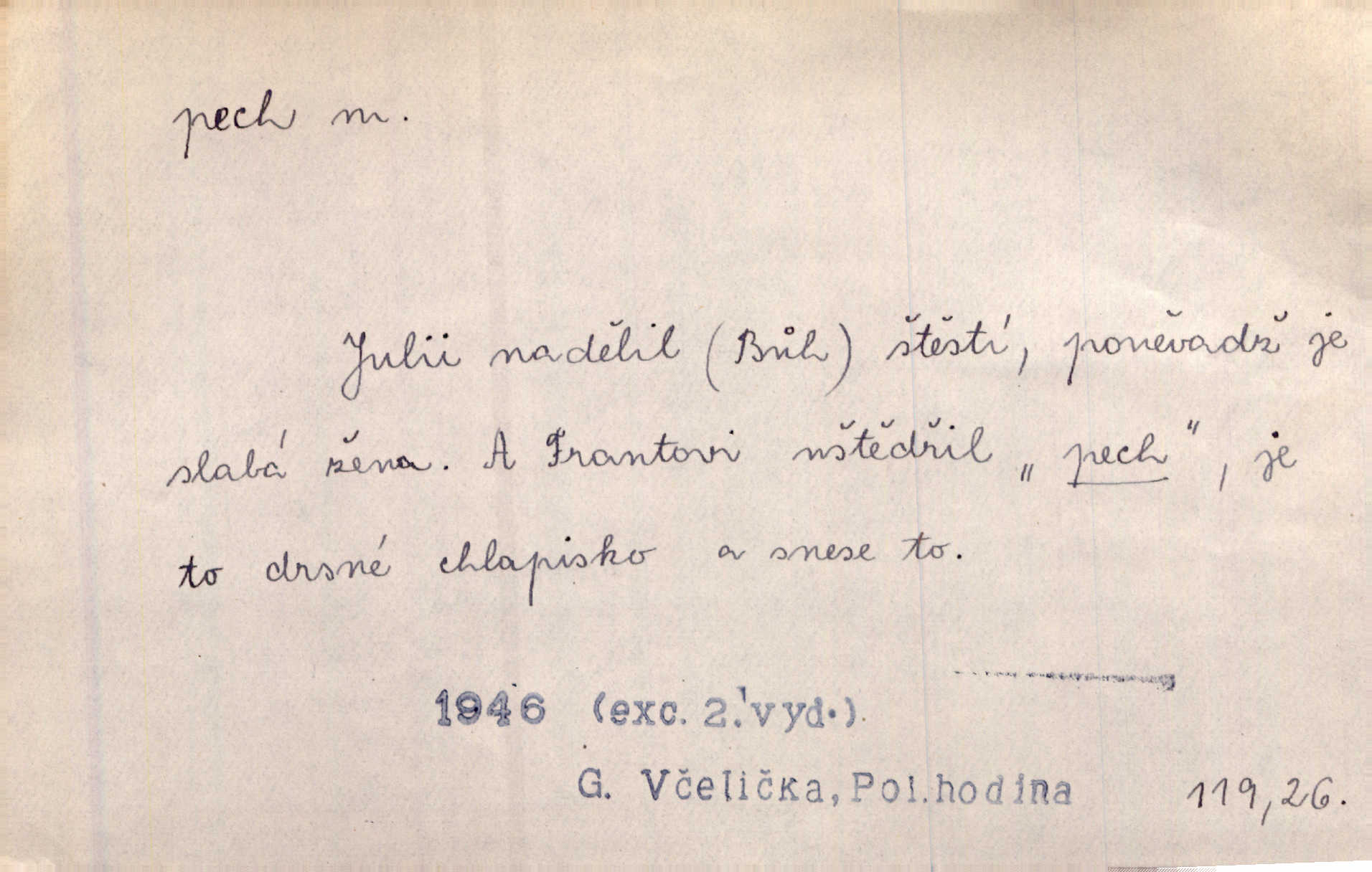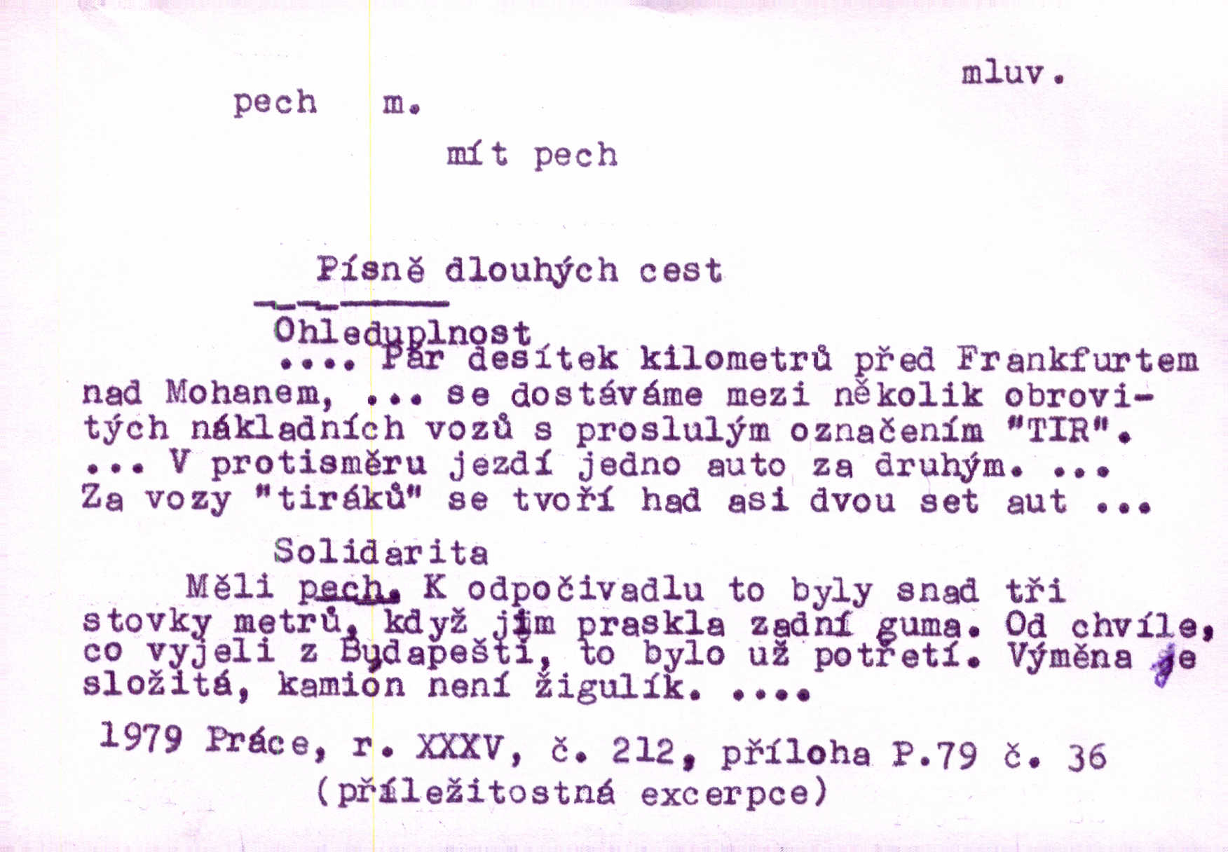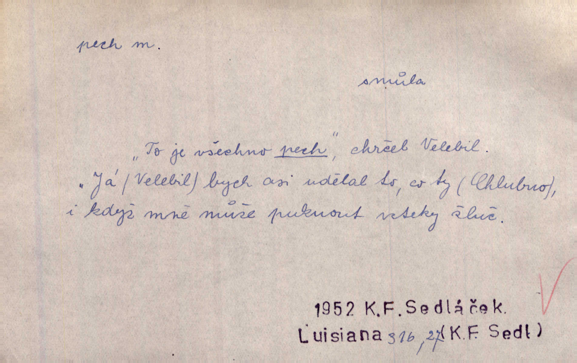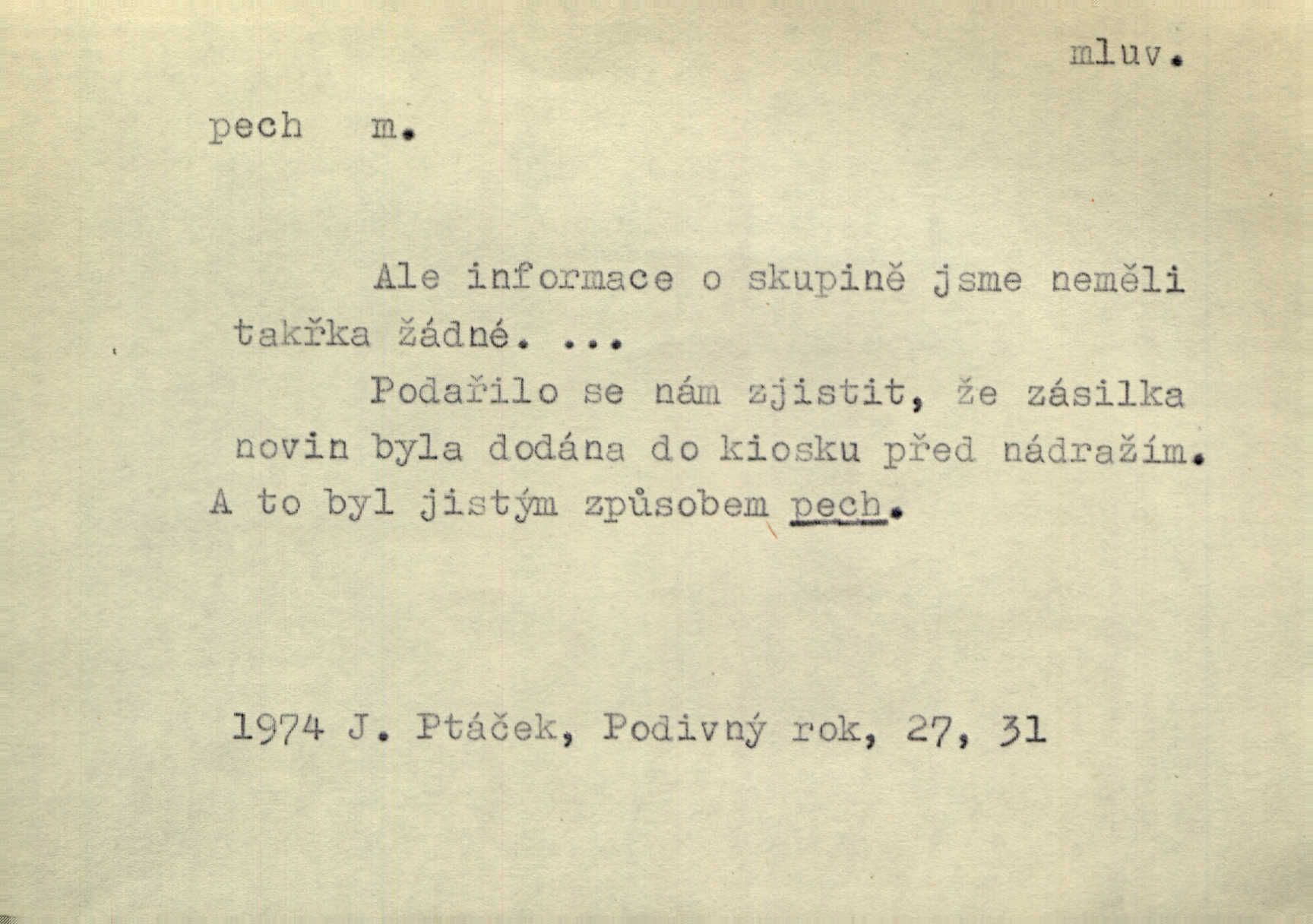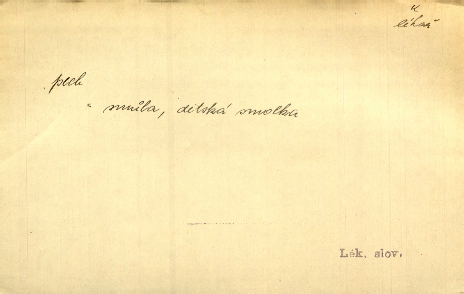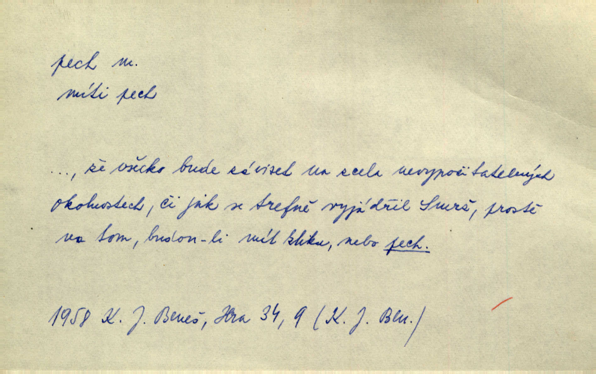 - pech, -u m. lid. nezdar, smůla. Osud tentokrát Rudlovi přál a příslovečný „pech“ se ho pustil. Böhn. Mám zatracenej pech v svým životě! Zaor. Ten [první hoch] štěstí měl, ten [druhý] pech. Dyk.