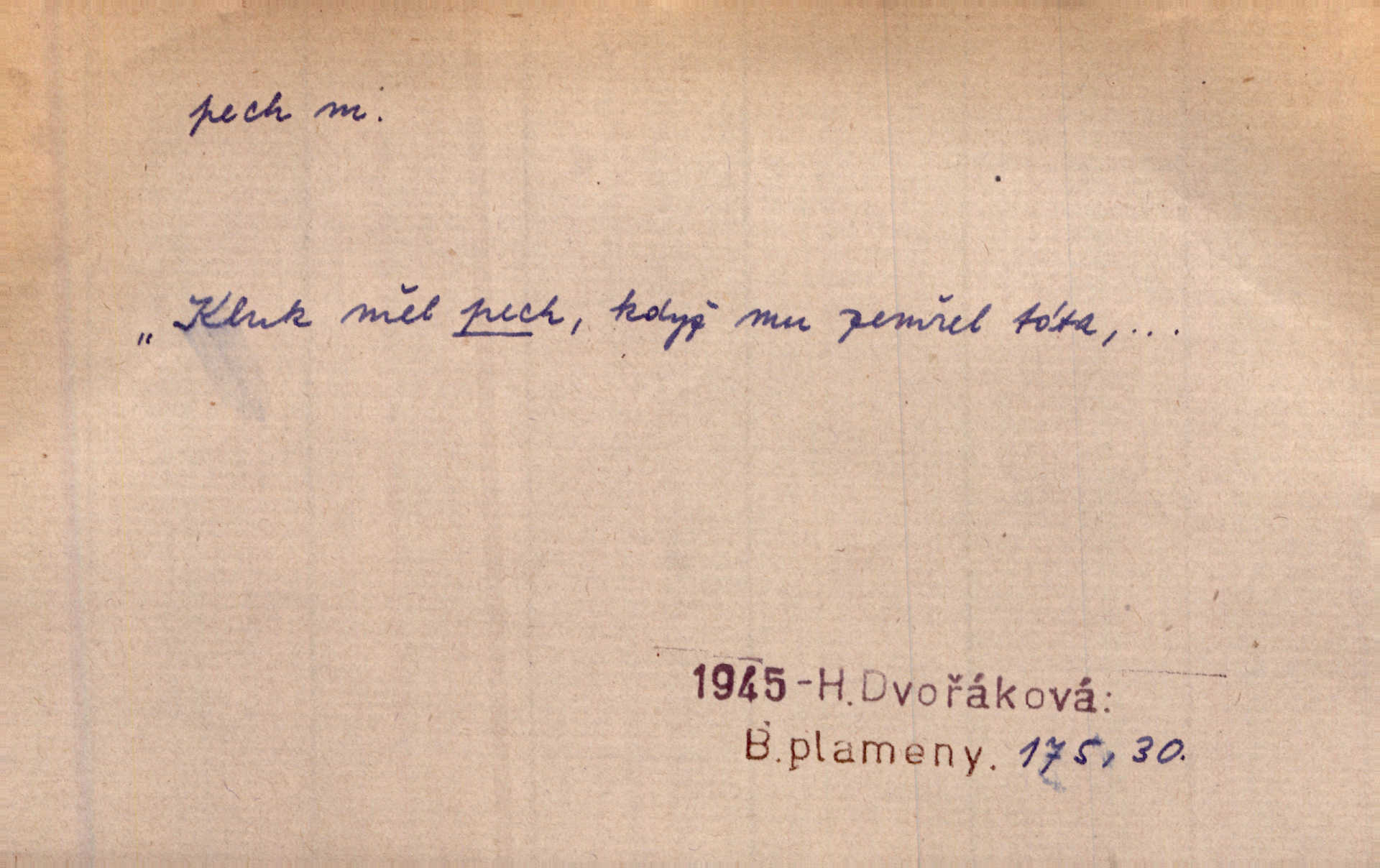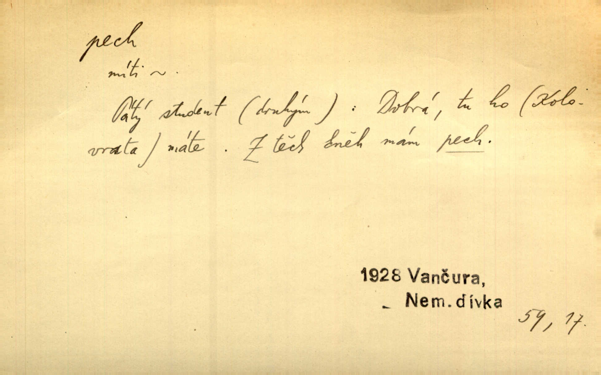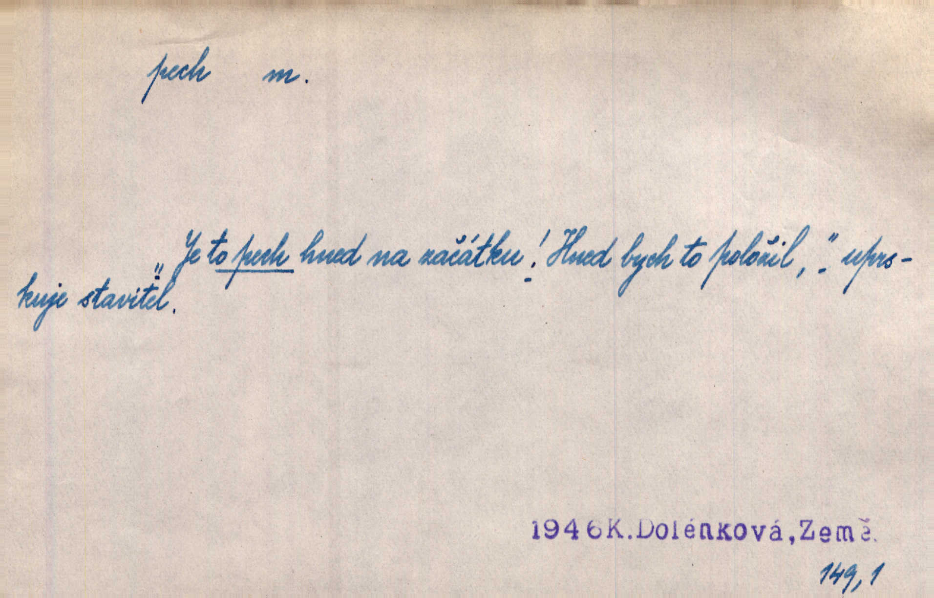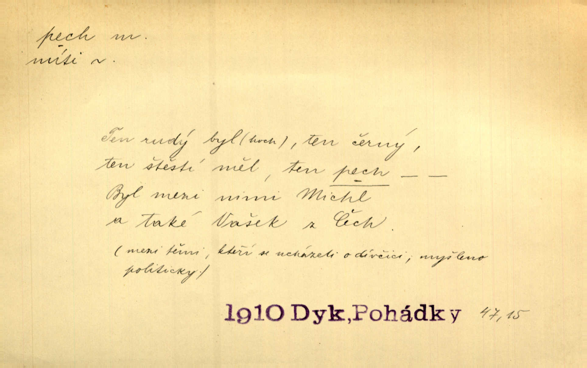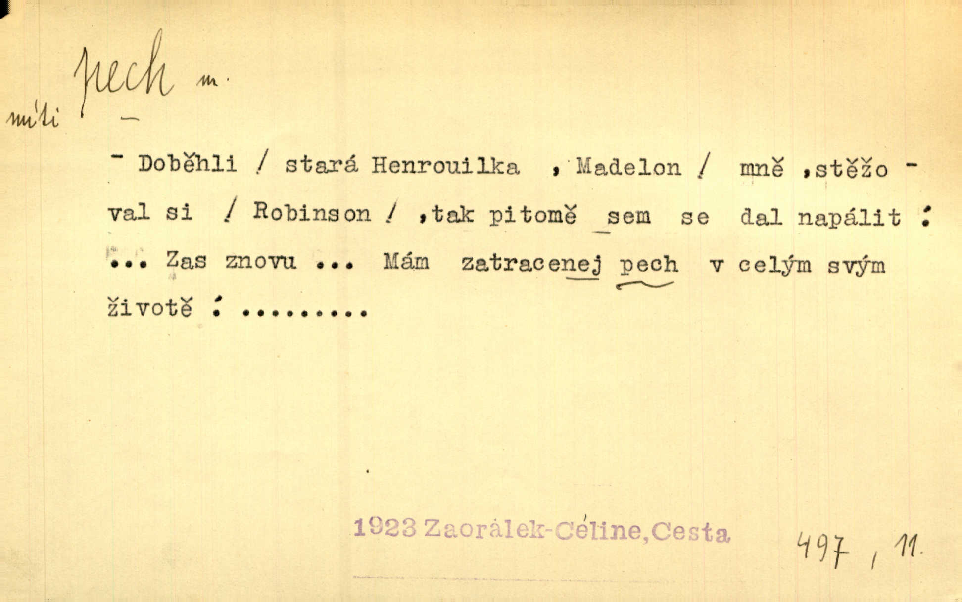 - pech, -u m. lid. nezdar, smůla. Osud tentokrát Rudlovi přál a příslovečný „pech“ se ho pustil. Böhn. Mám zatracenej pech v svým životě! Zaor. Ten [první hoch] štěstí měl, ten [druhý] pech. Dyk.