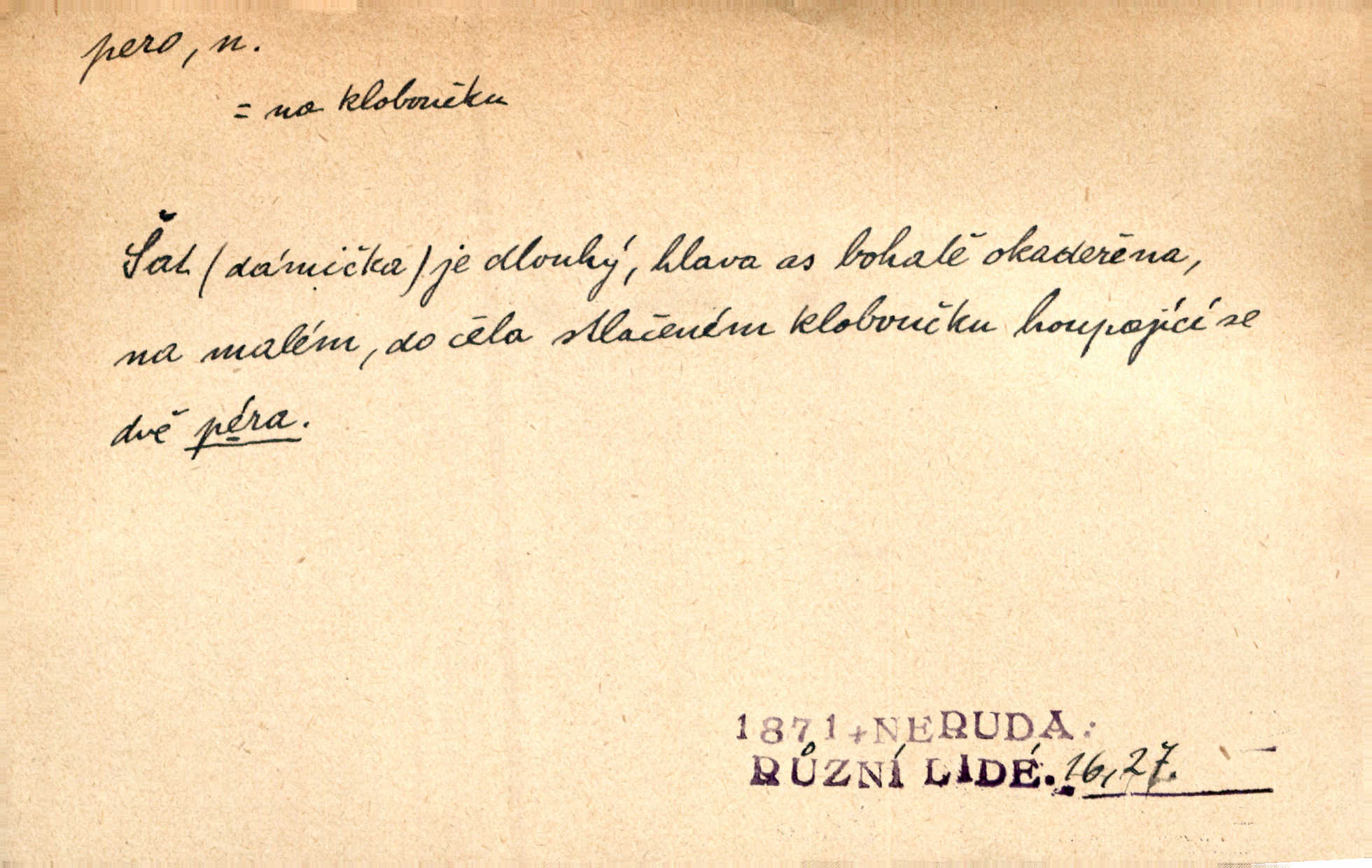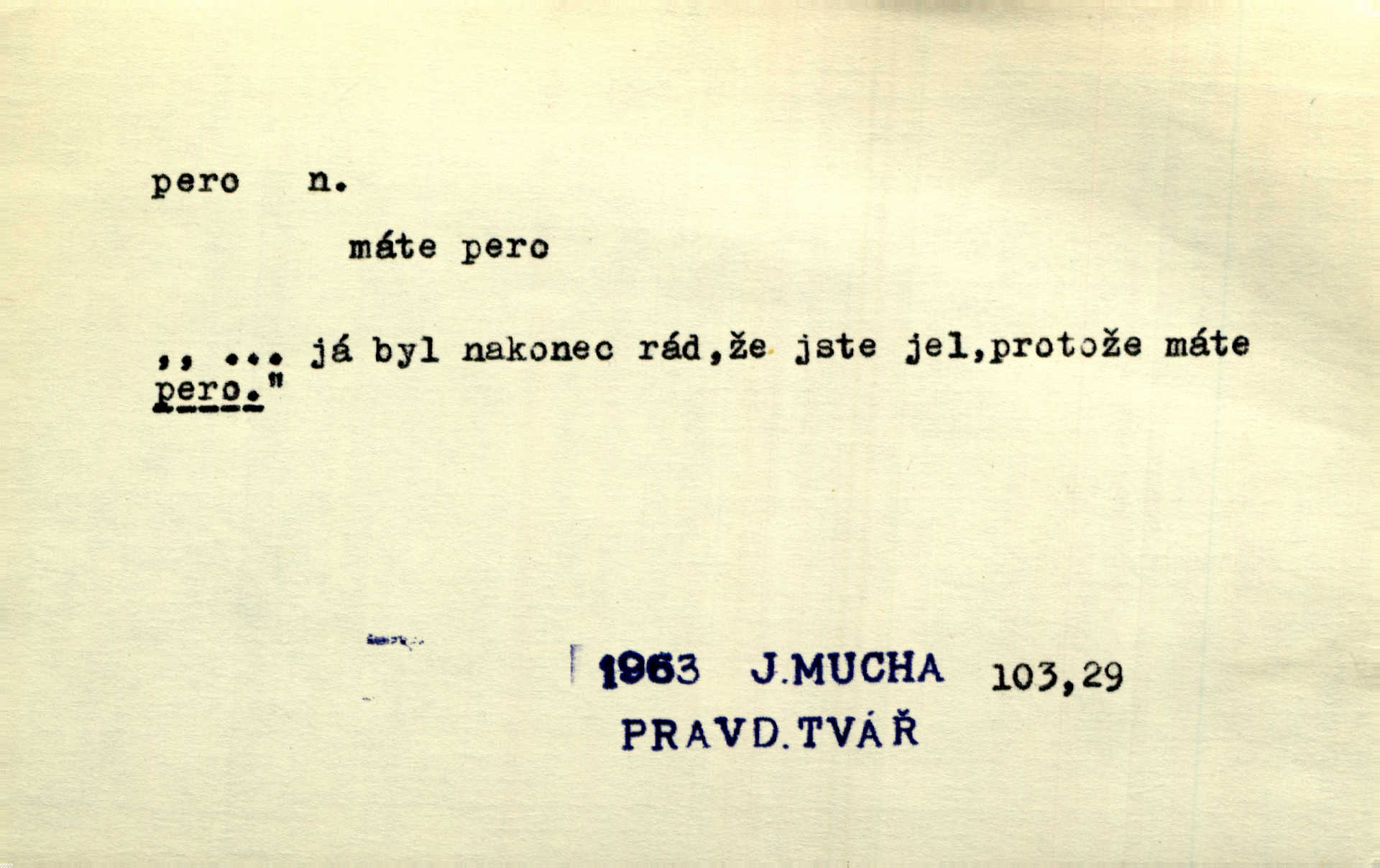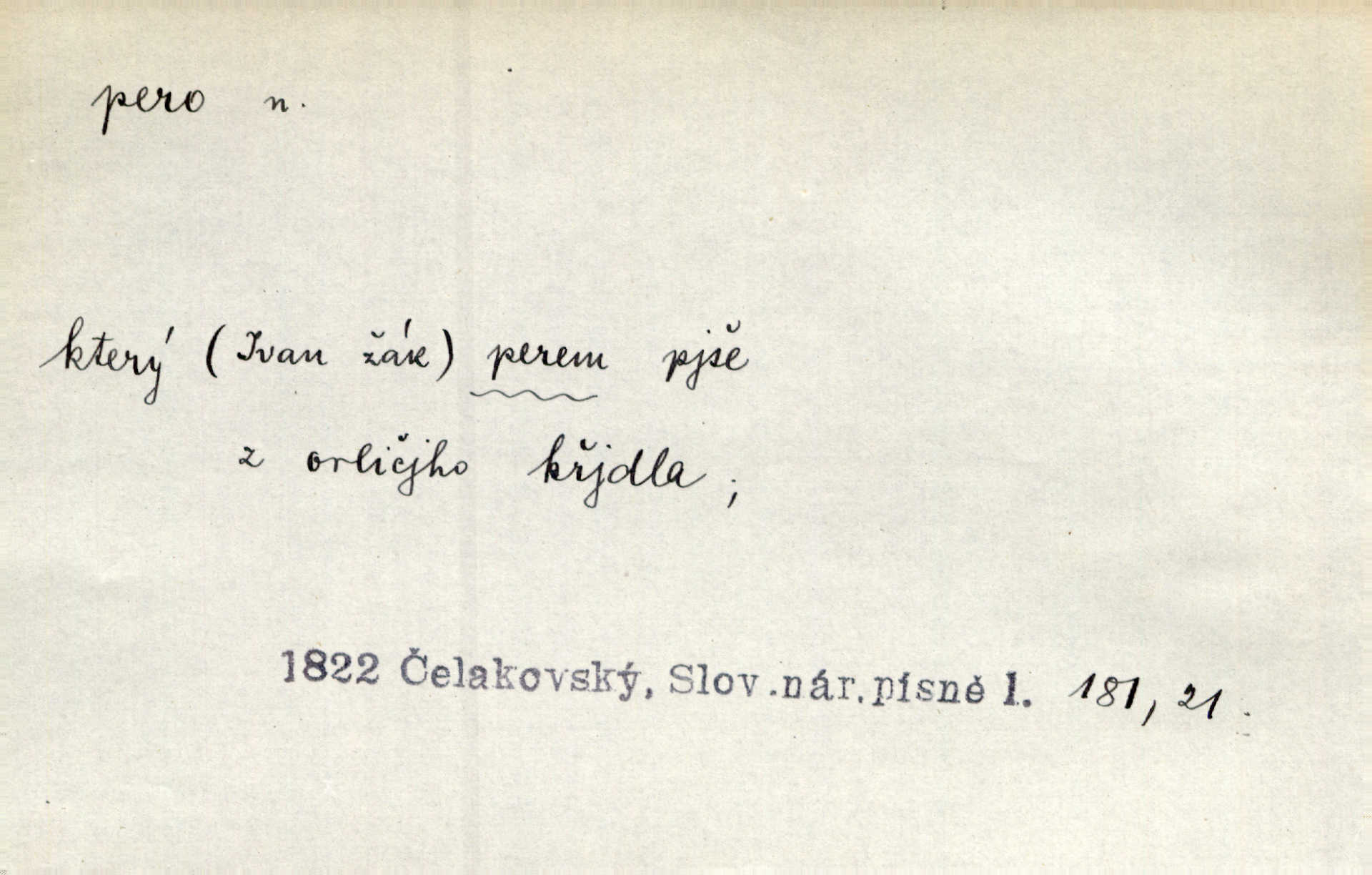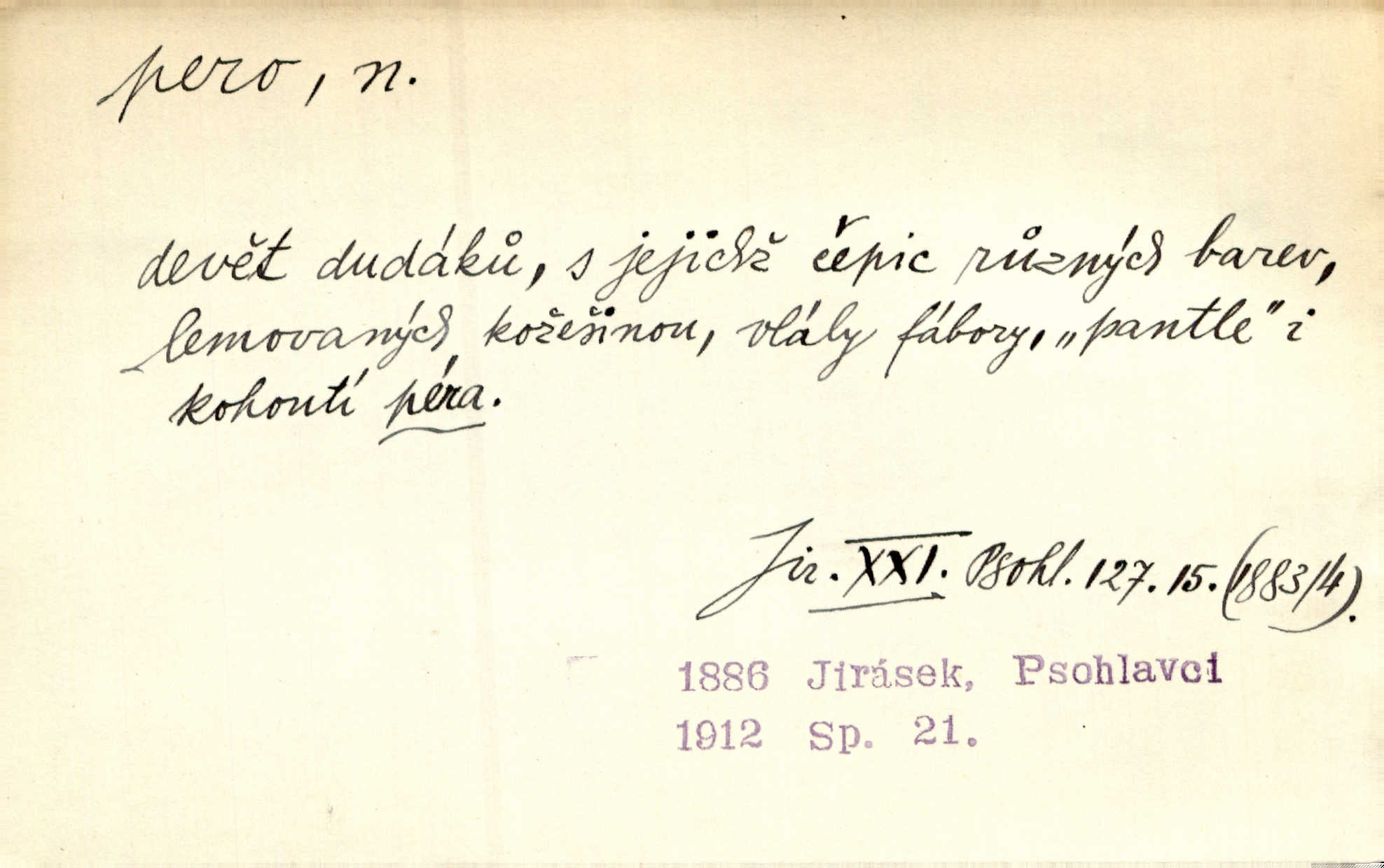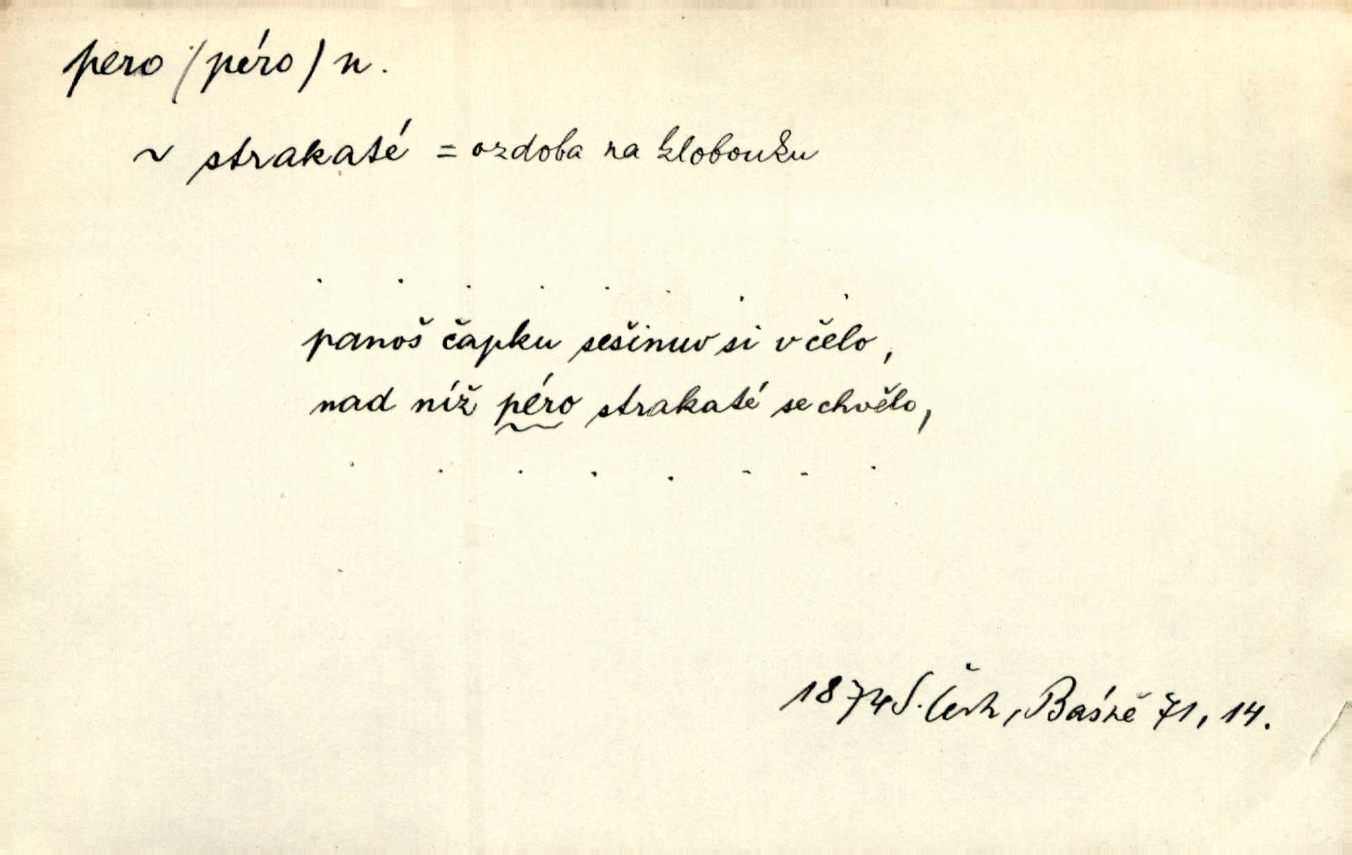 - pero, péro (arch. též píro), -a n. velké peří z ptačích křídel n. ocasu. Vysoké mu péro s přilby vlá. Vrch. Tiché, šťastné vísky kladou se v stínech hlubokých jako zavanutá péra obrovské labuti. Pfleg. Gouvernantka rozpačitá [tančí] stále skrytá za vějířem z pavích per. Vrch. Nějaké píro pštrosí ukaž! Win. Zool. péro obrysové, rejdovací. D nástroj ke psaní inkoustem n. tuší. Pero ocelové, skleněné, dámské, kuličkové, notové a j.; pero plnicí psací pero s inkoustovou nádržkou v držátku; pero rýsovací k vytahování čar tuší. Přiřízl si první péro rákosové. Ner. Před ním ležela kniha, papír, brková péra. Jir. Ustál. sp. Dal se do psaní Stazině. Ale nešlo mu z péra, po každé větě se zamýšlel. Šim. Stává se každý podezřelým, kdo proti odsuzování čarodějnic slovem neb pérem brojí písemně. Čech. Jsem přesvědčen, že ten pamětní spis pochází přímo z jeho péra že jej napsal. Čap. Ch. V kvartě chopil jsem se i péra počal jsem spisovati. Jir. Předchůdcové moji v soudní rubrice byli staří, osvědčení novináři, v péře honění zvyklí psáti. Herrm. Někdy se člověk dá k novinám, protože o sobě věří, že má dobré pero je dobrý stylista. K. Čap. „Veřejnému mínění“ od najatých per dokazováno, že Ludvík XIV. pochází od Karla Velikého od spisovatelů. Rez. Nevěděl byste ženicha pro mou nevlastní dceru Růženu? Musilo by to být něco lepšího, takhle něco od péra úředník. Staš. Advokáti říkali písařům do péra sáhodlouhé protokoly diktovali. Staš. Kdo to má zanedbanému lidu dáti do péra navésti jej? Šmil. D pružná součástka nějakého stroje, přístroje a p. Natáhl chrčivě se vzpírající péro budíčku. Vrba. Zoubek tlačí zoubek, pero žene pero. Bozd. Náhle, jakoby pérem vymrštěn, vzchopil se muž se stolu. Ner. Stiskl na stěně nějaké pero a objevily se tajné nízké dveře. J. J. Kol. Vyjížděl ze zámku panský kočár na ohromných perách. Jir. Klín povozu v pérách prudce zakolísal. Čap. Ch. Žlutá pera kulatých brejlí ztrácela se na spáncích v houšti vlasů. Jir. Tech. pružná součást rozmanitého tvaru sloužící k udržení polohy, k přenášení tahu n. tlaku, k zachycení n. utlumení rázů, k pohybu n. pohonu a j., zpružina, zpruha. Pero ohýbané, zkrucované, rovné, spirálové, šroubové a j.; pero listové složené z pásů (listů), pero bicí, hodinové, pojistné a p. Stroj. podélný klín bez úkosu. Technol. (v tesařství a v truhlářství) plochá lišta, která se vsazuje do drážek vyhoblovaných v obou hranách, jimiž spojovaná prkna k sobě přiléhají, n. lišta vyhoblovaná v hraně jednoho prkna a zasunující se do drážky vyhoblované v hraně druhého prkna. Spojení na pero a drážku. Stav. silná fošna n. krajina, která se připevňuje na piloty mostní bárky; část železné kované botky, kterou se připojuje botka k pilotě. D pružná vložka obuvi zvané perka. Rozškubaná péra [botek] vyčuhovala zpod kalhot až příliš krátkých. Merh. Vulg. Dyž ti mně, hochu, vodtamtuď vyndali péra, tak jako kdyby tě někdo rovnou přes nos praštil, poslali mě odtamtud. Němec. D Arch. kord. Na rohatině v řemenech zavěšen rapír nebo dlouhé péro. Win. Pravicí o hůl se opíral, po levém boku viselo v pantaleru mohutné „píro“ s rukojetí pěkně pletenou. Jir. D Dial. kytice. Z jara dělají se péra z lesních a polních květin. Něm. D Mysl. ocas jelení n. zaječí. D Zool. mořské péro polyp z čeledi Pennatulidae, Pennatula. D Kuch. hovězí maso mezi krkem a hřbetem.