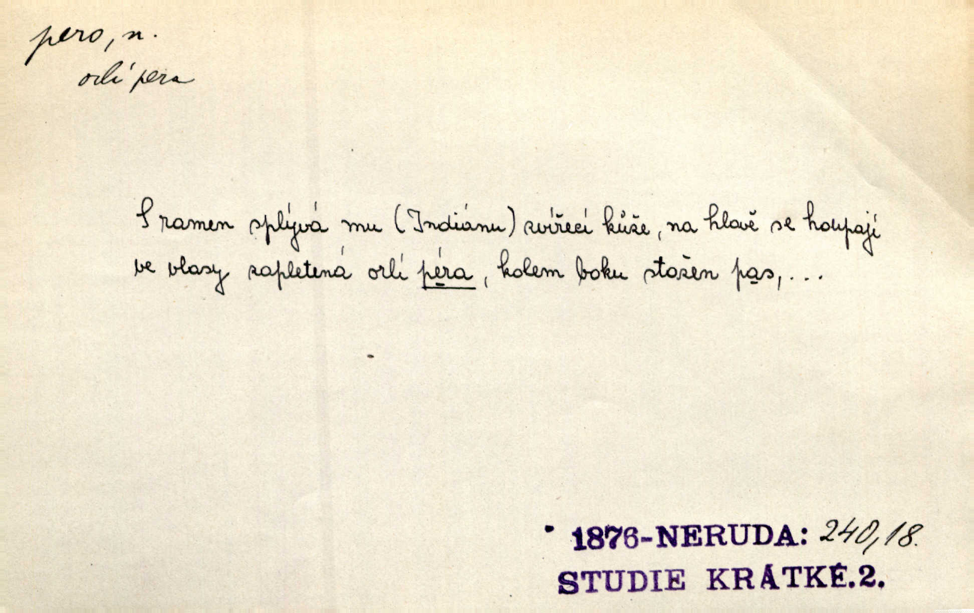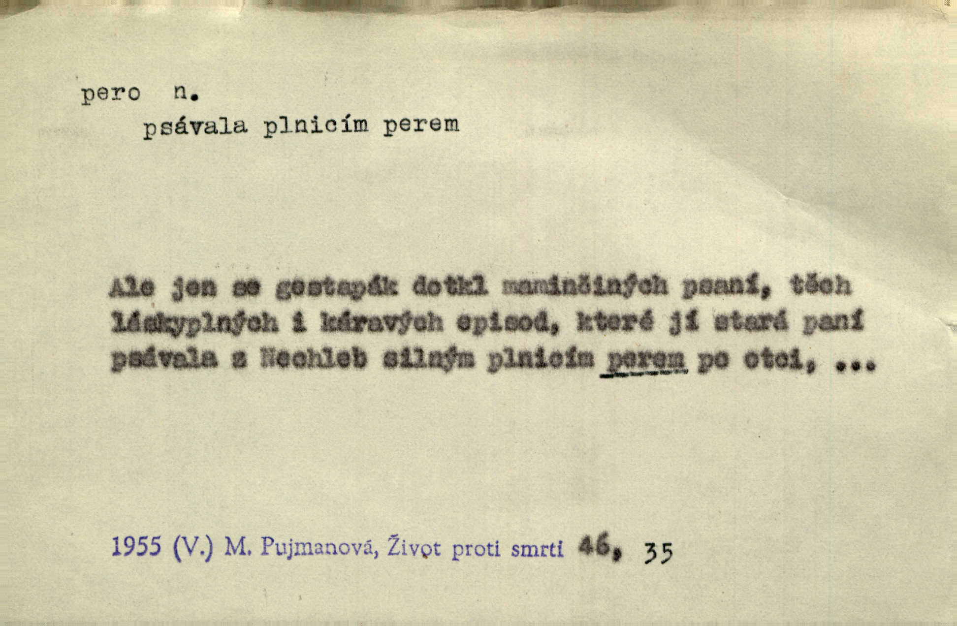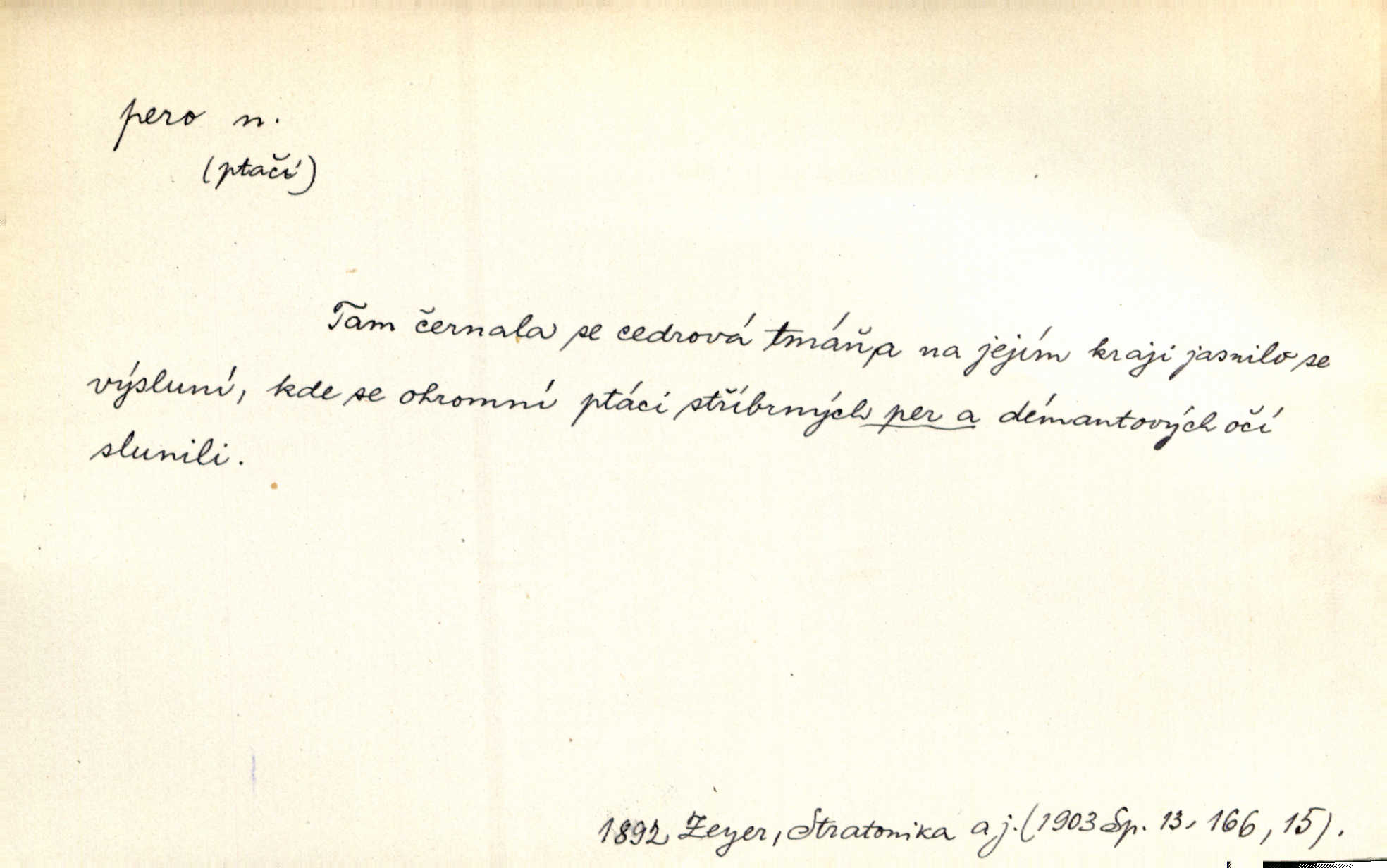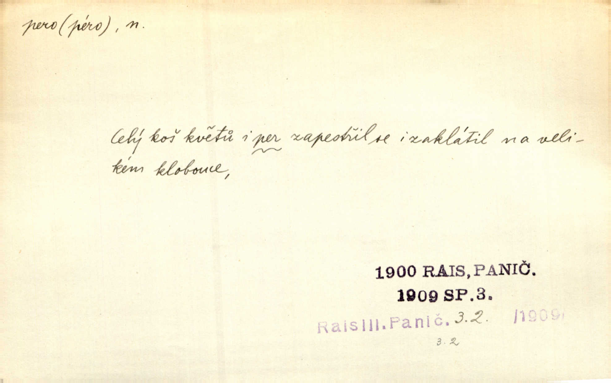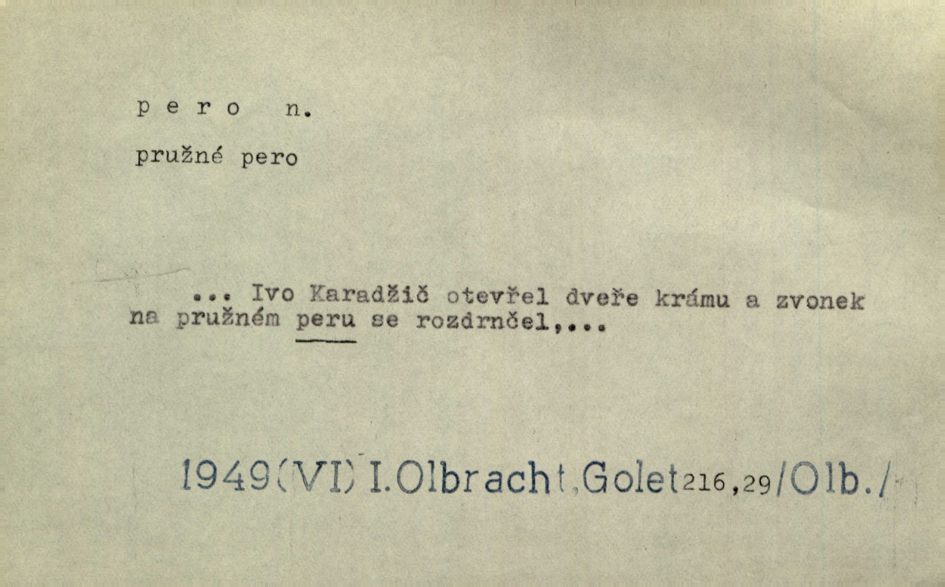 - pero, péro (arch. též píro), -a n. velké peří z ptačích křídel n. ocasu. Vysoké mu péro s přilby vlá. Vrch. Tiché, šťastné vísky kladou se v stínech hlubokých jako zavanutá péra obrovské labuti. Pfleg. Gouvernantka rozpačitá [tančí] stále skrytá za vějířem z pavích per. Vrch. Nějaké píro pštrosí ukaž! Win. Zool. péro obrysové, rejdovací. D nástroj ke psaní inkoustem n. tuší. Pero ocelové, skleněné, dámské, kuličkové, notové a j.; pero plnicí psací pero s inkoustovou nádržkou v držátku; pero rýsovací k vytahování čar tuší. Přiřízl si první péro rákosové. Ner. Před ním ležela kniha, papír, brková péra. Jir. Ustál. sp. Dal se do psaní Stazině. Ale nešlo mu z péra, po každé větě se zamýšlel. Šim. Stává se každý podezřelým, kdo proti odsuzování čarodějnic slovem neb pérem brojí písemně. Čech. Jsem přesvědčen, že ten pamětní spis pochází přímo z jeho péra že jej napsal. Čap. Ch. V kvartě chopil jsem se i péra počal jsem spisovati. Jir. Předchůdcové moji v soudní rubrice byli staří, osvědčení novináři, v péře honění zvyklí psáti. Herrm. Někdy se člověk dá k novinám, protože o sobě věří, že má dobré pero je dobrý stylista. K. Čap. „Veřejnému mínění“ od najatých per dokazováno, že Ludvík XIV. pochází od Karla Velikého od spisovatelů. Rez. Nevěděl byste ženicha pro mou nevlastní dceru Růženu? Musilo by to být něco lepšího, takhle něco od péra úředník. Staš. Advokáti říkali písařům do péra sáhodlouhé protokoly diktovali. Staš. Kdo to má zanedbanému lidu dáti do péra navésti jej? Šmil. D pružná součástka nějakého stroje, přístroje a p. Natáhl chrčivě se vzpírající péro budíčku. Vrba. Zoubek tlačí zoubek, pero žene pero. Bozd. Náhle, jakoby pérem vymrštěn, vzchopil se muž se stolu. Ner. Stiskl na stěně nějaké pero a objevily se tajné nízké dveře. J. J. Kol. Vyjížděl ze zámku panský kočár na ohromných perách. Jir. Klín povozu v pérách prudce zakolísal. Čap. Ch. Žlutá pera kulatých brejlí ztrácela se na spáncích v houšti vlasů. Jir. Tech. pružná součást rozmanitého tvaru sloužící k udržení polohy, k přenášení tahu n. tlaku, k zachycení n. utlumení rázů, k pohybu n. pohonu a j., zpružina, zpruha. Pero ohýbané, zkrucované, rovné, spirálové, šroubové a j.; pero listové složené z pásů (listů), pero bicí, hodinové, pojistné a p. Stroj. podélný klín bez úkosu. Technol. (v tesařství a v truhlářství) plochá lišta, která se vsazuje do drážek vyhoblovaných v obou hranách, jimiž spojovaná prkna k sobě přiléhají, n. lišta vyhoblovaná v hraně jednoho prkna a zasunující se do drážky vyhoblované v hraně druhého prkna. Spojení na pero a drážku. Stav. silná fošna n. krajina, která se připevňuje na piloty mostní bárky; část železné kované botky, kterou se připojuje botka k pilotě. D pružná vložka obuvi zvané perka. Rozškubaná péra [botek] vyčuhovala zpod kalhot až příliš krátkých. Merh. Vulg. Dyž ti mně, hochu, vodtamtuď vyndali péra, tak jako kdyby tě někdo rovnou přes nos praštil, poslali mě odtamtud. Němec. D Arch. kord. Na rohatině v řemenech zavěšen rapír nebo dlouhé péro. Win. Pravicí o hůl se opíral, po levém boku viselo v pantaleru mohutné „píro“ s rukojetí pěkně pletenou. Jir. D Dial. kytice. Z jara dělají se péra z lesních a polních květin. Něm. D Mysl. ocas jelení n. zaječí. D Zool. mořské péro polyp z čeledi Pennatulidae, Pennatula. D Kuch. hovězí maso mezi krkem a hřbetem.
