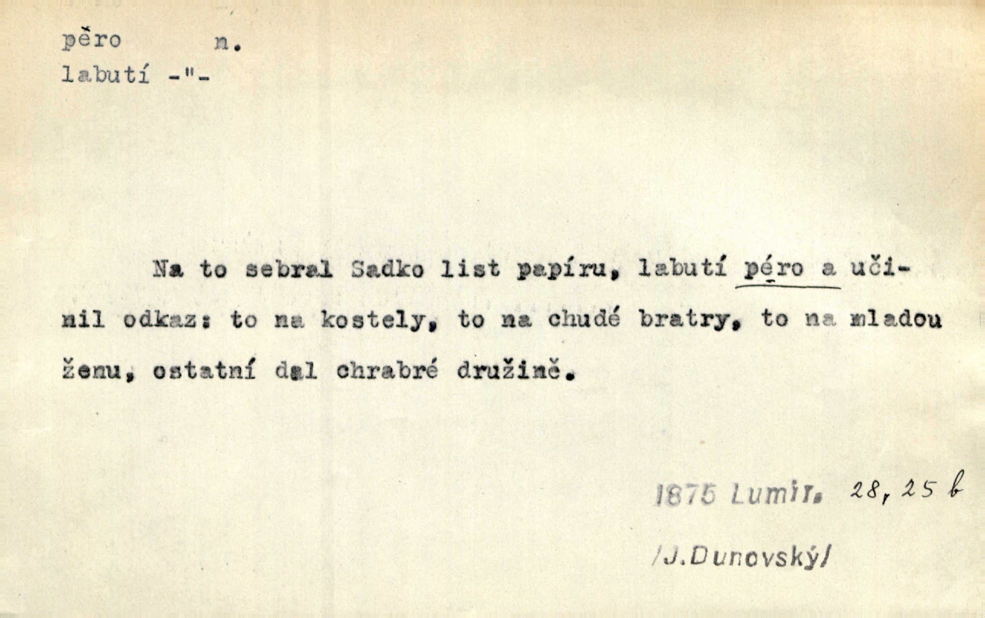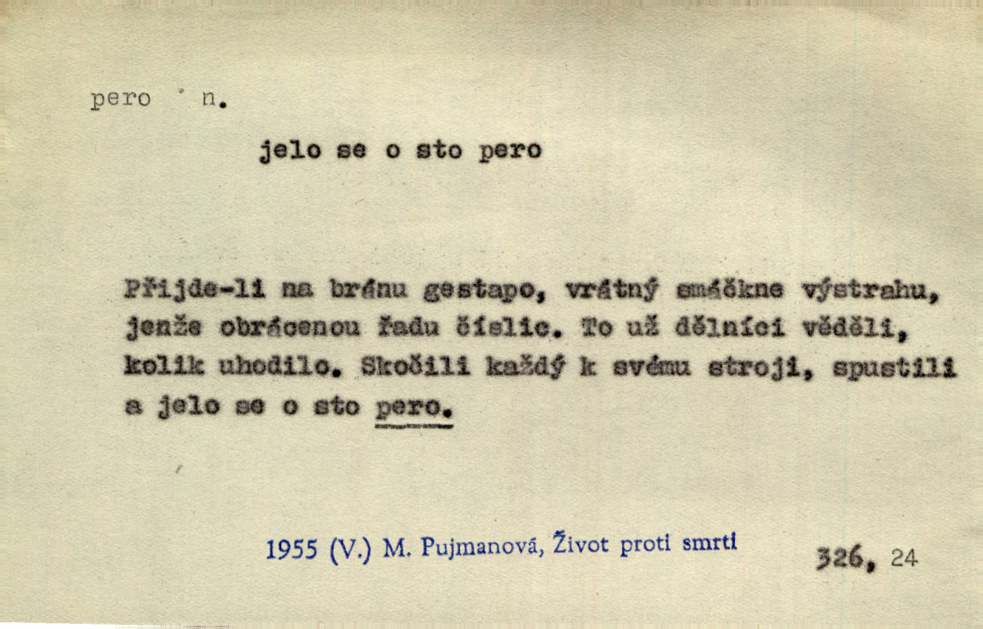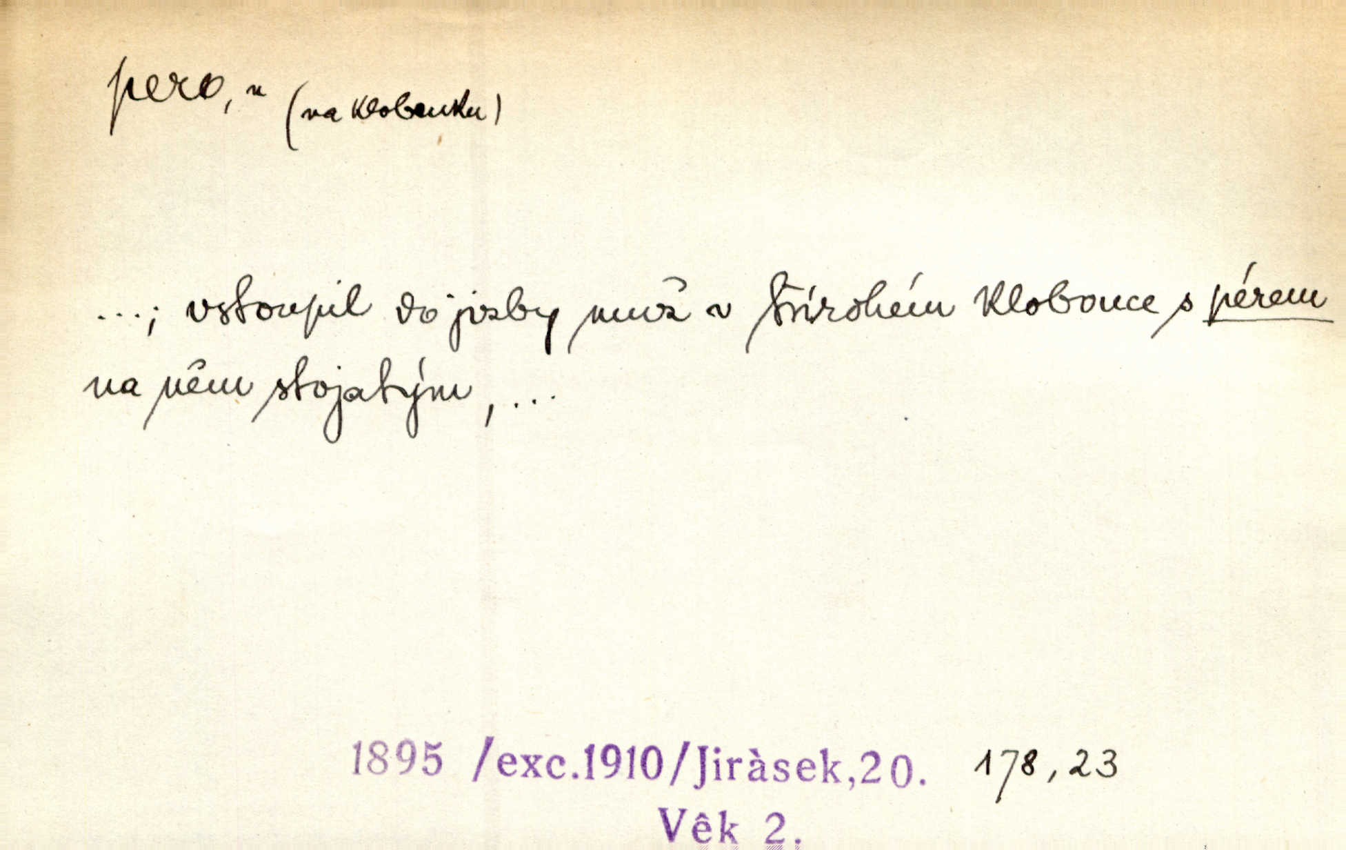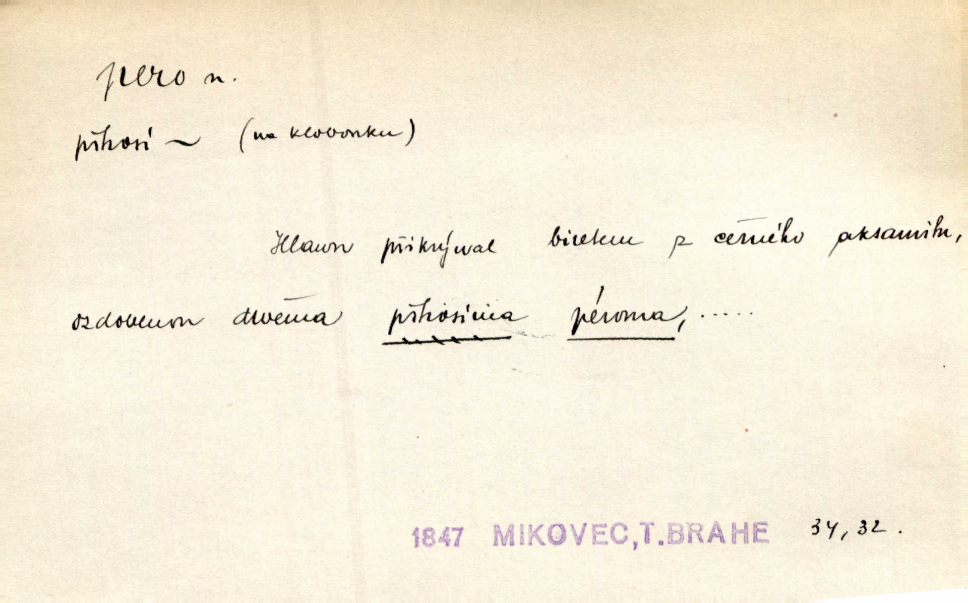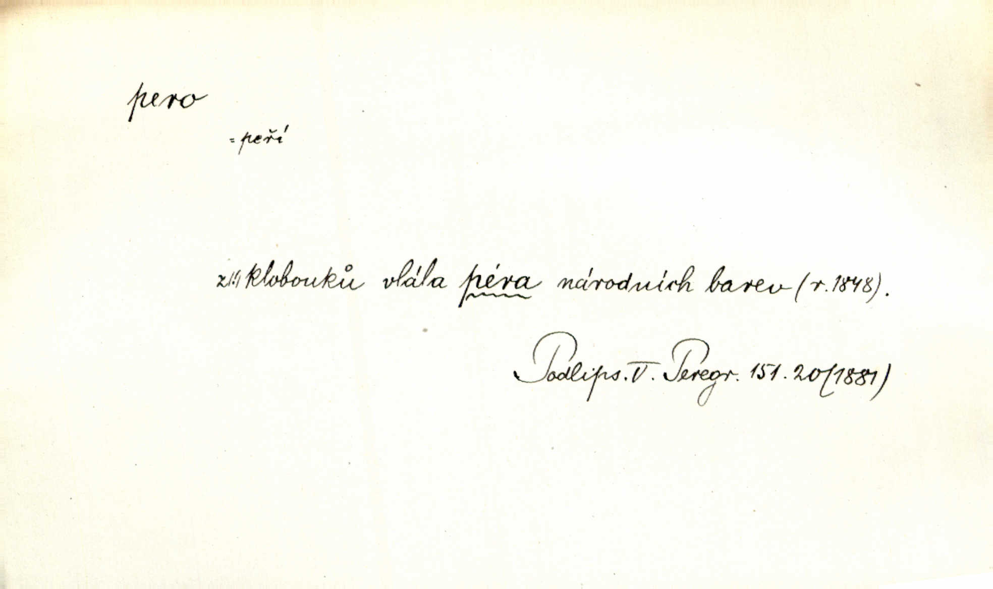 - pero, péro (arch. též píro), -a n. velké peří z ptačích křídel n. ocasu. Vysoké mu péro s přilby vlá. Vrch. Tiché, šťastné vísky kladou se v stínech hlubokých jako zavanutá péra obrovské labuti. Pfleg. Gouvernantka rozpačitá [tančí] stále skrytá za vějířem z pavích per. Vrch. Nějaké píro pštrosí ukaž! Win. Zool. péro obrysové, rejdovací. D nástroj ke psaní inkoustem n. tuší. Pero ocelové, skleněné, dámské, kuličkové, notové a j.; pero plnicí psací pero s inkoustovou nádržkou v držátku; pero rýsovací k vytahování čar tuší. Přiřízl si první péro rákosové. Ner. Před ním ležela kniha, papír, brková péra. Jir. Ustál. sp. Dal se do psaní Stazině. Ale nešlo mu z péra, po každé větě se zamýšlel. Šim. Stává se každý podezřelým, kdo proti odsuzování čarodějnic slovem neb pérem brojí písemně. Čech. Jsem přesvědčen, že ten pamětní spis pochází přímo z jeho péra že jej napsal. Čap. Ch. V kvartě chopil jsem se i péra počal jsem spisovati. Jir. Předchůdcové moji v soudní rubrice byli staří, osvědčení novináři, v péře honění zvyklí psáti. Herrm. Někdy se člověk dá k novinám, protože o sobě věří, že má dobré pero je dobrý stylista. K. Čap. „Veřejnému mínění“ od najatých per dokazováno, že Ludvík XIV. pochází od Karla Velikého od spisovatelů. Rez. Nevěděl byste ženicha pro mou nevlastní dceru Růženu? Musilo by to být něco lepšího, takhle něco od péra úředník. Staš. Advokáti říkali písařům do péra sáhodlouhé protokoly diktovali. Staš. Kdo to má zanedbanému lidu dáti do péra navésti jej? Šmil. D pružná součástka nějakého stroje, přístroje a p. Natáhl chrčivě se vzpírající péro budíčku. Vrba. Zoubek tlačí zoubek, pero žene pero. Bozd. Náhle, jakoby pérem vymrštěn, vzchopil se muž se stolu. Ner. Stiskl na stěně nějaké pero a objevily se tajné nízké dveře. J. J. Kol. Vyjížděl ze zámku panský kočár na ohromných perách. Jir. Klín povozu v pérách prudce zakolísal. Čap. Ch. Žlutá pera kulatých brejlí ztrácela se na spáncích v houšti vlasů. Jir. Tech. pružná součást rozmanitého tvaru sloužící k udržení polohy, k přenášení tahu n. tlaku, k zachycení n. utlumení rázů, k pohybu n. pohonu a j., zpružina, zpruha. Pero ohýbané, zkrucované, rovné, spirálové, šroubové a j.; pero listové složené z pásů (listů), pero bicí, hodinové, pojistné a p. Stroj. podélný klín bez úkosu. Technol. (v tesařství a v truhlářství) plochá lišta, která se vsazuje do drážek vyhoblovaných v obou hranách, jimiž spojovaná prkna k sobě přiléhají, n. lišta vyhoblovaná v hraně jednoho prkna a zasunující se do drážky vyhoblované v hraně druhého prkna. Spojení na pero a drážku. Stav. silná fošna n. krajina, která se připevňuje na piloty mostní bárky; část železné kované botky, kterou se připojuje botka k pilotě. D pružná vložka obuvi zvané perka. Rozškubaná péra [botek] vyčuhovala zpod kalhot až příliš krátkých. Merh. Vulg. Dyž ti mně, hochu, vodtamtuď vyndali péra, tak jako kdyby tě někdo rovnou přes nos praštil, poslali mě odtamtud. Němec. D Arch. kord. Na rohatině v řemenech zavěšen rapír nebo dlouhé péro. Win. Pravicí o hůl se opíral, po levém boku viselo v pantaleru mohutné „píro“ s rukojetí pěkně pletenou. Jir. D Dial. kytice. Z jara dělají se péra z lesních a polních květin. Něm. D Mysl. ocas jelení n. zaječí. D Zool. mořské péro polyp z čeledi Pennatulidae, Pennatula. D Kuch. hovězí maso mezi krkem a hřbetem.
