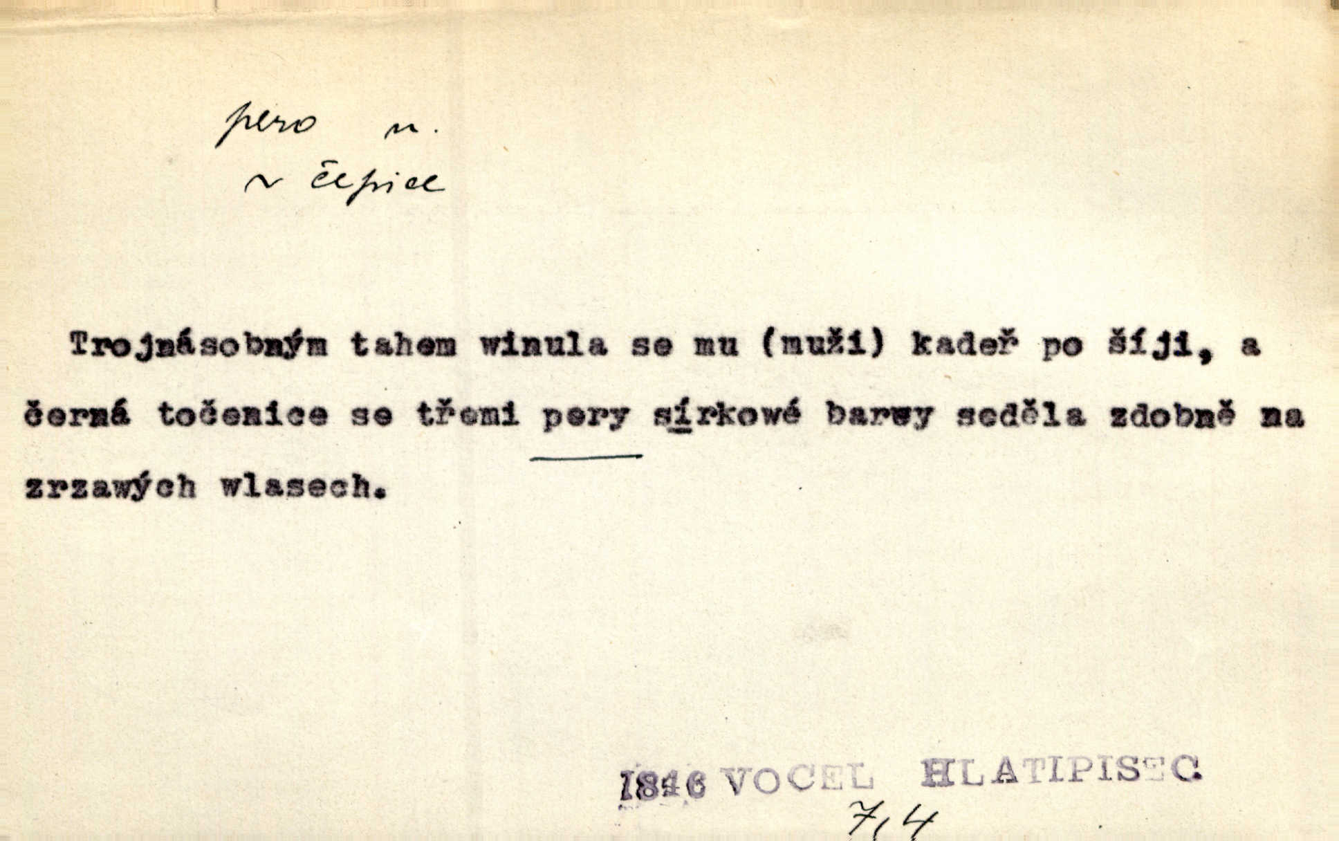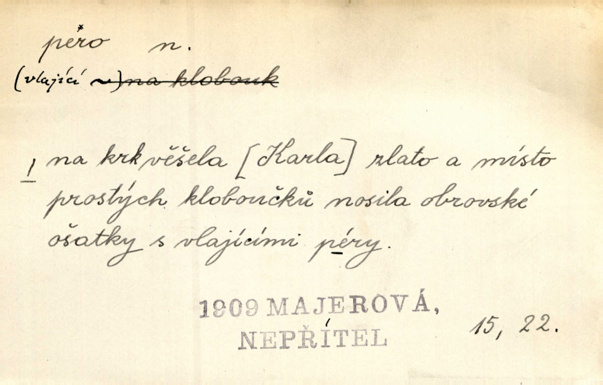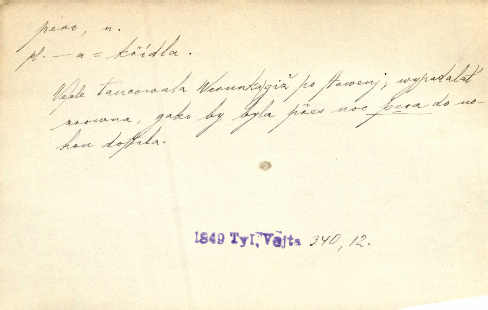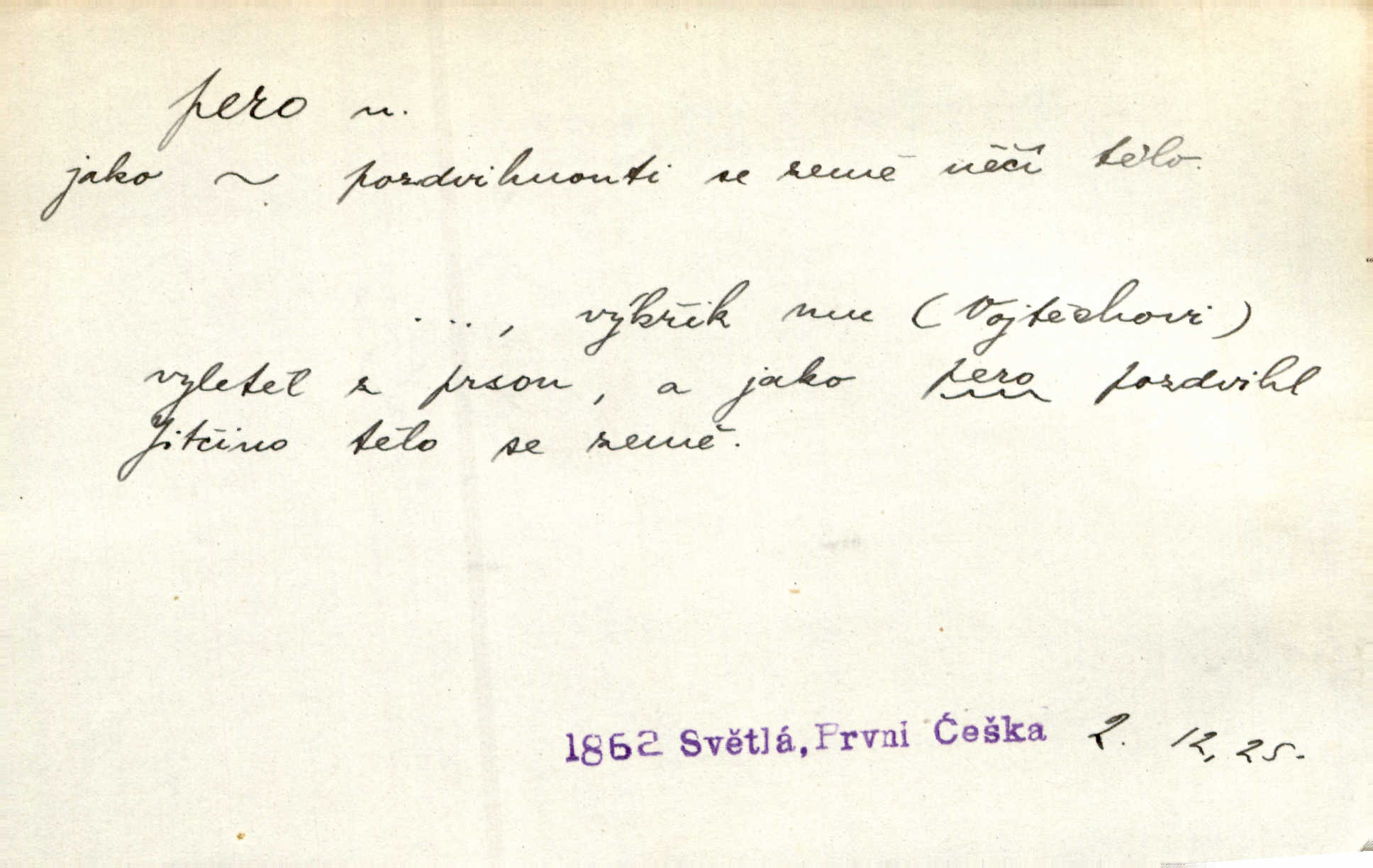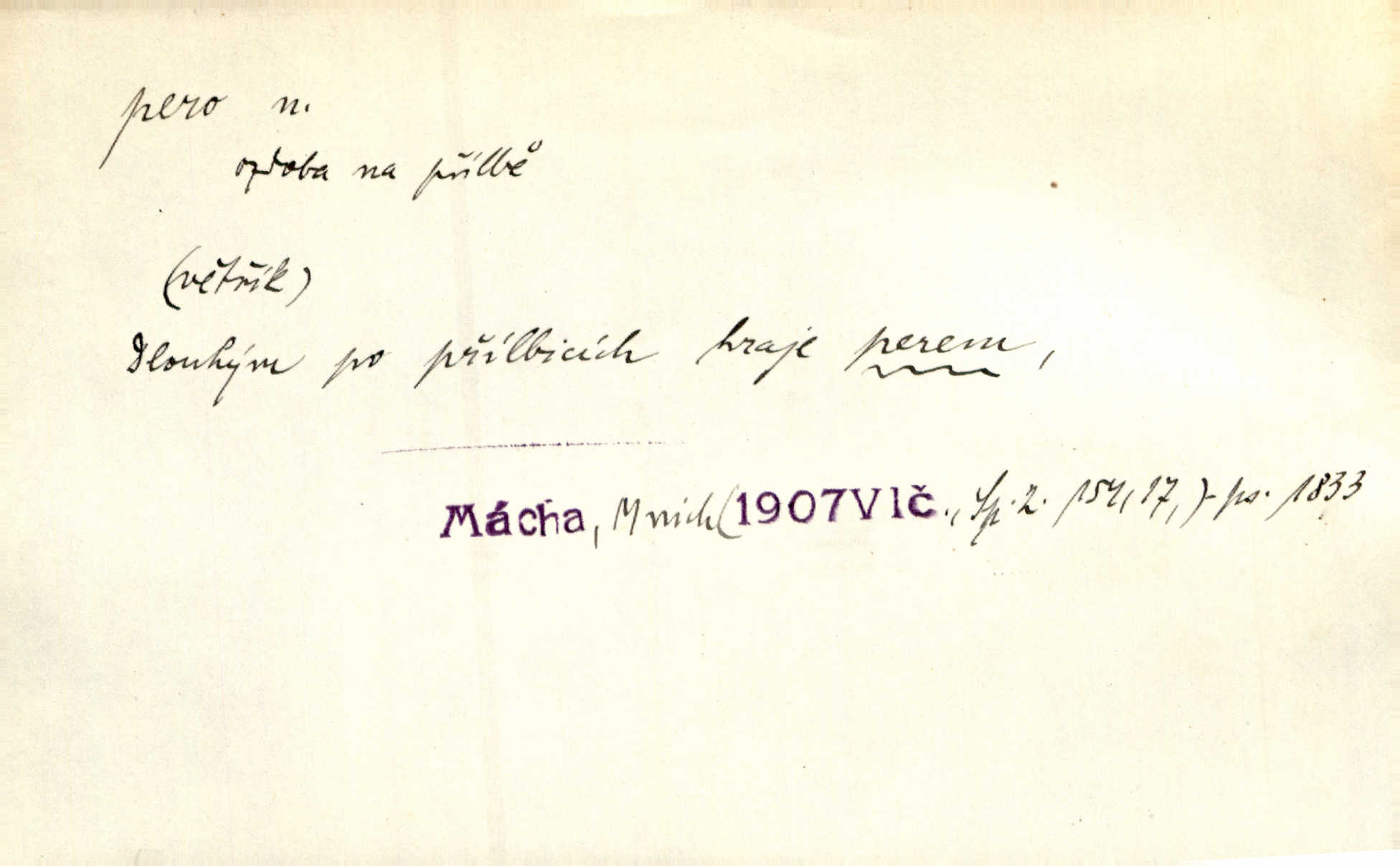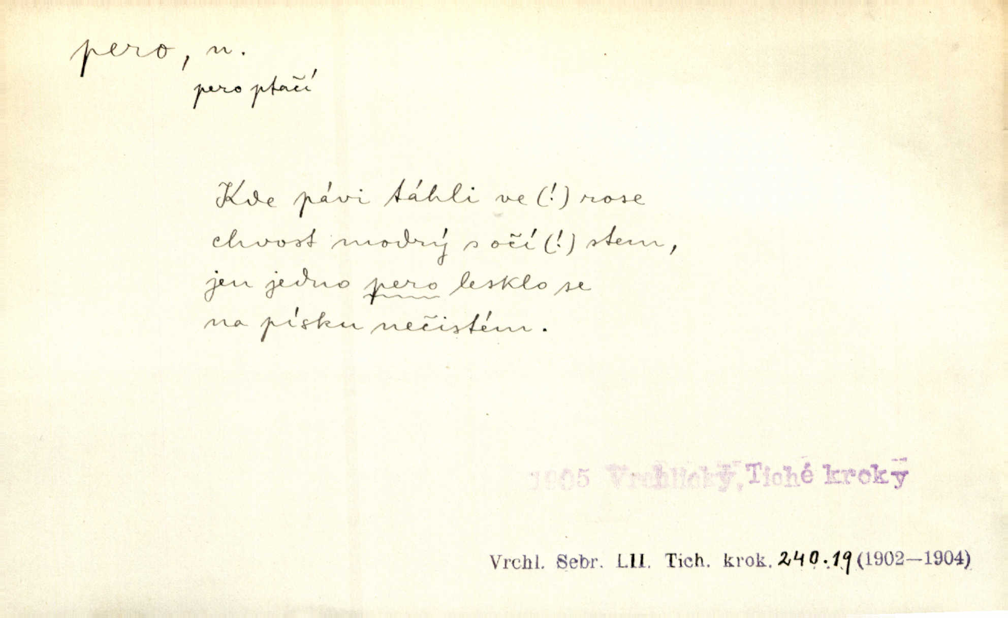 - pero, péro (arch. též píro), -a n. velké peří z ptačích křídel n. ocasu. Vysoké mu péro s přilby vlá. Vrch. Tiché, šťastné vísky kladou se v stínech hlubokých jako zavanutá péra obrovské labuti. Pfleg. Gouvernantka rozpačitá [tančí] stále skrytá za vějířem z pavích per. Vrch. Nějaké píro pštrosí ukaž! Win. Zool. péro obrysové, rejdovací. D nástroj ke psaní inkoustem n. tuší. Pero ocelové, skleněné, dámské, kuličkové, notové a j.; pero plnicí psací pero s inkoustovou nádržkou v držátku; pero rýsovací k vytahování čar tuší. Přiřízl si první péro rákosové. Ner. Před ním ležela kniha, papír, brková péra. Jir. Ustál. sp. Dal se do psaní Stazině. Ale nešlo mu z péra, po každé větě se zamýšlel. Šim. Stává se každý podezřelým, kdo proti odsuzování čarodějnic slovem neb pérem brojí písemně. Čech. Jsem přesvědčen, že ten pamětní spis pochází přímo z jeho péra že jej napsal. Čap. Ch. V kvartě chopil jsem se i péra počal jsem spisovati. Jir. Předchůdcové moji v soudní rubrice byli staří, osvědčení novináři, v péře honění zvyklí psáti. Herrm. Někdy se člověk dá k novinám, protože o sobě věří, že má dobré pero je dobrý stylista. K. Čap. „Veřejnému mínění“ od najatých per dokazováno, že Ludvík XIV. pochází od Karla Velikého od spisovatelů. Rez. Nevěděl byste ženicha pro mou nevlastní dceru Růženu? Musilo by to být něco lepšího, takhle něco od péra úředník. Staš. Advokáti říkali písařům do péra sáhodlouhé protokoly diktovali. Staš. Kdo to má zanedbanému lidu dáti do péra navésti jej? Šmil. D pružná součástka nějakého stroje, přístroje a p. Natáhl chrčivě se vzpírající péro budíčku. Vrba. Zoubek tlačí zoubek, pero žene pero. Bozd. Náhle, jakoby pérem vymrštěn, vzchopil se muž se stolu. Ner. Stiskl na stěně nějaké pero a objevily se tajné nízké dveře. J. J. Kol. Vyjížděl ze zámku panský kočár na ohromných perách. Jir. Klín povozu v pérách prudce zakolísal. Čap. Ch. Žlutá pera kulatých brejlí ztrácela se na spáncích v houšti vlasů. Jir. Tech. pružná součást rozmanitého tvaru sloužící k udržení polohy, k přenášení tahu n. tlaku, k zachycení n. utlumení rázů, k pohybu n. pohonu a j., zpružina, zpruha. Pero ohýbané, zkrucované, rovné, spirálové, šroubové a j.; pero listové složené z pásů (listů), pero bicí, hodinové, pojistné a p. Stroj. podélný klín bez úkosu. Technol. (v tesařství a v truhlářství) plochá lišta, která se vsazuje do drážek vyhoblovaných v obou hranách, jimiž spojovaná prkna k sobě přiléhají, n. lišta vyhoblovaná v hraně jednoho prkna a zasunující se do drážky vyhoblované v hraně druhého prkna. Spojení na pero a drážku. Stav. silná fošna n. krajina, která se připevňuje na piloty mostní bárky; část železné kované botky, kterou se připojuje botka k pilotě. D pružná vložka obuvi zvané perka. Rozškubaná péra [botek] vyčuhovala zpod kalhot až příliš krátkých. Merh. Vulg. Dyž ti mně, hochu, vodtamtuď vyndali péra, tak jako kdyby tě někdo rovnou přes nos praštil, poslali mě odtamtud. Němec. D Arch. kord. Na rohatině v řemenech zavěšen rapír nebo dlouhé péro. Win. Pravicí o hůl se opíral, po levém boku viselo v pantaleru mohutné „píro“ s rukojetí pěkně pletenou. Jir. D Dial. kytice. Z jara dělají se péra z lesních a polních květin. Něm. D Mysl. ocas jelení n. zaječí. D Zool. mořské péro polyp z čeledi Pennatulidae, Pennatula. D Kuch. hovězí maso mezi krkem a hřbetem.