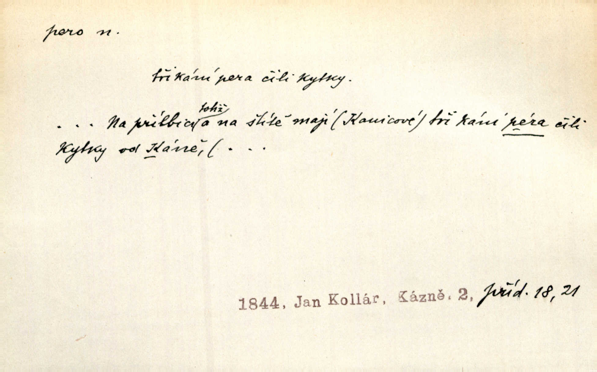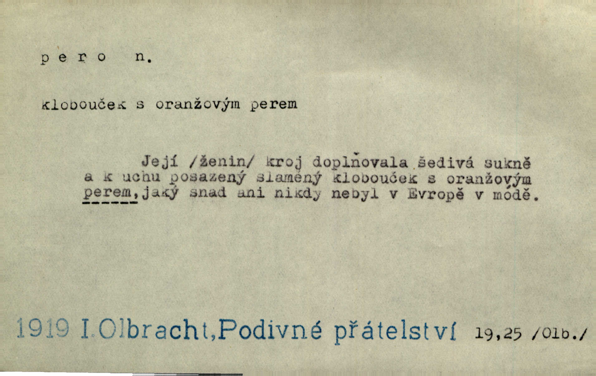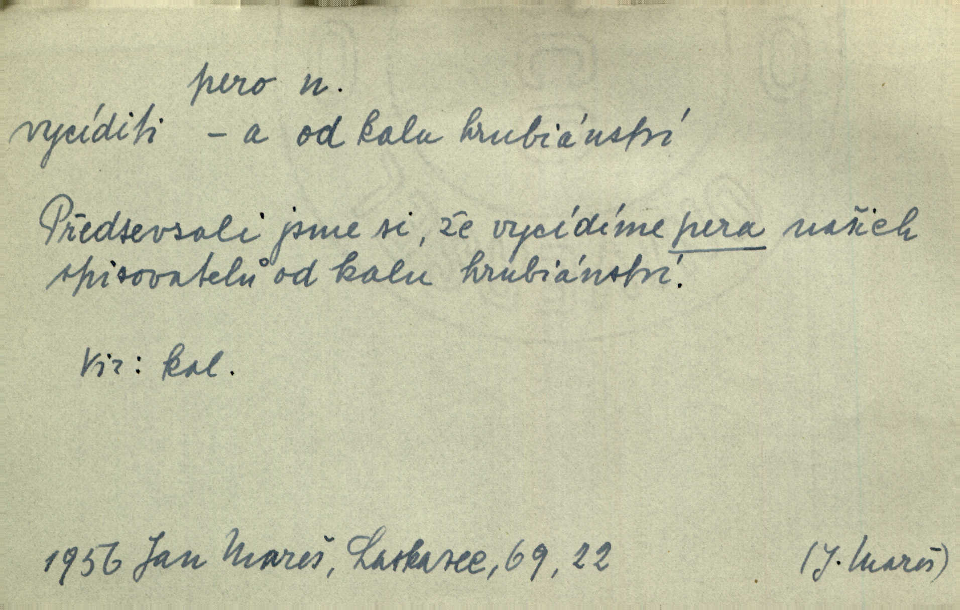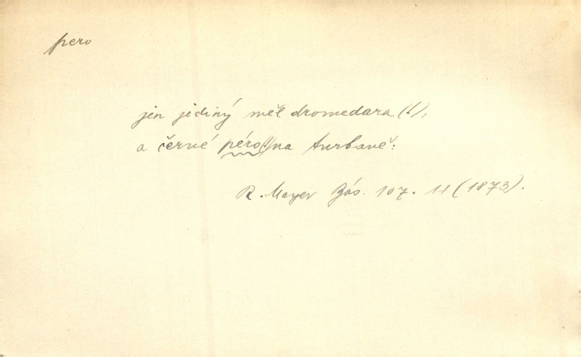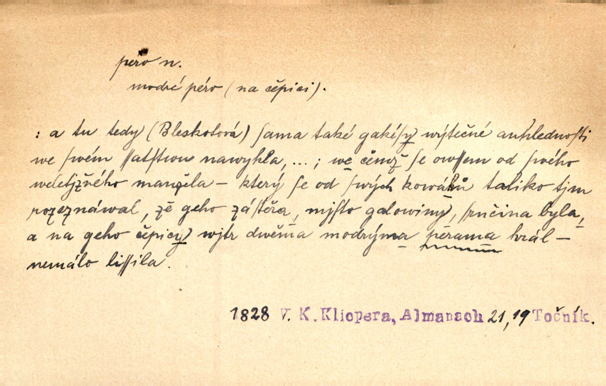 - pero, péro (arch. též píro), -a n. velké peří z ptačích křídel n. ocasu. Vysoké mu péro s přilby vlá. Vrch. Tiché, šťastné vísky kladou se v stínech hlubokých jako zavanutá péra obrovské labuti. Pfleg. Gouvernantka rozpačitá [tančí] stále skrytá za vějířem z pavích per. Vrch. Nějaké píro pštrosí ukaž! Win. Zool. péro obrysové, rejdovací. D nástroj ke psaní inkoustem n. tuší. Pero ocelové, skleněné, dámské, kuličkové, notové a j.; pero plnicí psací pero s inkoustovou nádržkou v držátku; pero rýsovací k vytahování čar tuší. Přiřízl si první péro rákosové. Ner. Před ním ležela kniha, papír, brková péra. Jir. Ustál. sp. Dal se do psaní Stazině. Ale nešlo mu z péra, po každé větě se zamýšlel. Šim. Stává se každý podezřelým, kdo proti odsuzování čarodějnic slovem neb pérem brojí písemně. Čech. Jsem přesvědčen, že ten pamětní spis pochází přímo z jeho péra že jej napsal. Čap. Ch. V kvartě chopil jsem se i péra počal jsem spisovati. Jir. Předchůdcové moji v soudní rubrice byli staří, osvědčení novináři, v péře honění zvyklí psáti. Herrm. Někdy se člověk dá k novinám, protože o sobě věří, že má dobré pero je dobrý stylista. K. Čap. „Veřejnému mínění“ od najatých per dokazováno, že Ludvík XIV. pochází od Karla Velikého od spisovatelů. Rez. Nevěděl byste ženicha pro mou nevlastní dceru Růženu? Musilo by to být něco lepšího, takhle něco od péra úředník. Staš. Advokáti říkali písařům do péra sáhodlouhé protokoly diktovali. Staš. Kdo to má zanedbanému lidu dáti do péra navésti jej? Šmil. D pružná součástka nějakého stroje, přístroje a p. Natáhl chrčivě se vzpírající péro budíčku. Vrba. Zoubek tlačí zoubek, pero žene pero. Bozd. Náhle, jakoby pérem vymrštěn, vzchopil se muž se stolu. Ner. Stiskl na stěně nějaké pero a objevily se tajné nízké dveře. J. J. Kol. Vyjížděl ze zámku panský kočár na ohromných perách. Jir. Klín povozu v pérách prudce zakolísal. Čap. Ch. Žlutá pera kulatých brejlí ztrácela se na spáncích v houšti vlasů. Jir. Tech. pružná součást rozmanitého tvaru sloužící k udržení polohy, k přenášení tahu n. tlaku, k zachycení n. utlumení rázů, k pohybu n. pohonu a j., zpružina, zpruha. Pero ohýbané, zkrucované, rovné, spirálové, šroubové a j.; pero listové složené z pásů (listů), pero bicí, hodinové, pojistné a p. Stroj. podélný klín bez úkosu. Technol. (v tesařství a v truhlářství) plochá lišta, která se vsazuje do drážek vyhoblovaných v obou hranách, jimiž spojovaná prkna k sobě přiléhají, n. lišta vyhoblovaná v hraně jednoho prkna a zasunující se do drážky vyhoblované v hraně druhého prkna. Spojení na pero a drážku. Stav. silná fošna n. krajina, která se připevňuje na piloty mostní bárky; část železné kované botky, kterou se připojuje botka k pilotě. D pružná vložka obuvi zvané perka. Rozškubaná péra [botek] vyčuhovala zpod kalhot až příliš krátkých. Merh. Vulg. Dyž ti mně, hochu, vodtamtuď vyndali péra, tak jako kdyby tě někdo rovnou přes nos praštil, poslali mě odtamtud. Němec. D Arch. kord. Na rohatině v řemenech zavěšen rapír nebo dlouhé péro. Win. Pravicí o hůl se opíral, po levém boku viselo v pantaleru mohutné „píro“ s rukojetí pěkně pletenou. Jir. D Dial. kytice. Z jara dělají se péra z lesních a polních květin. Něm. D Mysl. ocas jelení n. zaječí. D Zool. mořské péro polyp z čeledi Pennatulidae, Pennatula. D Kuch. hovězí maso mezi krkem a hřbetem.