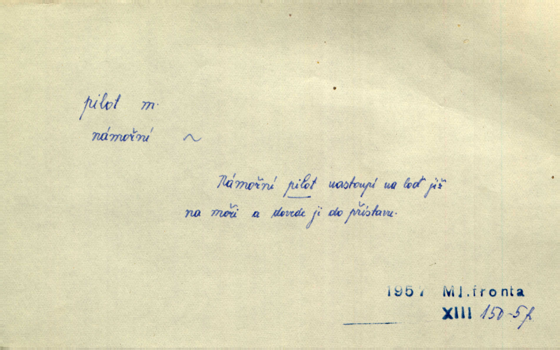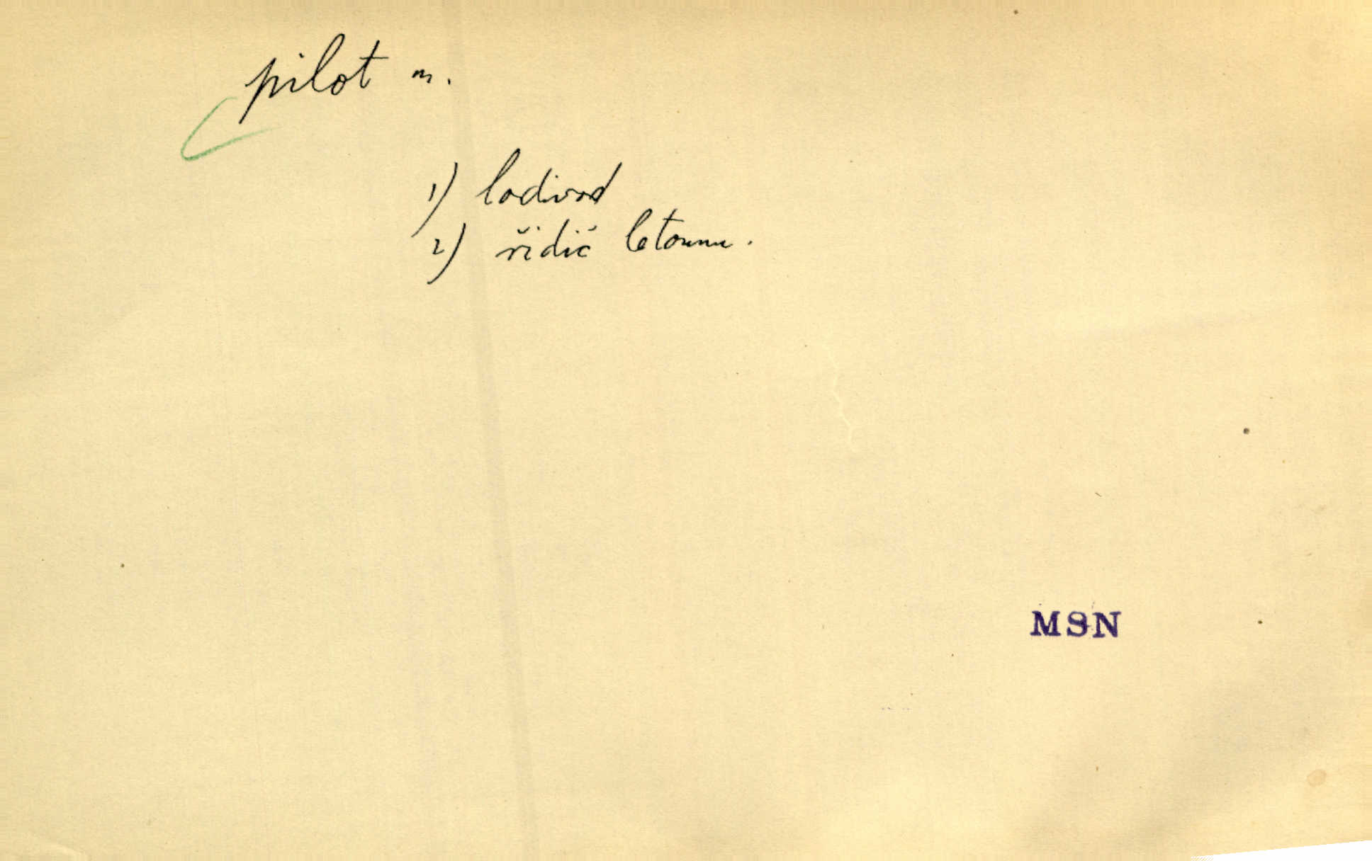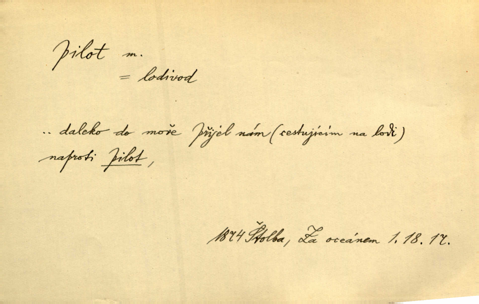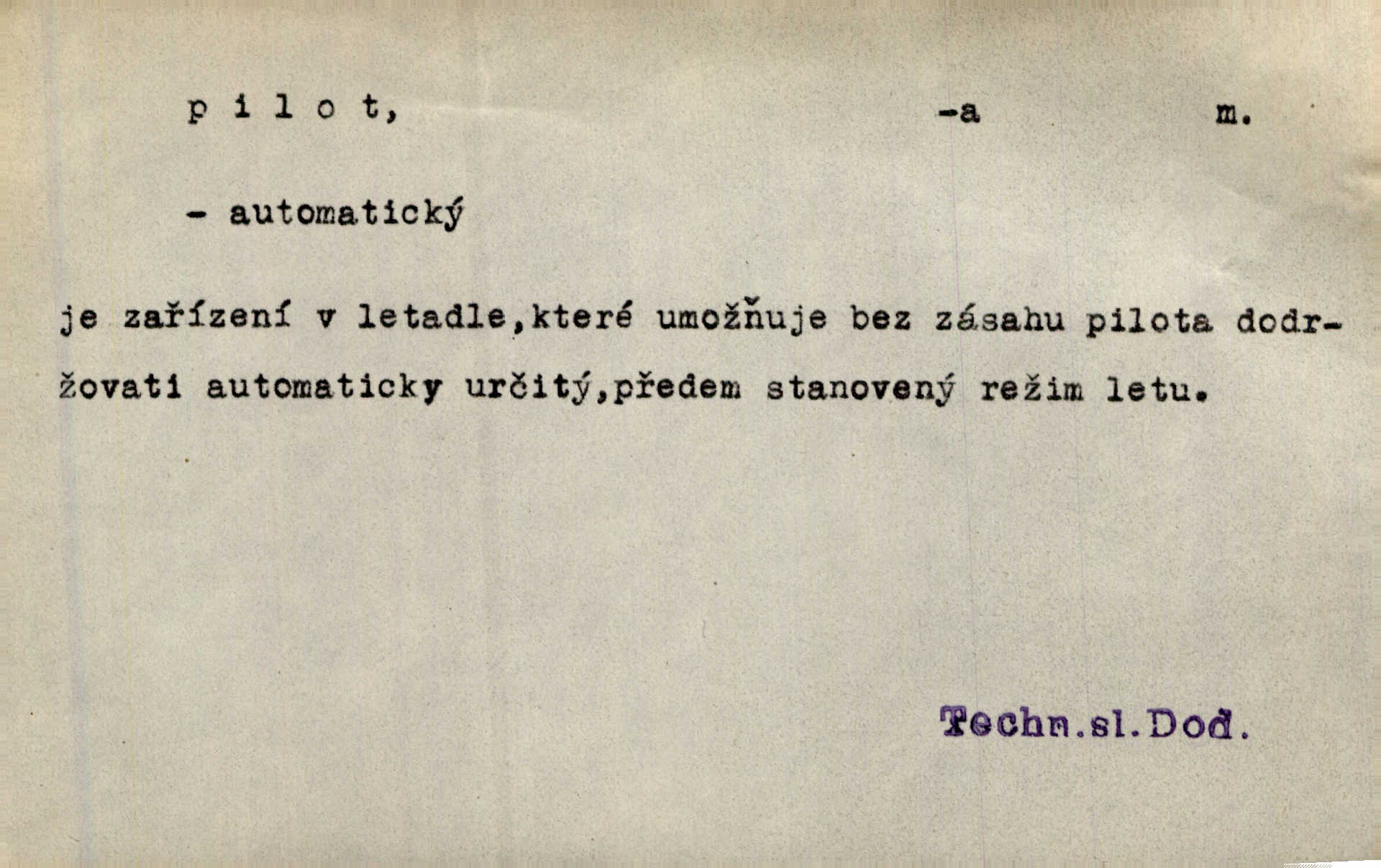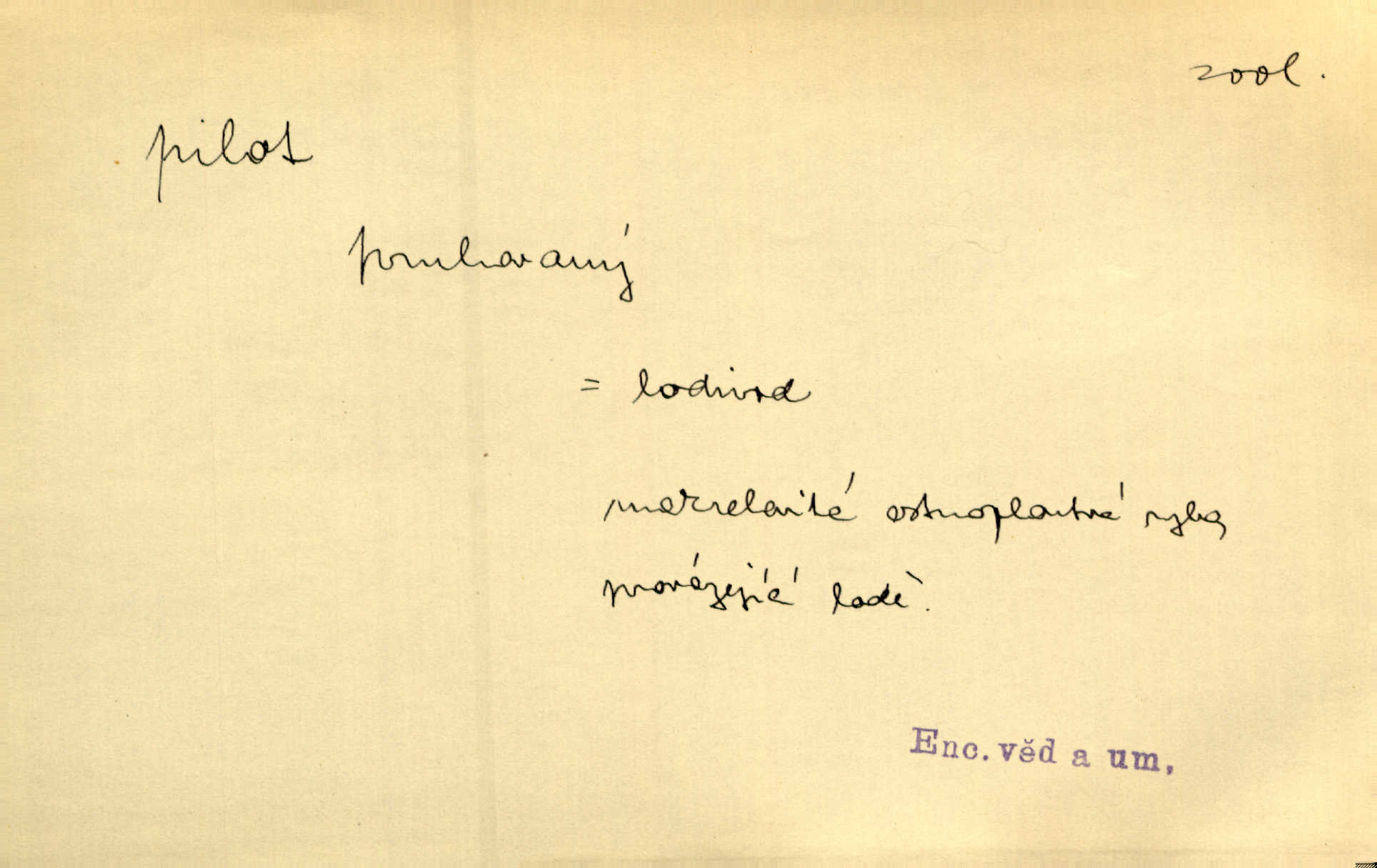 - pilot, -a m. řidič letadla. Machar v šedesáti letech vstupuje na aeroplán, aby dodal chuti mladým pilotům. Čes. sl. D Zast. lodivod. Daleko do moře přijel nám naproti pilot. Štol. Sám sobě pilotem a sám být pevnou lodí, nechť přijde kdokoli. Vrch. D Zool. pilot pruhovaný ryba z čeledi Crangidae, Naucrates ductor. Žel. zvláštní zaměstnanec doprovázející vlak po jistých úsecích a obeznámený s místními poměry.