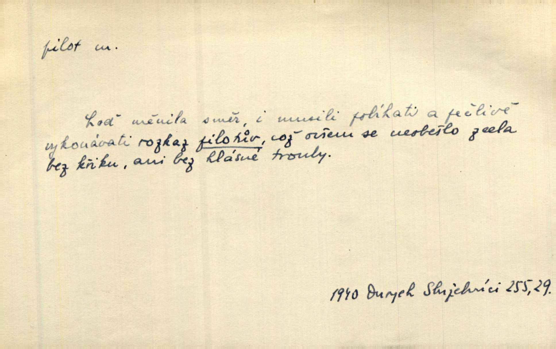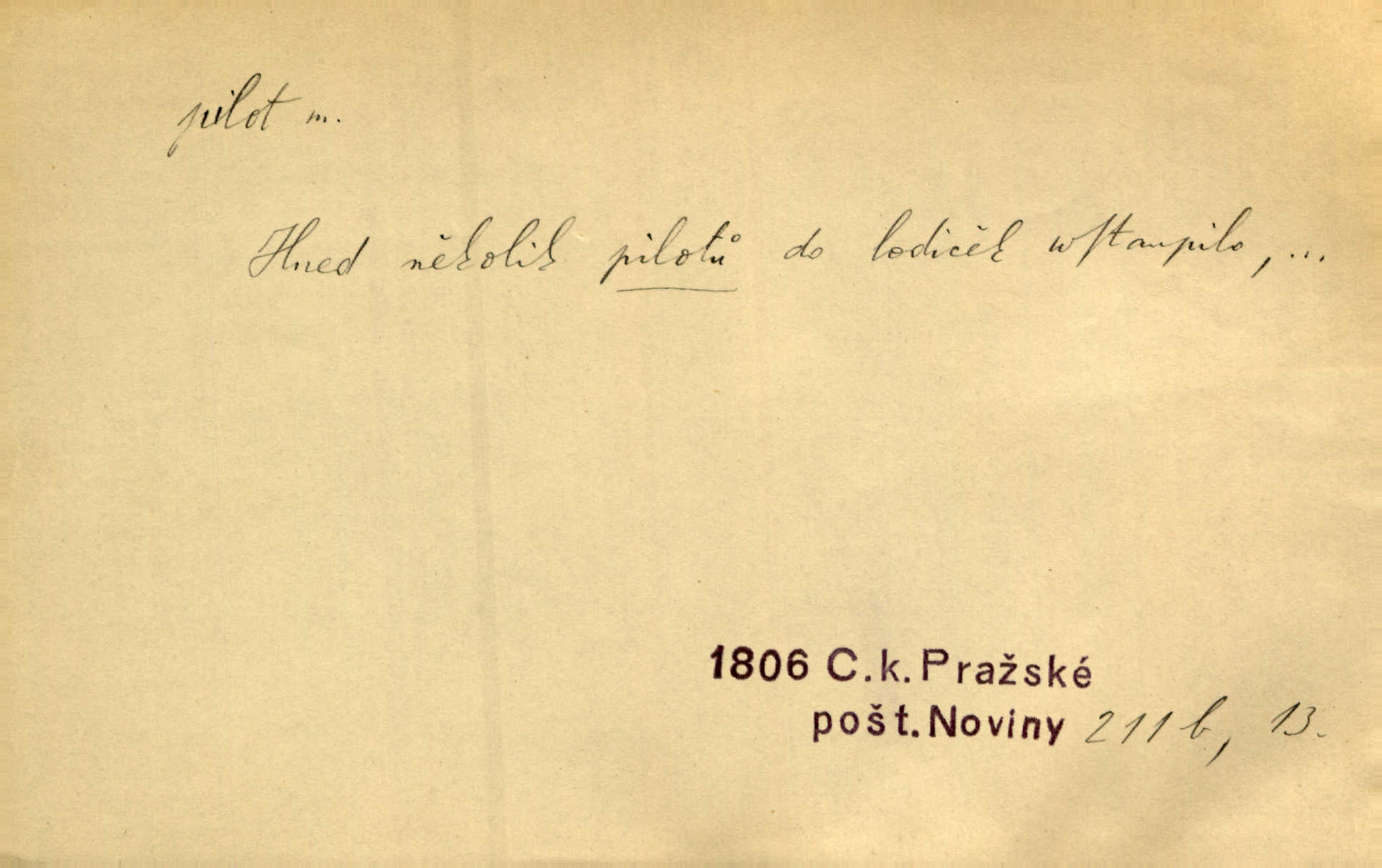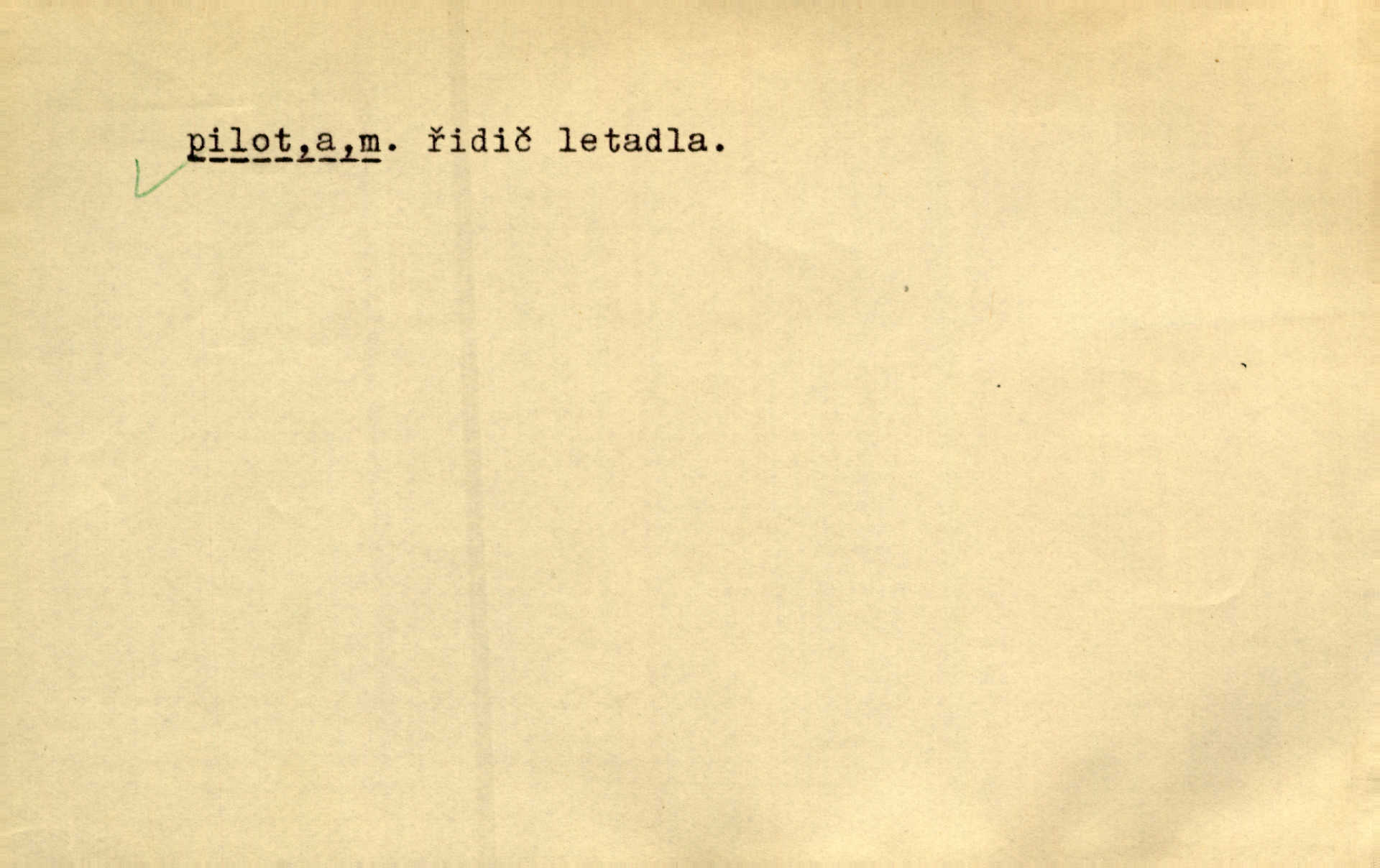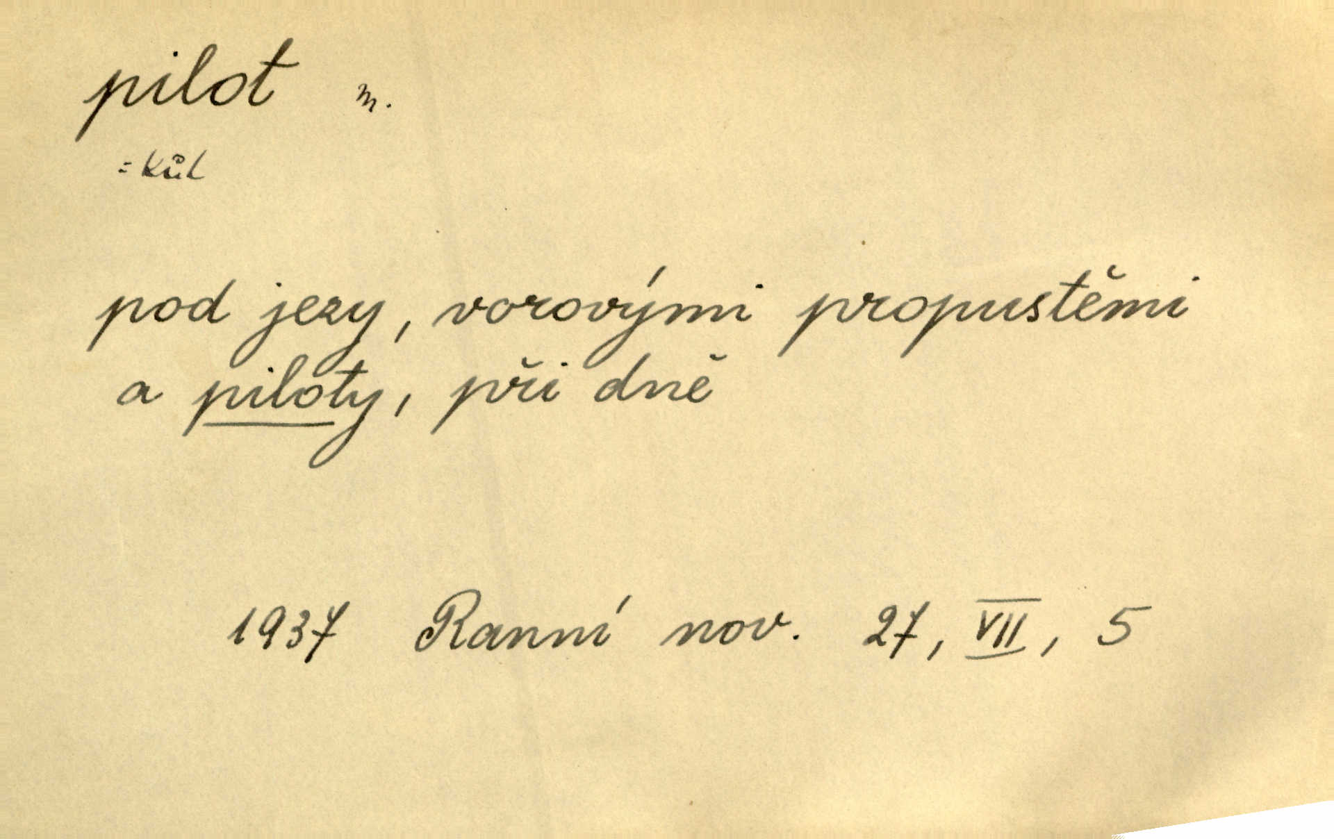 - pilot, -a m. řidič letadla. Machar v šedesáti letech vstupuje na aeroplán, aby dodal chuti mladým pilotům. Čes. sl. D Zast. lodivod. Daleko do moře přijel nám naproti pilot. Štol. Sám sobě pilotem a sám být pevnou lodí, nechť přijde kdokoli. Vrch. D Zool. pilot pruhovaný ryba z čeledi Crangidae, Naucrates ductor. Žel. zvláštní zaměstnanec doprovázející vlak po jistých úsecích a obeznámený s místními poměry.