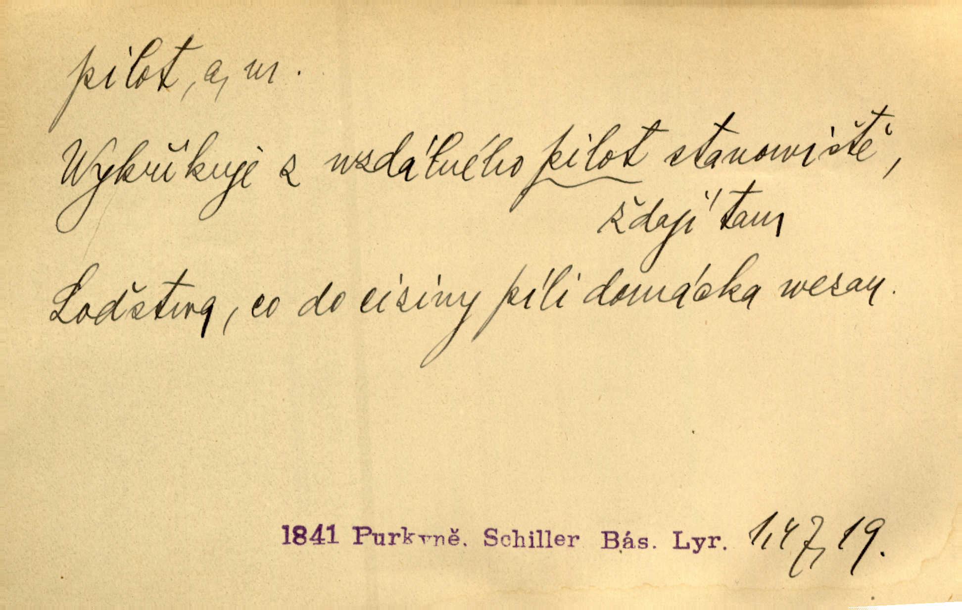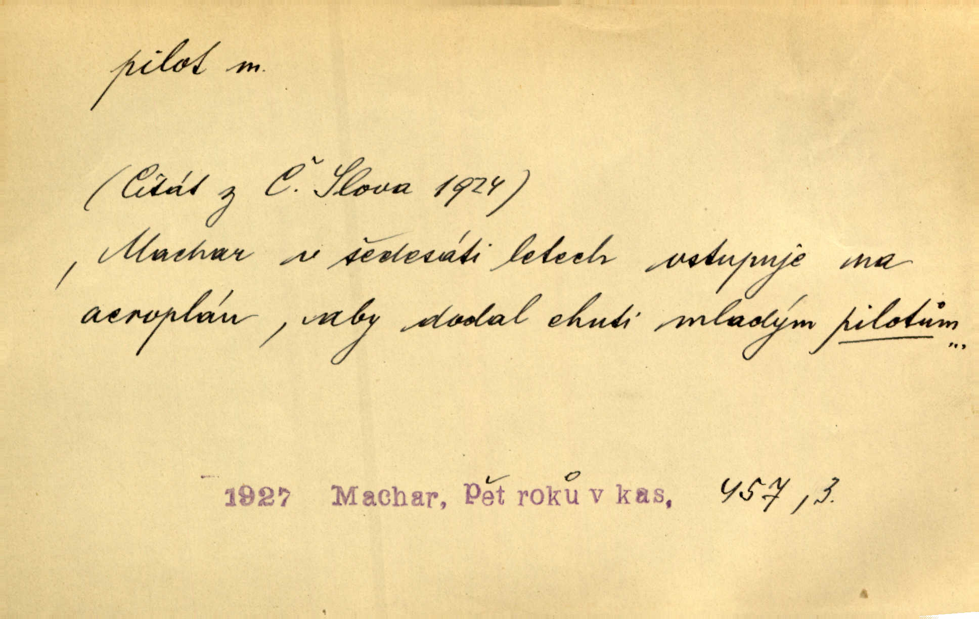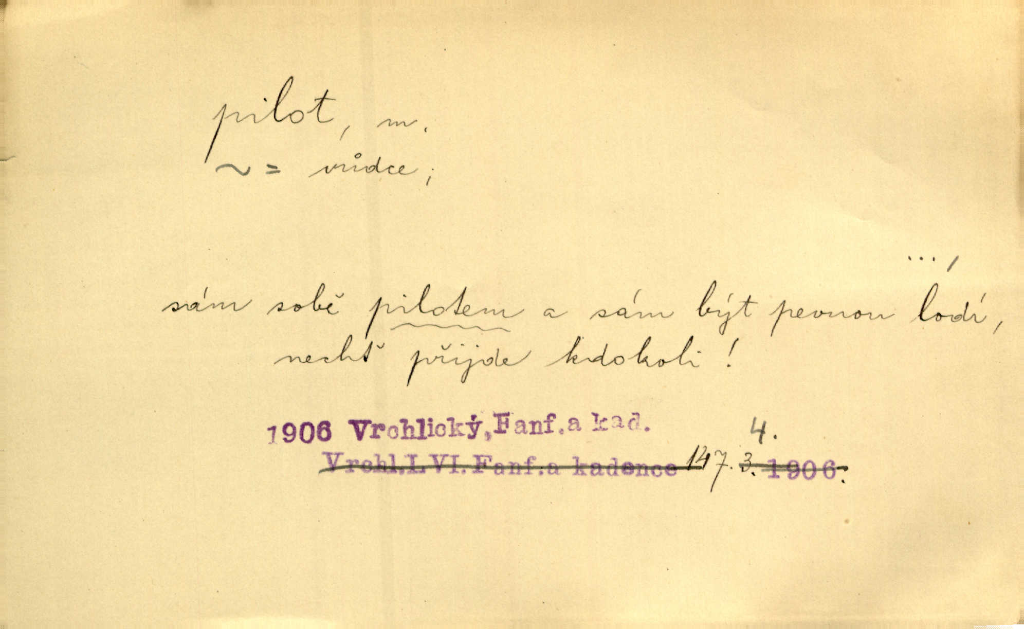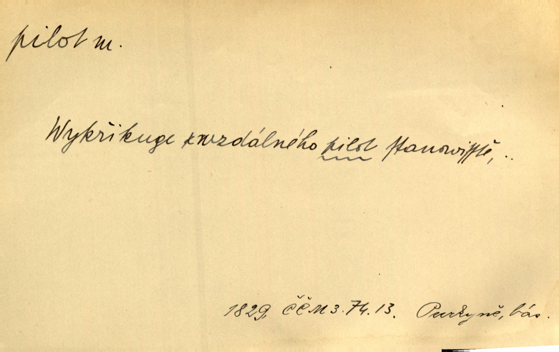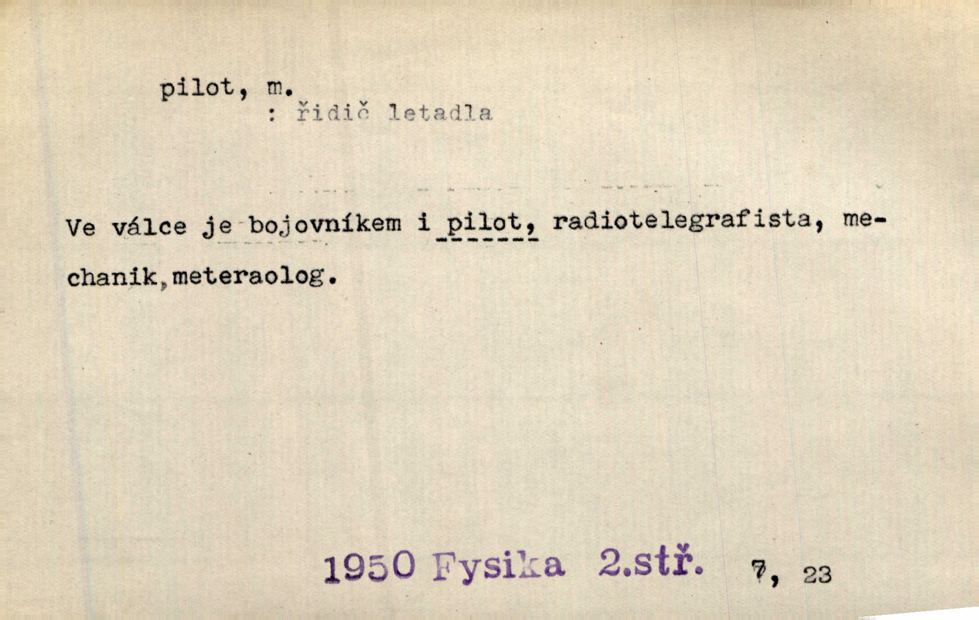 - pilot, -a m. řidič letadla. Machar v šedesáti letech vstupuje na aeroplán, aby dodal chuti mladým pilotům. Čes. sl. D Zast. lodivod. Daleko do moře přijel nám naproti pilot. Štol. Sám sobě pilotem a sám být pevnou lodí, nechť přijde kdokoli. Vrch. D Zool. pilot pruhovaný ryba z čeledi Crangidae, Naucrates ductor. Žel. zvláštní zaměstnanec doprovázející vlak po jistých úsecích a obeznámený s místními poměry.