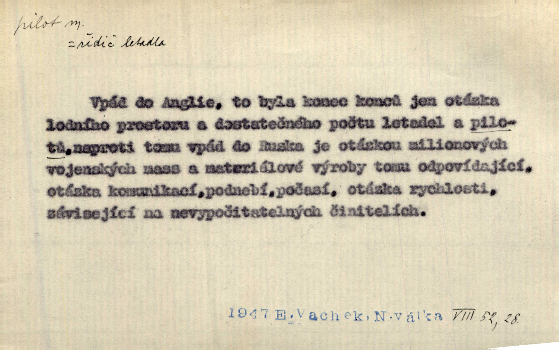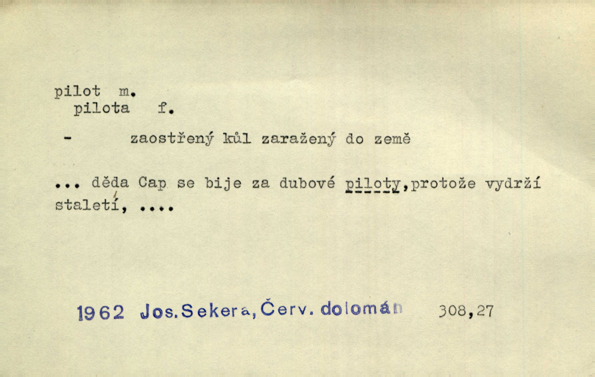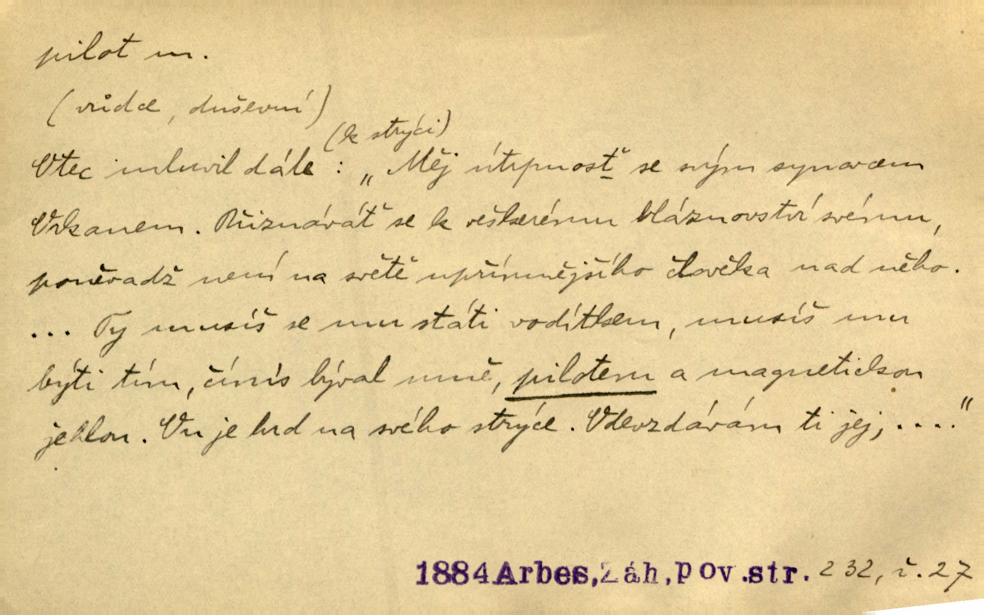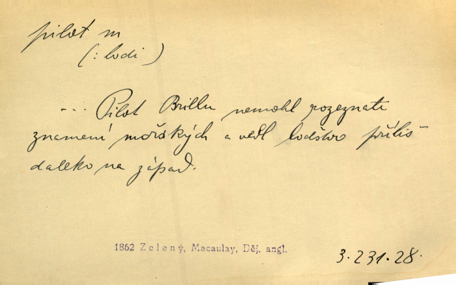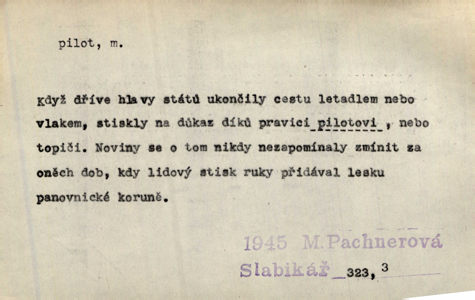 - pilot, -a m. řidič letadla. Machar v šedesáti letech vstupuje na aeroplán, aby dodal chuti mladým pilotům. Čes. sl. D Zast. lodivod. Daleko do moře přijel nám naproti pilot. Štol. Sám sobě pilotem a sám být pevnou lodí, nechť přijde kdokoli. Vrch. D Zool. pilot pruhovaný ryba z čeledi Crangidae, Naucrates ductor. Žel. zvláštní zaměstnanec doprovázející vlak po jistých úsecích a obeznámený s místními poměry.