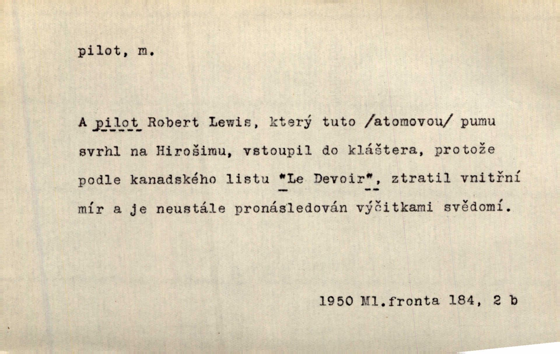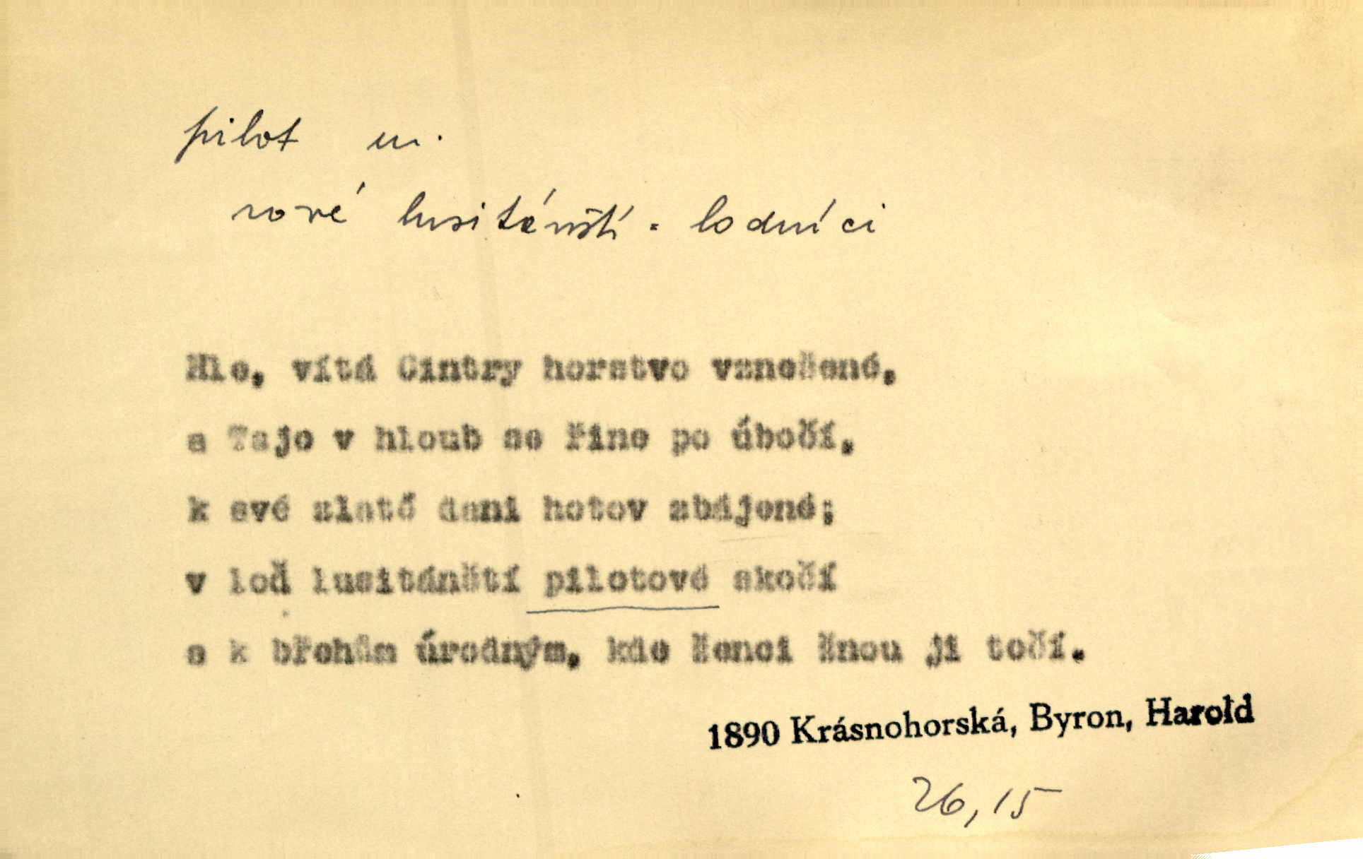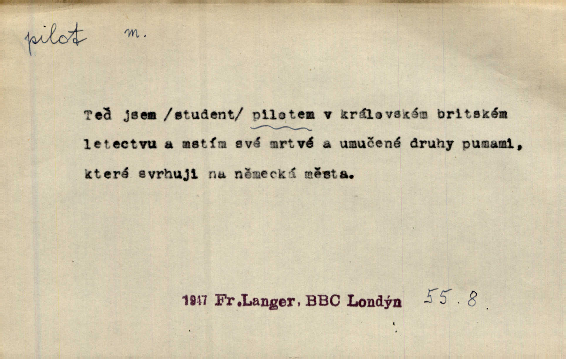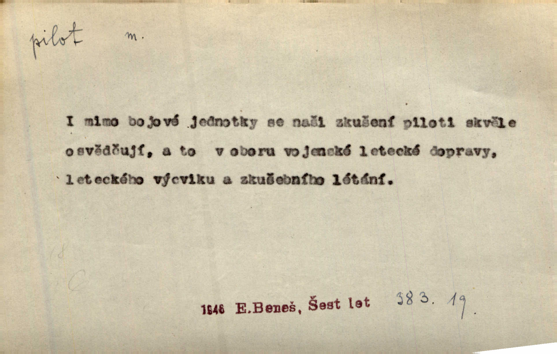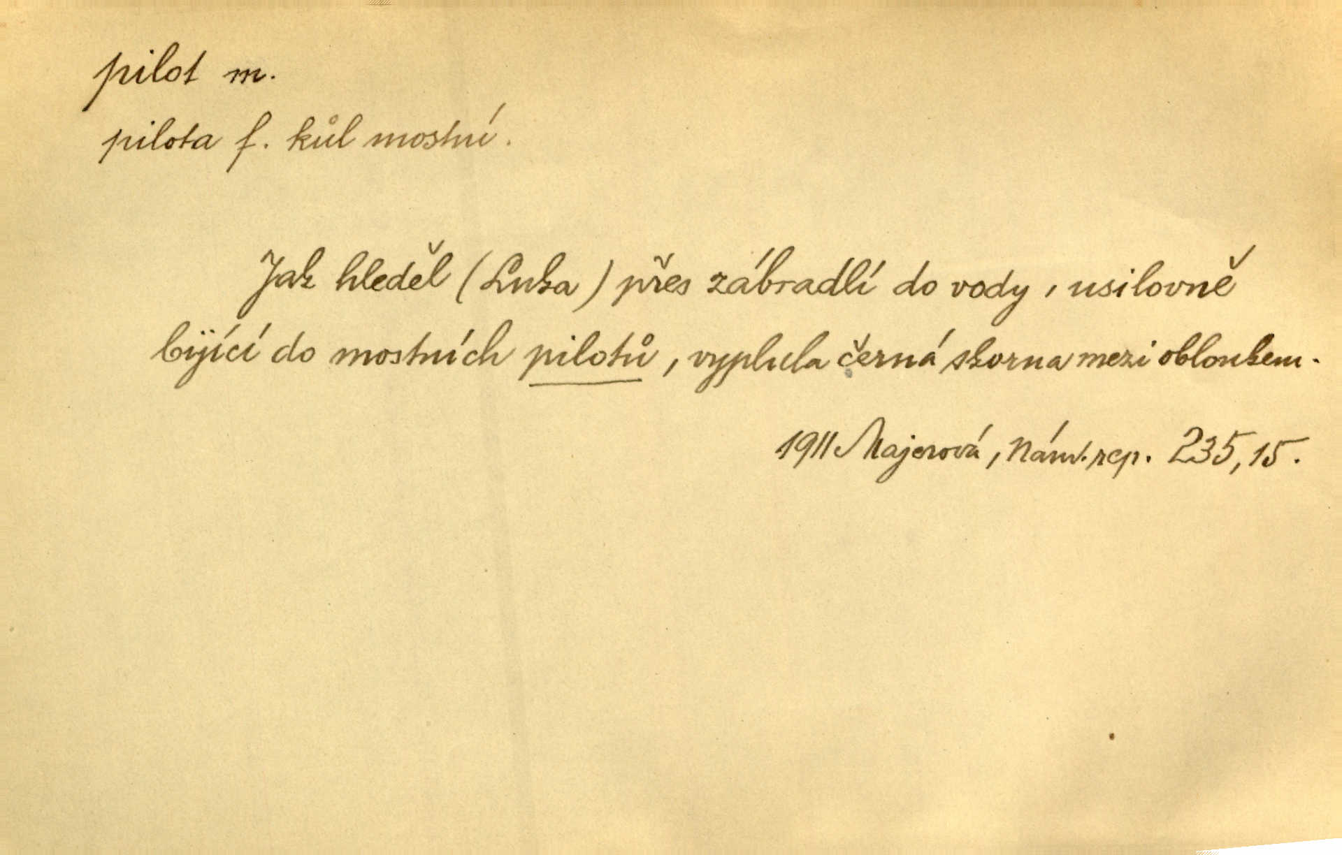 - pilot, -a m. řidič letadla. Machar v šedesáti letech vstupuje na aeroplán, aby dodal chuti mladým pilotům. Čes. sl. D Zast. lodivod. Daleko do moře přijel nám naproti pilot. Štol. Sám sobě pilotem a sám být pevnou lodí, nechť přijde kdokoli. Vrch. D Zool. pilot pruhovaný ryba z čeledi Crangidae, Naucrates ductor. Žel. zvláštní zaměstnanec doprovázející vlak po jistých úsecích a obeznámený s místními poměry.