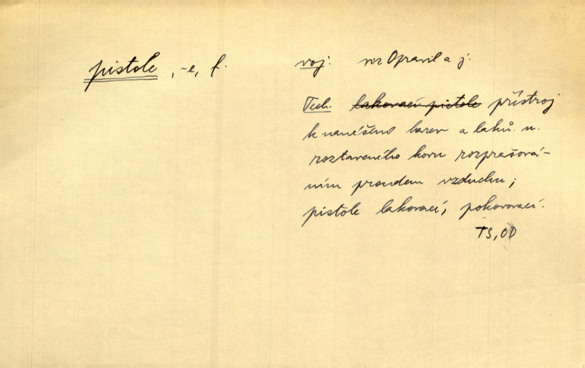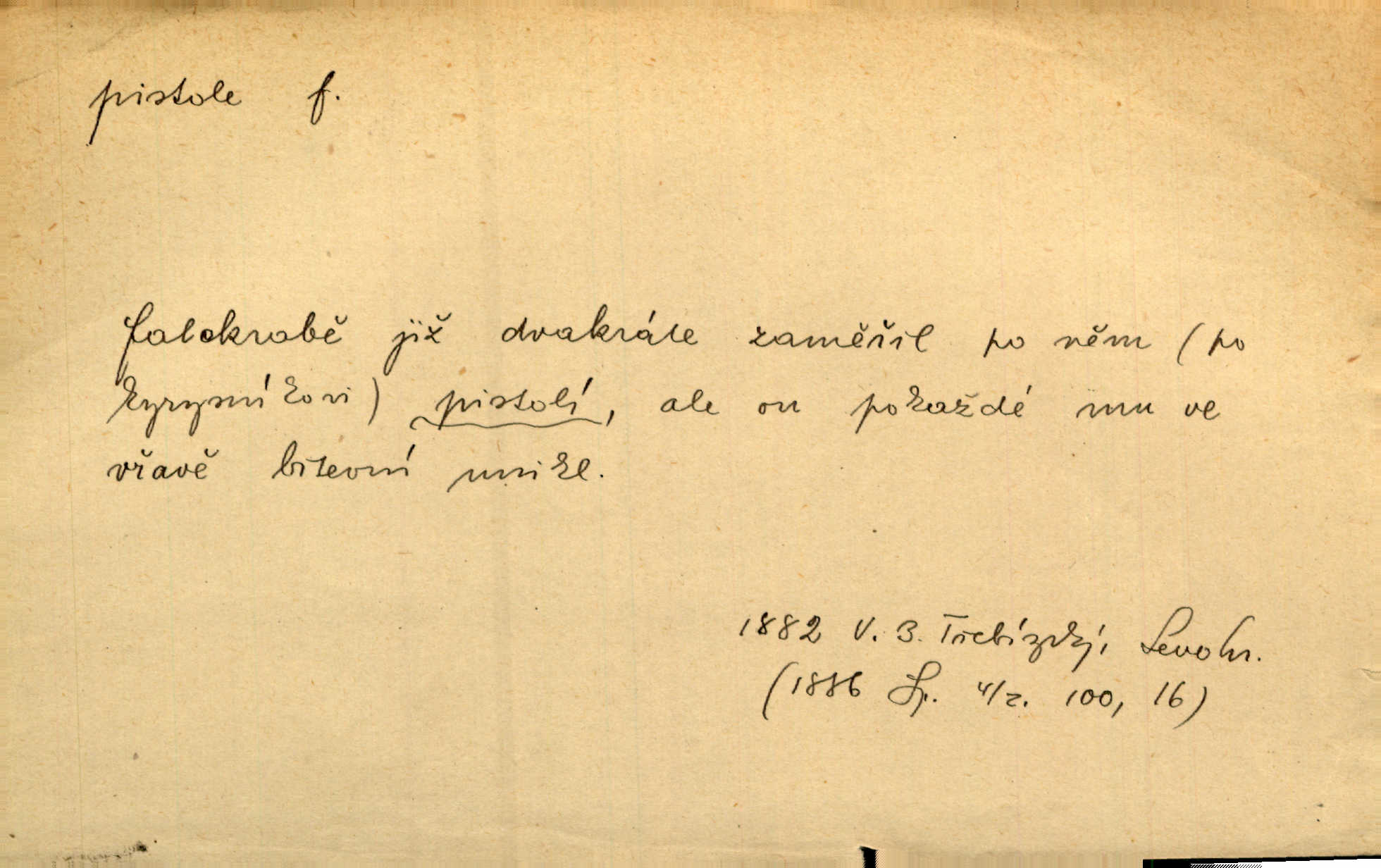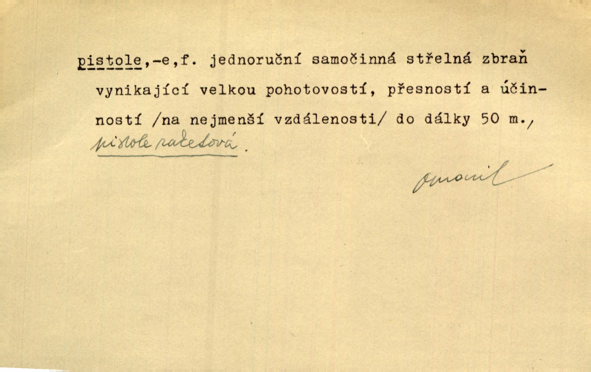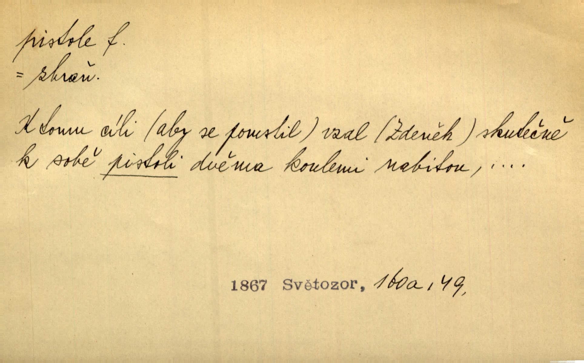 - pistole (zř. pistol; dial. pistule), -e f. (dial. pistola, pistula, -y f.; arch. pistol, -u m.) krátká jednoruční střelná zbraň ke střílení na nejmenší vzdálenosti. Zabil se ranou z pistole. Dyk. Sekne ho [rytíř draka] několikrát do hlavy a konečně vystřelí z pistole, drak se svalí. Něm. [Chlap] namířil proti nám pistoli. Arb. Vyzval jej na pistole, avšak v souboji sám jest postřelen. Staš. Jsem již jako stará pistola s křesacím zámkem. Kosm. Koně a „pistulu“ přinesl sv. Mikuláš [chlapci]. A. Mrš. Pistule a ftáci, to byla jeho záliba. Jir. Vytáhne z kapsy malý pistol. Klicp. [Zámek] přeskakoval, jako když z pistole střílí. R. Svob. Vybuchlo to [smích] z ní, jako když z pistole vystřelí Čap. Ch. Voj. služební pistole; pistole raketová na vystřelování rakety. Sport. pistole terčová. D Tech. přístroj k nanášení barev a laků n. roztaveného kovu rozprašovaným proudem vzduchovým. Pistole stříkací, lakovací, pokovovací.