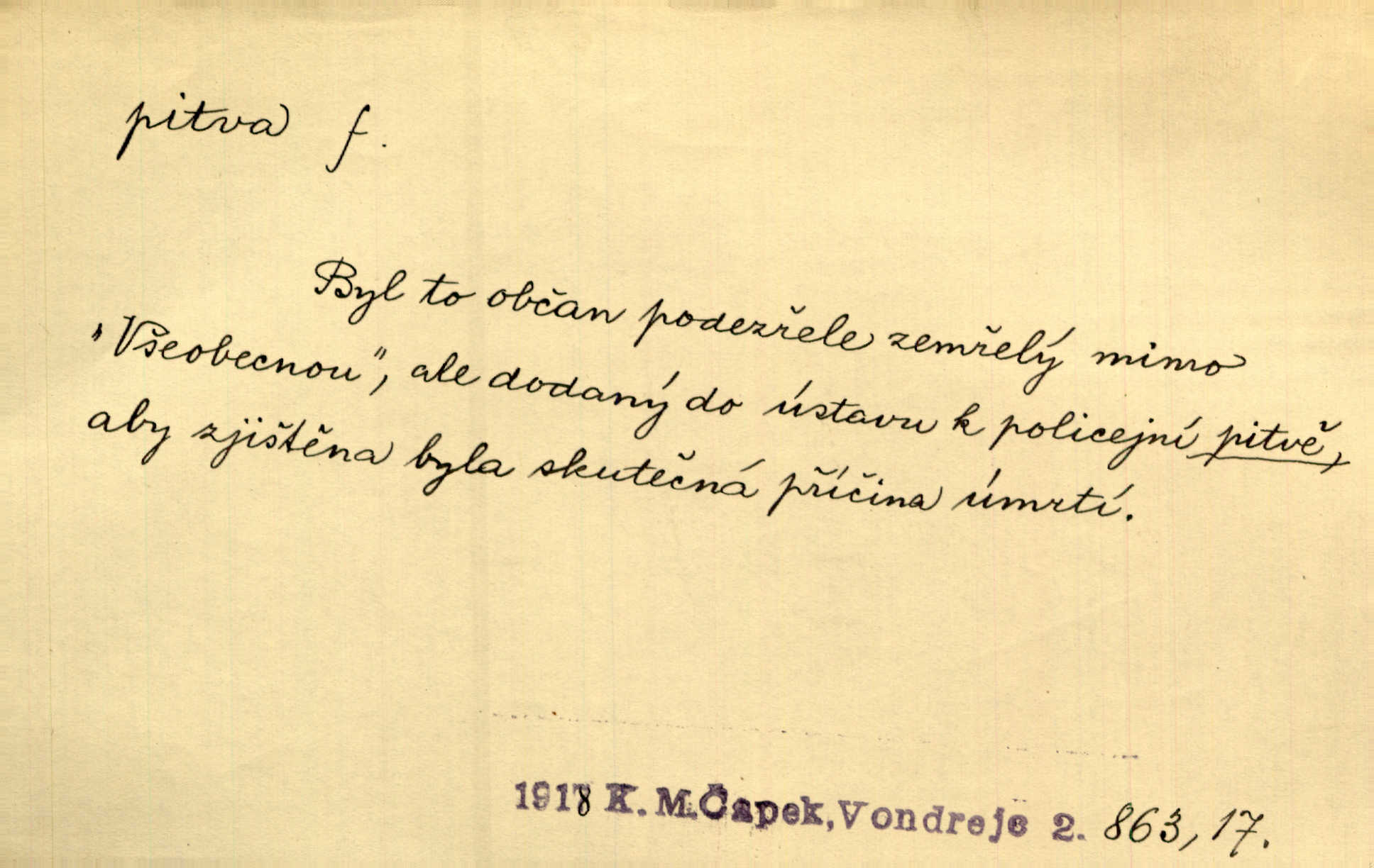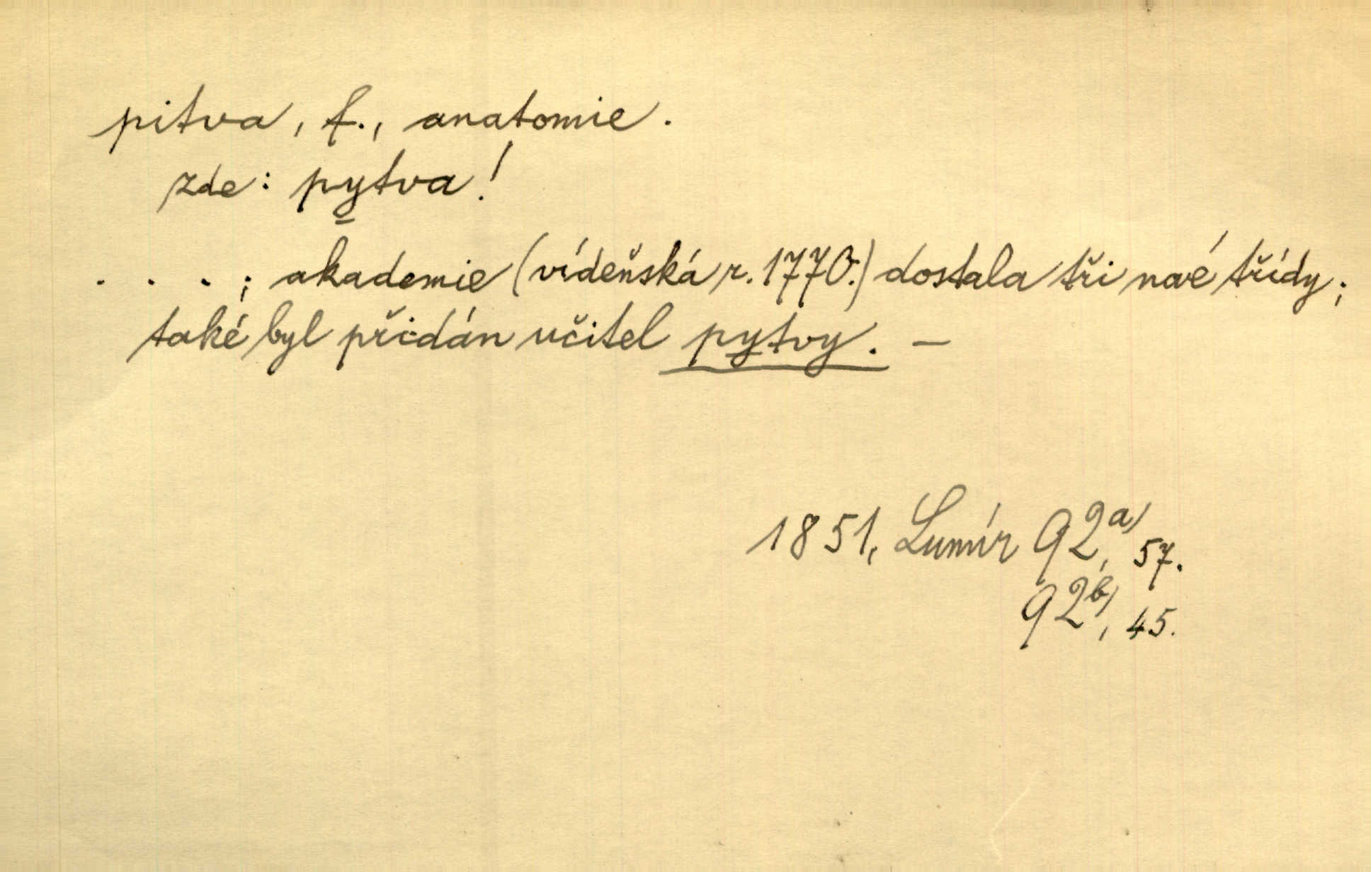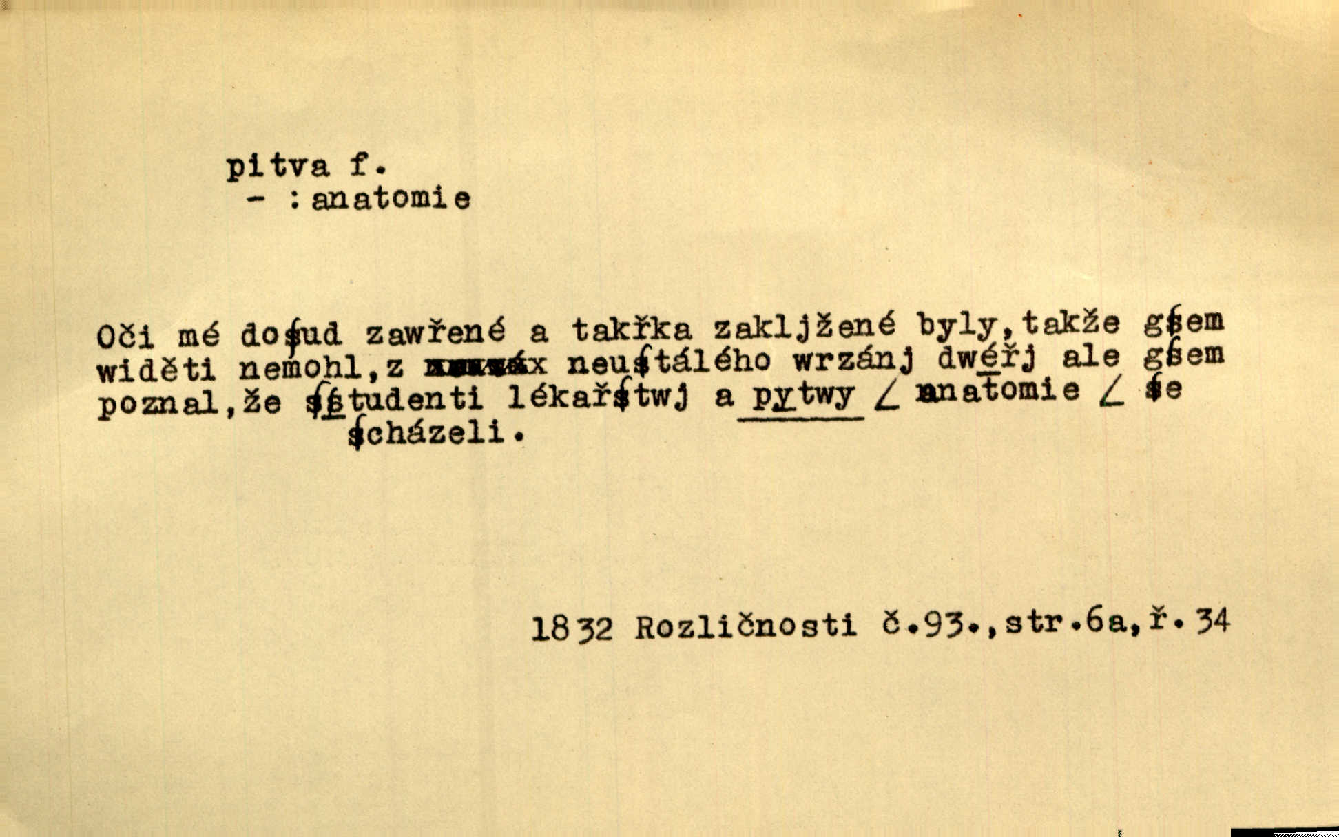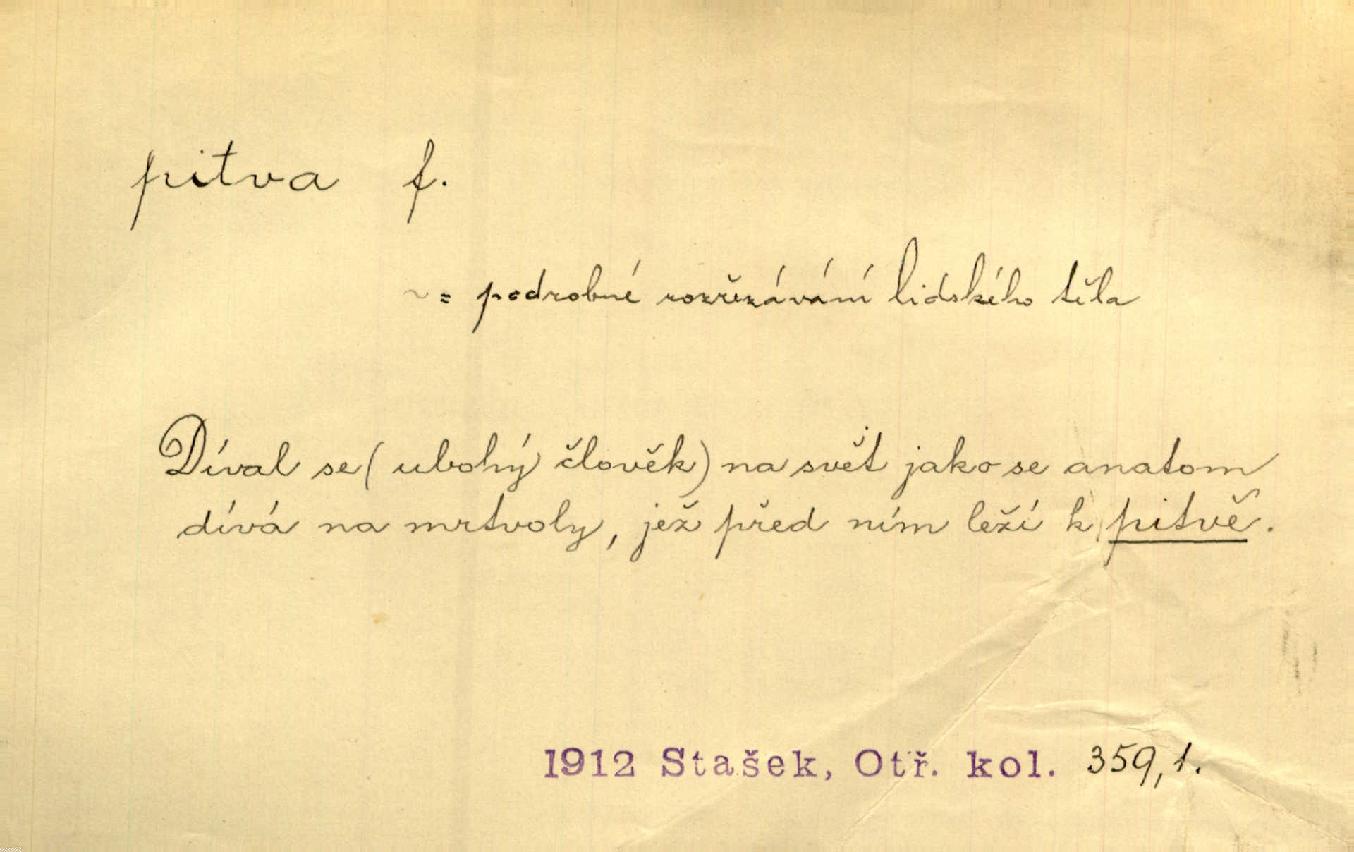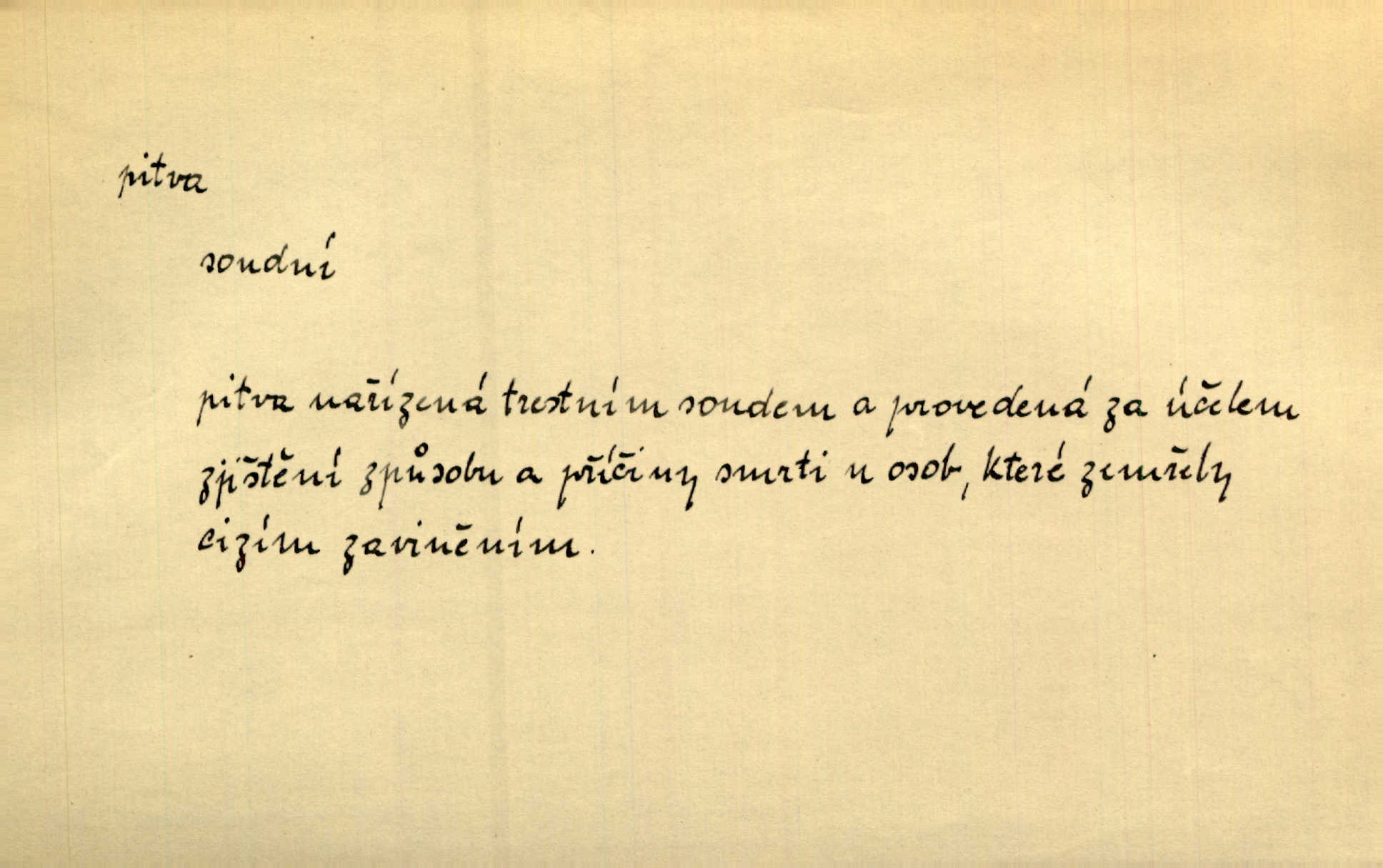 - pitva, -y f. lékařské otevření mrtvoly k odbornému podrobnému zkoumání. Díval se na svět, jako se anatom dívá na mrtvoly, jež před ním leží k pitvě. Staš. [Mrtvý] dodaný do ústavu k policejní pitvě, aby zjištěna byla skutečná příčina úmrtí. Čap. Ch. Práv. soudní pitva úřední pitva provedená ke zjištění příčiny smrti při podezření spáchaného trestního činu. D podrobné rozbírání, zkoumání něčeho. Tyto poznámky nemají být pitvou politiky. Přít. Doba Herodotova nebyla ještě k takové kri tické pitvě [pověstí] dospěla. Kvíč. Ušla by tím způsobem pitvě veřejnosti? Herrm.