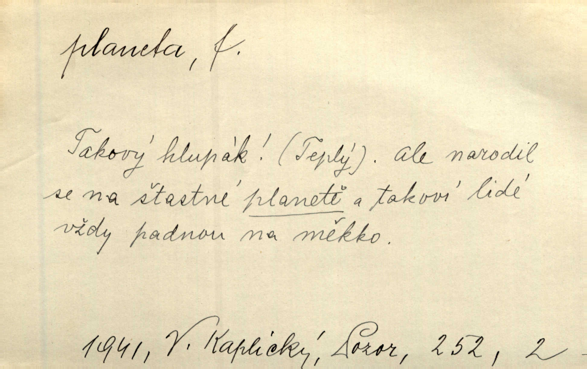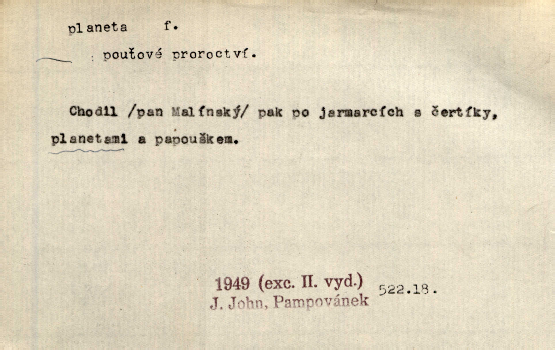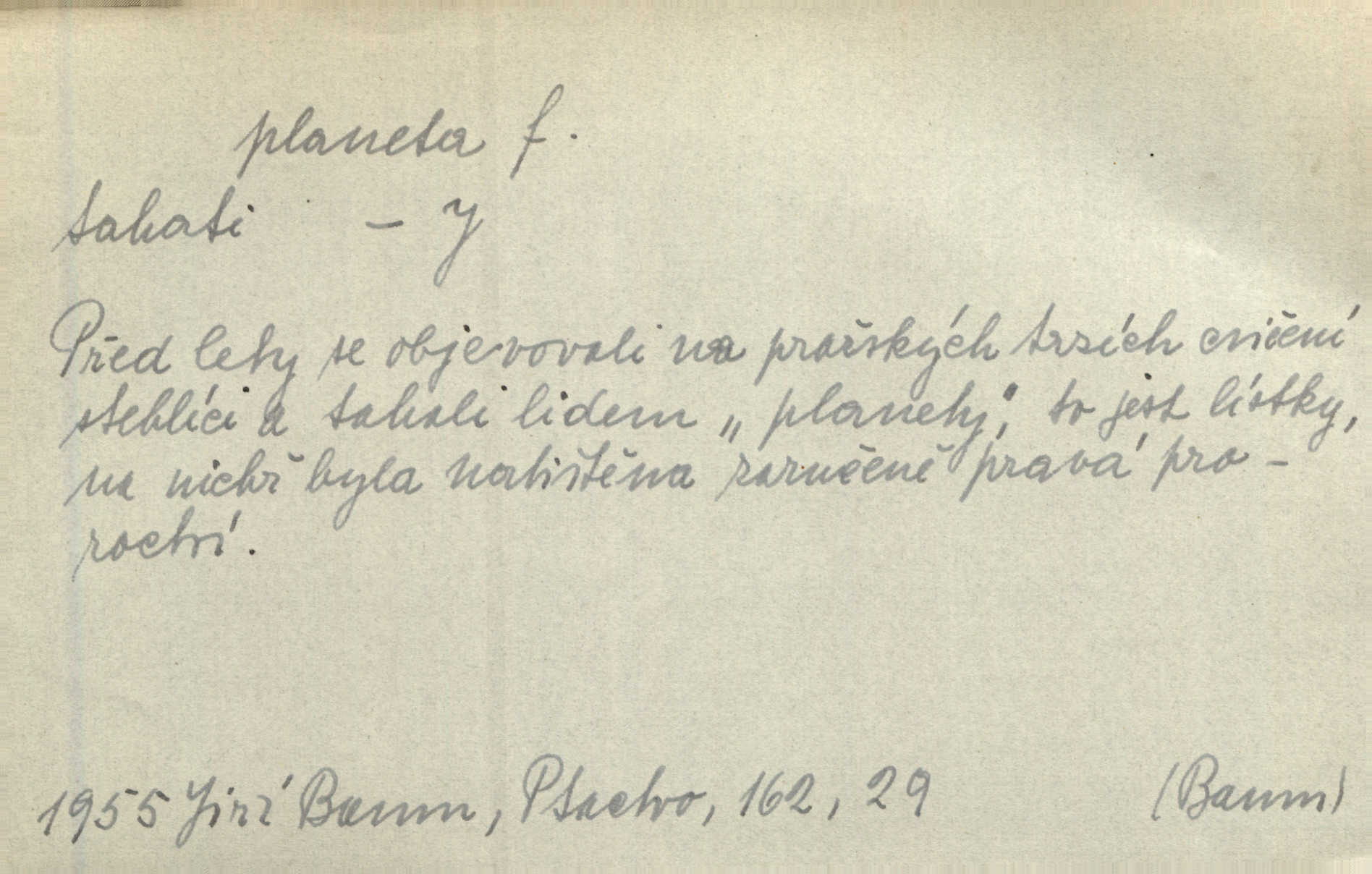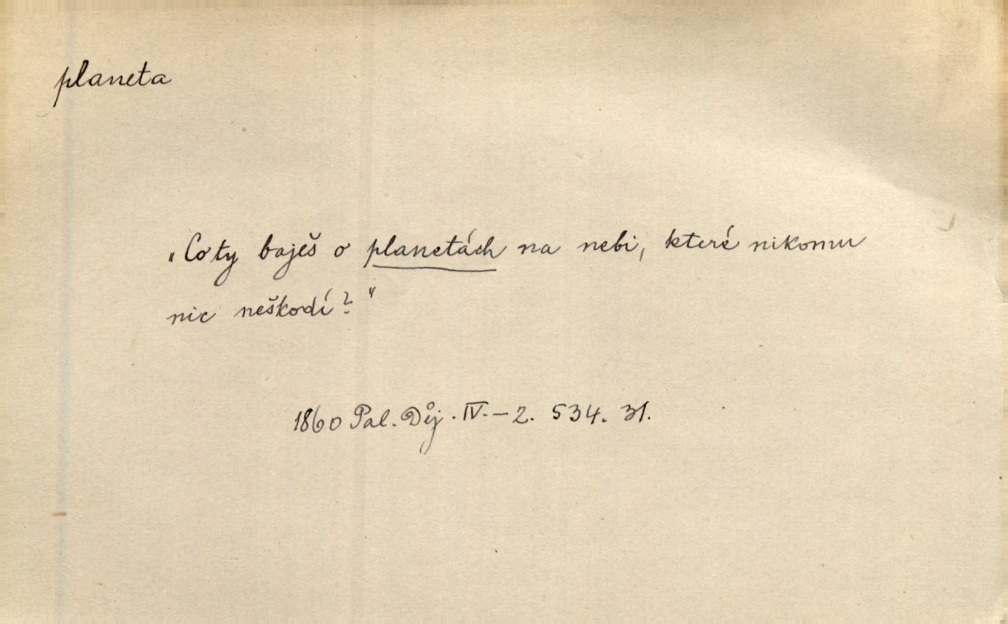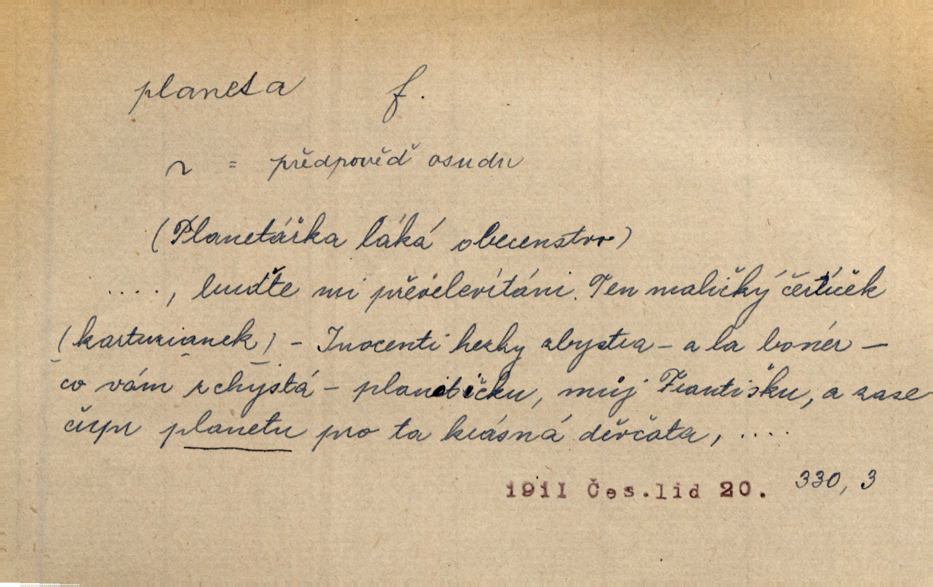 - planeta, -y f. 1. oběžnice. Země se okolo Slunce otáčí v zářivém planet pruhu. Ner. Běloch byl tak nepovědomý většině lidí [v sultanátu] jako tvor jiné planety. J. Havlasa. D oběžnice jako určovatelka osudu. Kalendář zvěstoval, že rok ten bude pod vládou planety Jupitera. Krás. Narodil jsem se na nešťastné planetě mám neštěstí, smůlu. Šmil. D osud, úděl. To ti říkám, když táhat, tak táhat, vod toho seš kůň a to jednou tvá planeta úděl. Šlej. On je ve všem šťastnější než já, proto že má lepší planetu osud je mu příznivější. Preis. D budoucnost. Povolal kníže hvězdáře a poručil, aby jemu i dvěma jeho správcům planety četl předpovídal budoucnost z postavení planet. Něm. Mladým lidem hádali [cikáni] planetu budoucnost. Svět. D lístek obsahující předpověď budoucnosti. Dala si kanárkem vytáhnouti planetu. Svob. V zimě chodili na výroční trhy, prodávali planety. Theer.