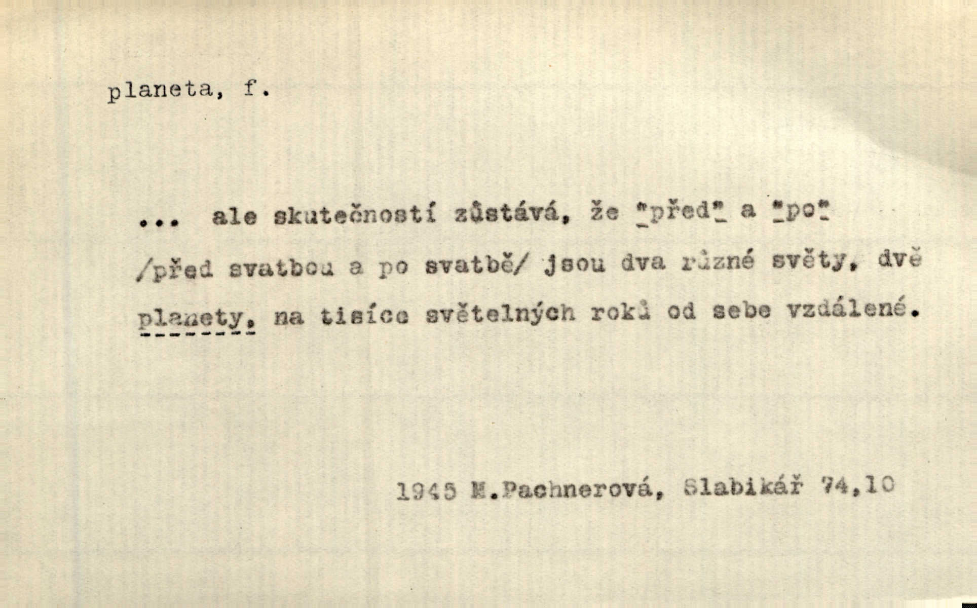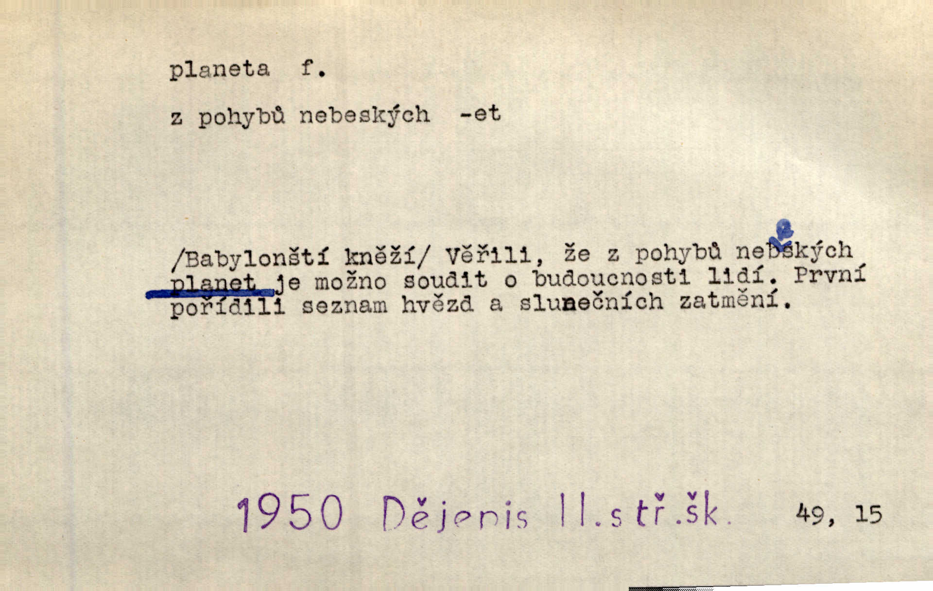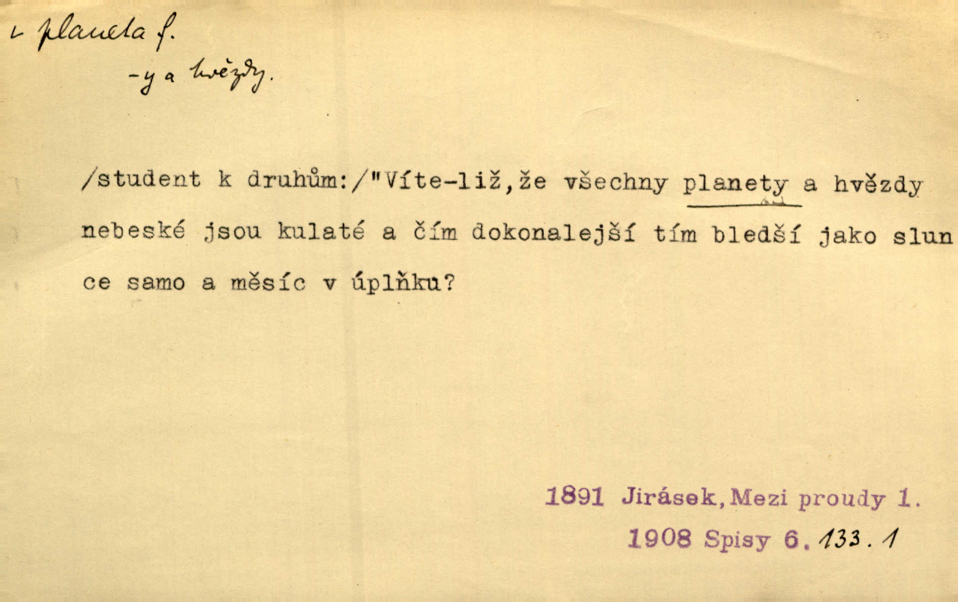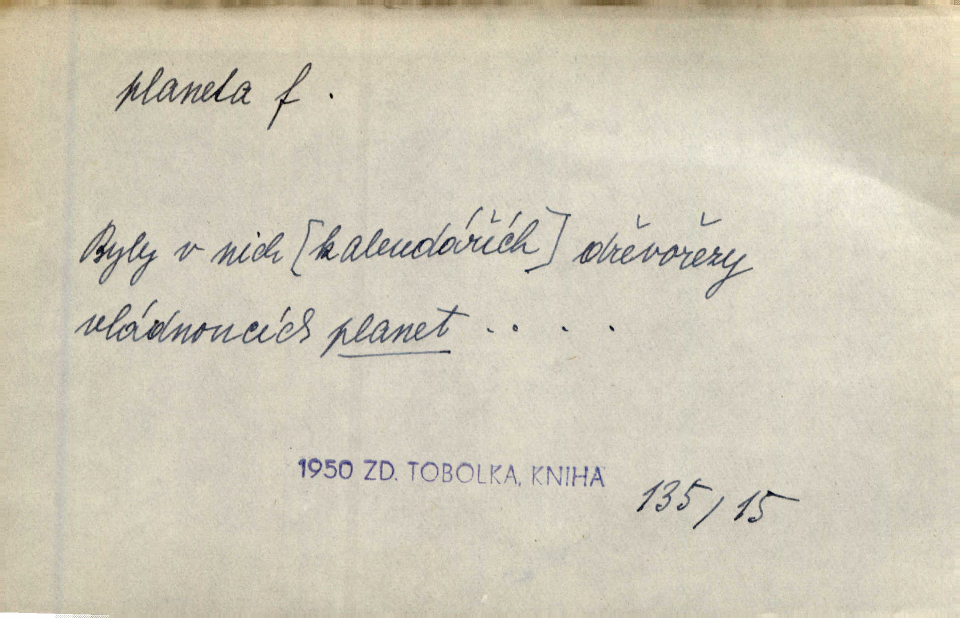- planeta, -y f. 1. oběžnice. Země se okolo Slunce otáčí v zářivém planet pruhu. Ner. Běloch byl tak nepovědomý většině lidí [v sultanátu] jako tvor jiné planety. J. Havlasa. D oběžnice jako určovatelka osudu. Kalendář zvěstoval, že rok ten bude pod vládou planety Jupitera. Krás. Narodil jsem se na nešťastné planetě mám neštěstí, smůlu. Šmil. D osud, úděl. To ti říkám, když táhat, tak táhat, vod toho seš kůň a to jednou tvá planeta úděl. Šlej. On je ve všem šťastnější než já, proto že má lepší planetu osud je mu příznivější. Preis. D budoucnost. Povolal kníže hvězdáře a poručil, aby jemu i dvěma jeho správcům planety četl předpovídal budoucnost z postavení planet. Něm. Mladým lidem hádali [cikáni] planetu budoucnost. Svět. D lístek obsahující předpověď budoucnosti. Dala si kanárkem vytáhnouti planetu. Svob. V zimě chodili na výroční trhy, prodávali planety. Theer.