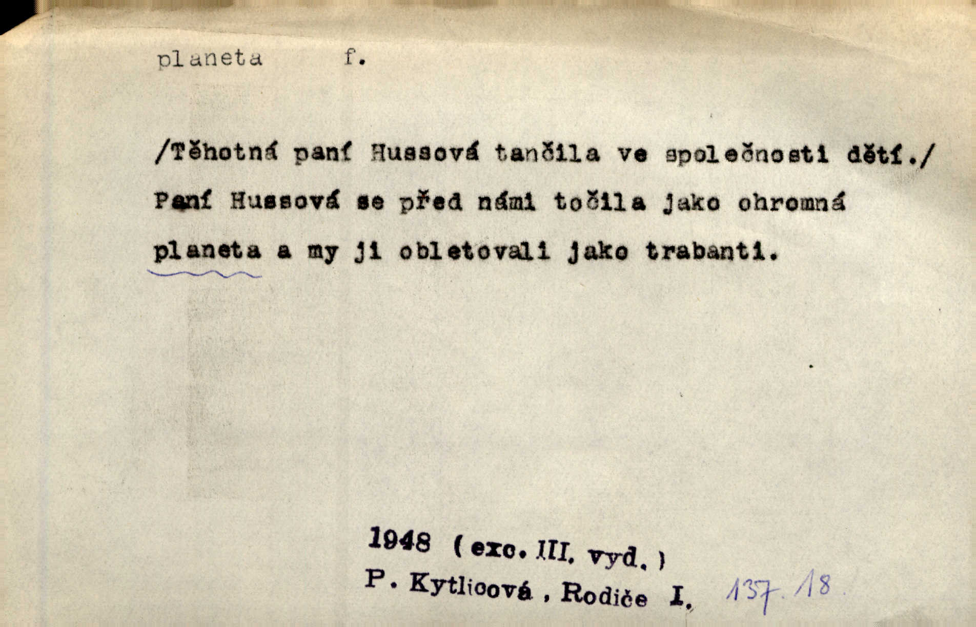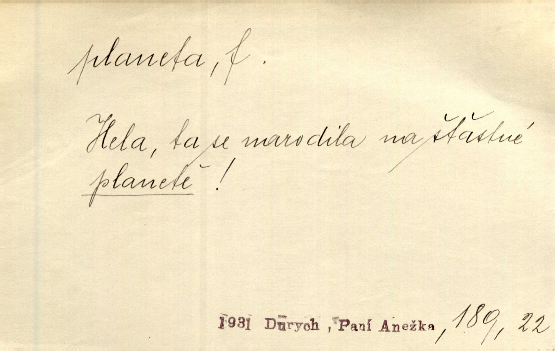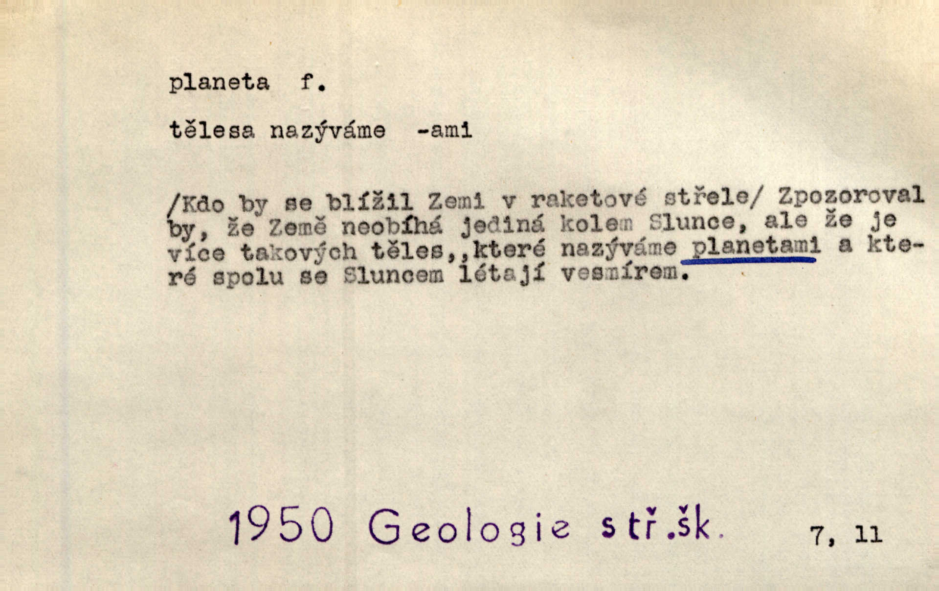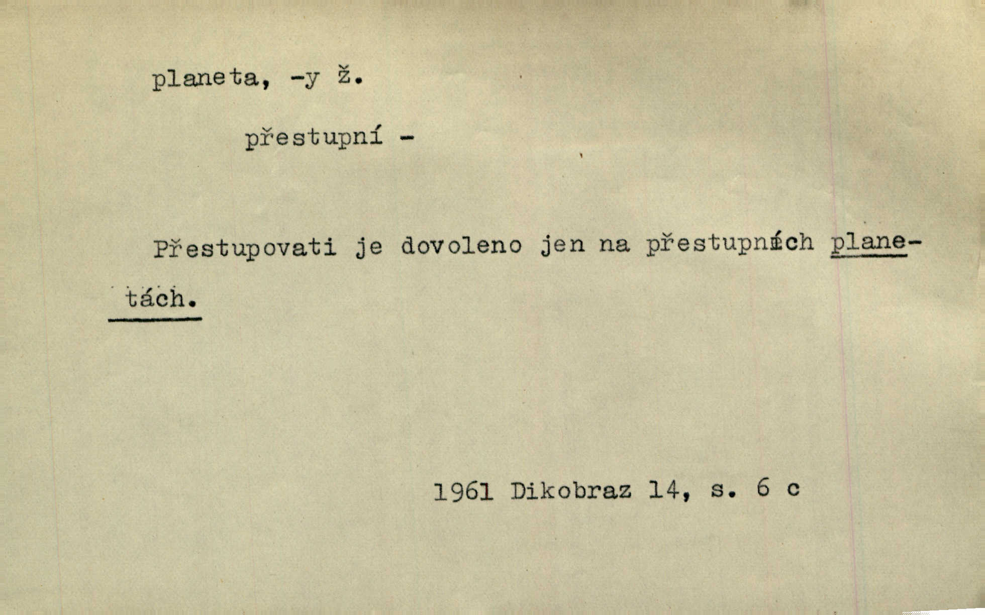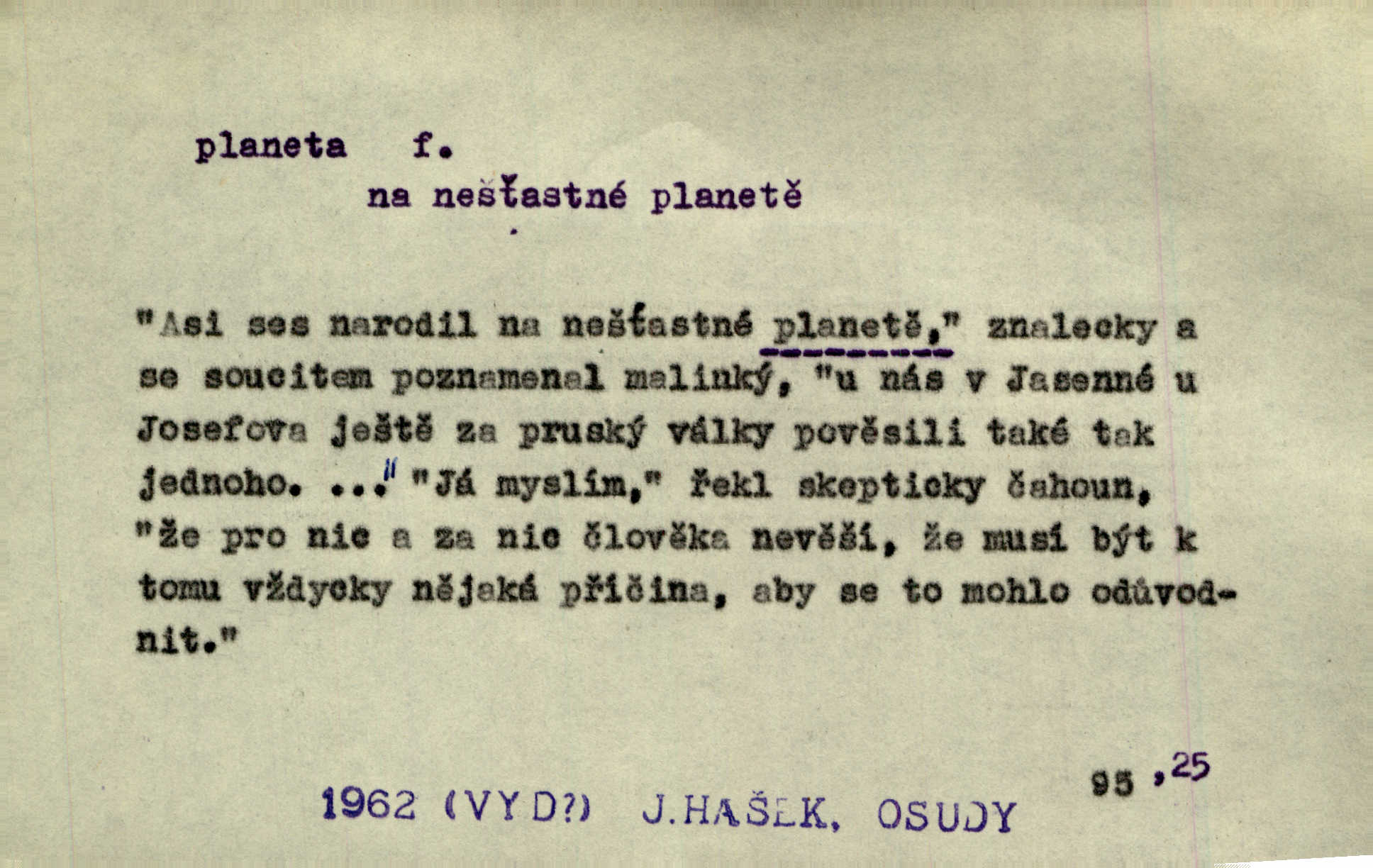 - planeta, -y f. 1. oběžnice. Země se okolo Slunce otáčí v zářivém planet pruhu. Ner. Běloch byl tak nepovědomý většině lidí [v sultanátu] jako tvor jiné planety. J. Havlasa. D oběžnice jako určovatelka osudu. Kalendář zvěstoval, že rok ten bude pod vládou planety Jupitera. Krás. Narodil jsem se na nešťastné planetě mám neštěstí, smůlu. Šmil. D osud, úděl. To ti říkám, když táhat, tak táhat, vod toho seš kůň a to jednou tvá planeta úděl. Šlej. On je ve všem šťastnější než já, proto že má lepší planetu osud je mu příznivější. Preis. D budoucnost. Povolal kníže hvězdáře a poručil, aby jemu i dvěma jeho správcům planety četl předpovídal budoucnost z postavení planet. Něm. Mladým lidem hádali [cikáni] planetu budoucnost. Svět. D lístek obsahující předpověď budoucnosti. Dala si kanárkem vytáhnouti planetu. Svob. V zimě chodili na výroční trhy, prodávali planety. Theer.
