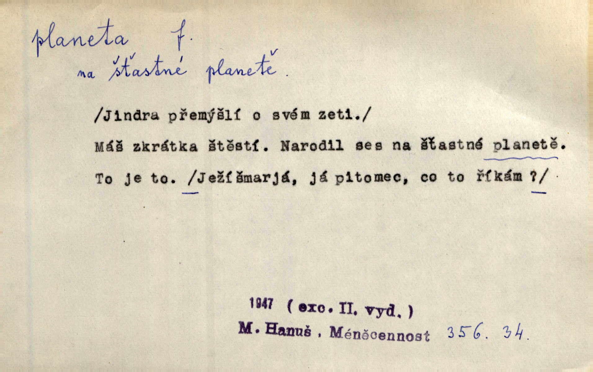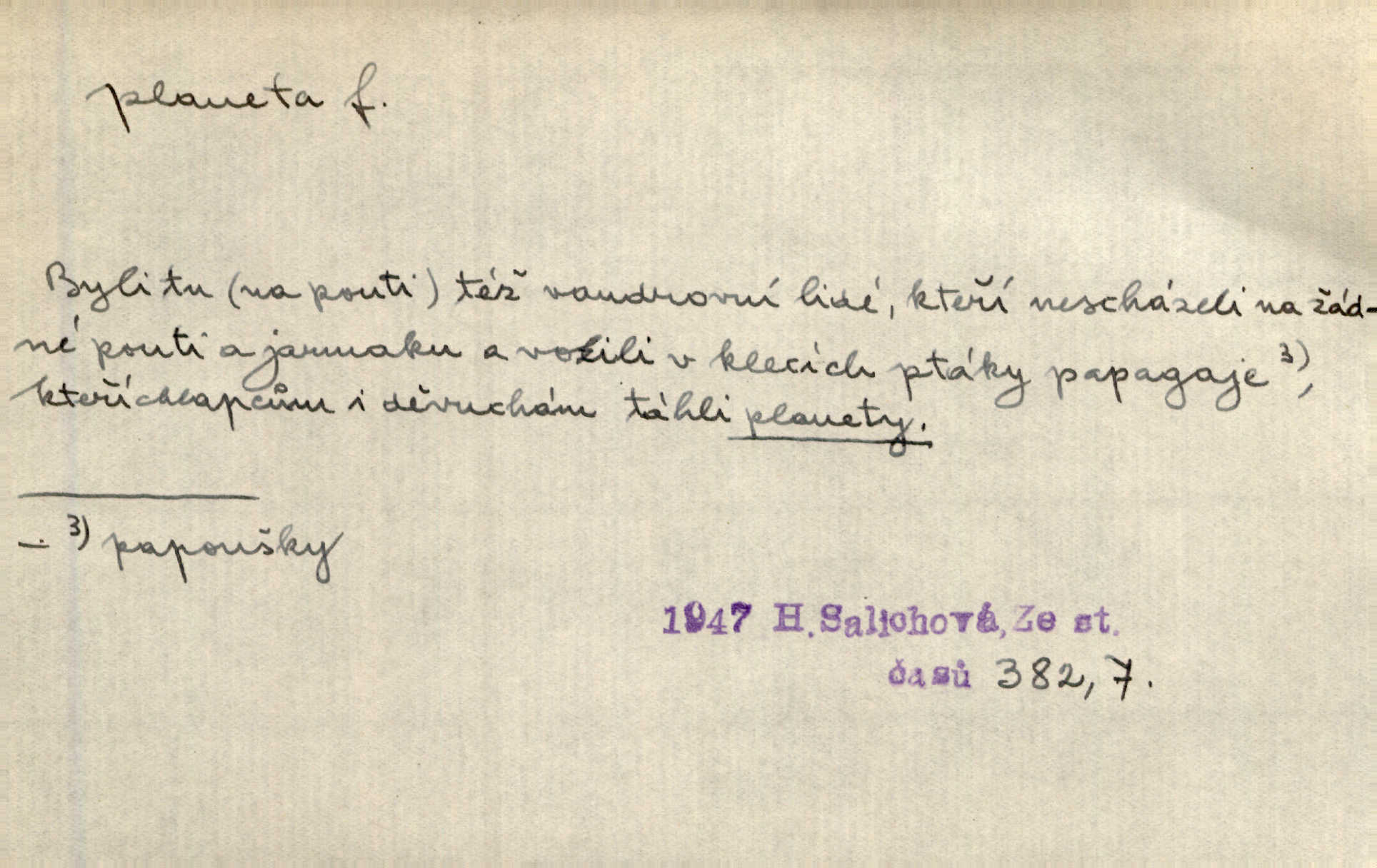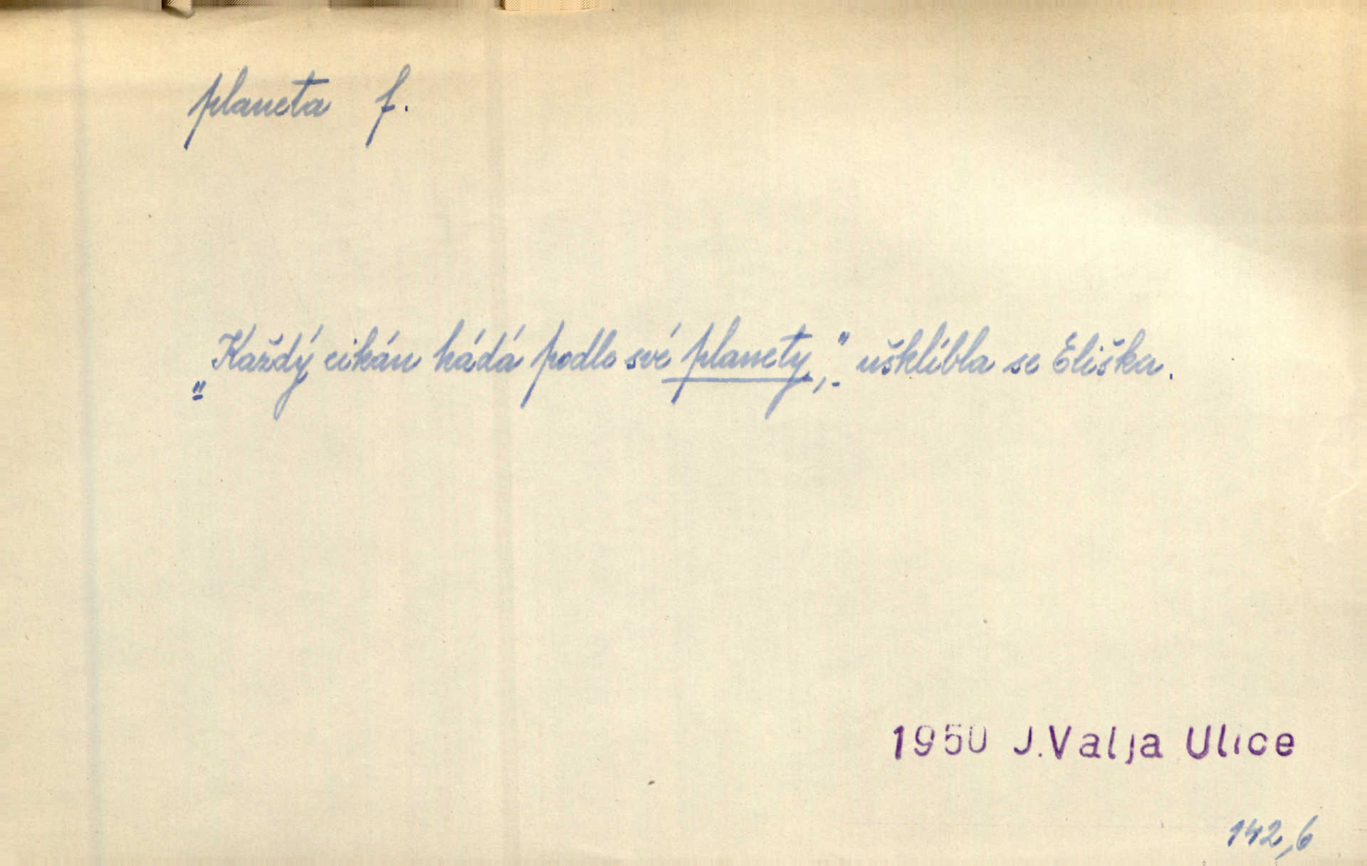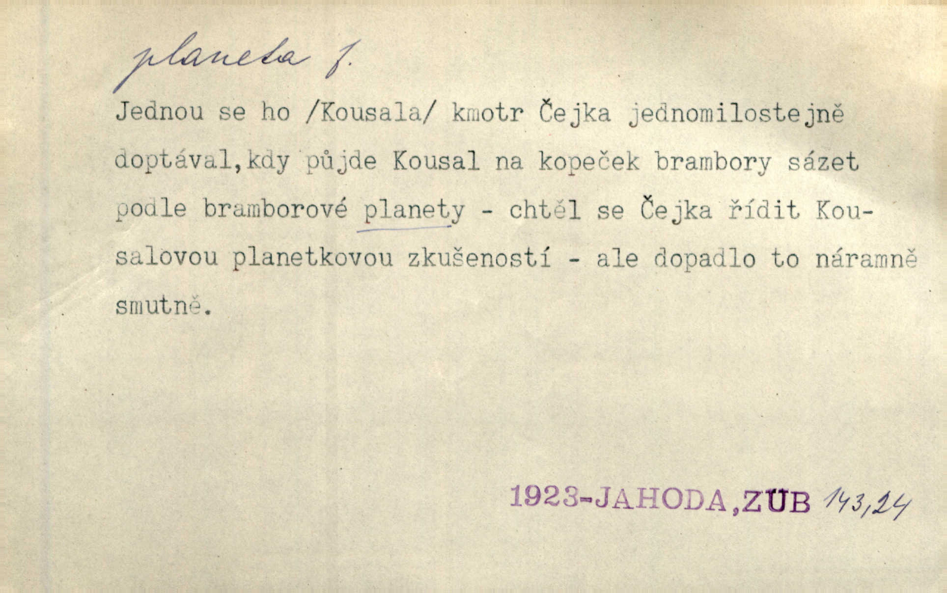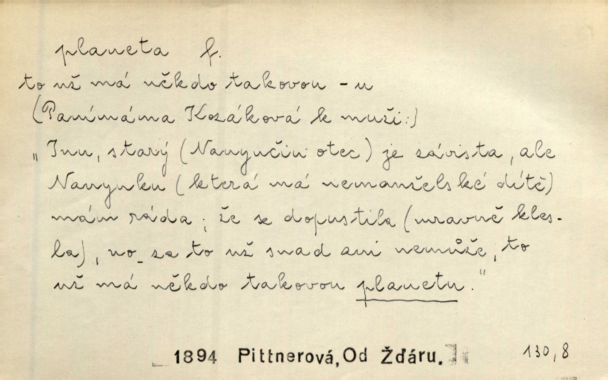 - planeta, -y f. 1. oběžnice. Země se okolo Slunce otáčí v zářivém planet pruhu. Ner. Běloch byl tak nepovědomý většině lidí [v sultanátu] jako tvor jiné planety. J. Havlasa. D oběžnice jako určovatelka osudu. Kalendář zvěstoval, že rok ten bude pod vládou planety Jupitera. Krás. Narodil jsem se na nešťastné planetě mám neštěstí, smůlu. Šmil. D osud, úděl. To ti říkám, když táhat, tak táhat, vod toho seš kůň a to jednou tvá planeta úděl. Šlej. On je ve všem šťastnější než já, proto že má lepší planetu osud je mu příznivější. Preis. D budoucnost. Povolal kníže hvězdáře a poručil, aby jemu i dvěma jeho správcům planety četl předpovídal budoucnost z postavení planet. Něm. Mladým lidem hádali [cikáni] planetu budoucnost. Svět. D lístek obsahující předpověď budoucnosti. Dala si kanárkem vytáhnouti planetu. Svob. V zimě chodili na výroční trhy, prodávali planety. Theer.