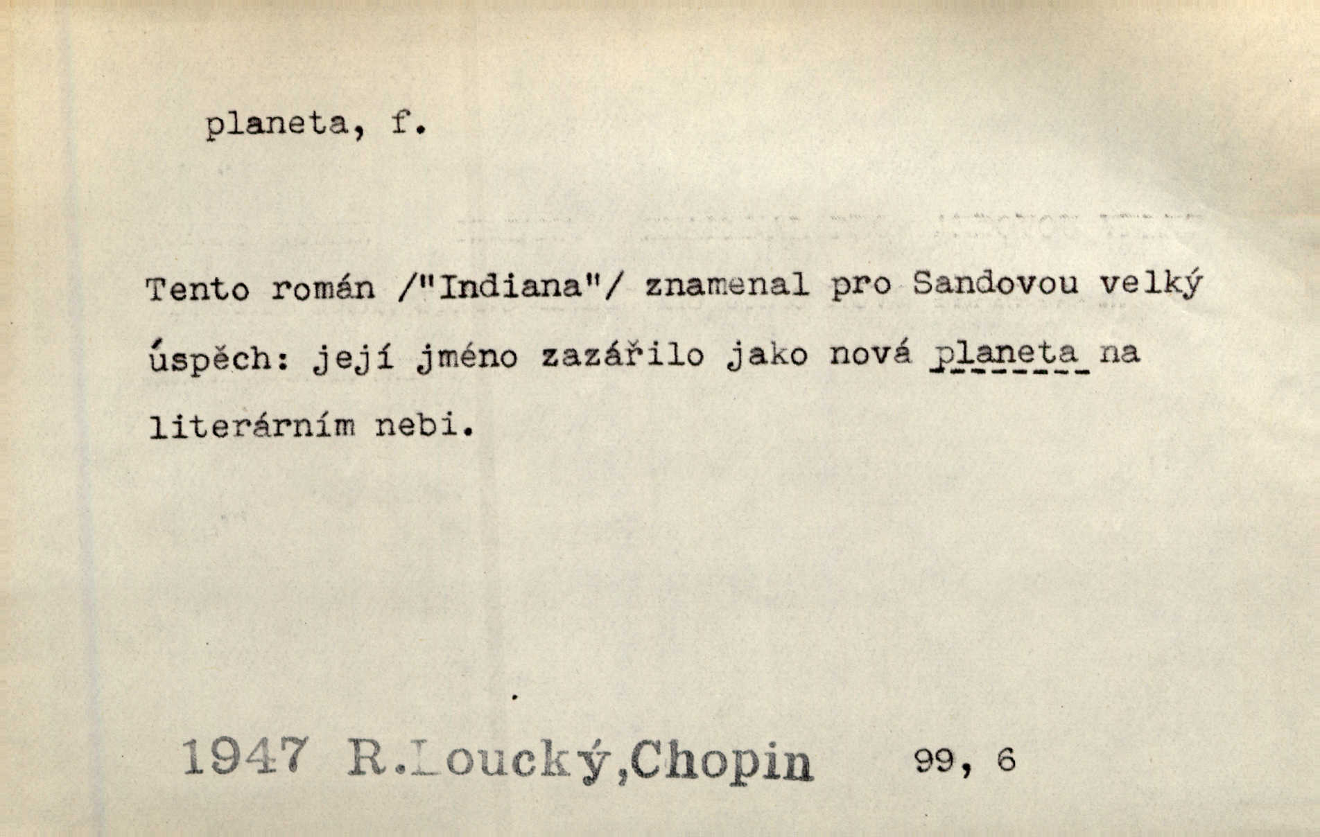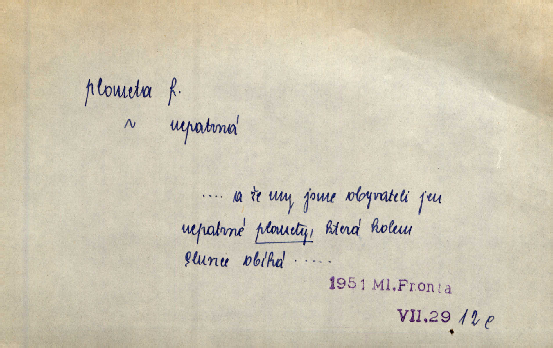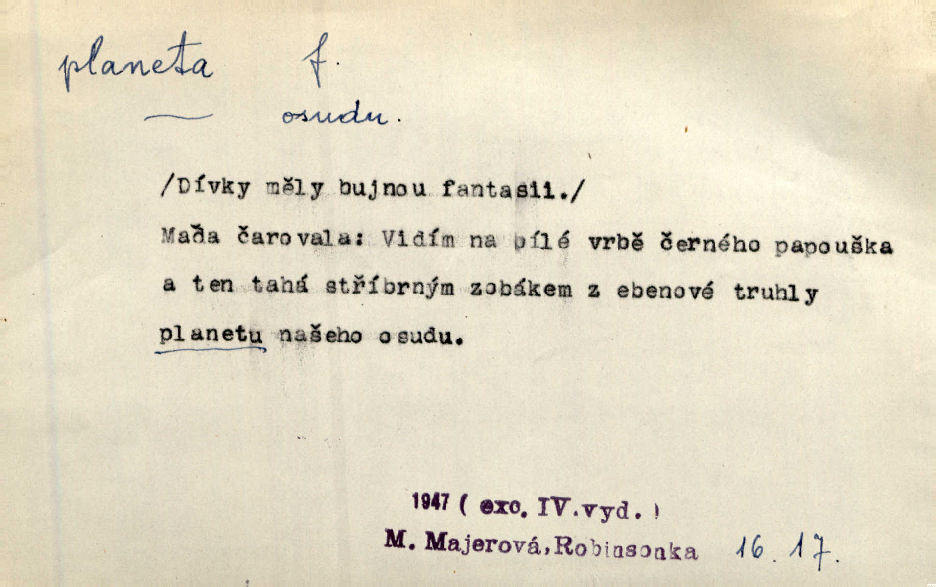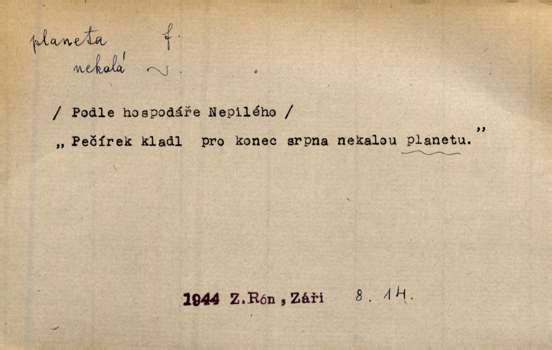 - planeta, -y f. 1. oběžnice. Země se okolo Slunce otáčí v zářivém planet pruhu. Ner. Běloch byl tak nepovědomý většině lidí [v sultanátu] jako tvor jiné planety. J. Havlasa. D oběžnice jako určovatelka osudu. Kalendář zvěstoval, že rok ten bude pod vládou planety Jupitera. Krás. Narodil jsem se na nešťastné planetě mám neštěstí, smůlu. Šmil. D osud, úděl. To ti říkám, když táhat, tak táhat, vod toho seš kůň a to jednou tvá planeta úděl. Šlej. On je ve všem šťastnější než já, proto že má lepší planetu osud je mu příznivější. Preis. D budoucnost. Povolal kníže hvězdáře a poručil, aby jemu i dvěma jeho správcům planety četl předpovídal budoucnost z postavení planet. Něm. Mladým lidem hádali [cikáni] planetu budoucnost. Svět. D lístek obsahující předpověď budoucnosti. Dala si kanárkem vytáhnouti planetu. Svob. V zimě chodili na výroční trhy, prodávali planety. Theer.