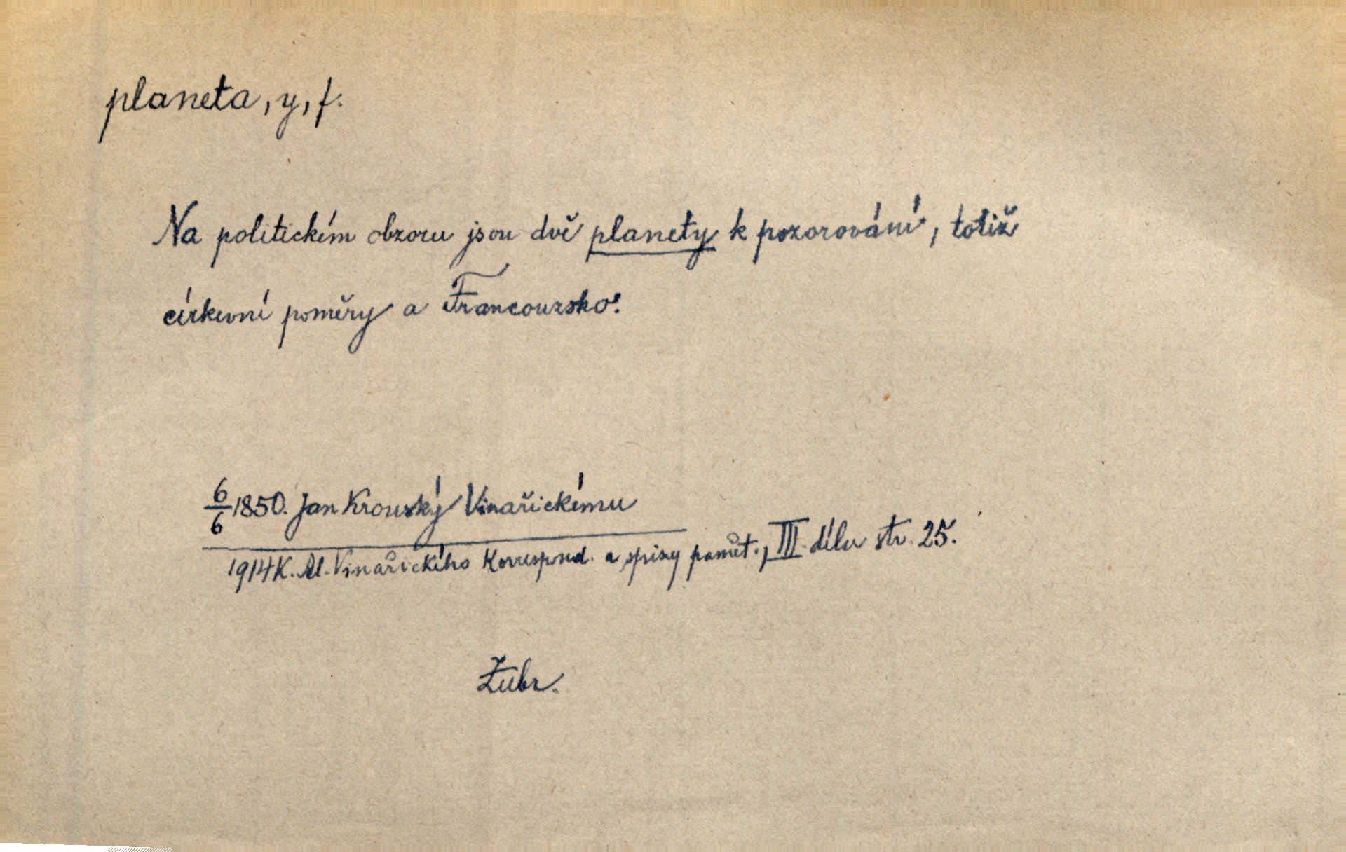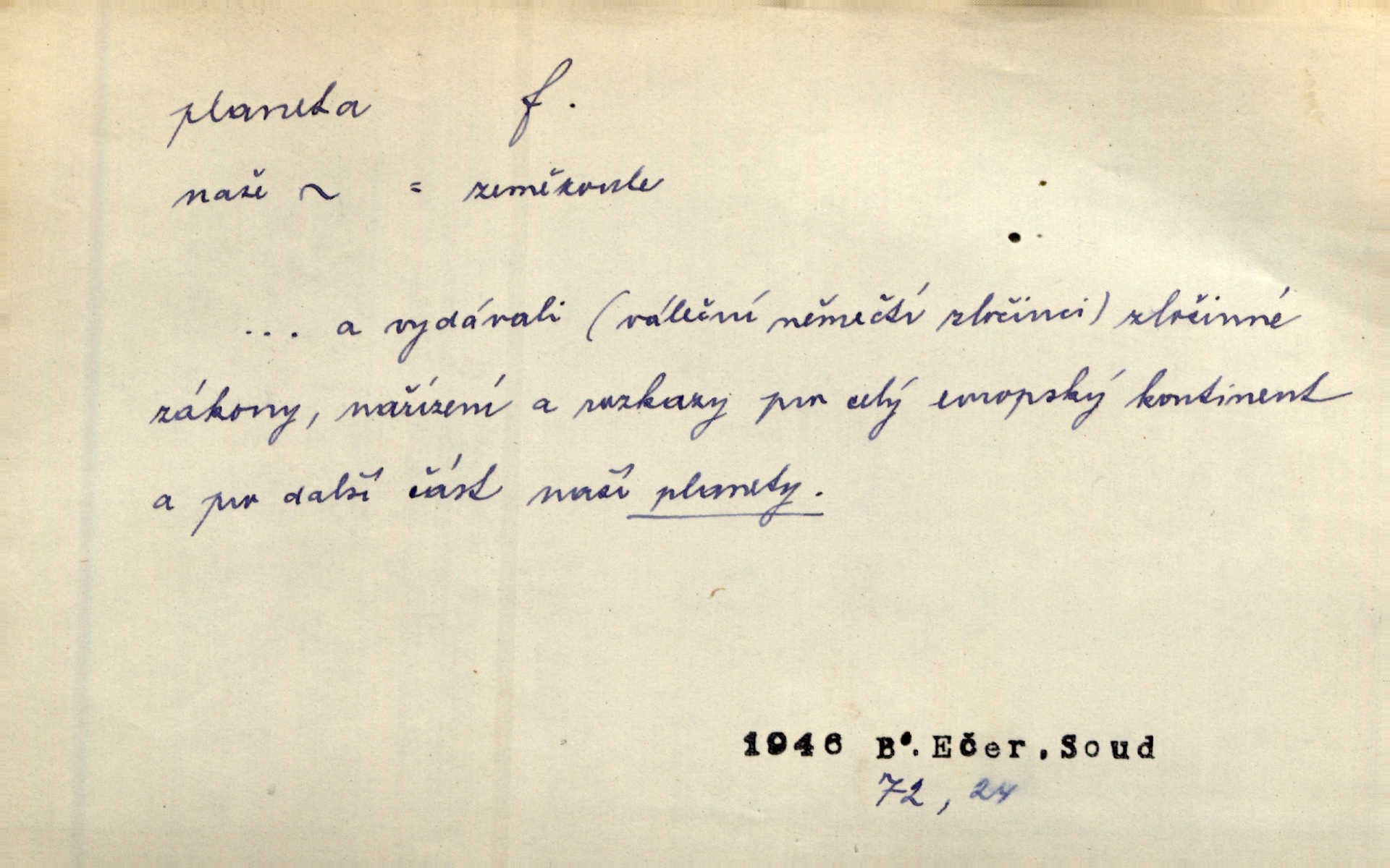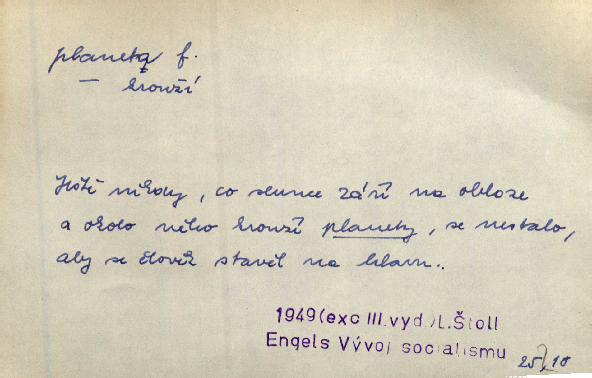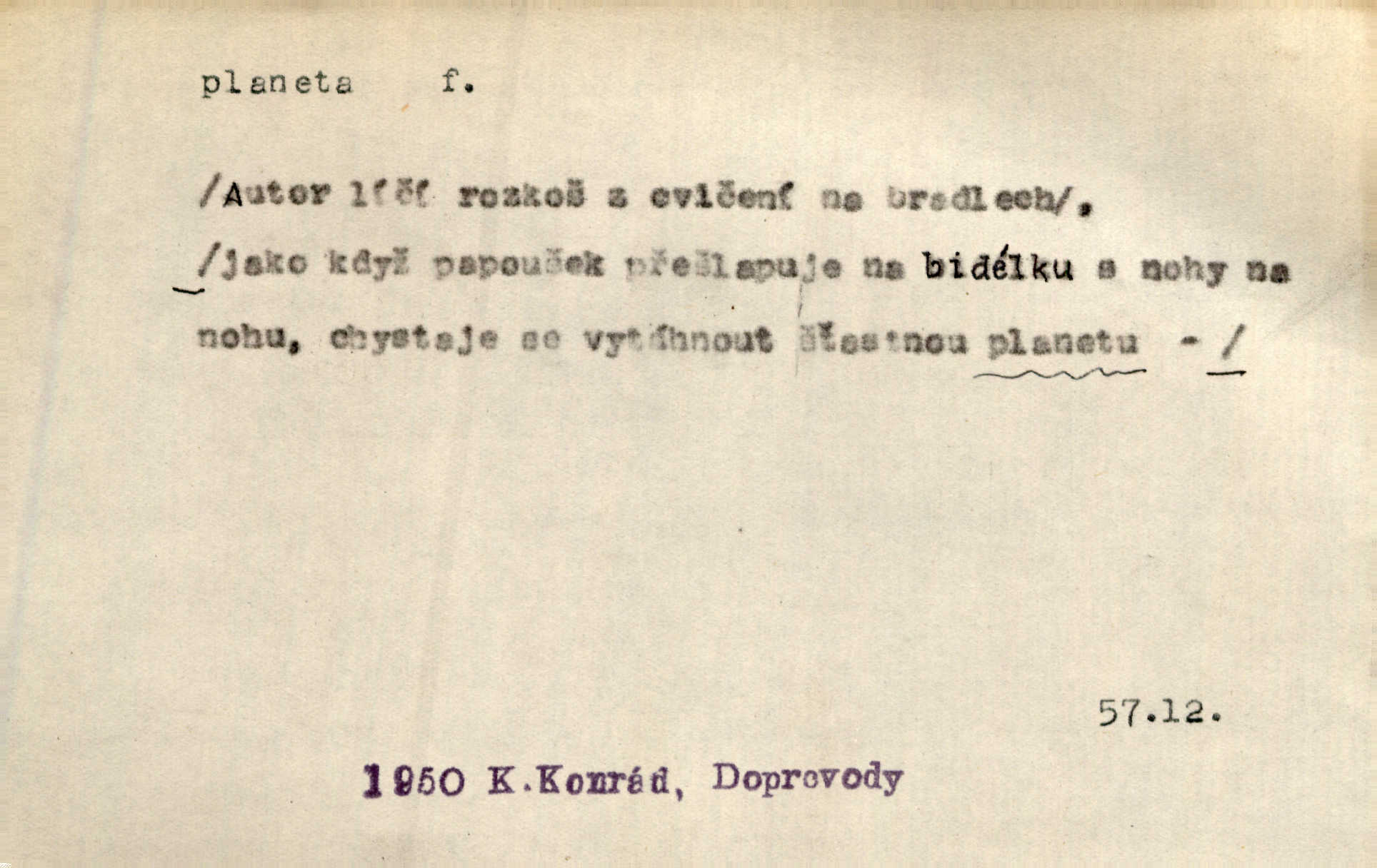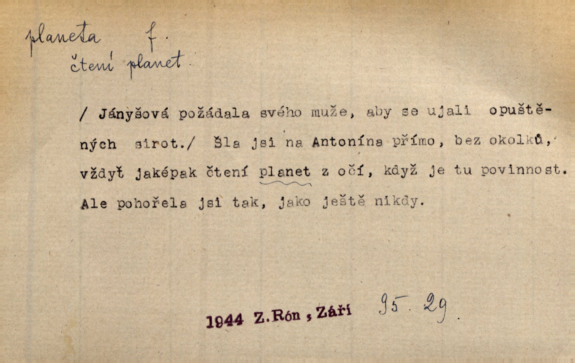 - planeta, -y f. 1. oběžnice. Země se okolo Slunce otáčí v zářivém planet pruhu. Ner. Běloch byl tak nepovědomý většině lidí [v sultanátu] jako tvor jiné planety. J. Havlasa. D oběžnice jako určovatelka osudu. Kalendář zvěstoval, že rok ten bude pod vládou planety Jupitera. Krás. Narodil jsem se na nešťastné planetě mám neštěstí, smůlu. Šmil. D osud, úděl. To ti říkám, když táhat, tak táhat, vod toho seš kůň a to jednou tvá planeta úděl. Šlej. On je ve všem šťastnější než já, proto že má lepší planetu osud je mu příznivější. Preis. D budoucnost. Povolal kníže hvězdáře a poručil, aby jemu i dvěma jeho správcům planety četl předpovídal budoucnost z postavení planet. Něm. Mladým lidem hádali [cikáni] planetu budoucnost. Svět. D lístek obsahující předpověď budoucnosti. Dala si kanárkem vytáhnouti planetu. Svob. V zimě chodili na výroční trhy, prodávali planety. Theer.