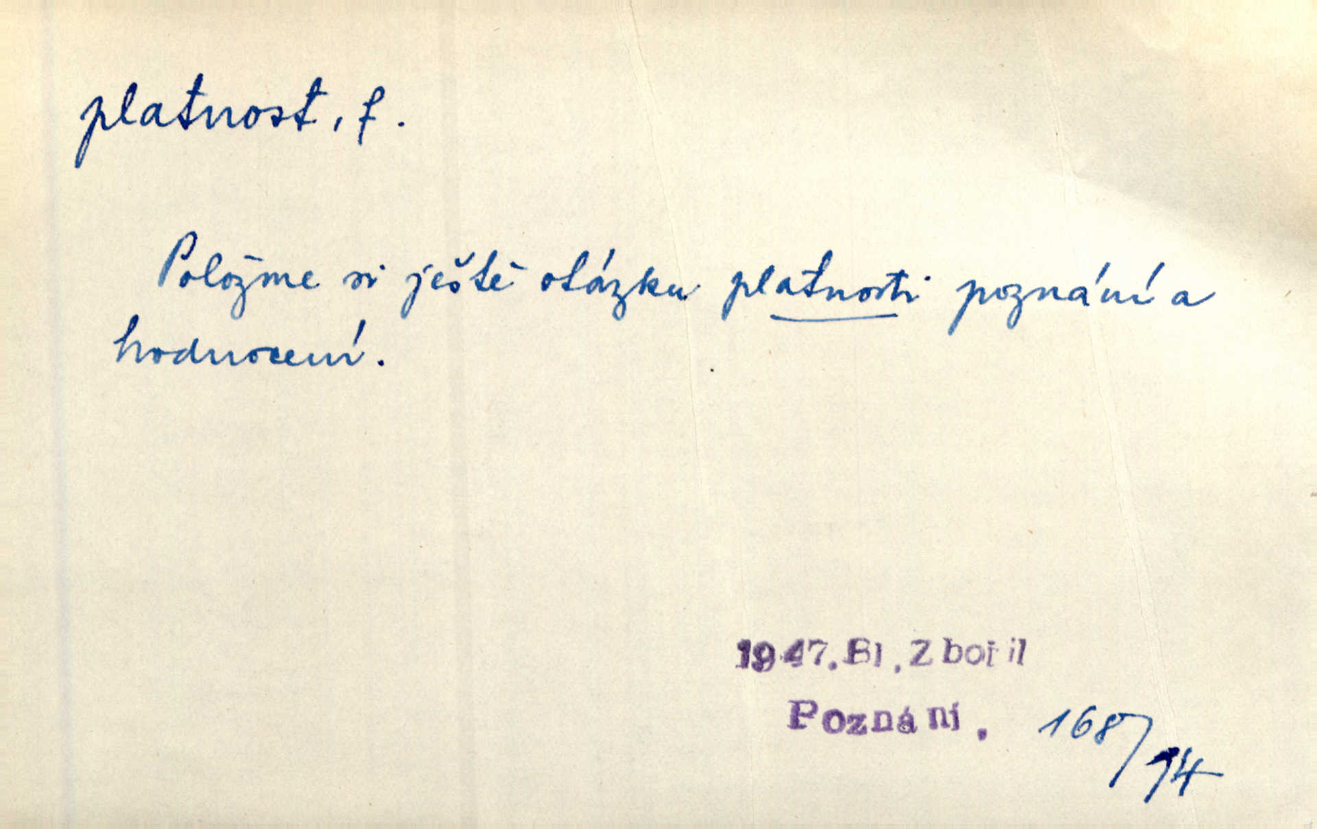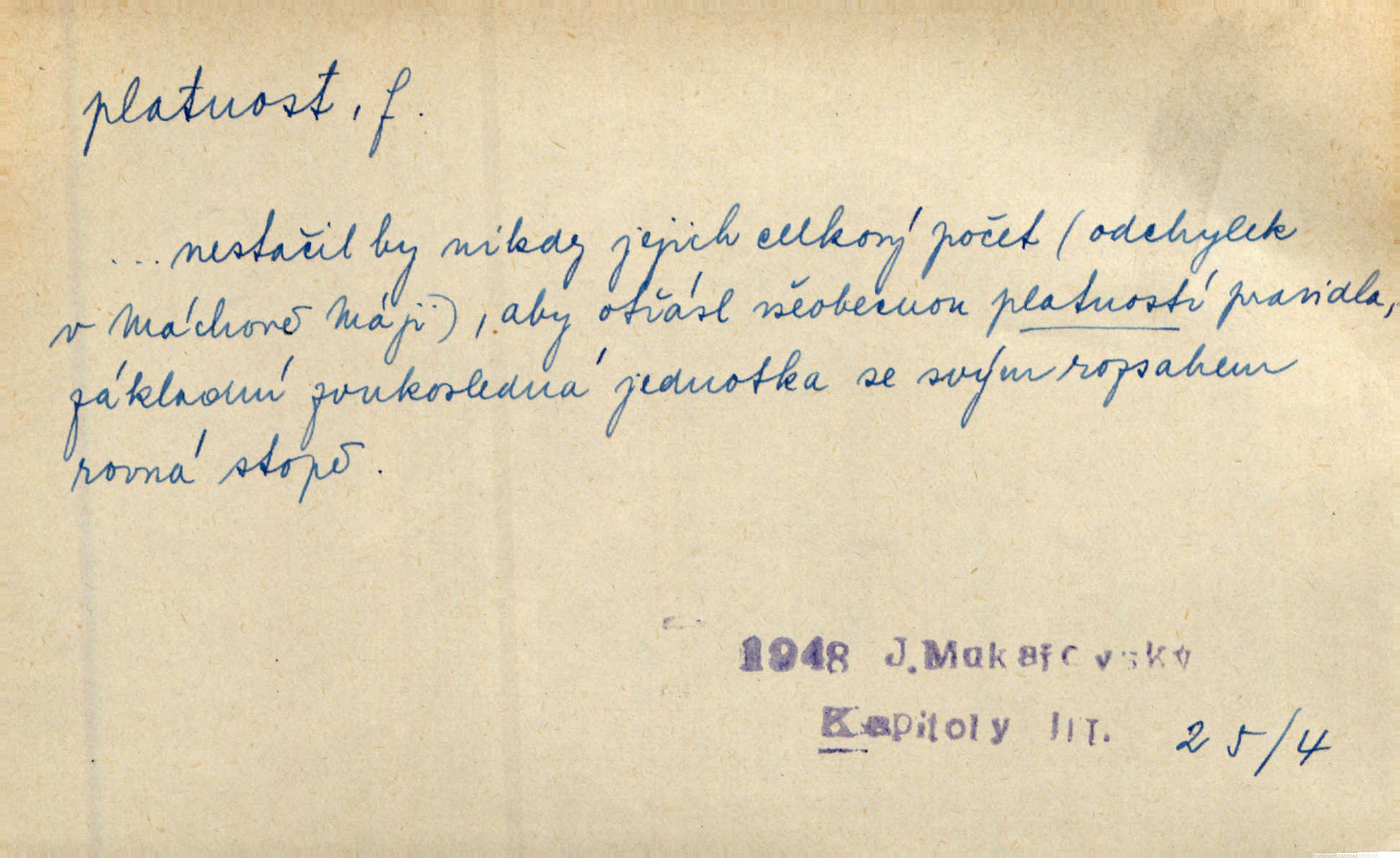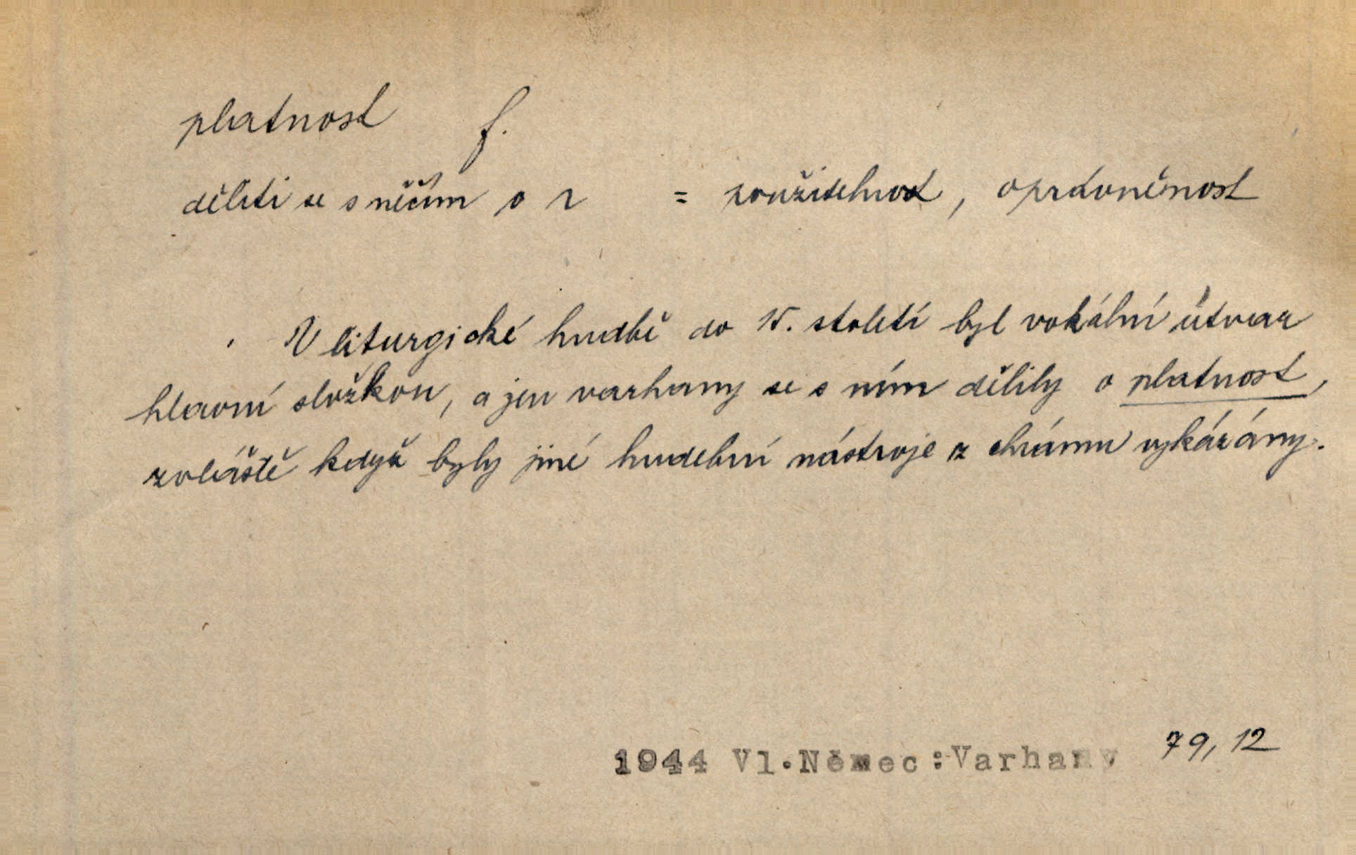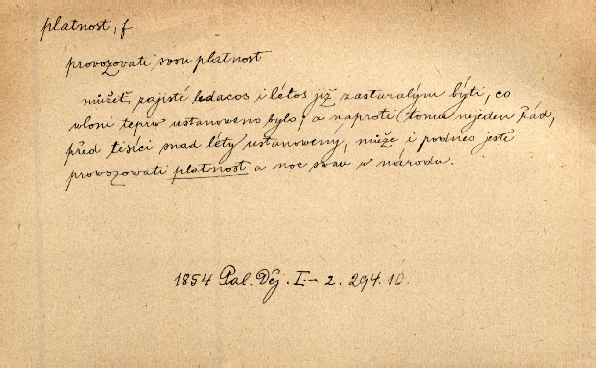 - platnost, -i f. vlastnost něčeho platícího, uznávaného n. majícího vlastnosti normy. Kterak možná jest minci v království českém ustanoviti tak stálou, aby kurs její, čili platnost a míra, nikdy se neměnily? Pal. Proslýchá se, že falešné banknotky ani na přes rok platnosti míti nebudou. Hum. kal. Kalvin zachoval v Ženevě zákony o čarodějství v platnosti. Čech. Rozsudek nabýval okamžité platnosti. Nor. Encyklika zatracuje učení o svrchovanosti národa a platnosti veřejného mínění co výrazu vůle národní. Grégr. Práv. vlastnost míti právní účinky. Platnost manželství, smlouvy. D vlastnost někoho n. něčeho nějak se uplatňujícího, projevujícího svou účinnost, svůj vliv, působení. U Náprstka nejednalo se o to, co některá věc poskytuje jemu výhodného, ale o to, jakou platnost má pro dobro všeobecné. Zey. Přišelť její vzrůst při této práci k plné platnosti. Svět. Ty že nejsi platen? Kdo tedy má platnost nějakou, ne-li muž, který všecku sílu obecnému dobru věnuje? Podl. Vítek oběma stranám slouží, ale jen pašerům k platnosti je. Mož. Co se týče řeči, mluví Hercegovec volněji a dává více platnosti dlouhým slabikám. Hol. Měla starost, aby náležitě k platnosti přicházely drahocenné šperky, jež měla na sobě. Her. Pod pavučinovým rouchem docházel plné platnosti i tělesný zjev tanečnice. Herrm. Nejmenší podrobnost ozdob [paláce] nepozbývá platnosti. Zey. Titulní úloha došla v rukou pana X. jen prostřední platnosti. Ner.