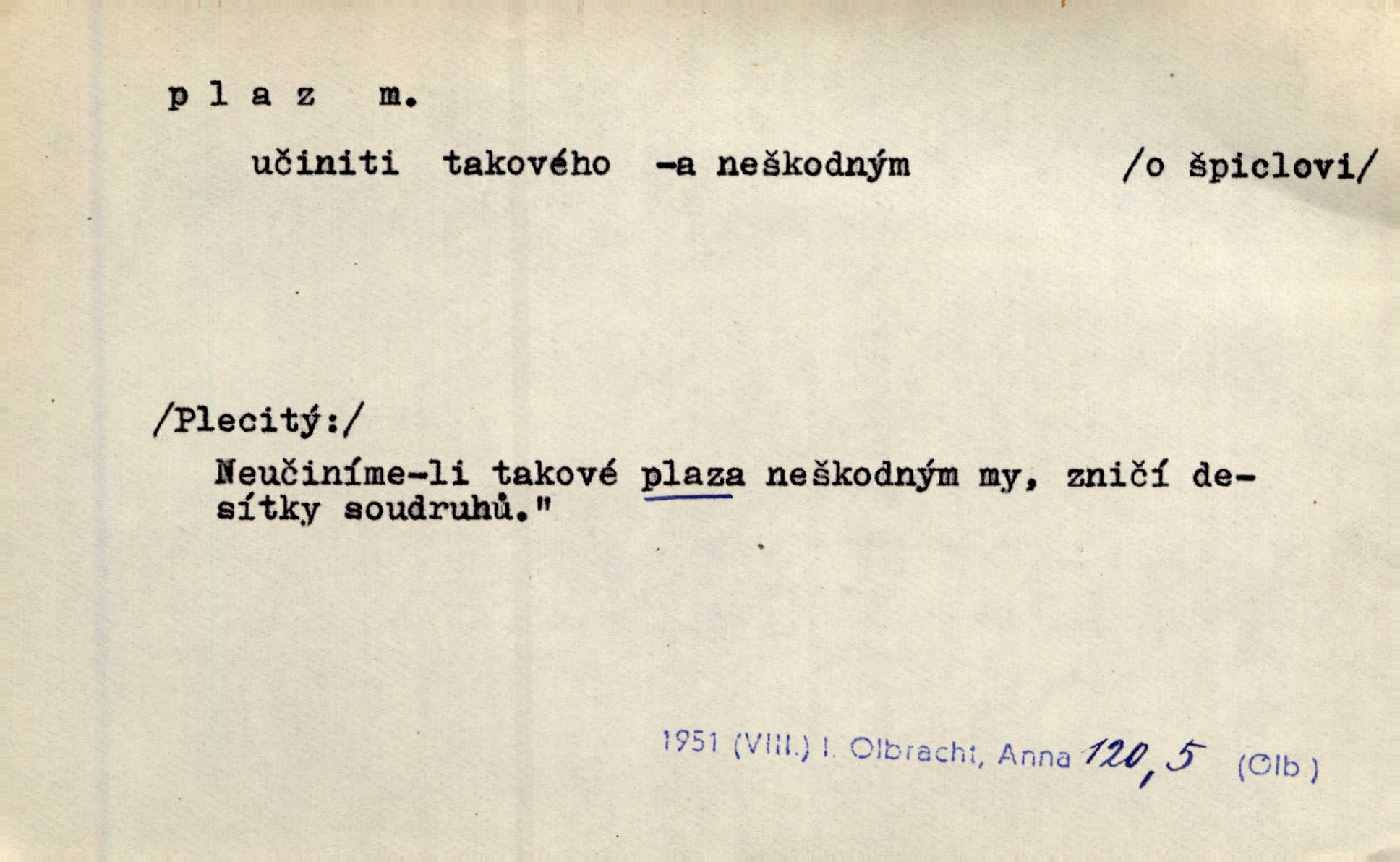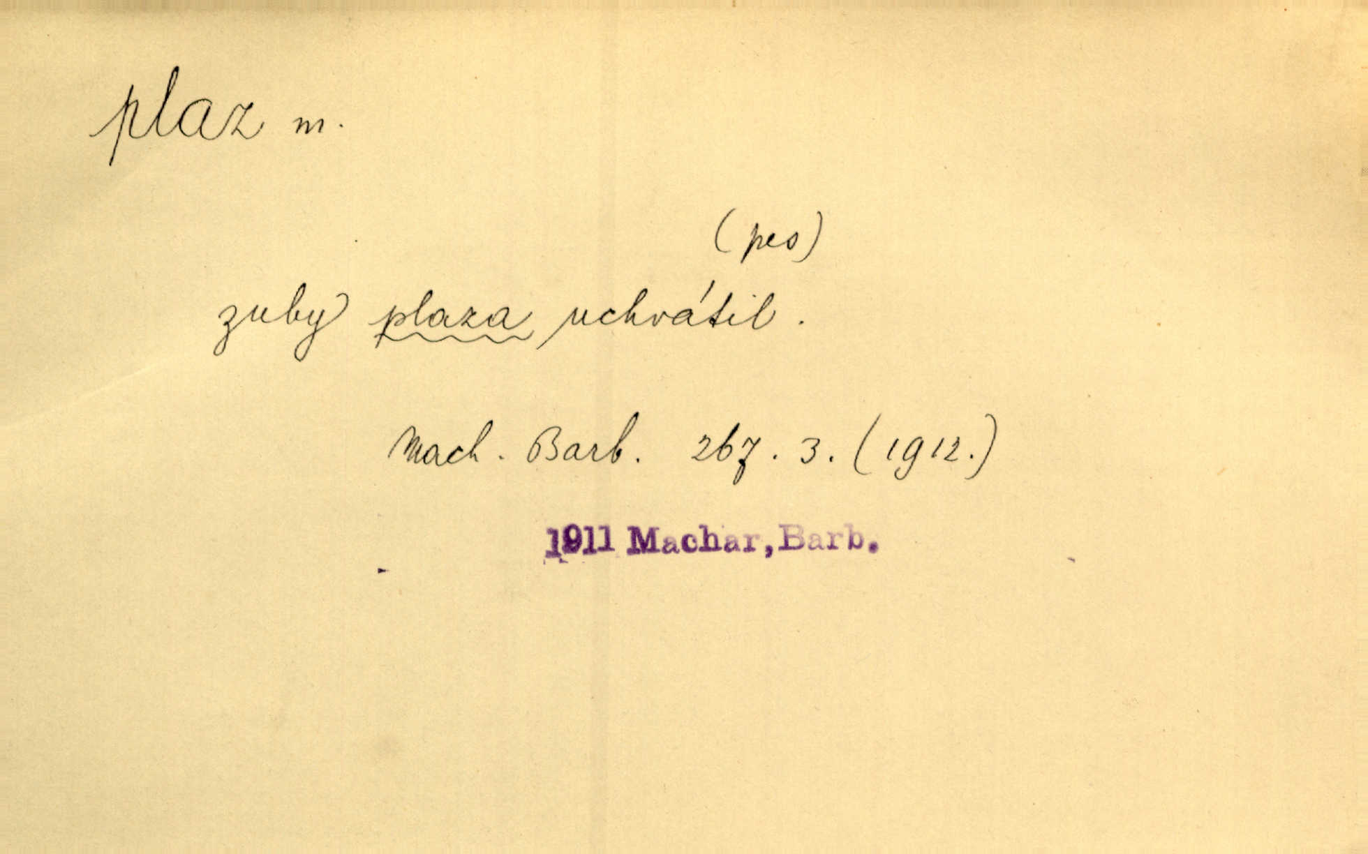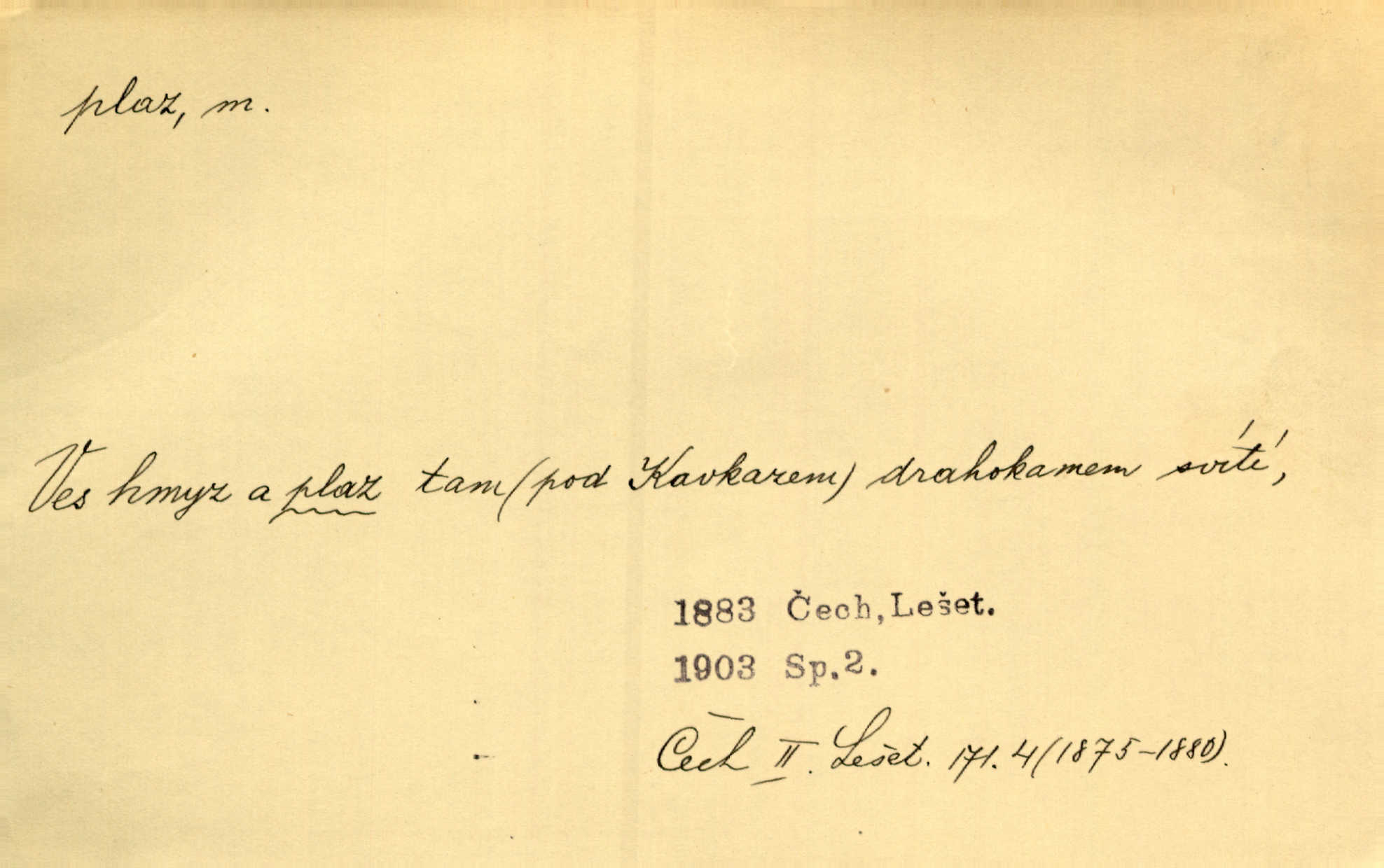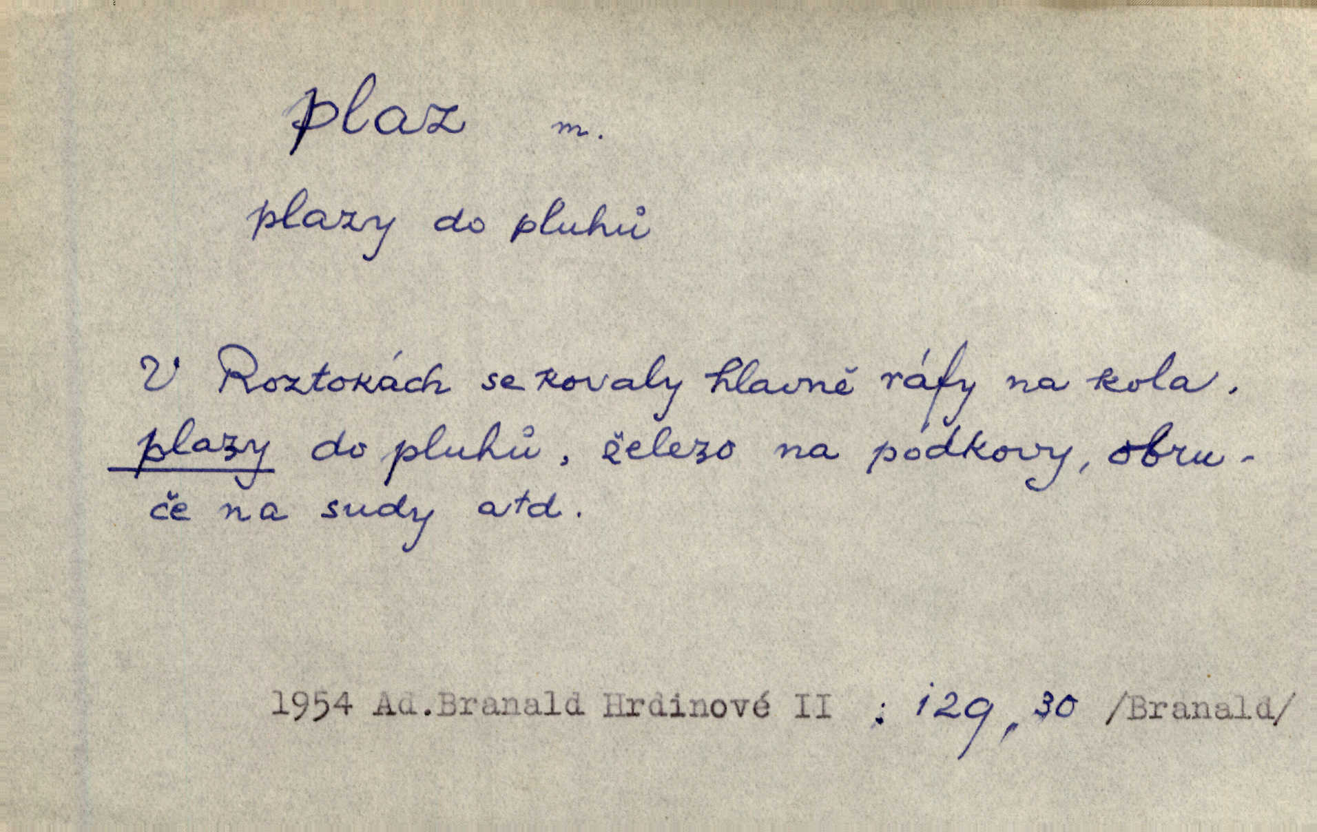 - plaz, -u m. místo, po němž se dříví spouští k vodě, smyk, splaz, spoušť. Vozím na plaz drvo z panských lesů. Heyd. Rád jsem chodil na plazy, kde se vory vázaly. Heyd. Polena, jak v nedalekém plasu o skály bijí, jasným hlasem zvoní. Klášt. D kovová n. dřevěná součástka, po níž se předmět smýká. Koně měl bílé a saně jak oříšek na úzkých, dubových plazech sanicích. V. Mrš. [Průvod panských volů] táhnul za sebou pluhy a brány položené na plazech. A. Mrš. Hosp. součást plužního tělesa upevněná na slupici a sloužící k vedení pluhu. Tech. spodní plocha těla hoblíku, po které se hoblík smýká na hoblovaném předmětě.