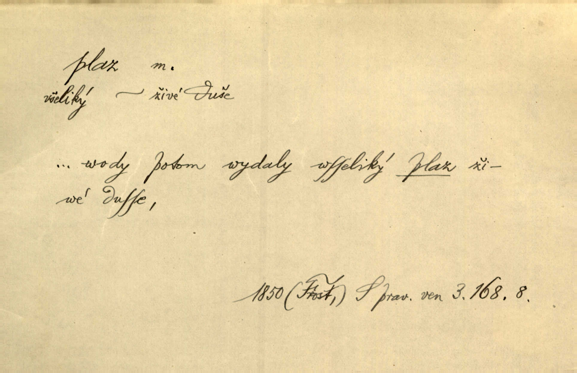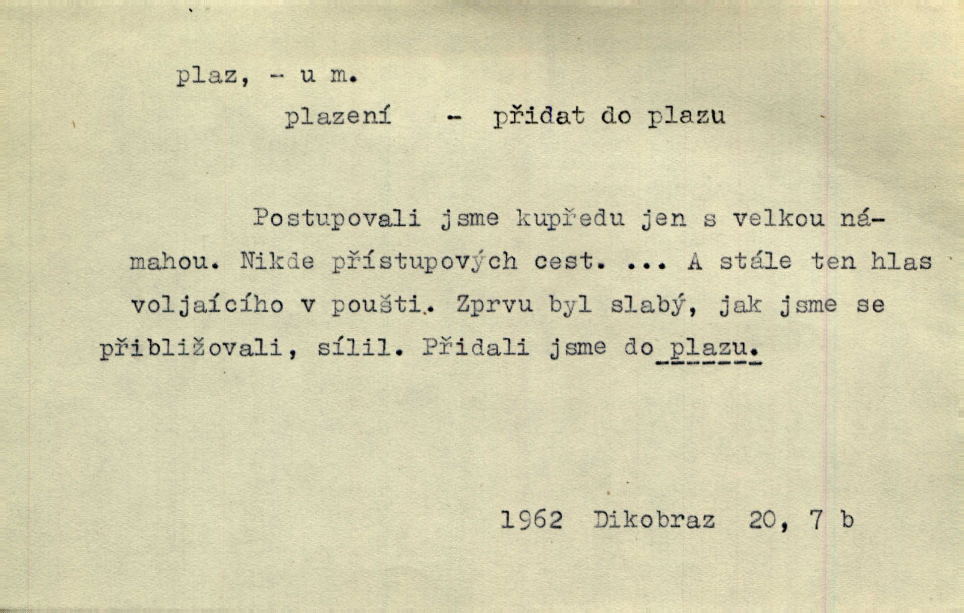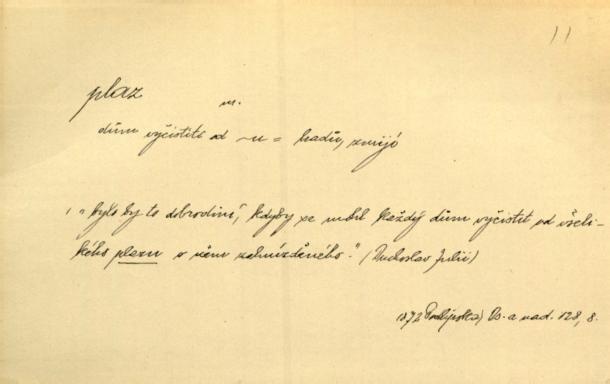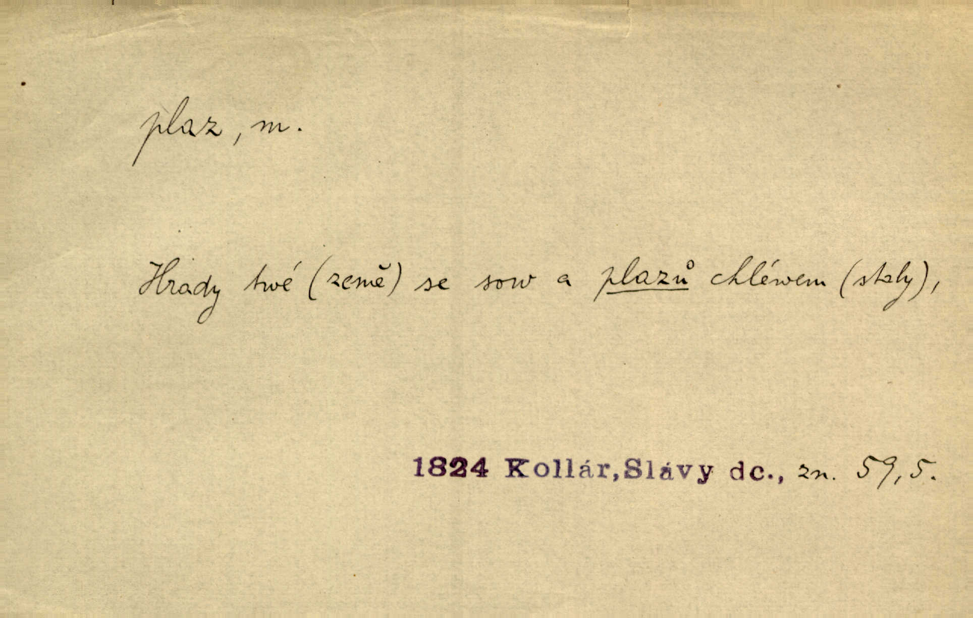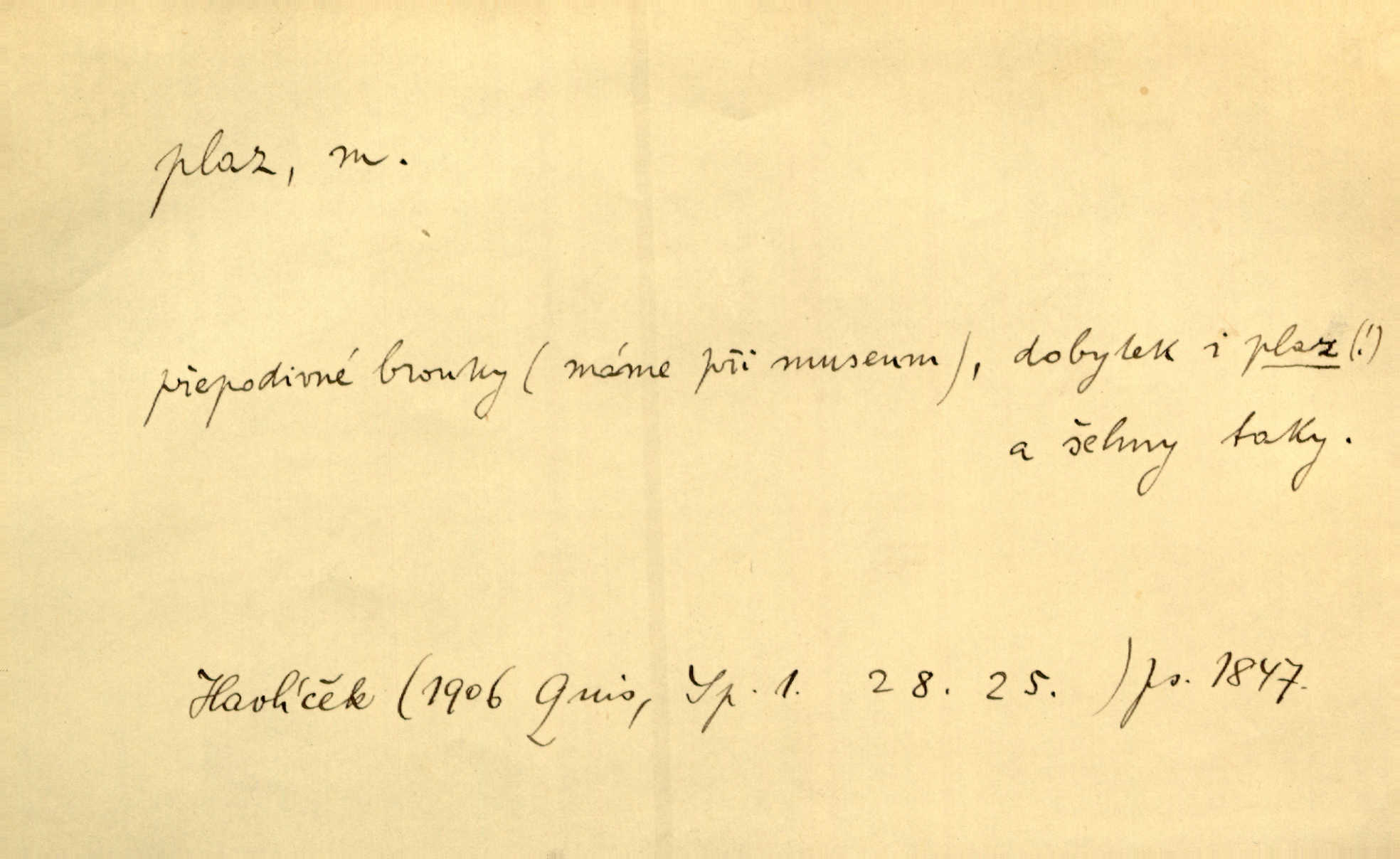 - plaz, -u m. místo, po němž se dříví spouští k vodě, smyk, splaz, spoušť. Vozím na plaz drvo z panských lesů. Heyd. Rád jsem chodil na plazy, kde se vory vázaly. Heyd. Polena, jak v nedalekém plasu o skály bijí, jasným hlasem zvoní. Klášt. D kovová n. dřevěná součástka, po níž se předmět smýká. Koně měl bílé a saně jak oříšek na úzkých, dubových plazech sanicích. V. Mrš. [Průvod panských volů] táhnul za sebou pluhy a brány položené na plazech. A. Mrš. Hosp. součást plužního tělesa upevněná na slupici a sloužící k vedení pluhu. Tech. spodní plocha těla hoblíku, po které se hoblík smýká na hoblovaném předmětě.