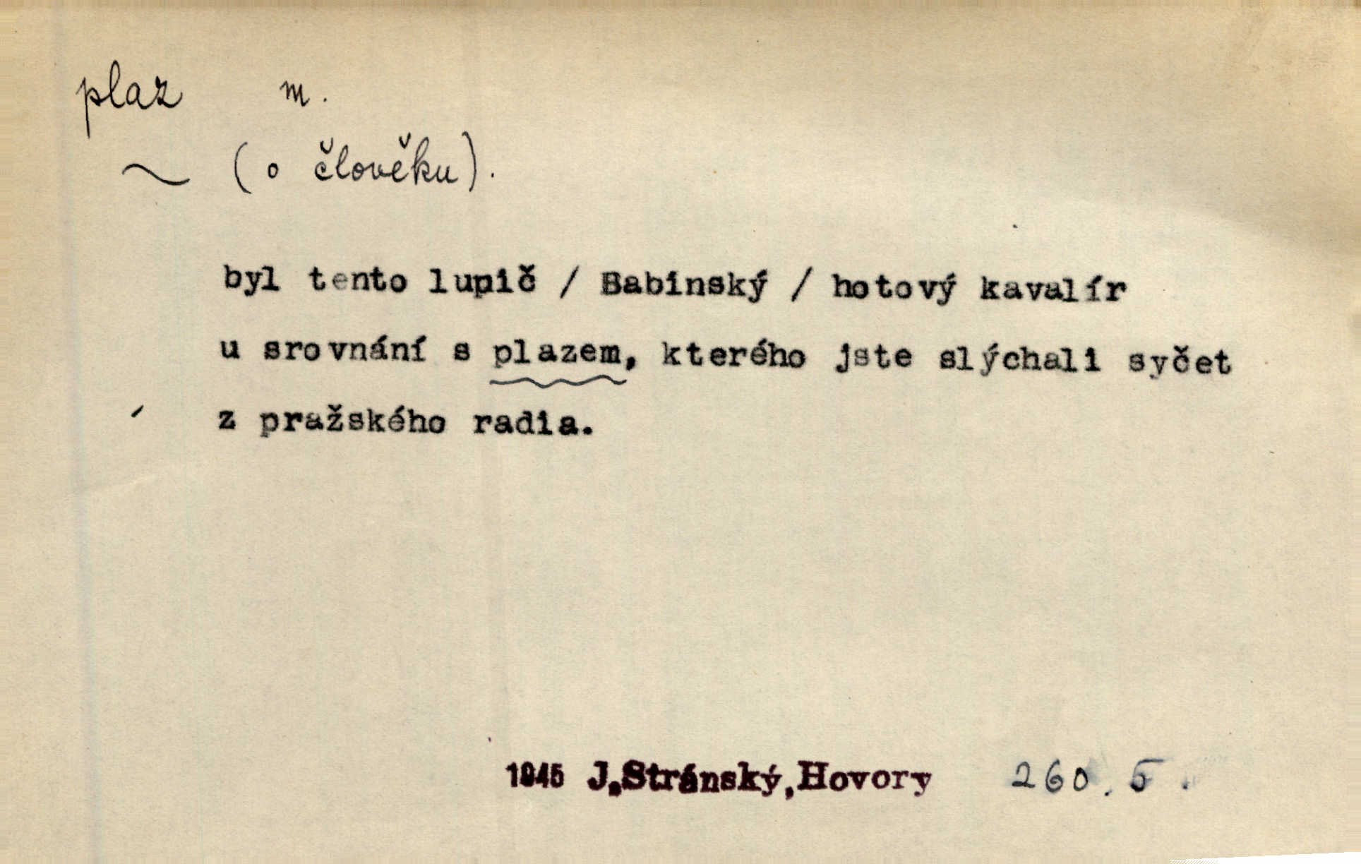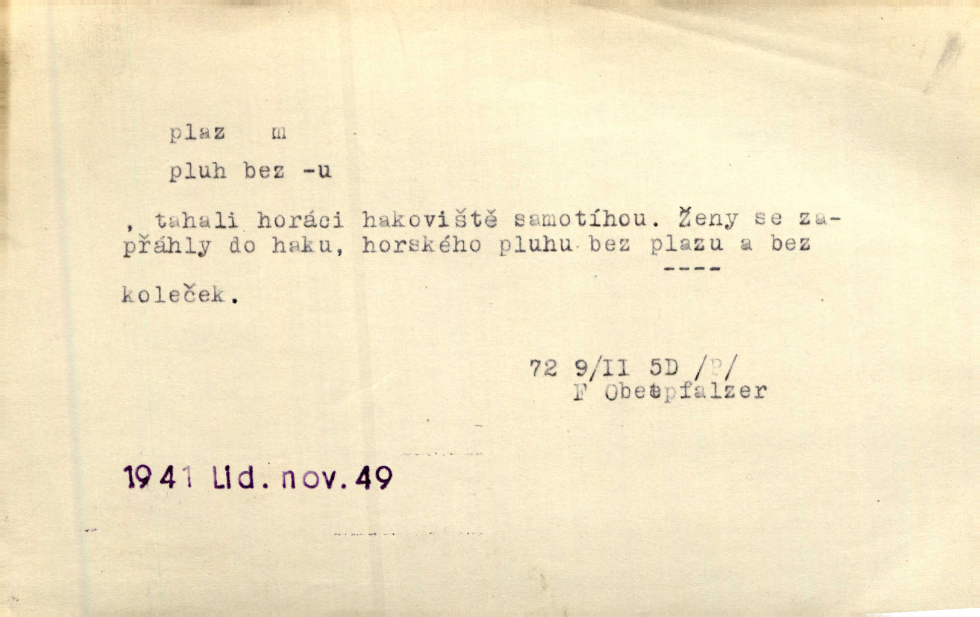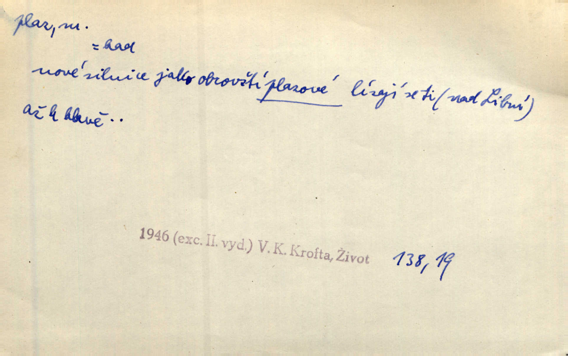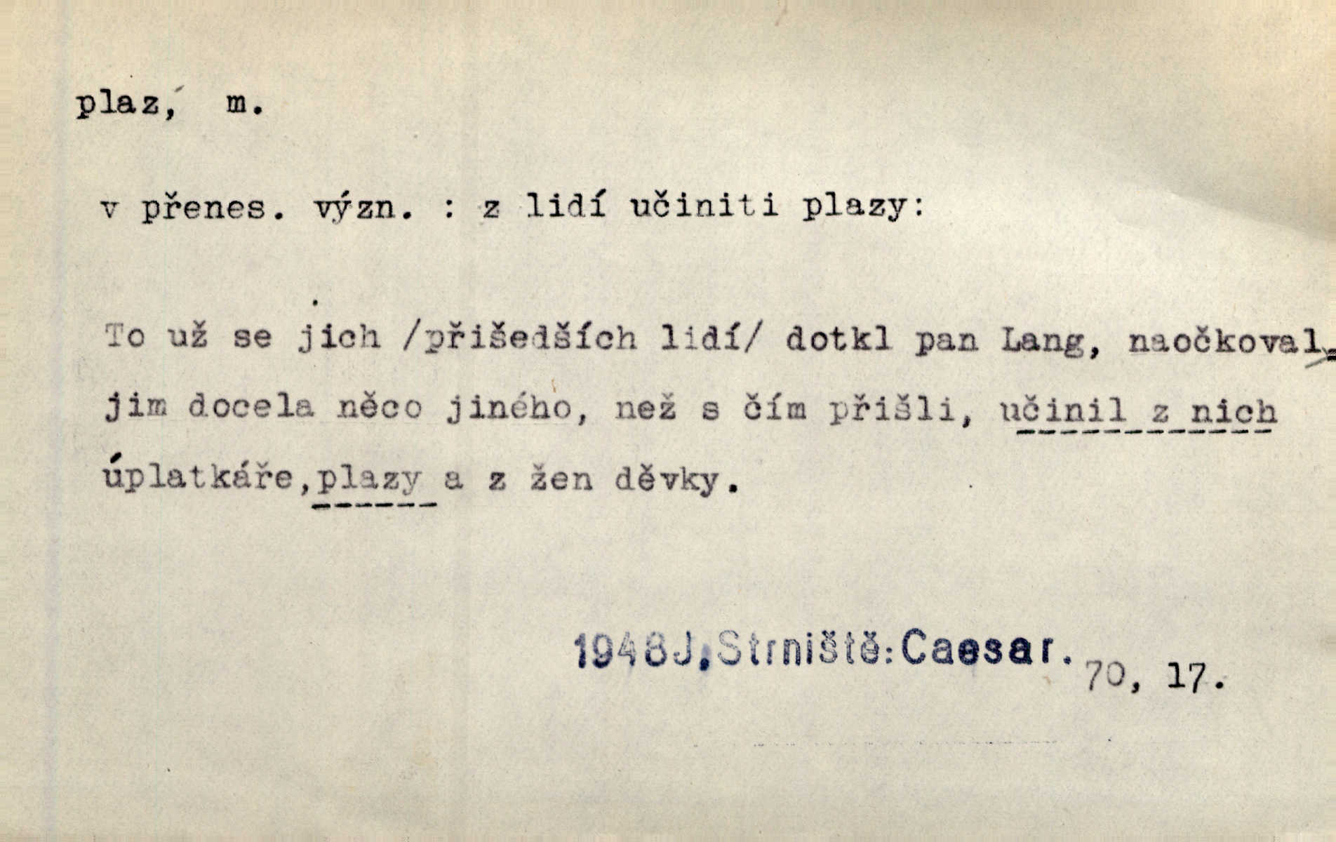 - plaz, -u m. místo, po němž se dříví spouští k vodě, smyk, splaz, spoušť. Vozím na plaz drvo z panských lesů. Heyd. Rád jsem chodil na plazy, kde se vory vázaly. Heyd. Polena, jak v nedalekém plasu o skály bijí, jasným hlasem zvoní. Klášt. D kovová n. dřevěná součástka, po níž se předmět smýká. Koně měl bílé a saně jak oříšek na úzkých, dubových plazech sanicích. V. Mrš. [Průvod panských volů] táhnul za sebou pluhy a brány položené na plazech. A. Mrš. Hosp. součást plužního tělesa upevněná na slupici a sloužící k vedení pluhu. Tech. spodní plocha těla hoblíku, po které se hoblík smýká na hoblovaném předmětě.