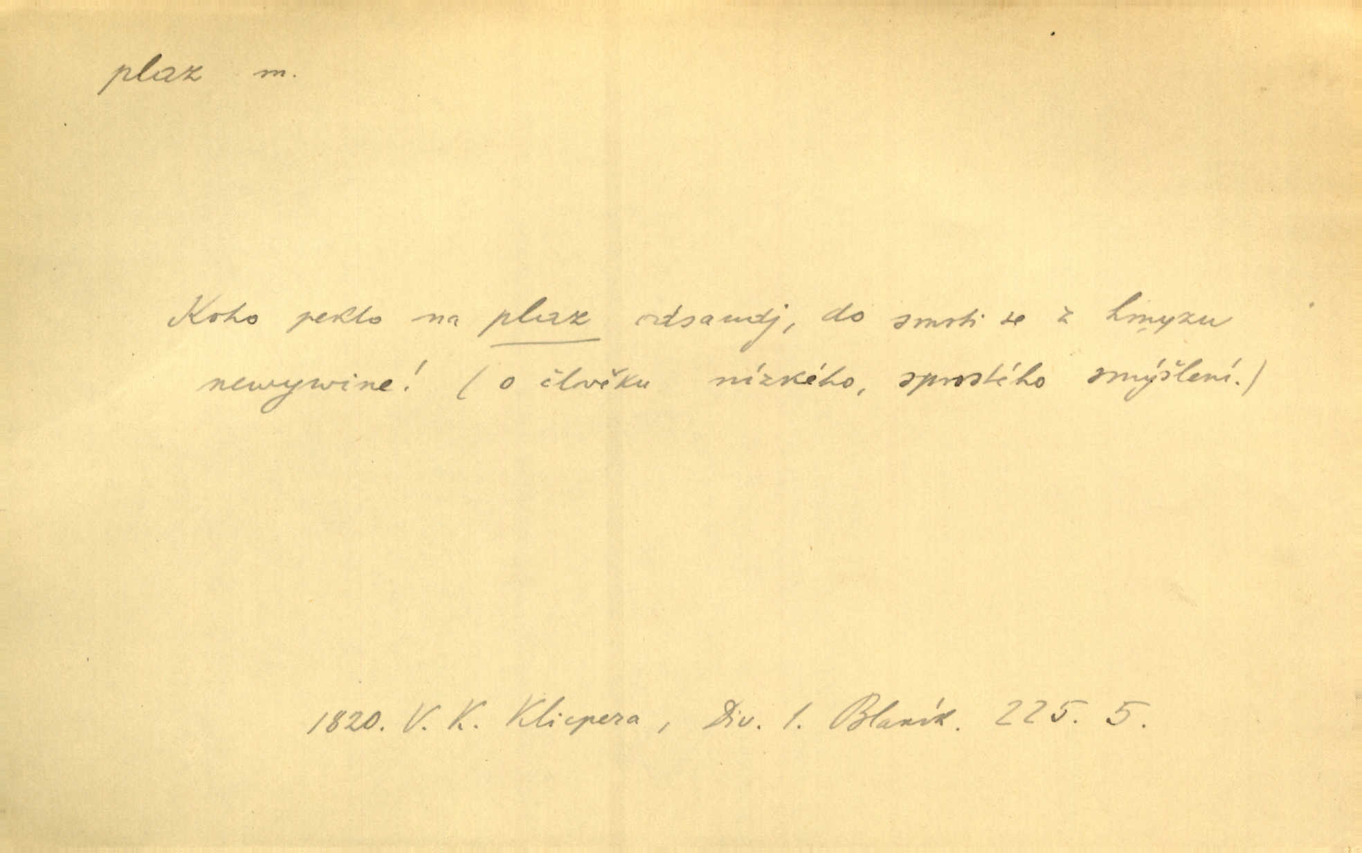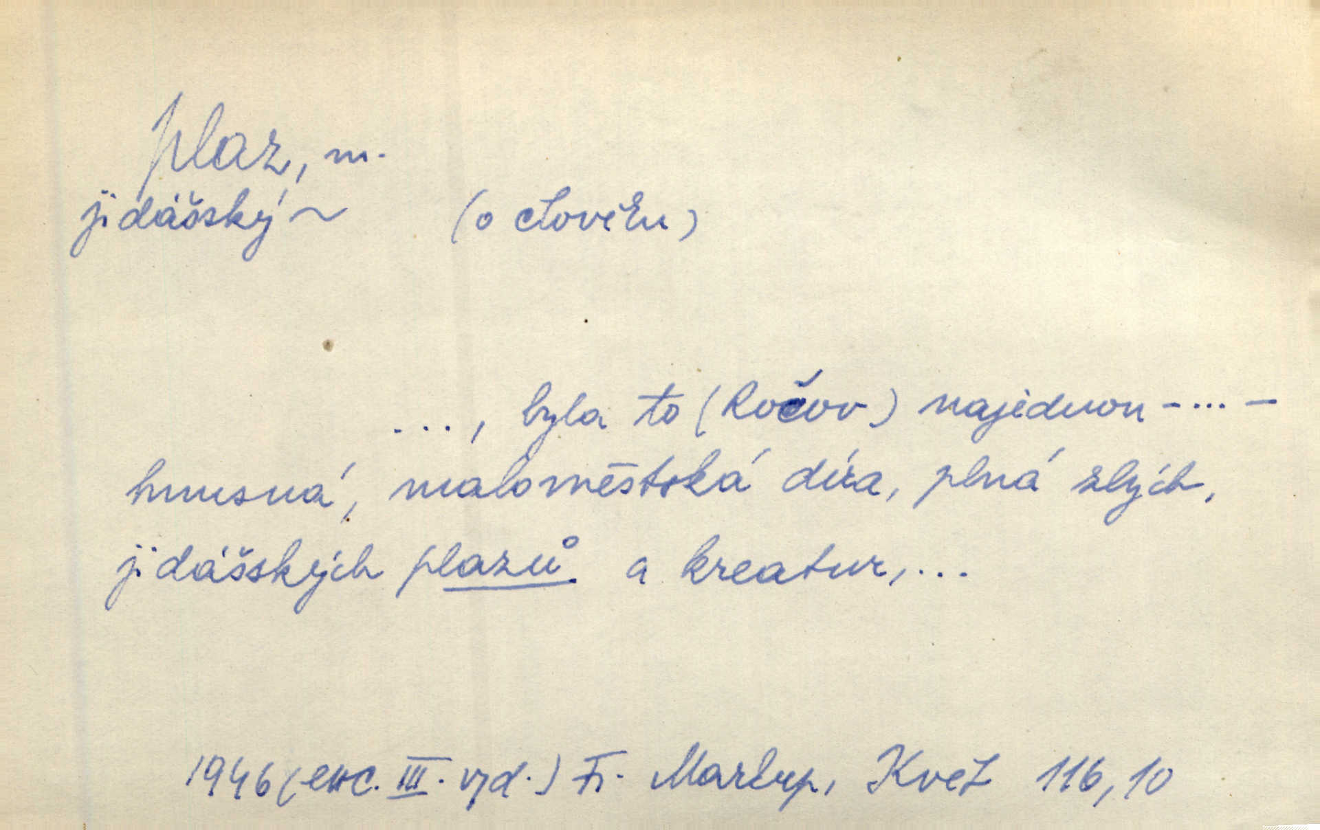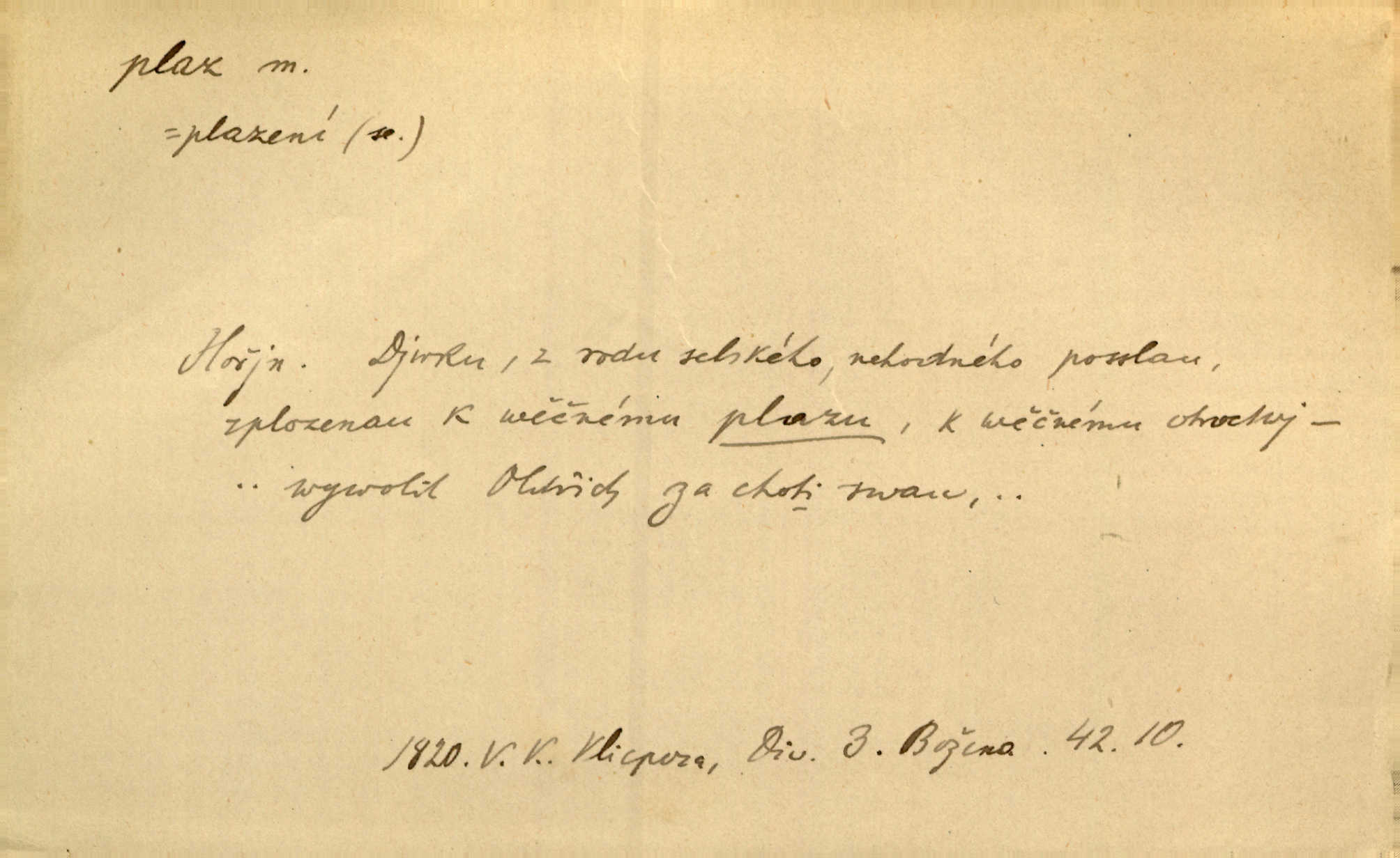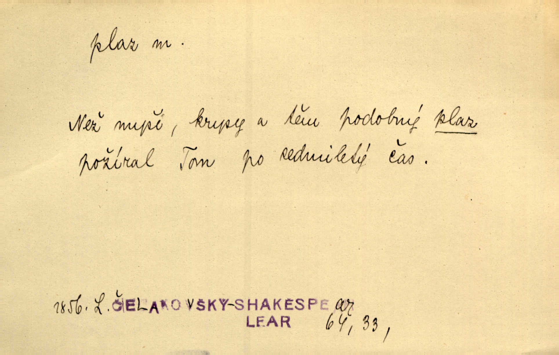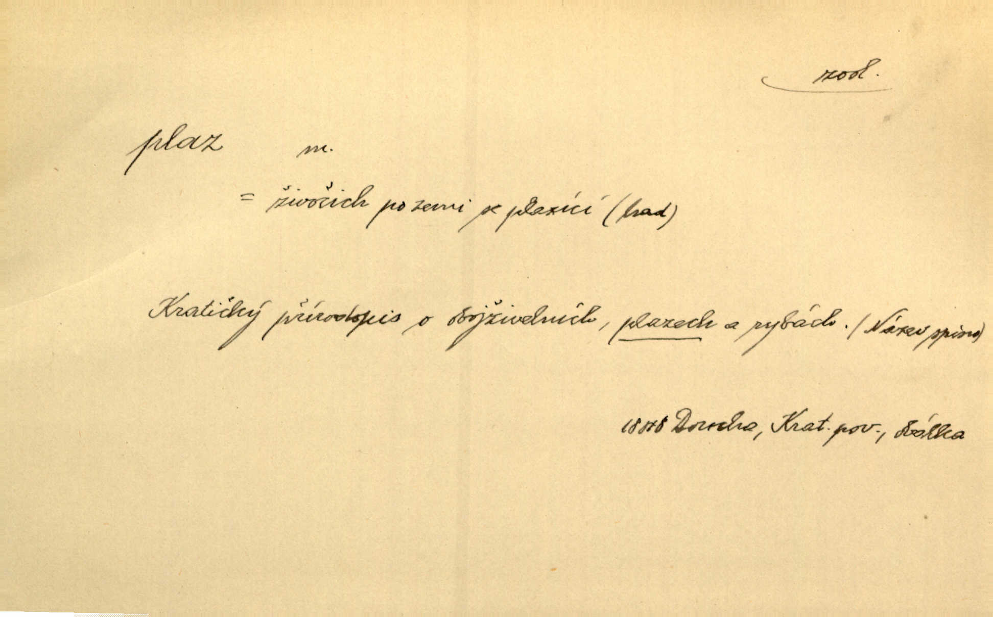 - plaz, -u m. místo, po němž se dříví spouští k vodě, smyk, splaz, spoušť. Vozím na plaz drvo z panských lesů. Heyd. Rád jsem chodil na plazy, kde se vory vázaly. Heyd. Polena, jak v nedalekém plasu o skály bijí, jasným hlasem zvoní. Klášt. D kovová n. dřevěná součástka, po níž se předmět smýká. Koně měl bílé a saně jak oříšek na úzkých, dubových plazech sanicích. V. Mrš. [Průvod panských volů] táhnul za sebou pluhy a brány položené na plazech. A. Mrš. Hosp. součást plužního tělesa upevněná na slupici a sloužící k vedení pluhu. Tech. spodní plocha těla hoblíku, po které se hoblík smýká na hoblovaném předmětě.