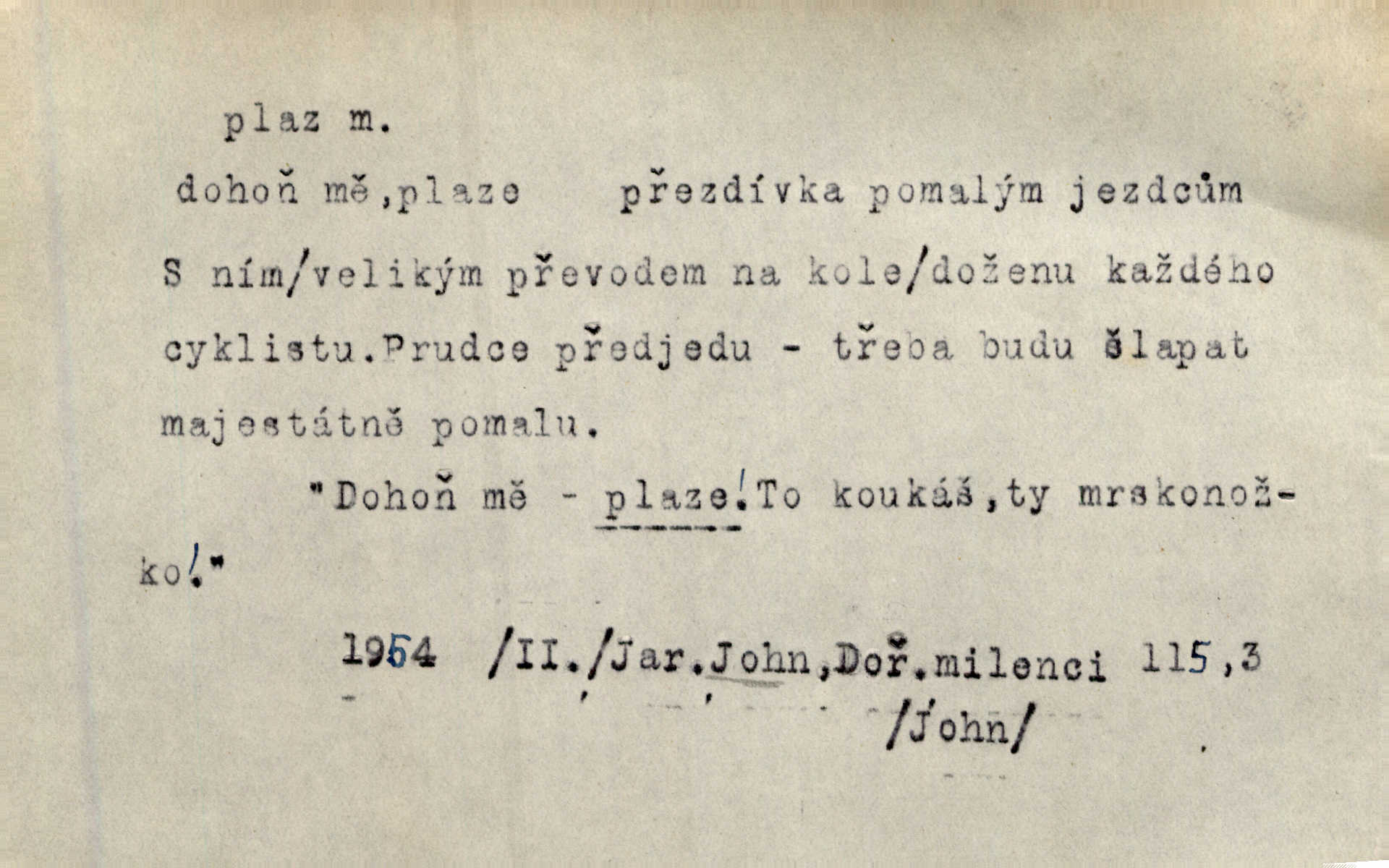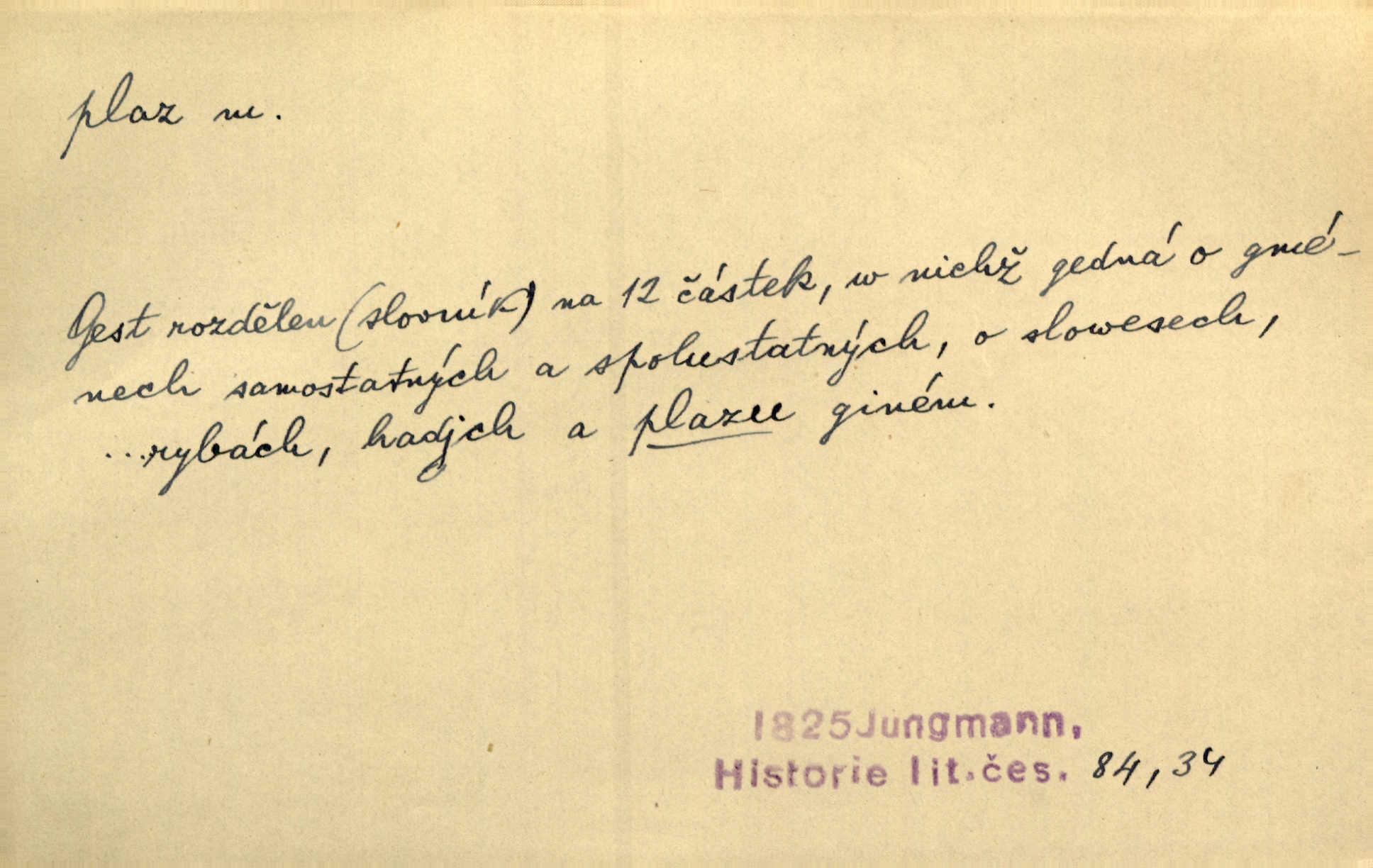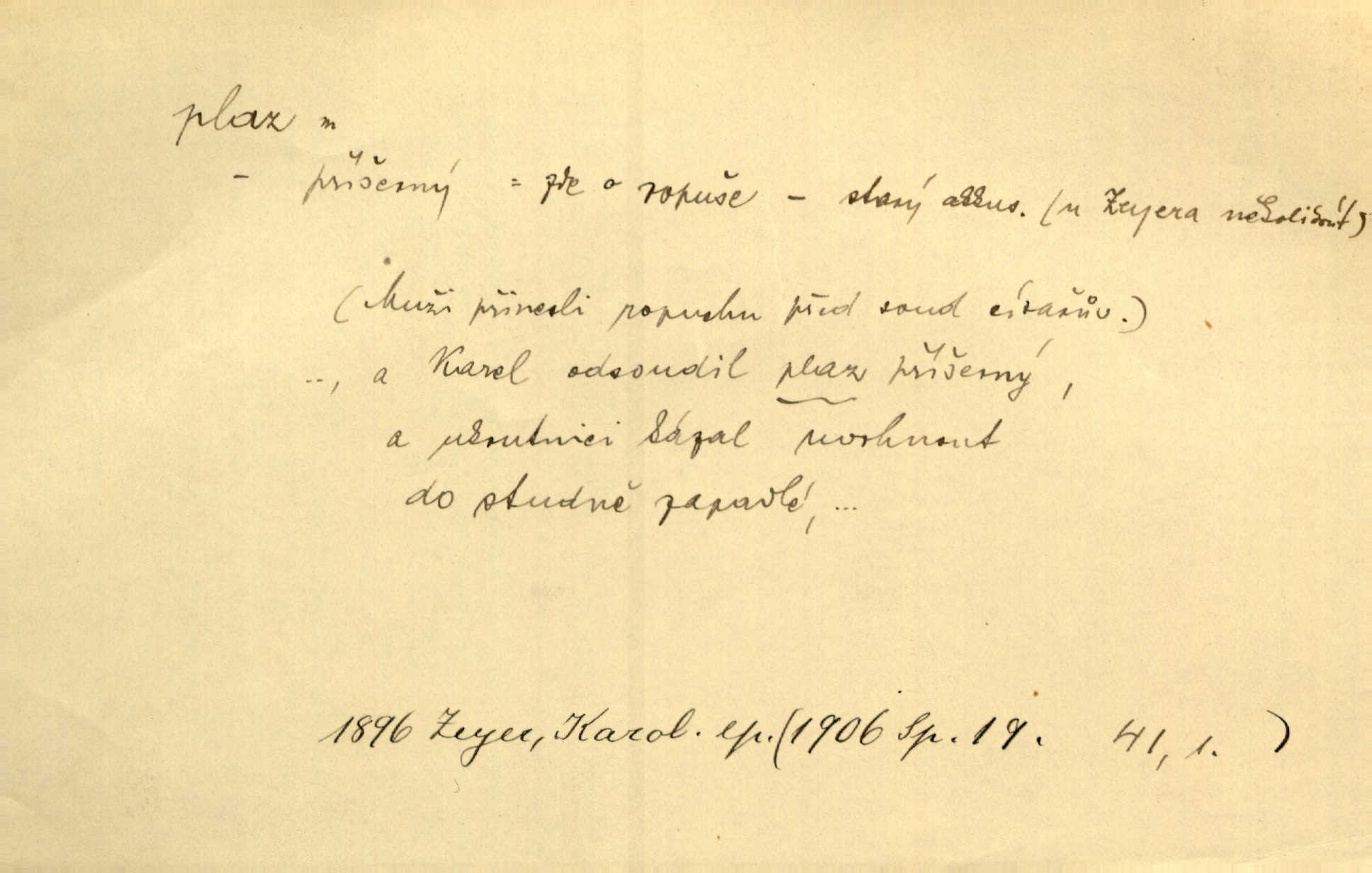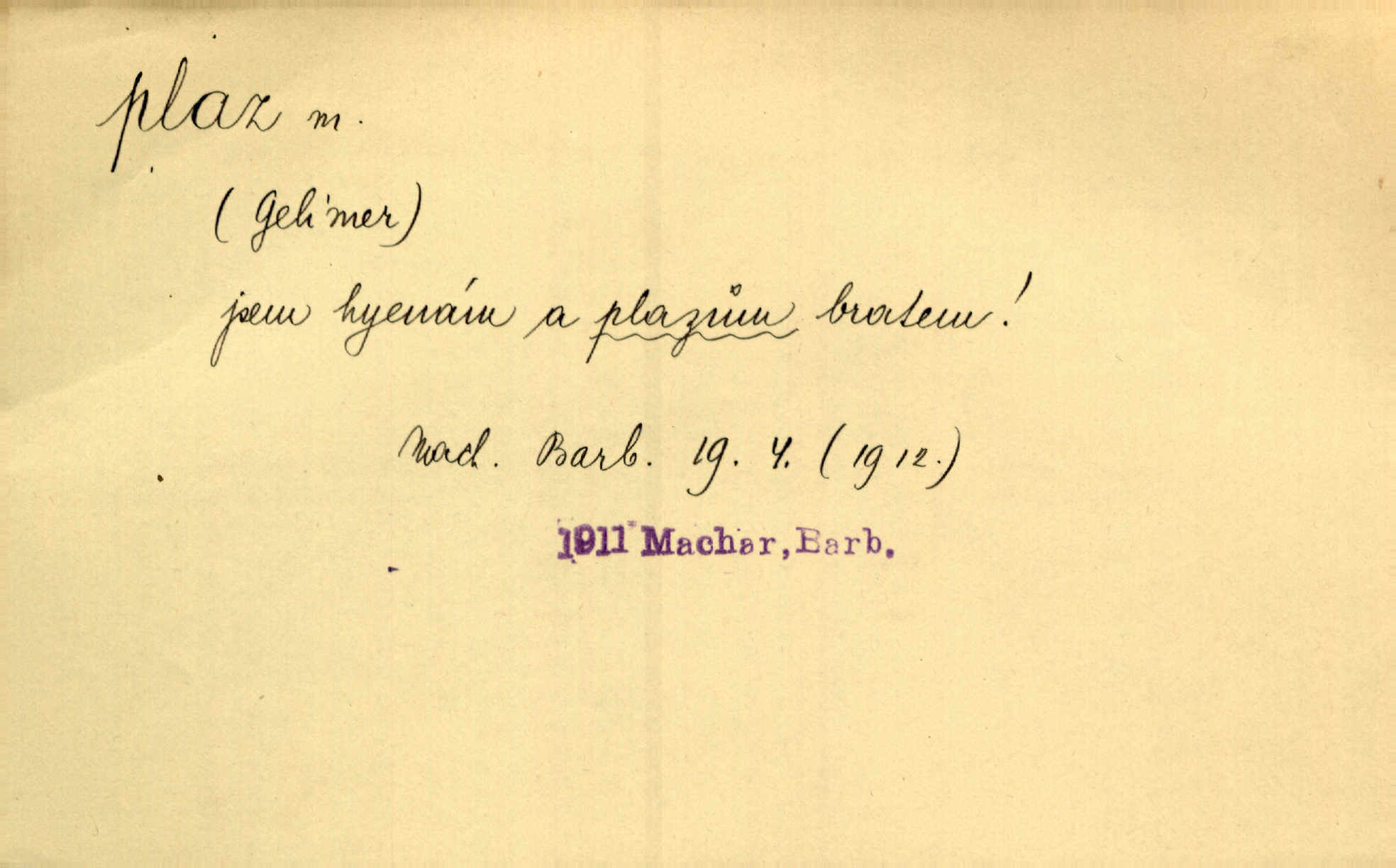 - plaz, -u m. místo, po němž se dříví spouští k vodě, smyk, splaz, spoušť. Vozím na plaz drvo z panských lesů. Heyd. Rád jsem chodil na plazy, kde se vory vázaly. Heyd. Polena, jak v nedalekém plasu o skály bijí, jasným hlasem zvoní. Klášt. D kovová n. dřevěná součástka, po níž se předmět smýká. Koně měl bílé a saně jak oříšek na úzkých, dubových plazech sanicích. V. Mrš. [Průvod panských volů] táhnul za sebou pluhy a brány položené na plazech. A. Mrš. Hosp. součást plužního tělesa upevněná na slupici a sloužící k vedení pluhu. Tech. spodní plocha těla hoblíku, po které se hoblík smýká na hoblovaném předmětě.