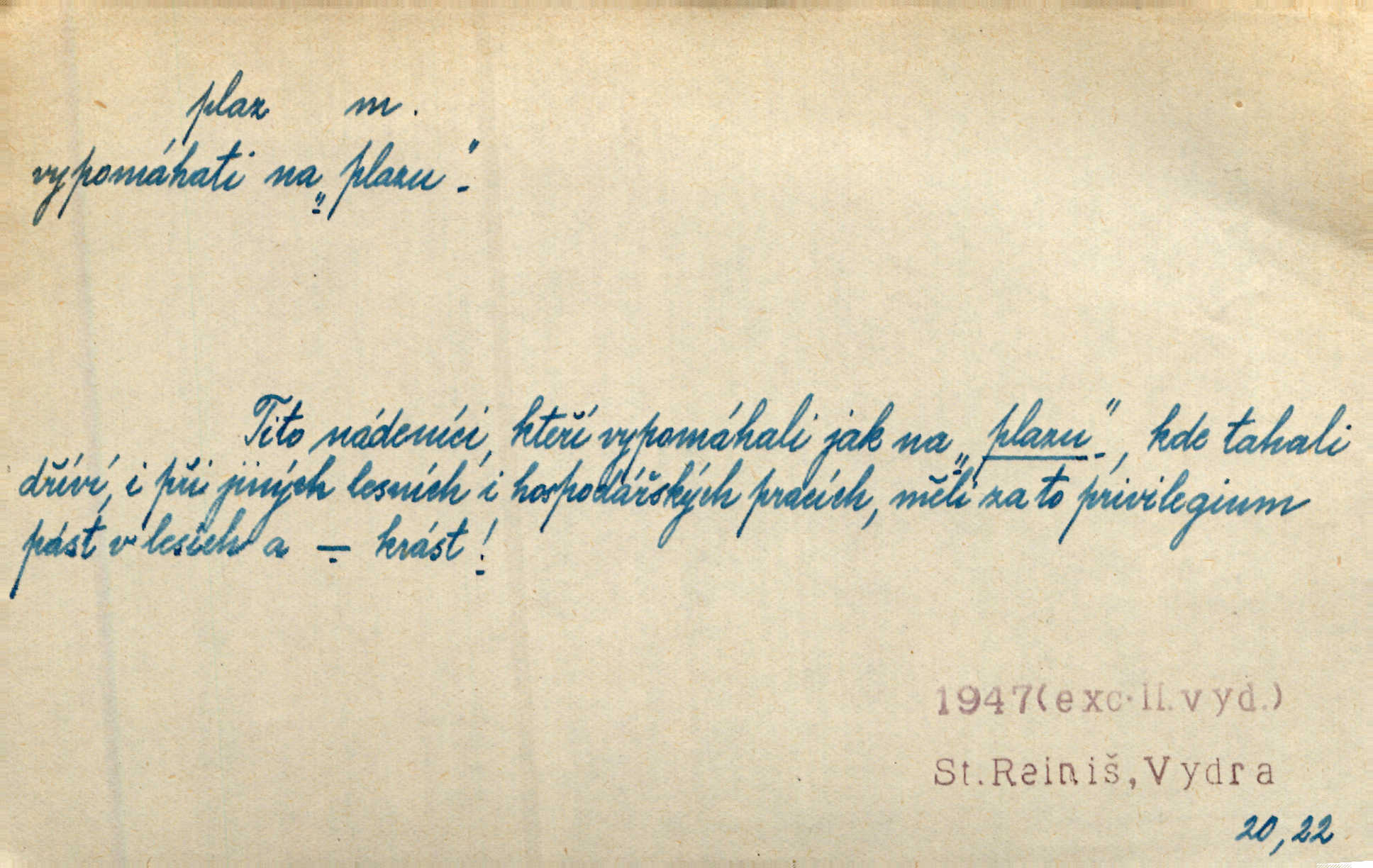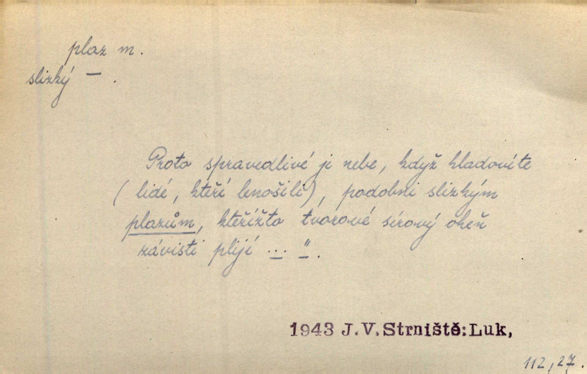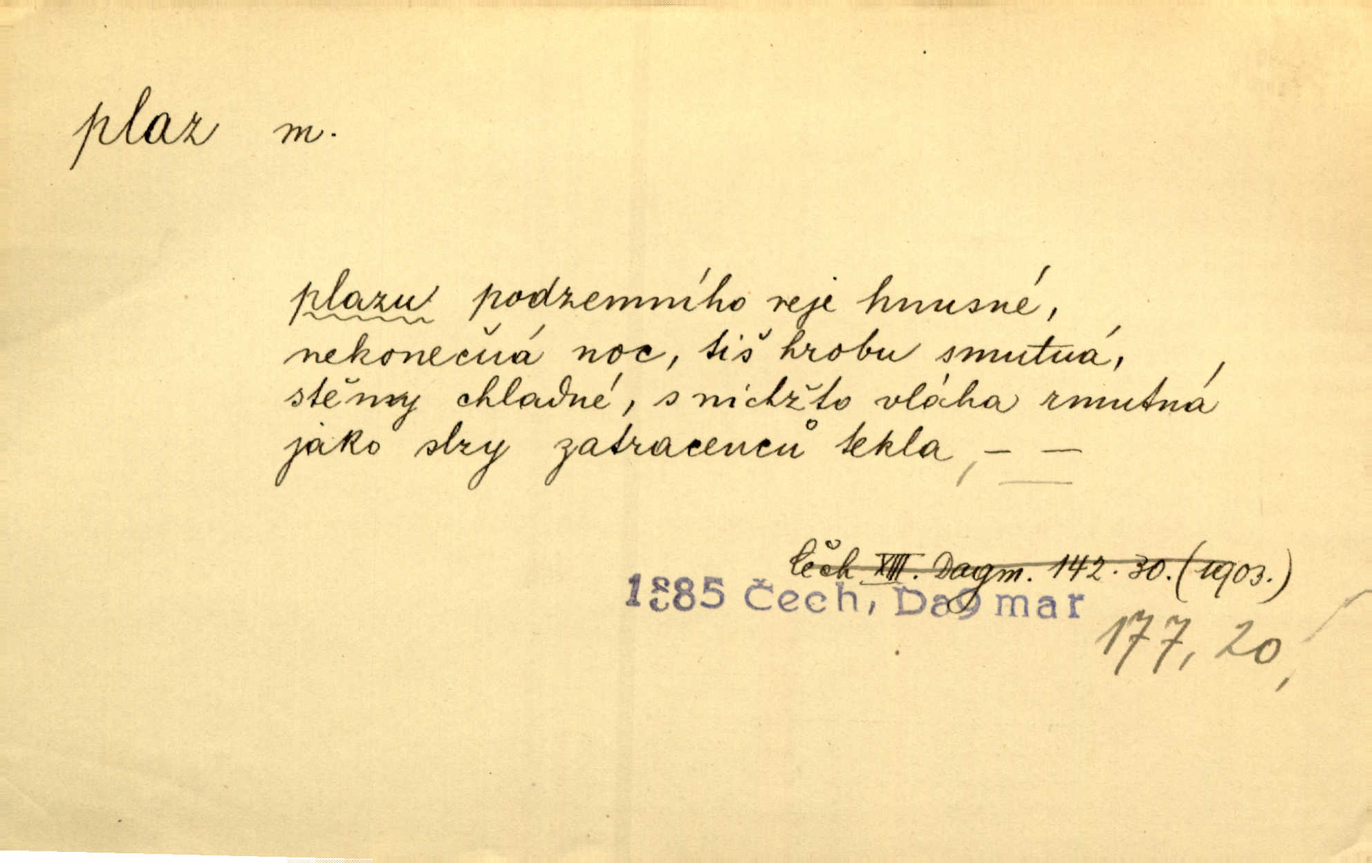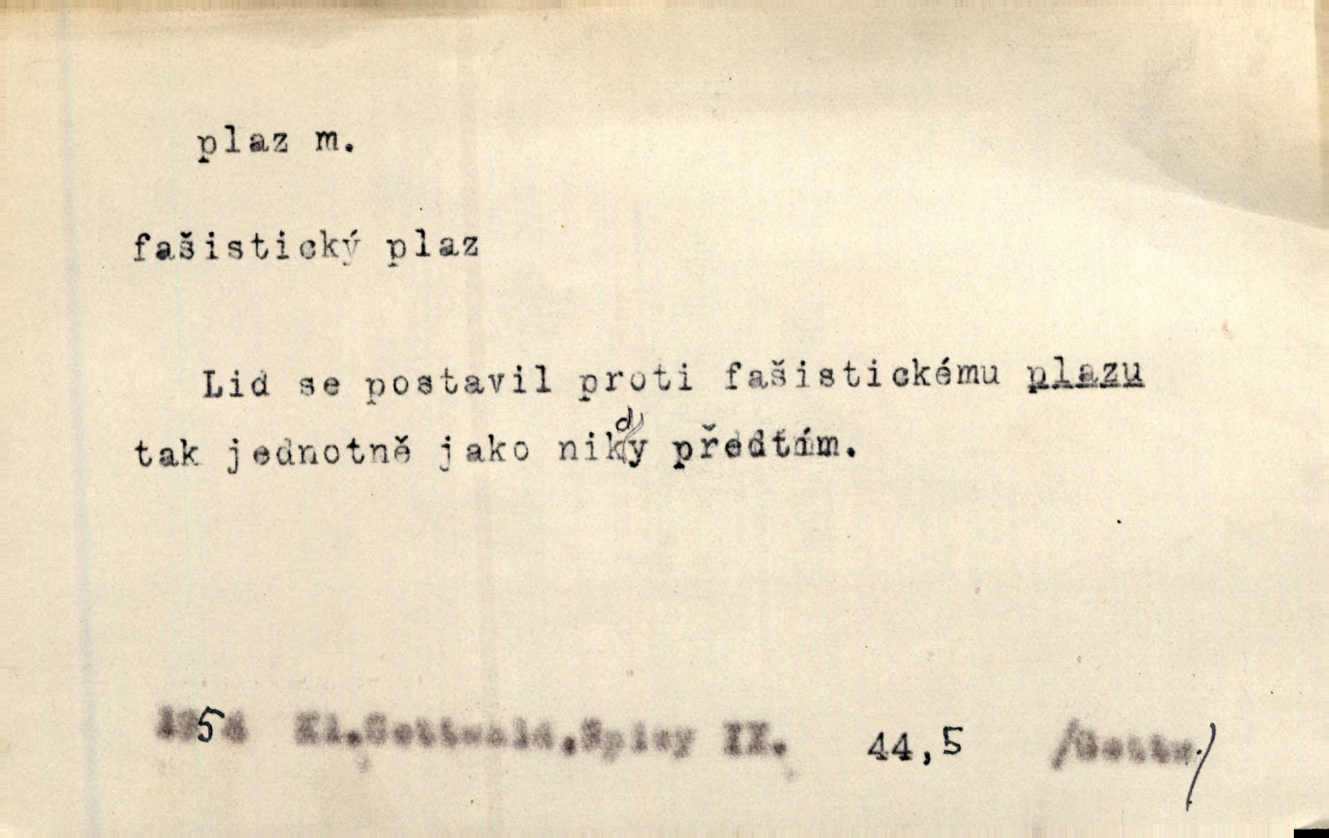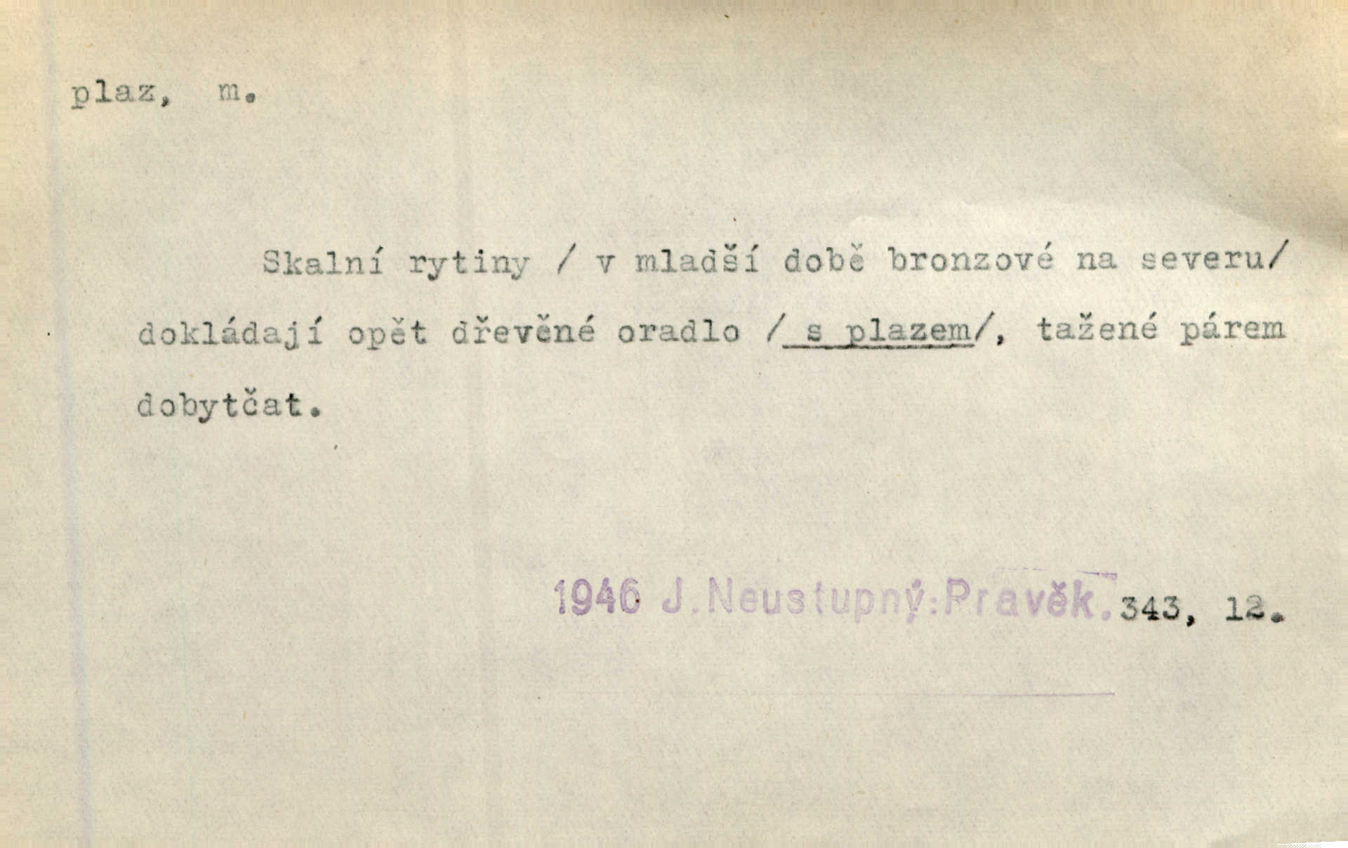 - plaz, -u m. místo, po němž se dříví spouští k vodě, smyk, splaz, spoušť. Vozím na plaz drvo z panských lesů. Heyd. Rád jsem chodil na plazy, kde se vory vázaly. Heyd. Polena, jak v nedalekém plasu o skály bijí, jasným hlasem zvoní. Klášt. D kovová n. dřevěná součástka, po níž se předmět smýká. Koně měl bílé a saně jak oříšek na úzkých, dubových plazech sanicích. V. Mrš. [Průvod panských volů] táhnul za sebou pluhy a brány položené na plazech. A. Mrš. Hosp. součást plužního tělesa upevněná na slupici a sloužící k vedení pluhu. Tech. spodní plocha těla hoblíku, po které se hoblík smýká na hoblovaném předmětě.