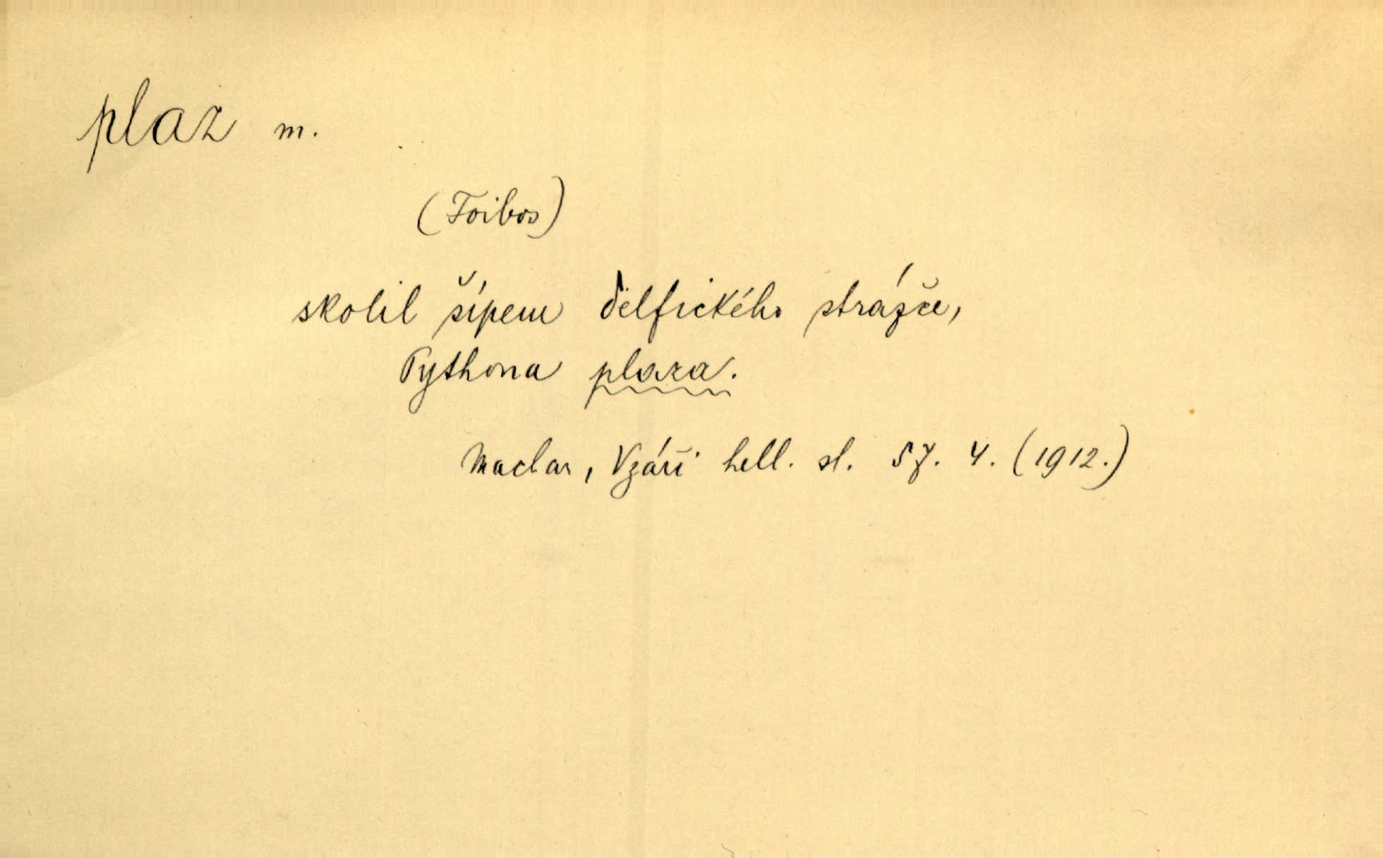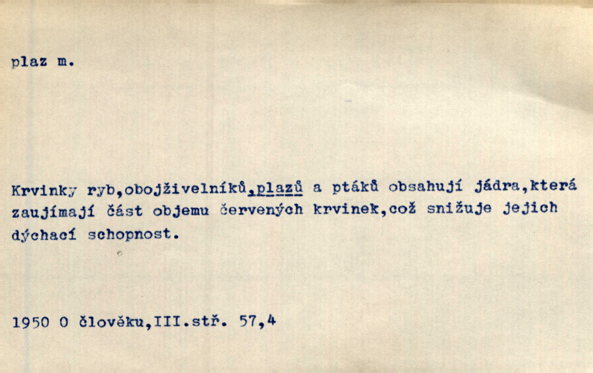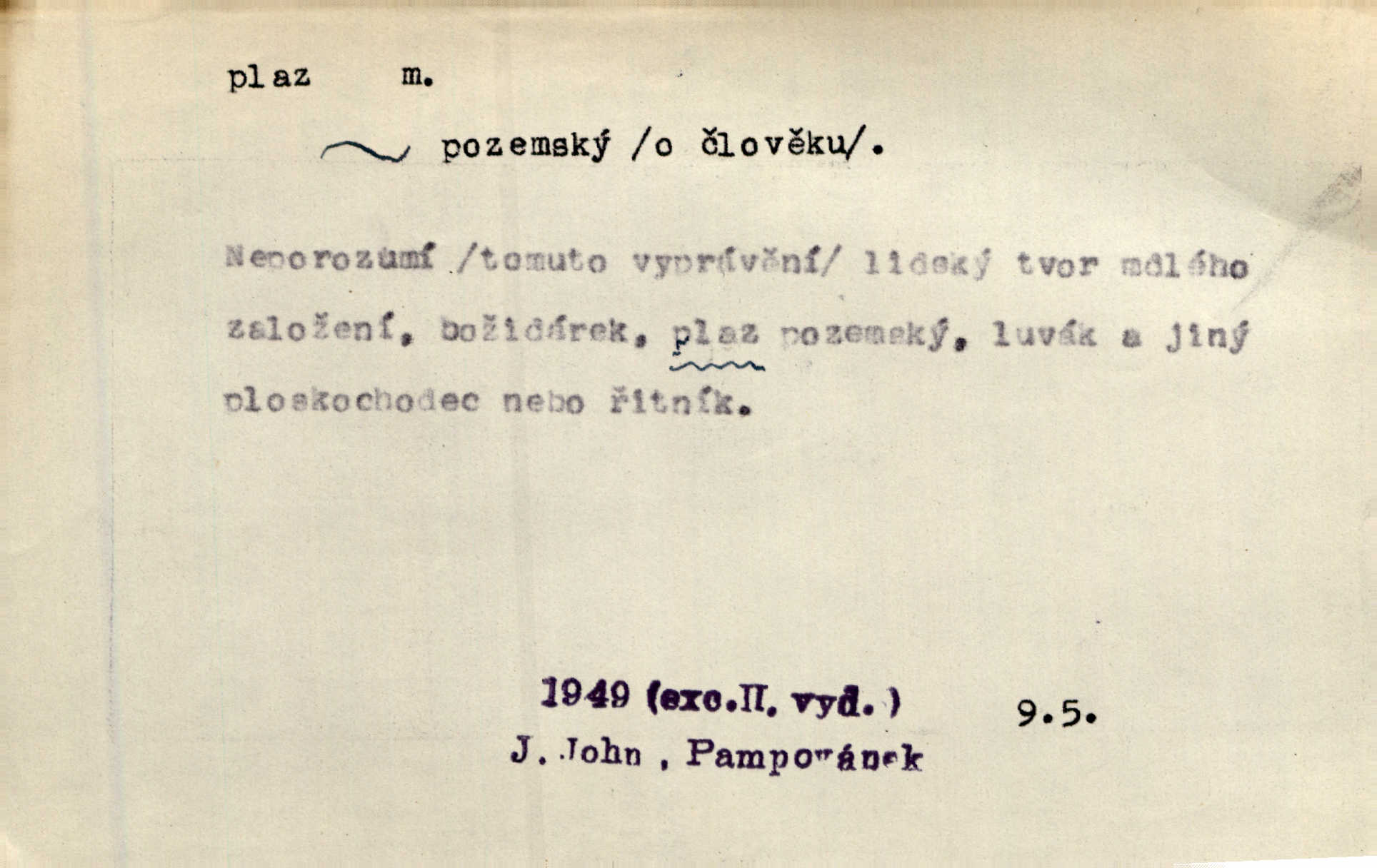 - plaz, -a m. plazící se živočich, obyč. had n. ještěrka. Hrady tvé se sov a plazů chlévem staly. Koll. V kořenů směsi hnízdí, syčí plazi. J. Kvap. Zasyčel jako plaz, na nějž někdo šlápnul. Herb. Děvče se uhnulo [Viktorovi], jako by se to sápal jedovatý plaz. Vach. Na vysočině pohybovala se volně výprava, táhnouc se do dálky jako ohromný klikatý plaz. Jan. Přen. o člověku ošklivém, zlém. Tělo její se zachvělo bezděčně nechutí před stykem s oněmi plazy jedovatými, jak Luhovské ve svém nitru nazývala. Svět. Zpět, chátro! zpátky, plaze otrocký. Vrch. Všecky lidi považoval za původně dobré; nevěřil, že jsou mezi nimi rození jedovatí plazi. Krás. Zool. plazi třída zvířectva, Reptilia; plazi šupinatí podtřída řádu plazů, Squammata.