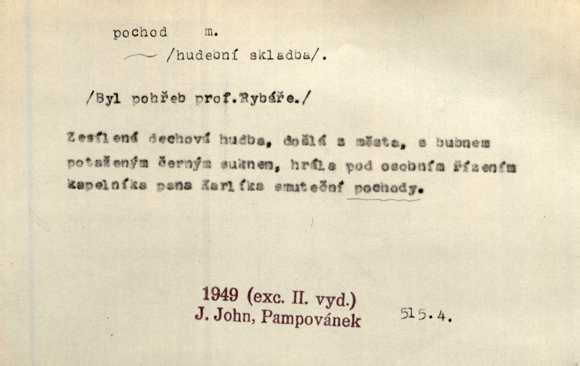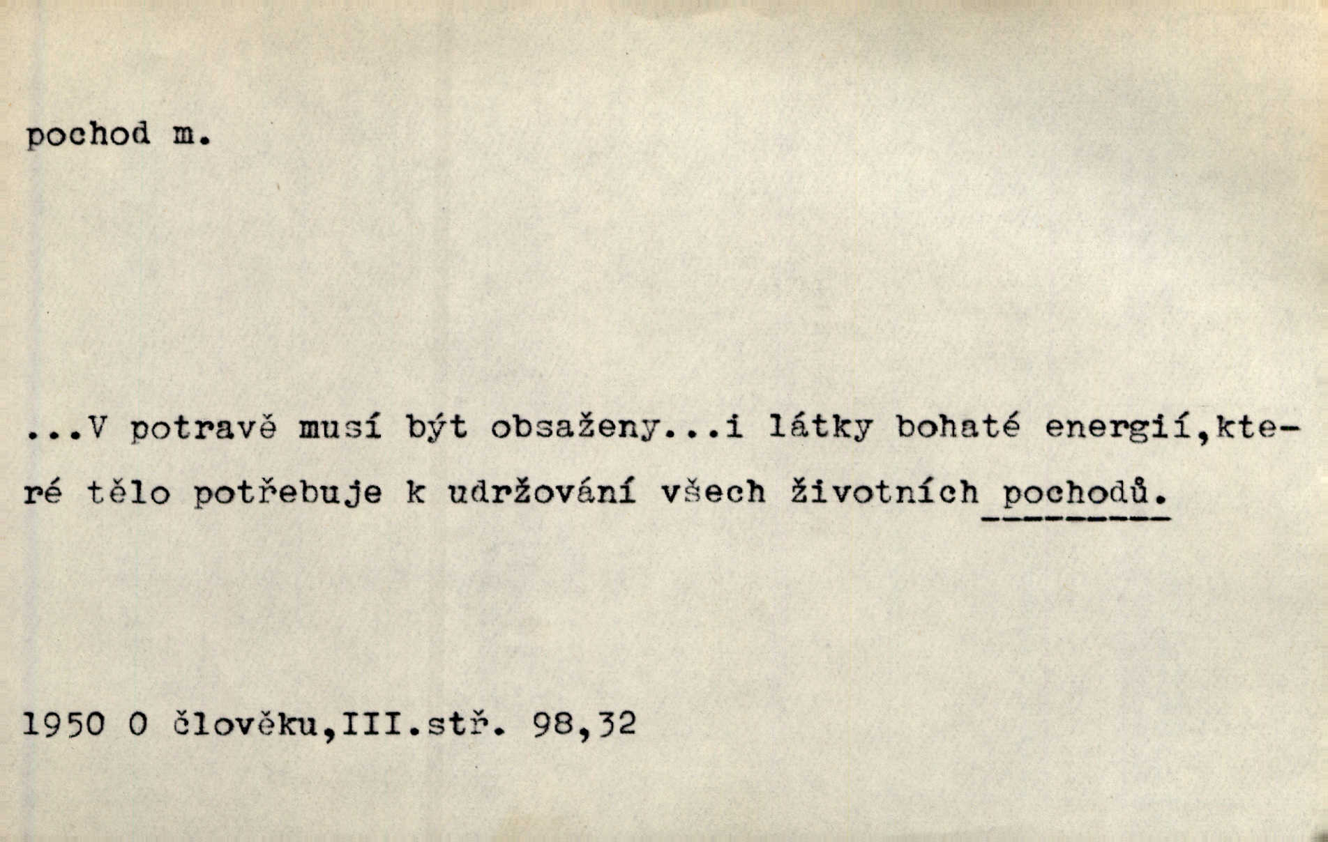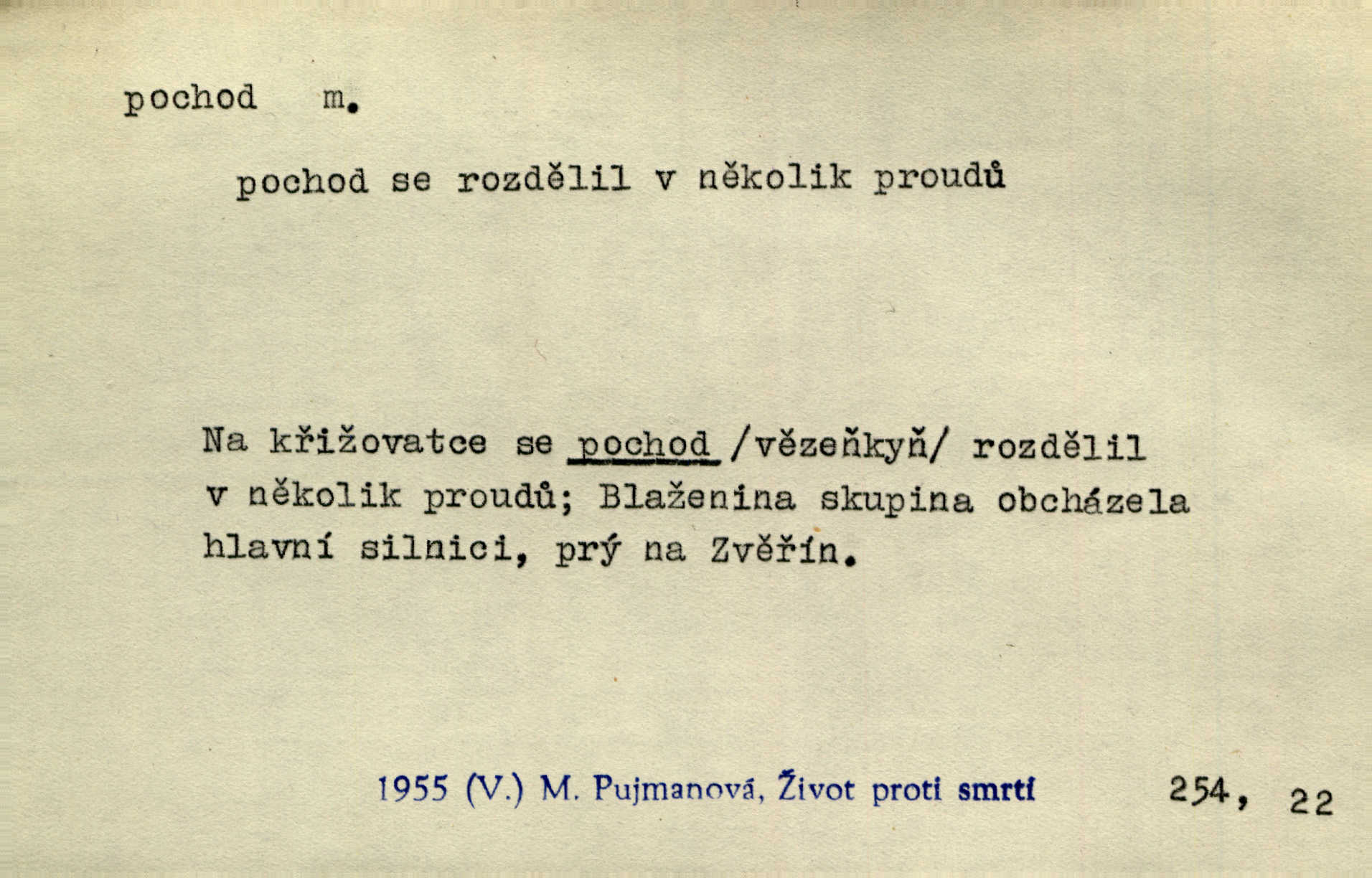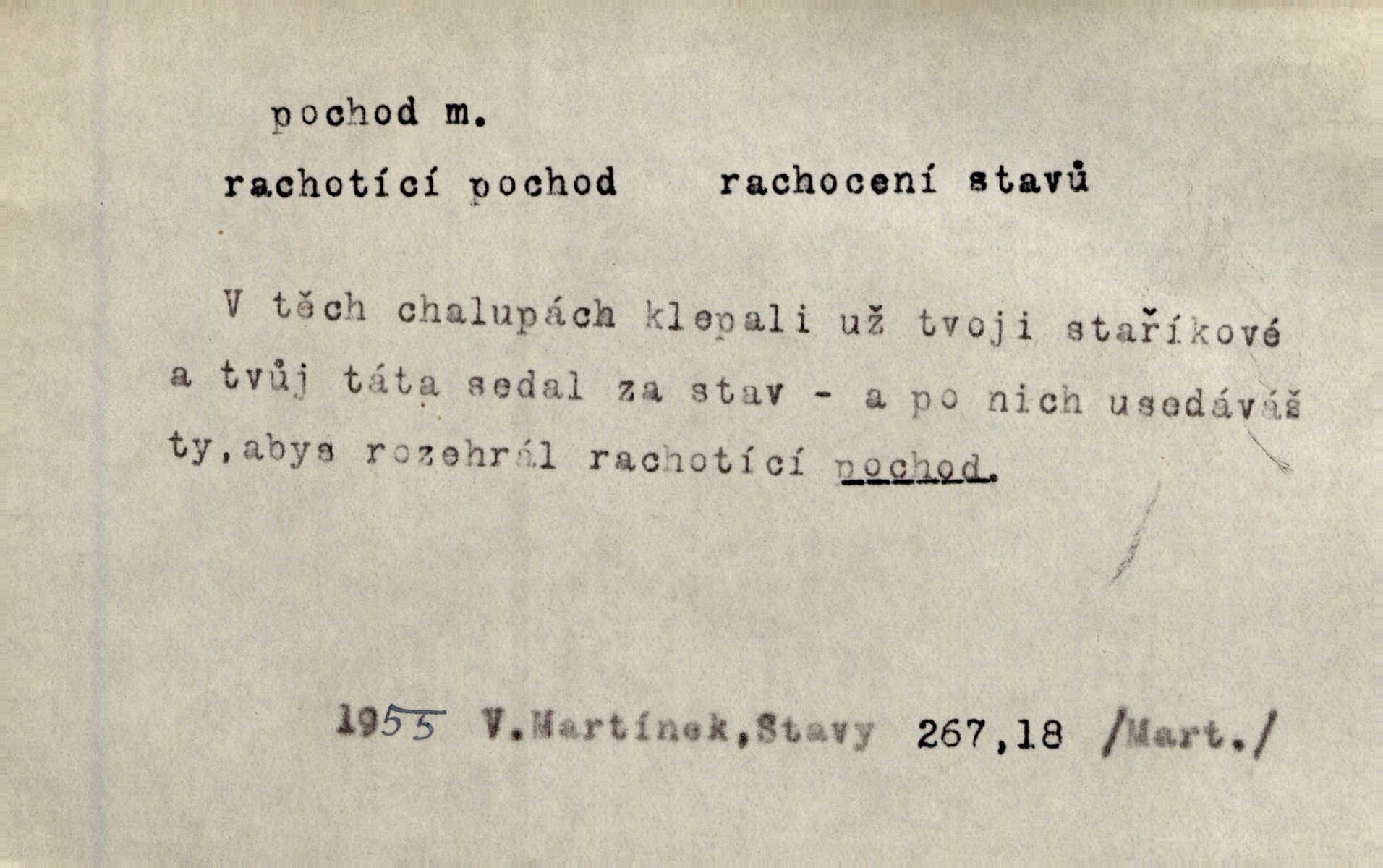- pochod, -u m. chůze, obyč. pravidelná, často na delší vzdálenost a hromadná. Hudebníci dali se v pochod. Jir. Vojsko dalo se v pochod k Hostomicům. Pal. Hned za muzikanty stárci pochodem zamířili k starostovi. A. Mrš. Bylo nutno pomýšleti na zpáteční pochod. Kun. Pochodem husím chodili jsme dvorem od dvanácti do jedné hodiny jeden za druhým. Dyk. Přen. Myšlenka na pochodu se nedá zadržet. Mach. Voj. pozemní přesun, konaný vlastní silou přesunující se jednotky; pochod noční přesun jednotky konaný v noci; pochod úsilný rychlý přesun jednotky. Povel: Pochodem — v chod! Těl. opakování kroků střídavě pravou a levou nohou, chod složený z kroků stejné délky, rychlosti a směru. D lidé, řada lidí konající takovou chůzi. Pro nesmírnou tlačenici lidu kráčel celý pochod jen z povolna. Pal. Táhne mrtvých pochod líný na louce z asfodilů. Vrch. D hudební skladba k takové chůzi hraná. Za chvíli zahrála hudba ryčný pochod. A. Mrš. Naladím harfu a zahraju nejzvučnější pochod. Neč. Hud. pochod slavnostní, vojenský, smuteční. D postup nějakého děje. Tu se ve svém myšlenkovém pochodu zarazil, jako by šlápl do něčeho odporného. Schein. Přírodozpyt pochody duševní považuje za nejvyšší průjev života. Durd. V místech většího nahromadění by voda rozkladnými pochody byla ochuzována o kyslík. A. Dyk. Chem. chemický pochod chemická reakce, chemický proces. Tech. postup prací při výrobě, který je třeba v určitém pořadu vykonati; pochod výrobní, pochod pracovní.
