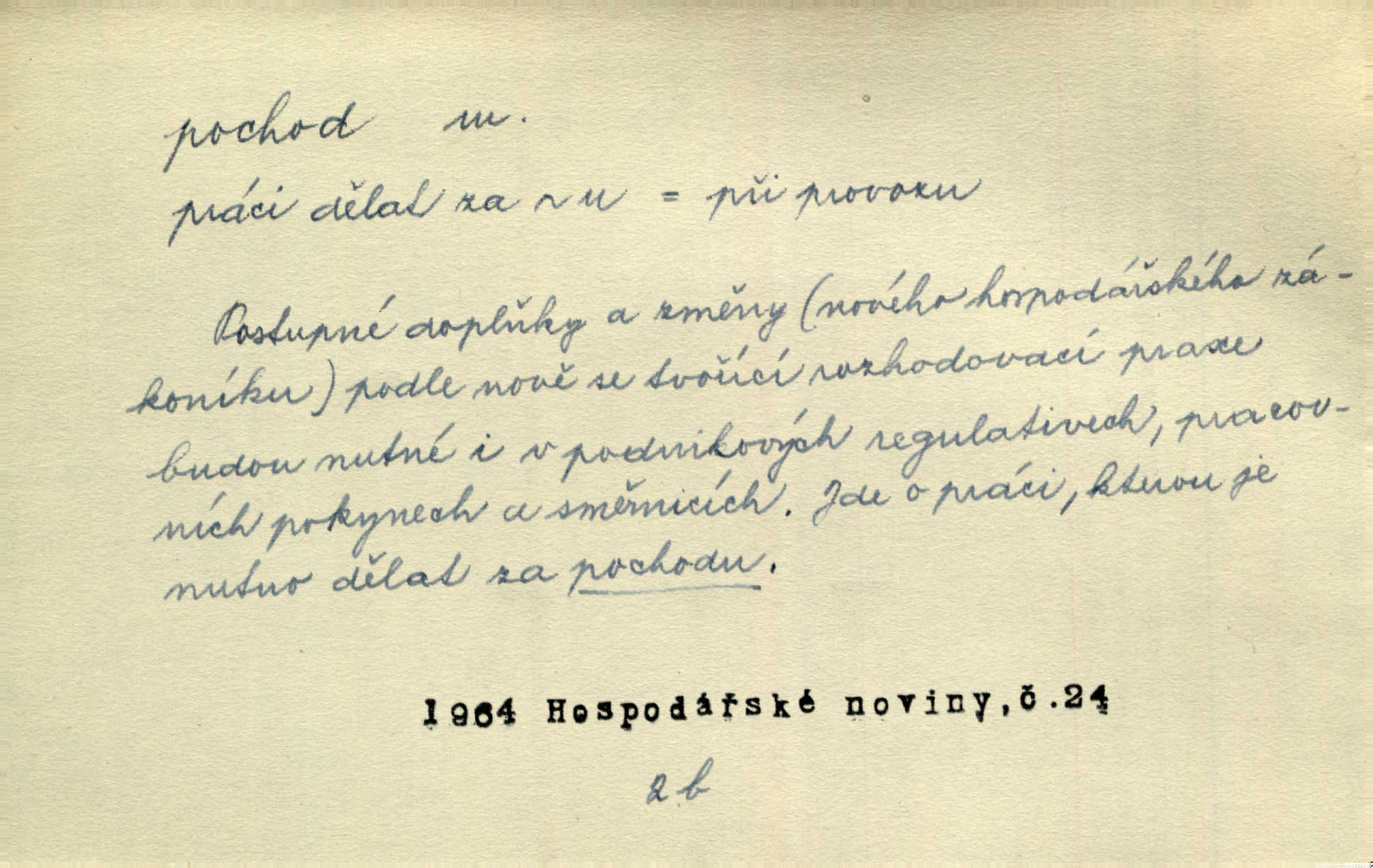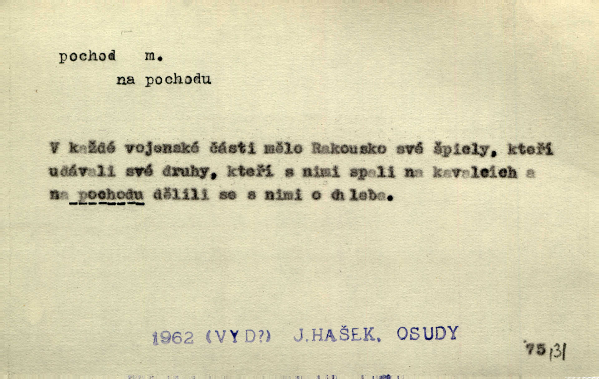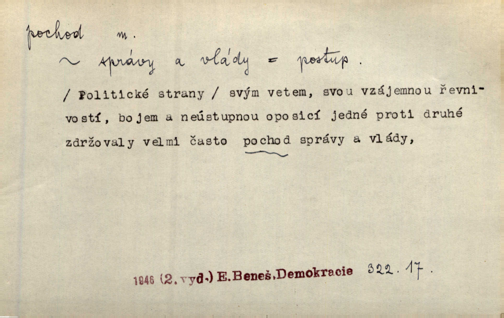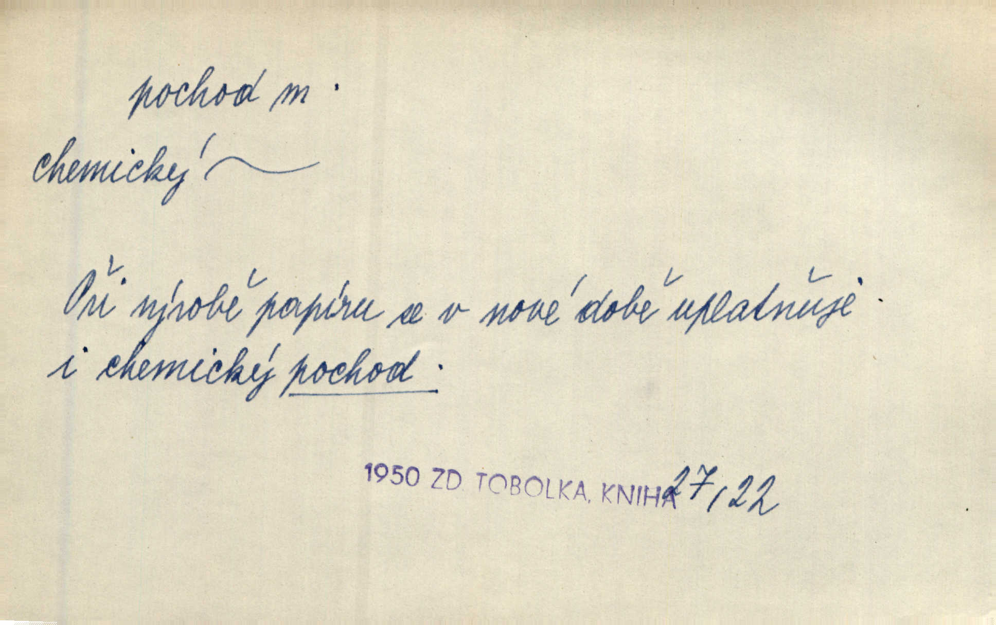 - pochod, -u m. chůze, obyč. pravidelná, často na delší vzdálenost a hromadná. Hudebníci dali se v pochod. Jir. Vojsko dalo se v pochod k Hostomicům. Pal. Hned za muzikanty stárci pochodem zamířili k starostovi. A. Mrš. Bylo nutno pomýšleti na zpáteční pochod. Kun. Pochodem husím chodili jsme dvorem od dvanácti do jedné hodiny jeden za druhým. Dyk. Přen. Myšlenka na pochodu se nedá zadržet. Mach. Voj. pozemní přesun, konaný vlastní silou přesunující se jednotky; pochod noční přesun jednotky konaný v noci; pochod úsilný rychlý přesun jednotky. Povel: Pochodem — v chod! Těl. opakování kroků střídavě pravou a levou nohou, chod složený z kroků stejné délky, rychlosti a směru. D lidé, řada lidí konající takovou chůzi. Pro nesmírnou tlačenici lidu kráčel celý pochod jen z povolna. Pal. Táhne mrtvých pochod líný na louce z asfodilů. Vrch. D hudební skladba k takové chůzi hraná. Za chvíli zahrála hudba ryčný pochod. A. Mrš. Naladím harfu a zahraju nejzvučnější pochod. Neč. Hud. pochod slavnostní, vojenský, smuteční. D postup nějakého děje. Tu se ve svém myšlenkovém pochodu zarazil, jako by šlápl do něčeho odporného. Schein. Přírodozpyt pochody duševní považuje za nejvyšší průjev života. Durd. V místech většího nahromadění by voda rozkladnými pochody byla ochuzována o kyslík. A. Dyk. Chem. chemický pochod chemická reakce, chemický proces. Tech. postup prací při výrobě, který je třeba v určitém pořadu vykonati; pochod výrobní, pochod pracovní.
