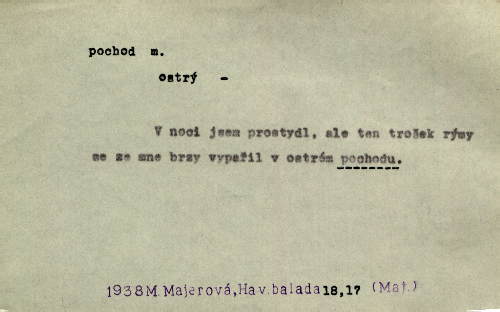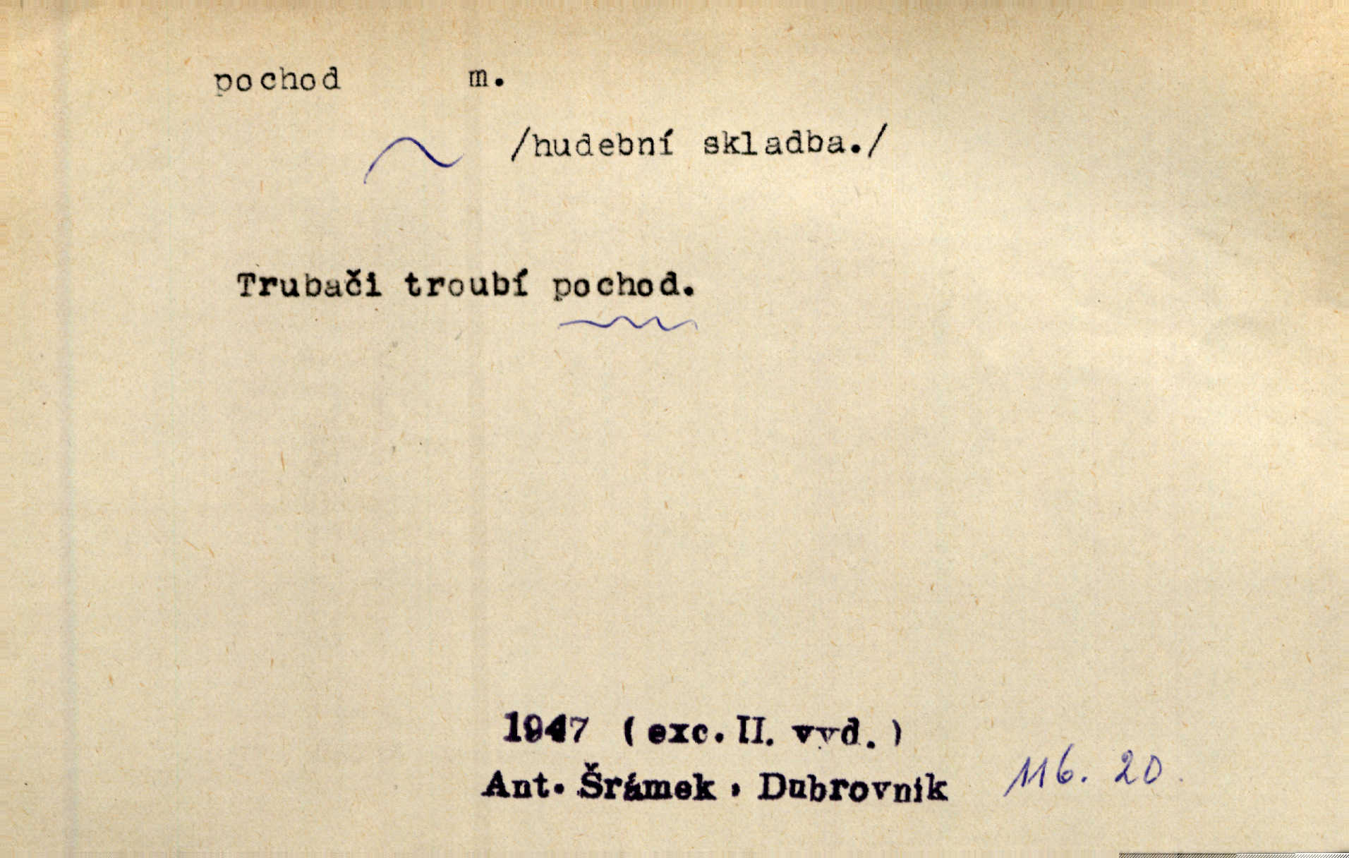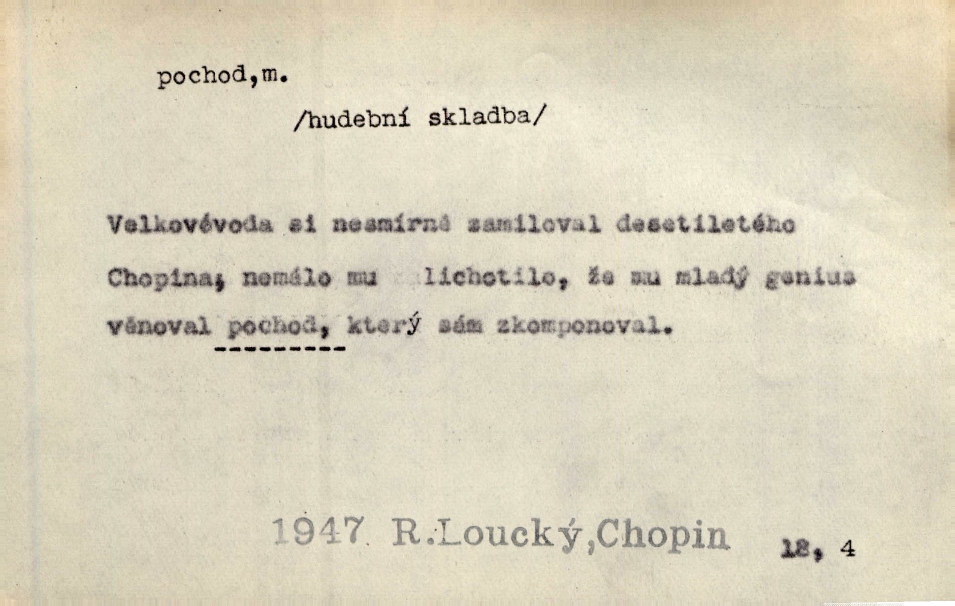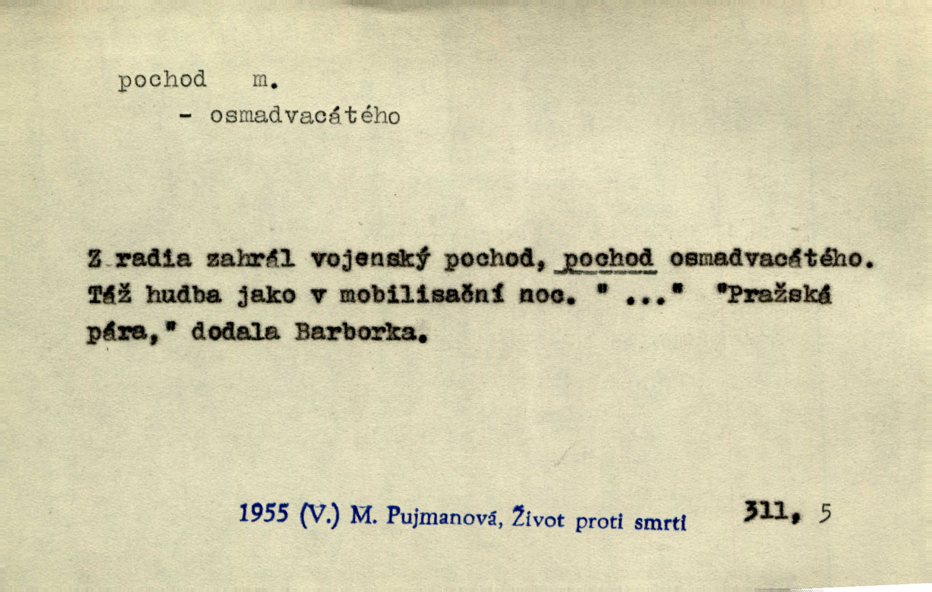 - pochod, -u m. chůze, obyč. pravidelná, často na delší vzdálenost a hromadná. Hudebníci dali se v pochod. Jir. Vojsko dalo se v pochod k Hostomicům. Pal. Hned za muzikanty stárci pochodem zamířili k starostovi. A. Mrš. Bylo nutno pomýšleti na zpáteční pochod. Kun. Pochodem husím chodili jsme dvorem od dvanácti do jedné hodiny jeden za druhým. Dyk. Přen. Myšlenka na pochodu se nedá zadržet. Mach. Voj. pozemní přesun, konaný vlastní silou přesunující se jednotky; pochod noční přesun jednotky konaný v noci; pochod úsilný rychlý přesun jednotky. Povel: Pochodem — v chod! Těl. opakování kroků střídavě pravou a levou nohou, chod složený z kroků stejné délky, rychlosti a směru. D lidé, řada lidí konající takovou chůzi. Pro nesmírnou tlačenici lidu kráčel celý pochod jen z povolna. Pal. Táhne mrtvých pochod líný na louce z asfodilů. Vrch. D hudební skladba k takové chůzi hraná. Za chvíli zahrála hudba ryčný pochod. A. Mrš. Naladím harfu a zahraju nejzvučnější pochod. Neč. Hud. pochod slavnostní, vojenský, smuteční. D postup nějakého děje. Tu se ve svém myšlenkovém pochodu zarazil, jako by šlápl do něčeho odporného. Schein. Přírodozpyt pochody duševní považuje za nejvyšší průjev života. Durd. V místech většího nahromadění by voda rozkladnými pochody byla ochuzována o kyslík. A. Dyk. Chem. chemický pochod chemická reakce, chemický proces. Tech. postup prací při výrobě, který je třeba v určitém pořadu vykonati; pochod výrobní, pochod pracovní.
