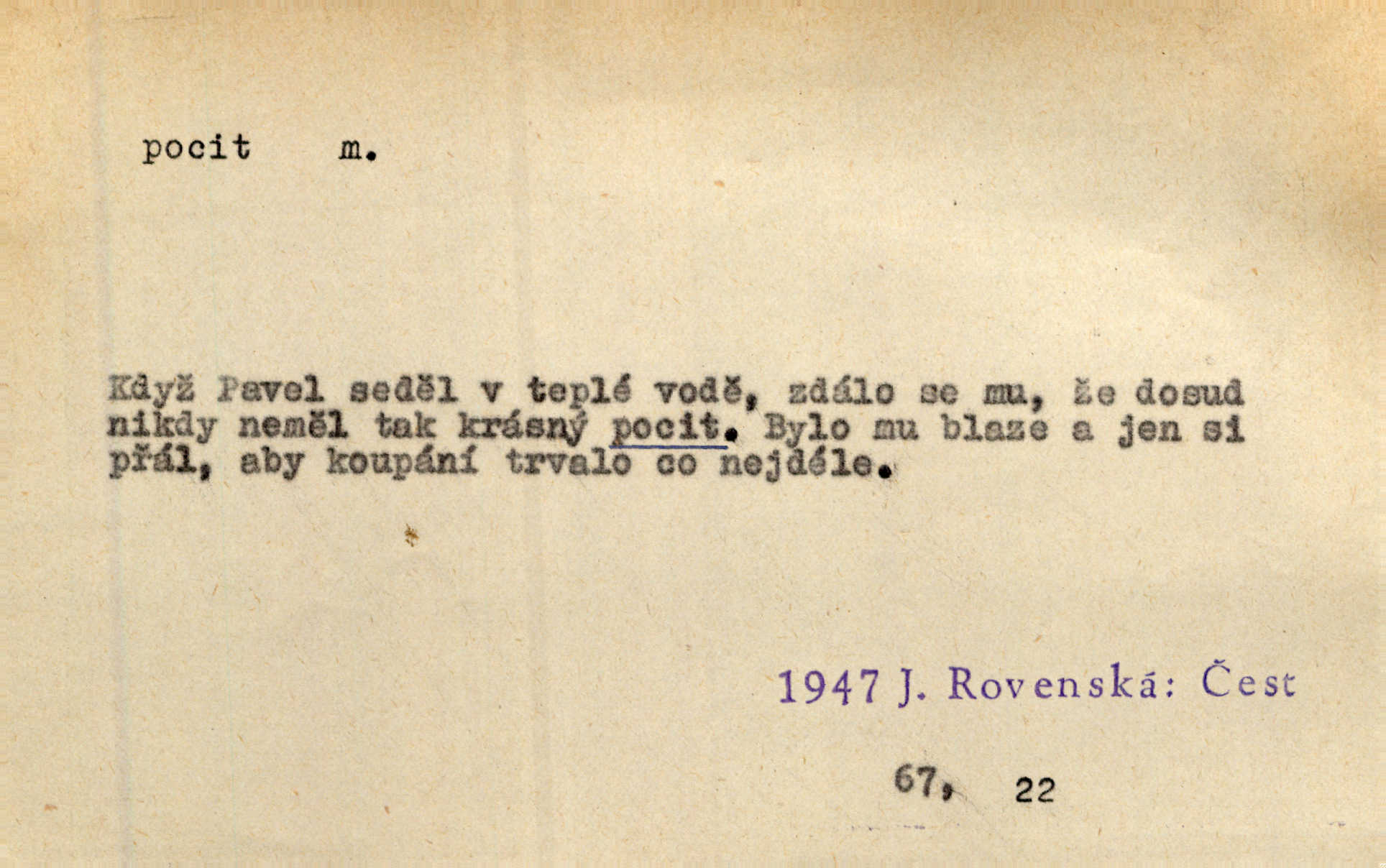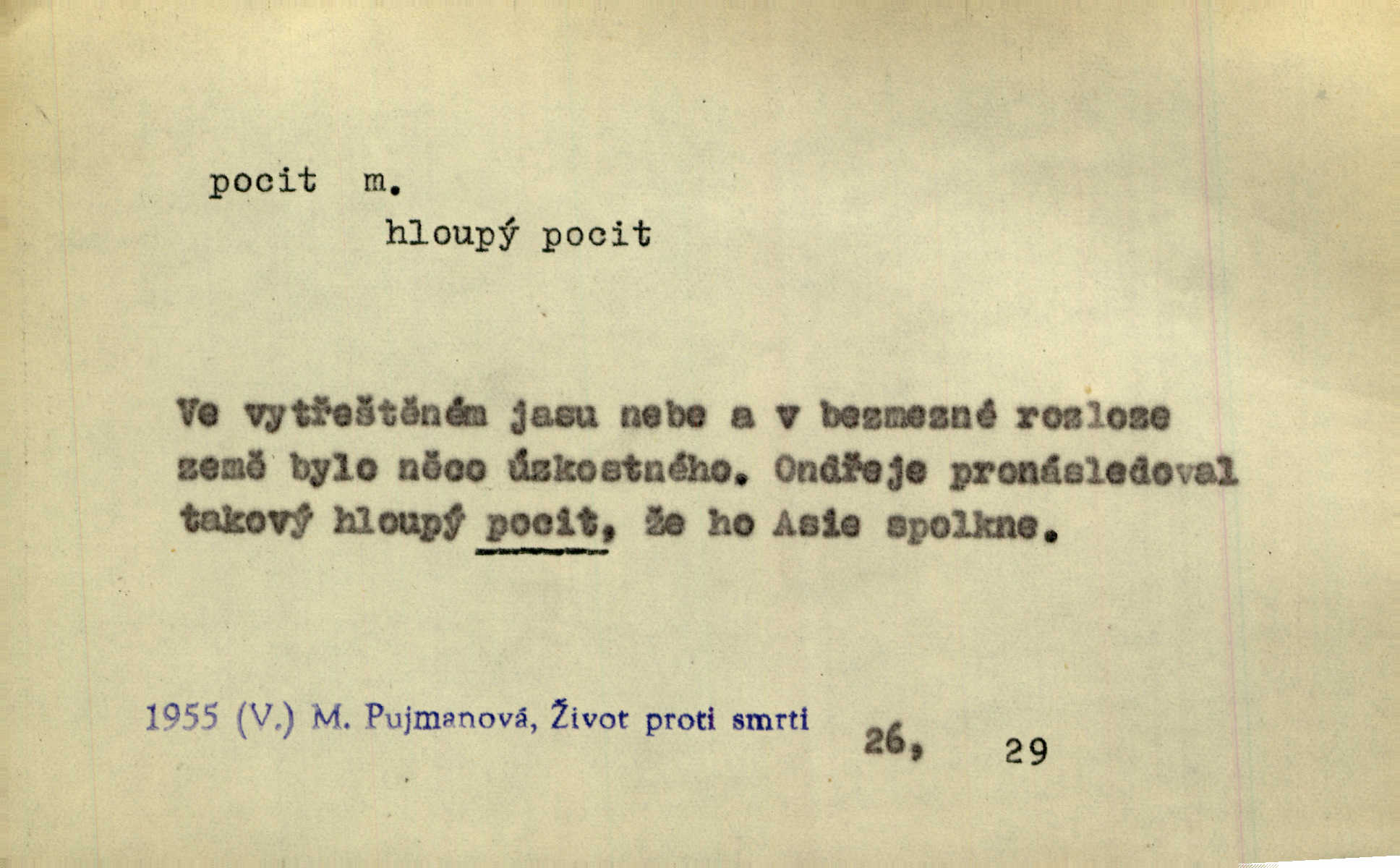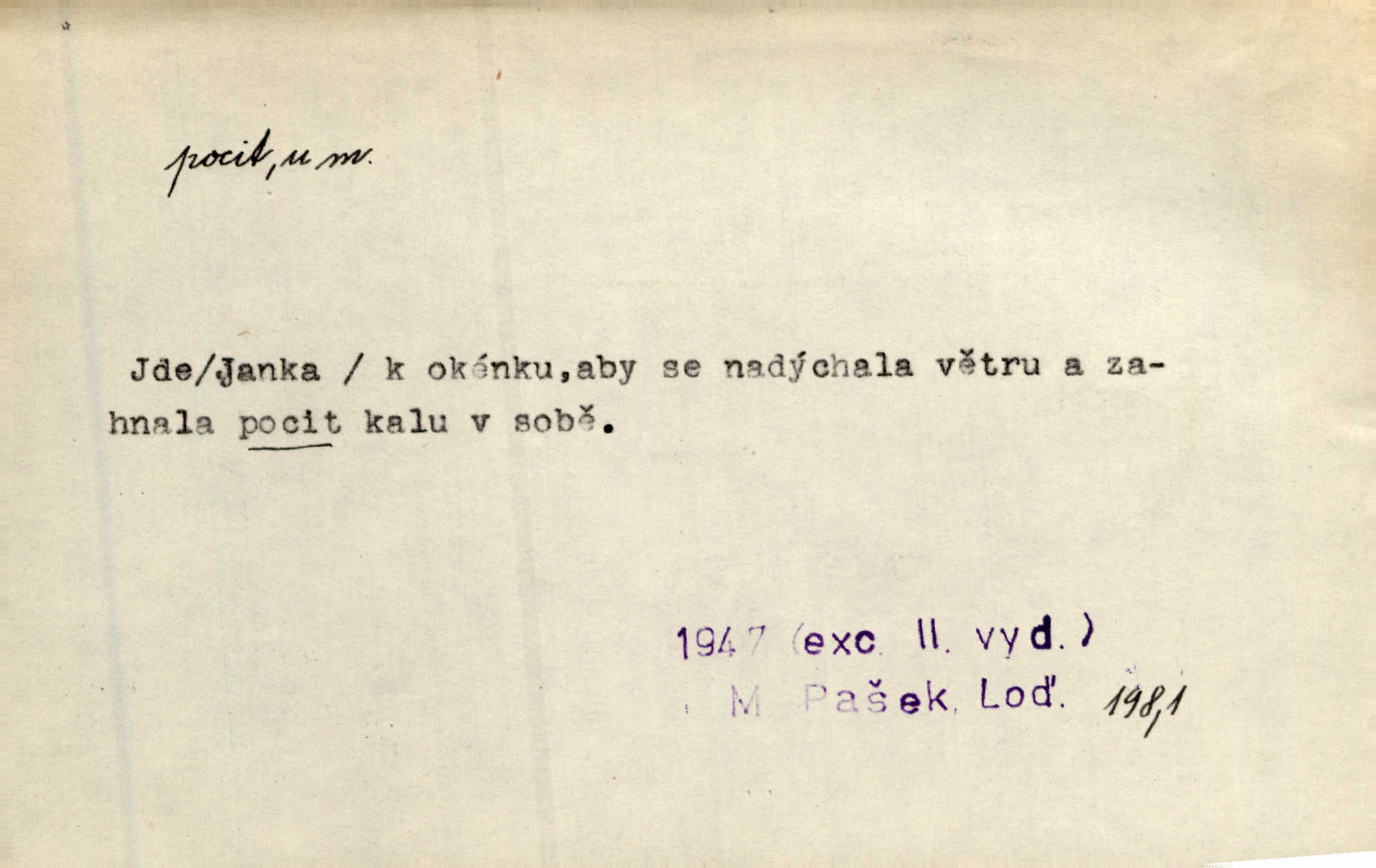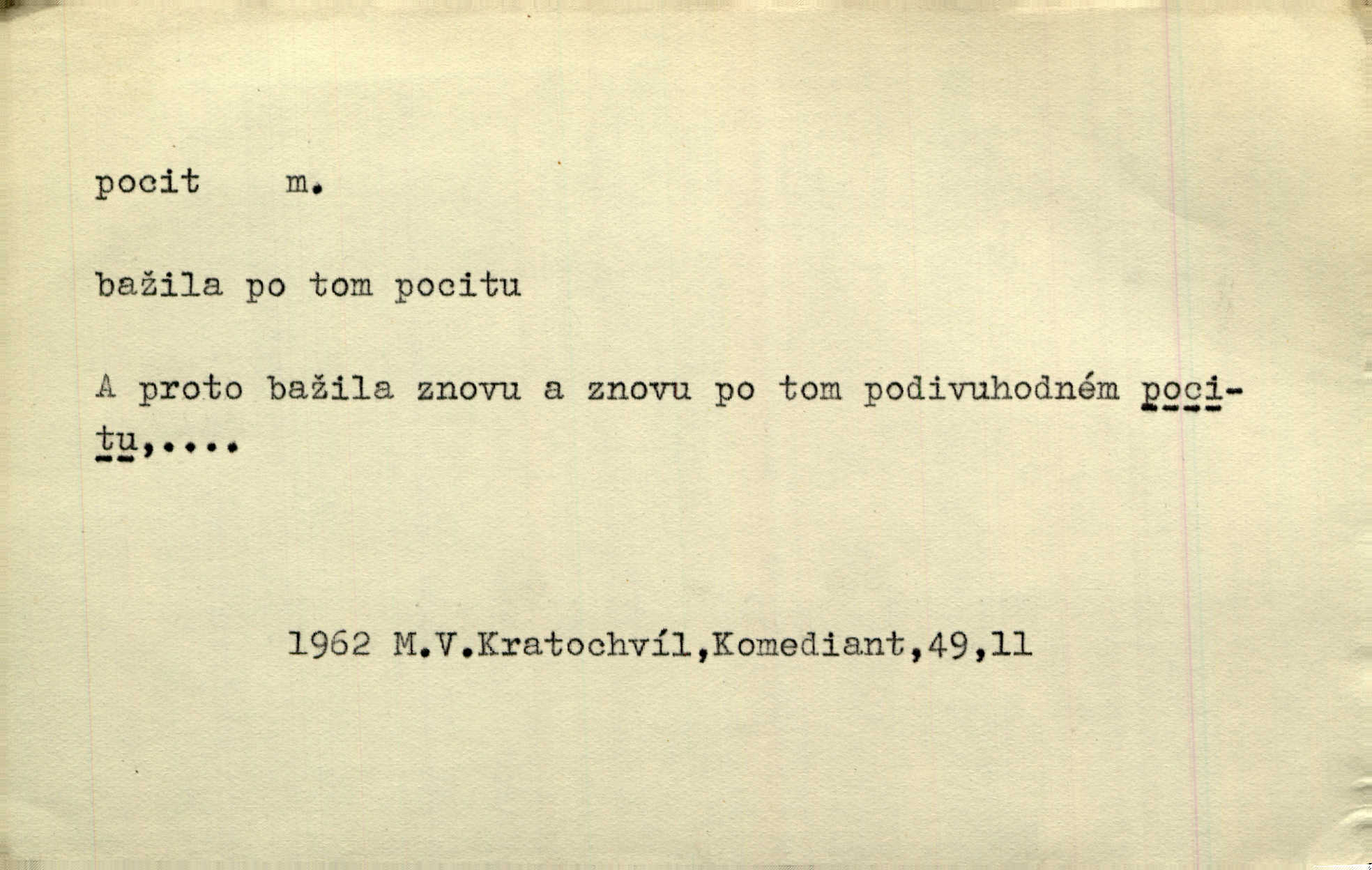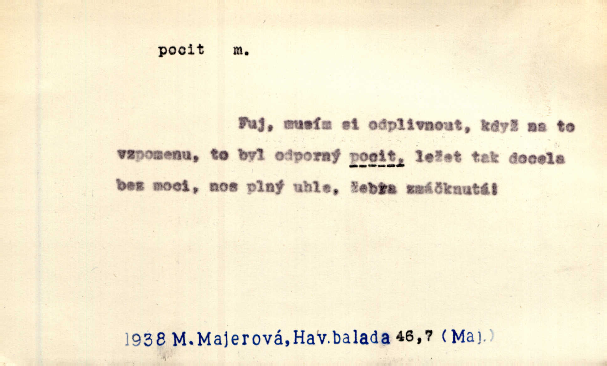 - pocit, -u m. citový zážitek něčeho příjemného n. nepříjemného. Pocit rozkoše projel mu celým tělem. Just. Libý pocit provanul ustrašenou duší její. Šmil. Ramena se zachvěla pocitem ošklivosti, jak se ho kat dotekl. Jir. Pocit nevolnosti, strachu naplňoval ho celého. Baar. Chuťové pocity lze rozdělit do čtyř základních kvalit: kysela, slana, sladka a hořka. Hovory. Měl pocit, jakoby ho dravá šelma držela v špinavé tlamě. Baar. D vědomí, uvědomění, ujasnění něčeho. Vymřel v nás pocit zodpovědnosti docela? Mach. Bylo mu úzko v tom pocitu vystřízlivění. Zey. V dnešní normální duši národní pocit převažuje nad pocitem přináležitosti k rodné vsi. Naše d. D cit. Nejvznešenější všech pocitů jest láska mateřská. Hál. Zápasily ve mně dva pocity: zvědavost a jistý odstín povinnosti. Šim. Pocit vzdoru zakmitl jí duší. Vach.