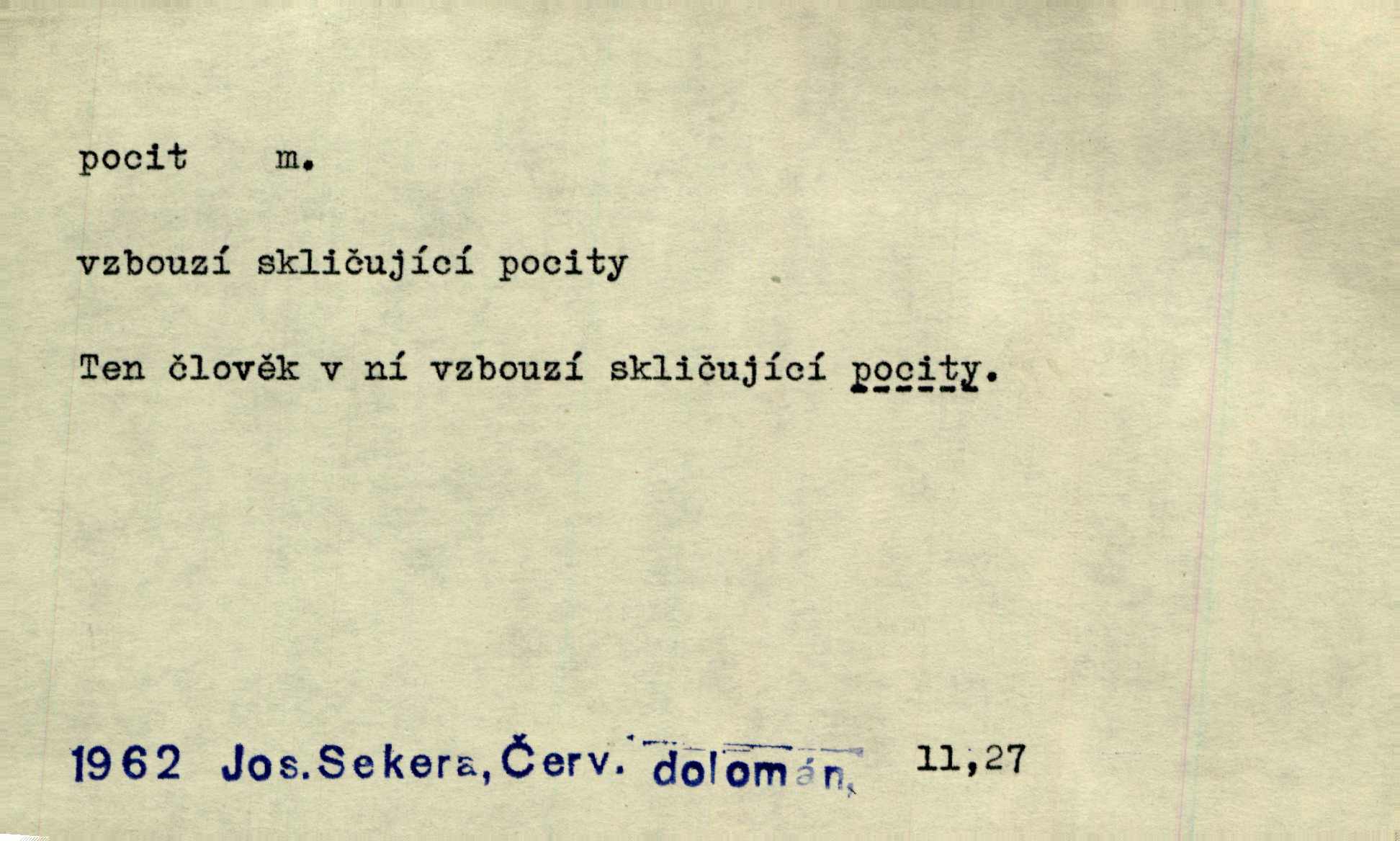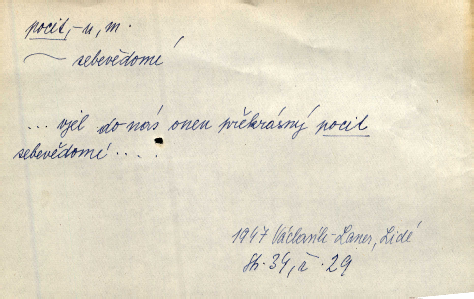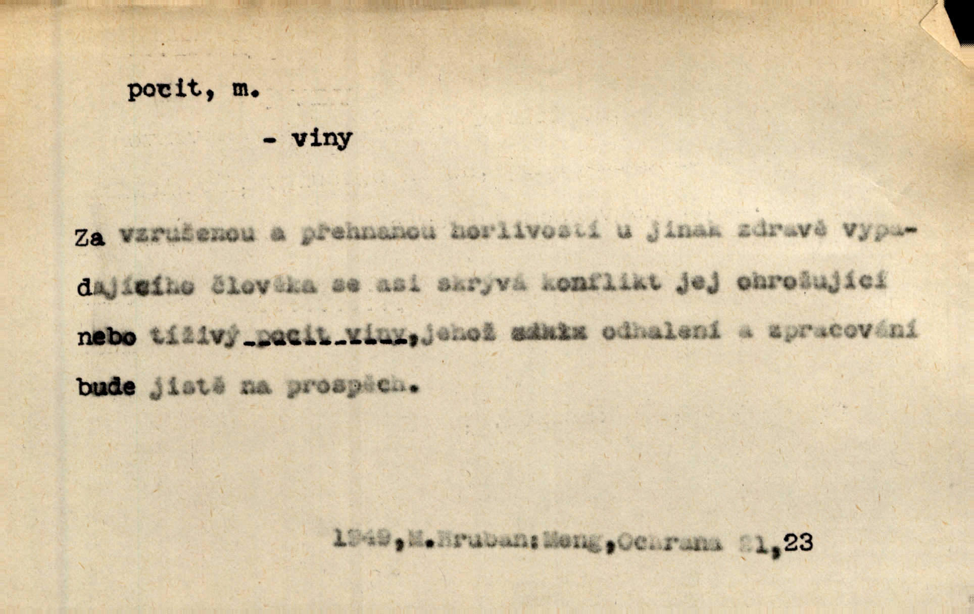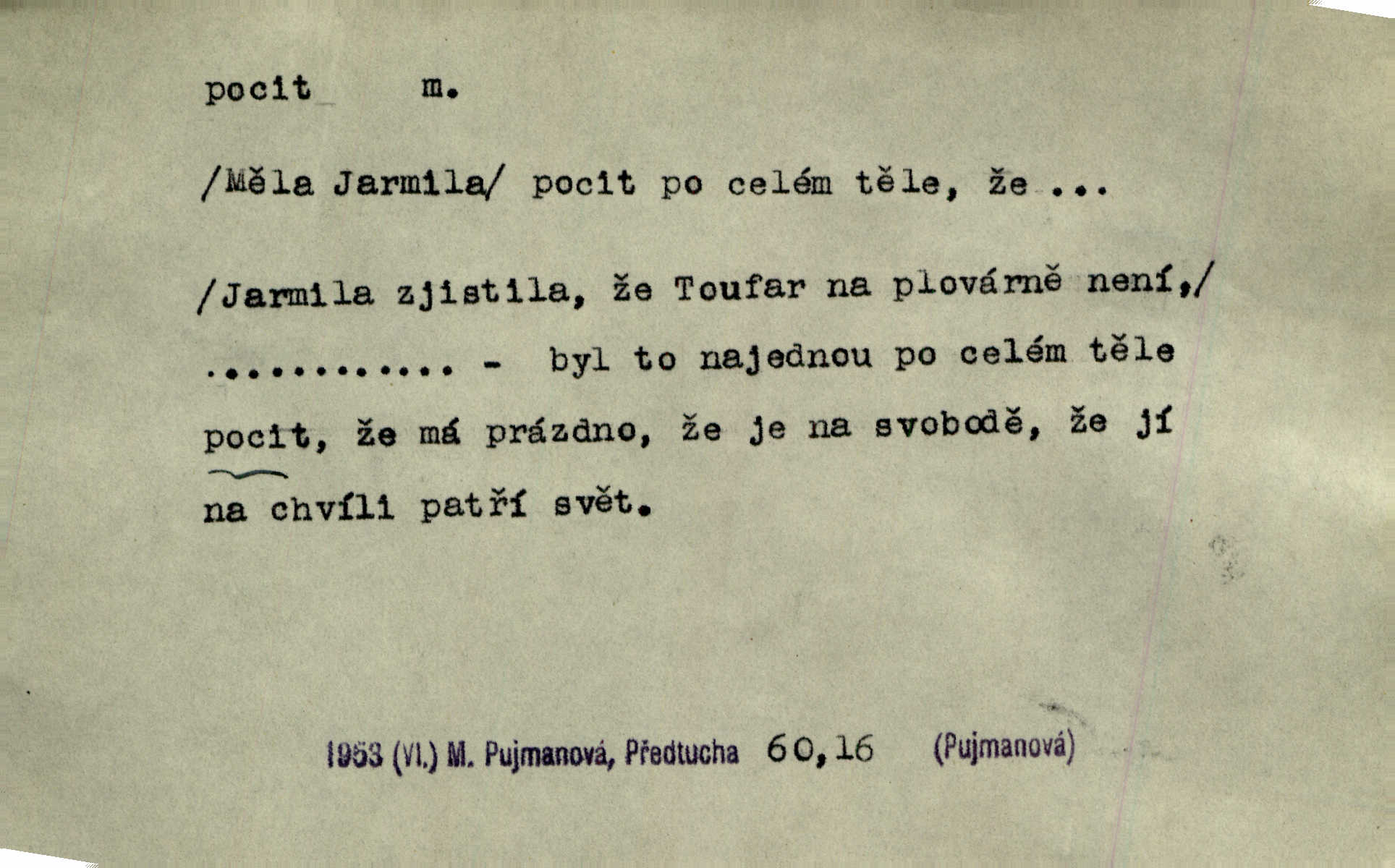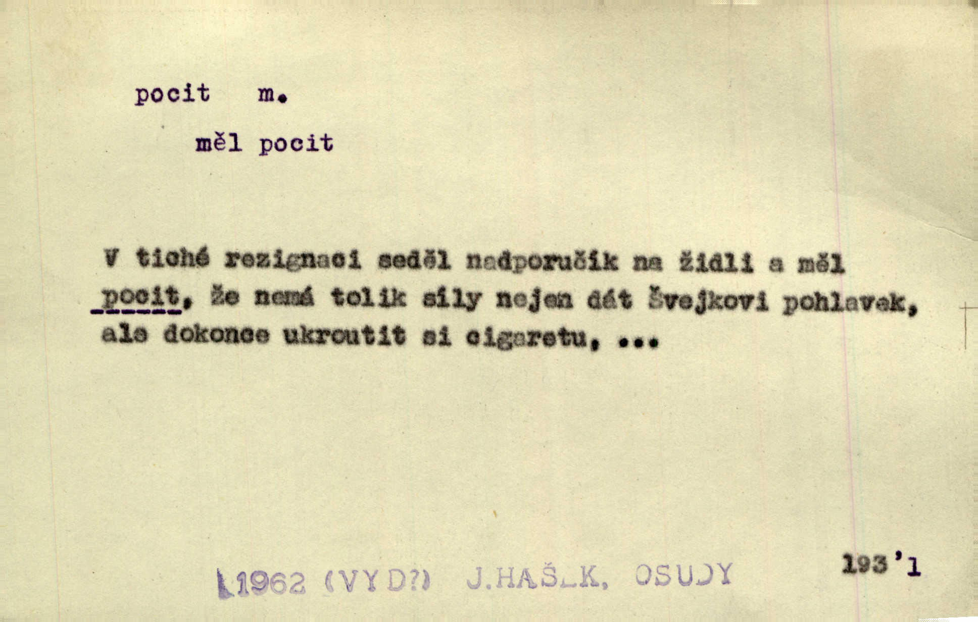 - pocit, -u m. citový zážitek něčeho příjemného n. nepříjemného. Pocit rozkoše projel mu celým tělem. Just. Libý pocit provanul ustrašenou duší její. Šmil. Ramena se zachvěla pocitem ošklivosti, jak se ho kat dotekl. Jir. Pocit nevolnosti, strachu naplňoval ho celého. Baar. Chuťové pocity lze rozdělit do čtyř základních kvalit: kysela, slana, sladka a hořka. Hovory. Měl pocit, jakoby ho dravá šelma držela v špinavé tlamě. Baar. D vědomí, uvědomění, ujasnění něčeho. Vymřel v nás pocit zodpovědnosti docela? Mach. Bylo mu úzko v tom pocitu vystřízlivění. Zey. V dnešní normální duši národní pocit převažuje nad pocitem přináležitosti k rodné vsi. Naše d. D cit. Nejvznešenější všech pocitů jest láska mateřská. Hál. Zápasily ve mně dva pocity: zvědavost a jistý odstín povinnosti. Šim. Pocit vzdoru zakmitl jí duší. Vach.