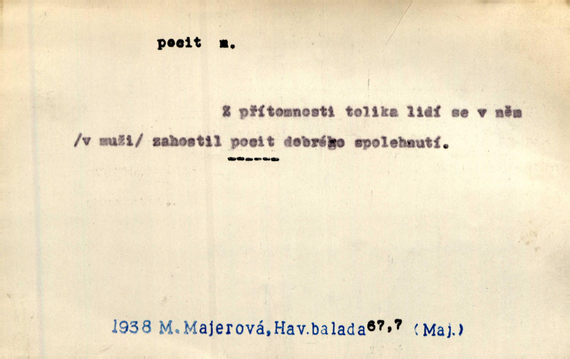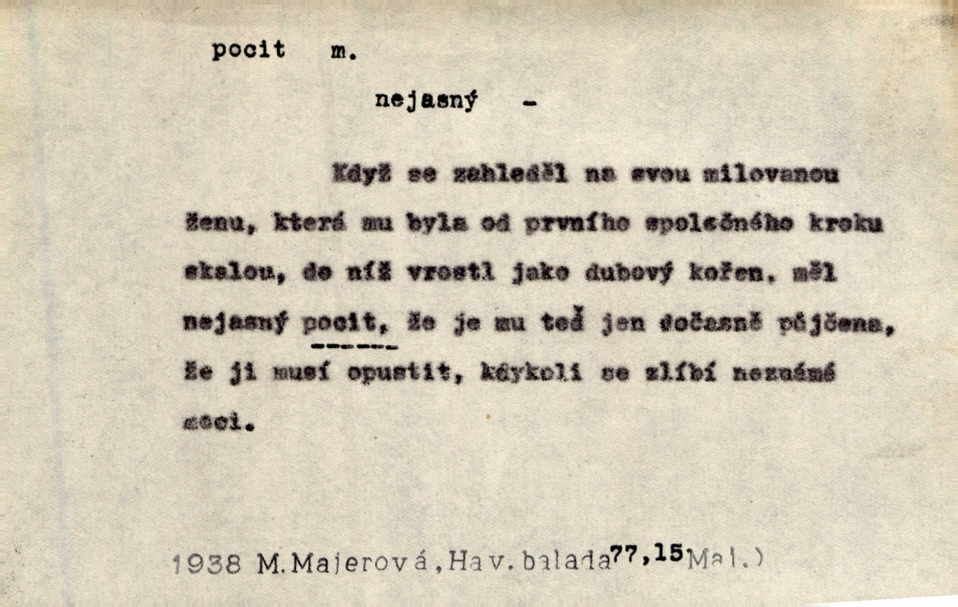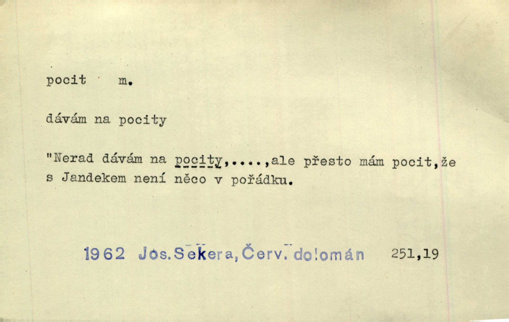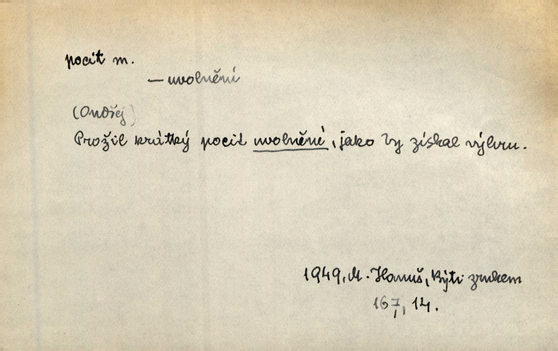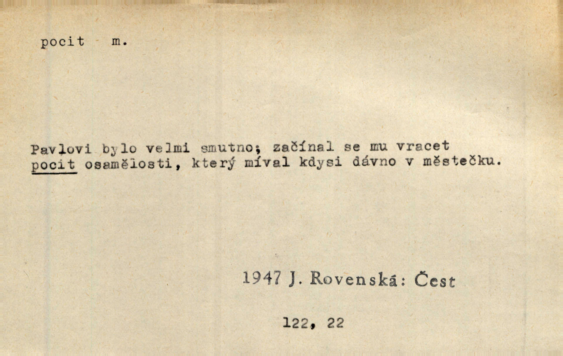 - pocit, -u m. citový zážitek něčeho příjemného n. nepříjemného. Pocit rozkoše projel mu celým tělem. Just. Libý pocit provanul ustrašenou duší její. Šmil. Ramena se zachvěla pocitem ošklivosti, jak se ho kat dotekl. Jir. Pocit nevolnosti, strachu naplňoval ho celého. Baar. Chuťové pocity lze rozdělit do čtyř základních kvalit: kysela, slana, sladka a hořka. Hovory. Měl pocit, jakoby ho dravá šelma držela v špinavé tlamě. Baar. D vědomí, uvědomění, ujasnění něčeho. Vymřel v nás pocit zodpovědnosti docela? Mach. Bylo mu úzko v tom pocitu vystřízlivění. Zey. V dnešní normální duši národní pocit převažuje nad pocitem přináležitosti k rodné vsi. Naše d. D cit. Nejvznešenější všech pocitů jest láska mateřská. Hál. Zápasily ve mně dva pocity: zvědavost a jistý odstín povinnosti. Šim. Pocit vzdoru zakmitl jí duší. Vach.