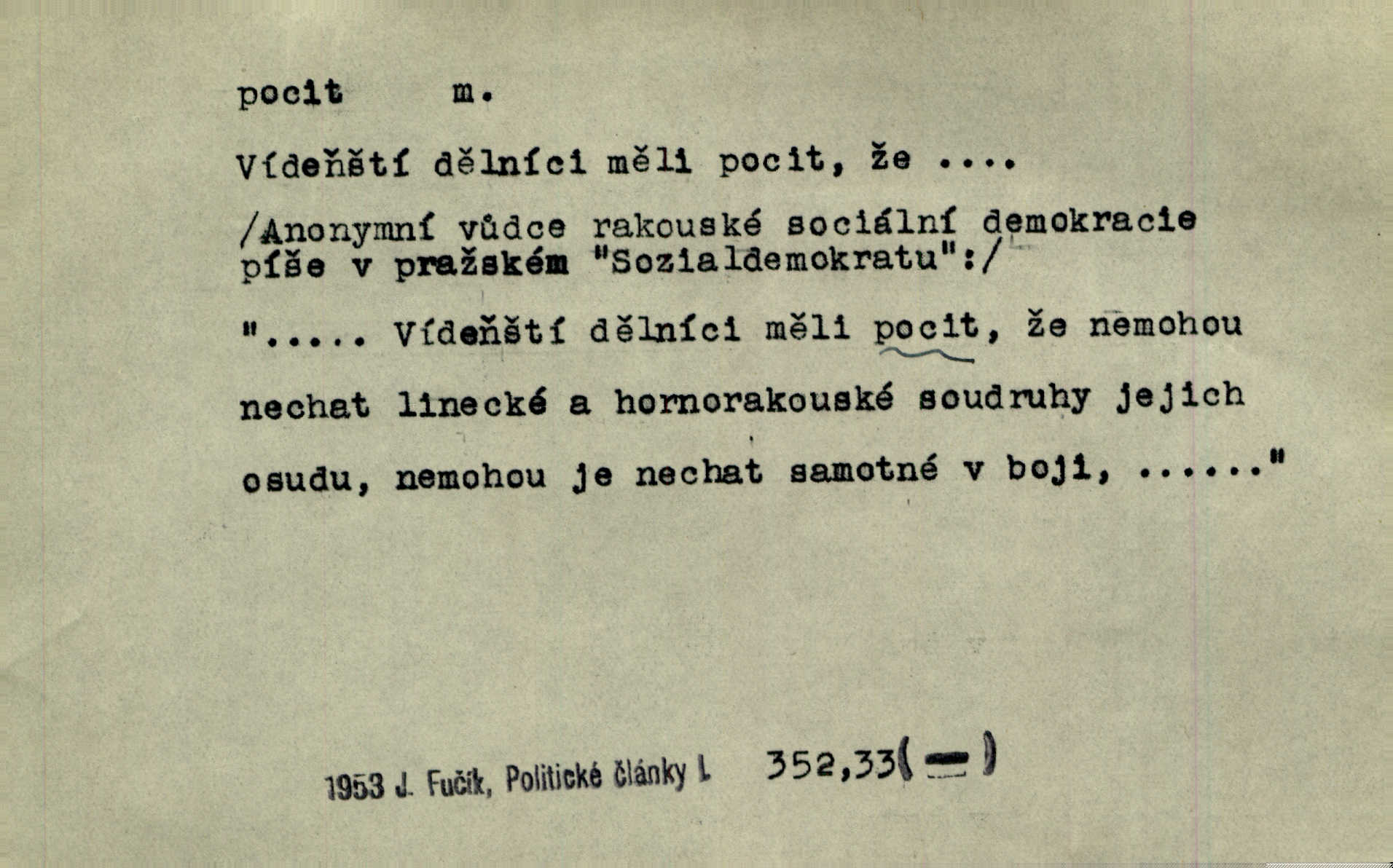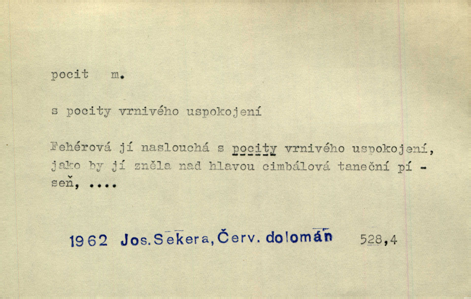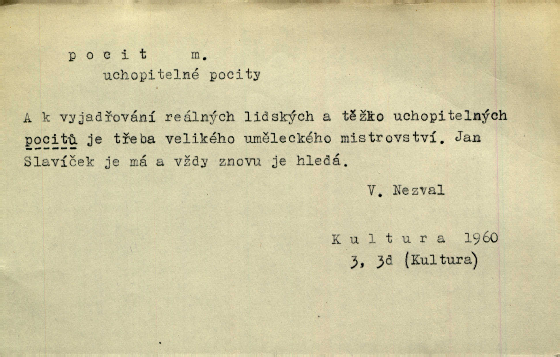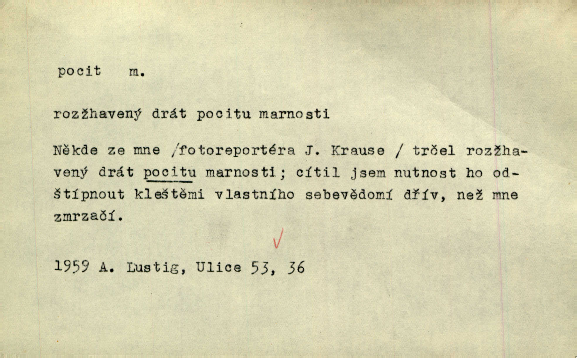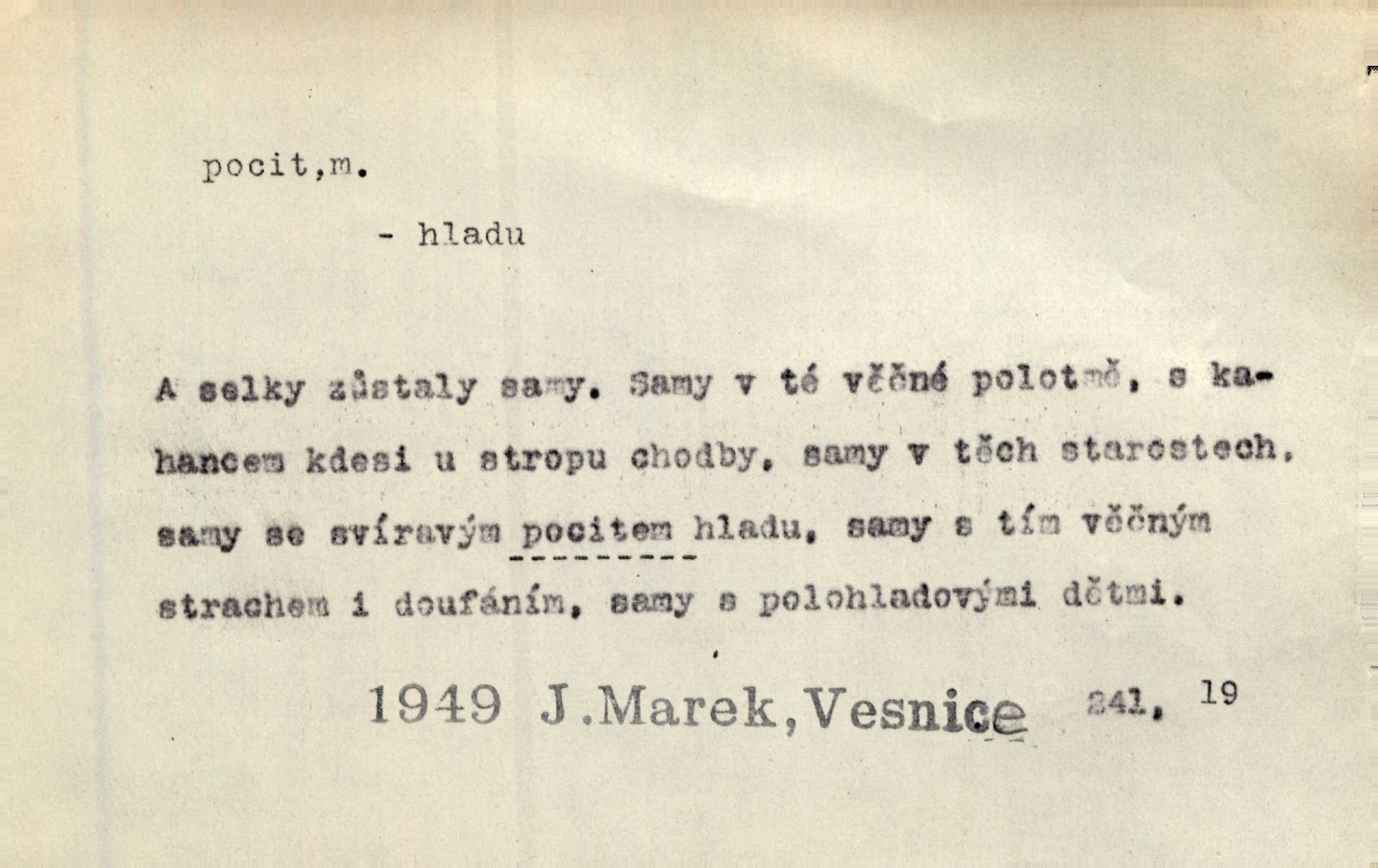 - pocit, -u m. citový zážitek něčeho příjemného n. nepříjemného. Pocit rozkoše projel mu celým tělem. Just. Libý pocit provanul ustrašenou duší její. Šmil. Ramena se zachvěla pocitem ošklivosti, jak se ho kat dotekl. Jir. Pocit nevolnosti, strachu naplňoval ho celého. Baar. Chuťové pocity lze rozdělit do čtyř základních kvalit: kysela, slana, sladka a hořka. Hovory. Měl pocit, jakoby ho dravá šelma držela v špinavé tlamě. Baar. D vědomí, uvědomění, ujasnění něčeho. Vymřel v nás pocit zodpovědnosti docela? Mach. Bylo mu úzko v tom pocitu vystřízlivění. Zey. V dnešní normální duši národní pocit převažuje nad pocitem přináležitosti k rodné vsi. Naše d. D cit. Nejvznešenější všech pocitů jest láska mateřská. Hál. Zápasily ve mně dva pocity: zvědavost a jistý odstín povinnosti. Šim. Pocit vzdoru zakmitl jí duší. Vach.