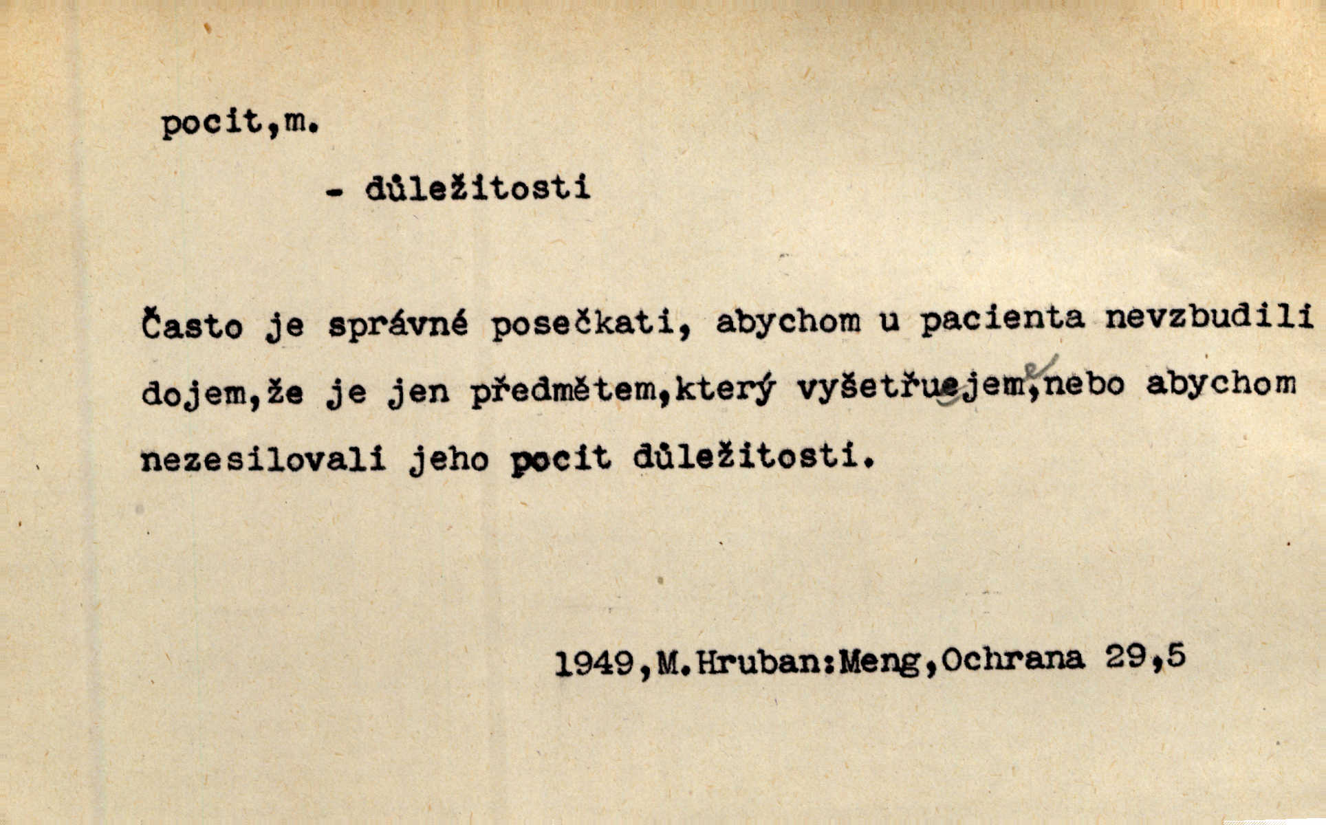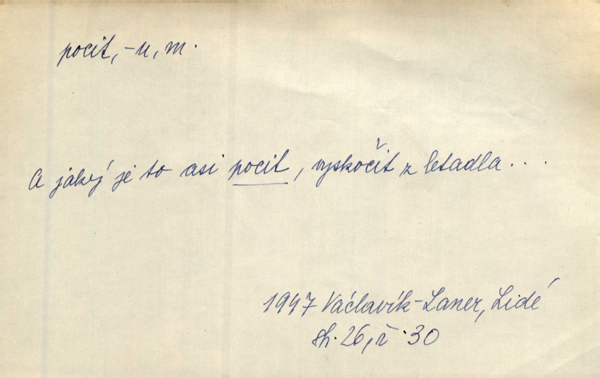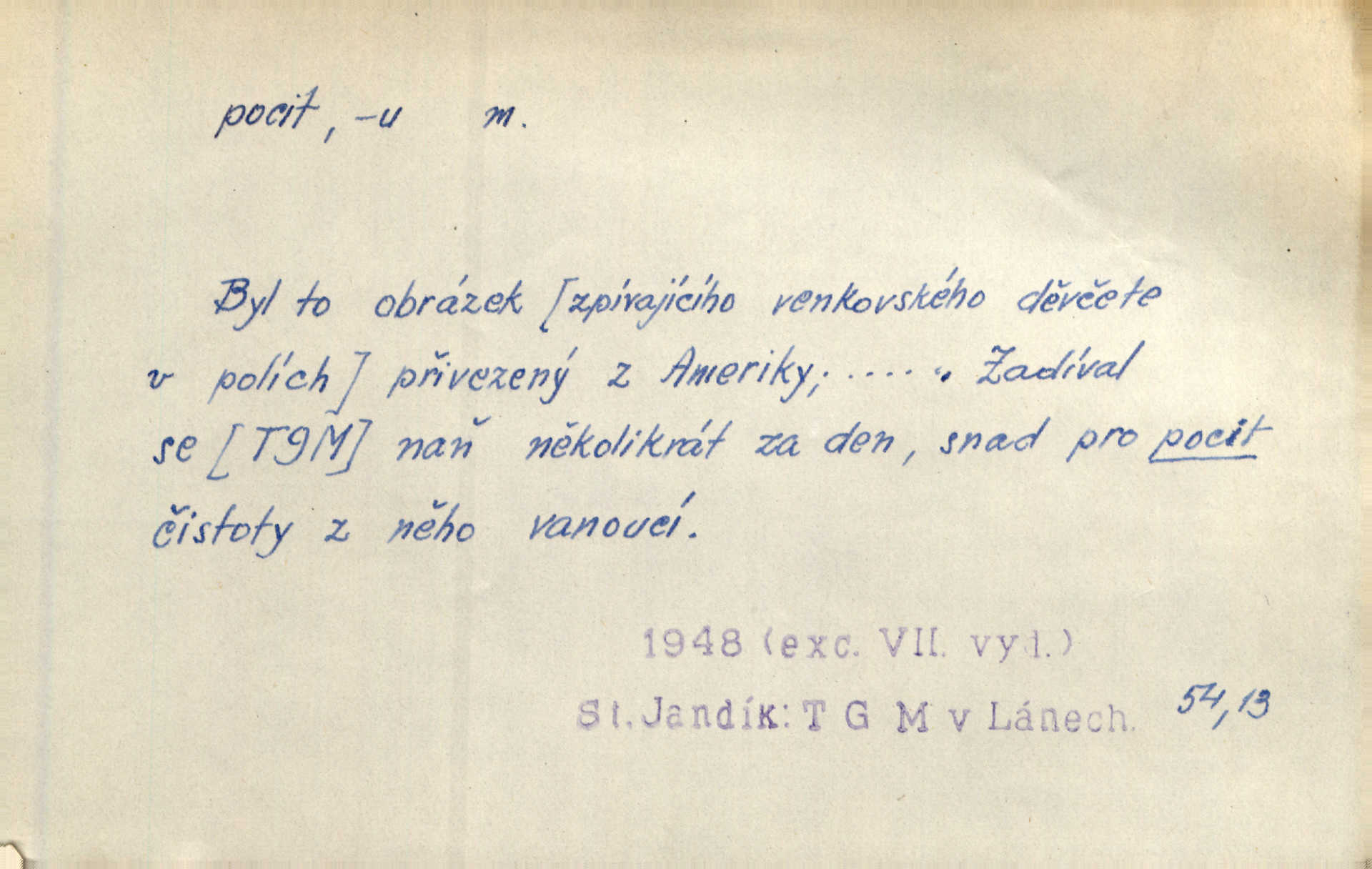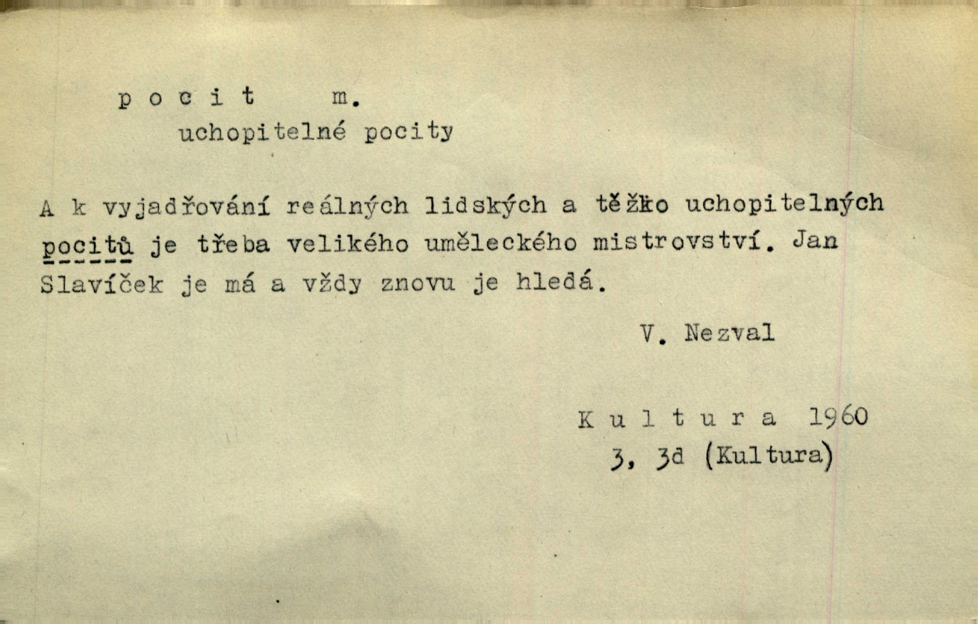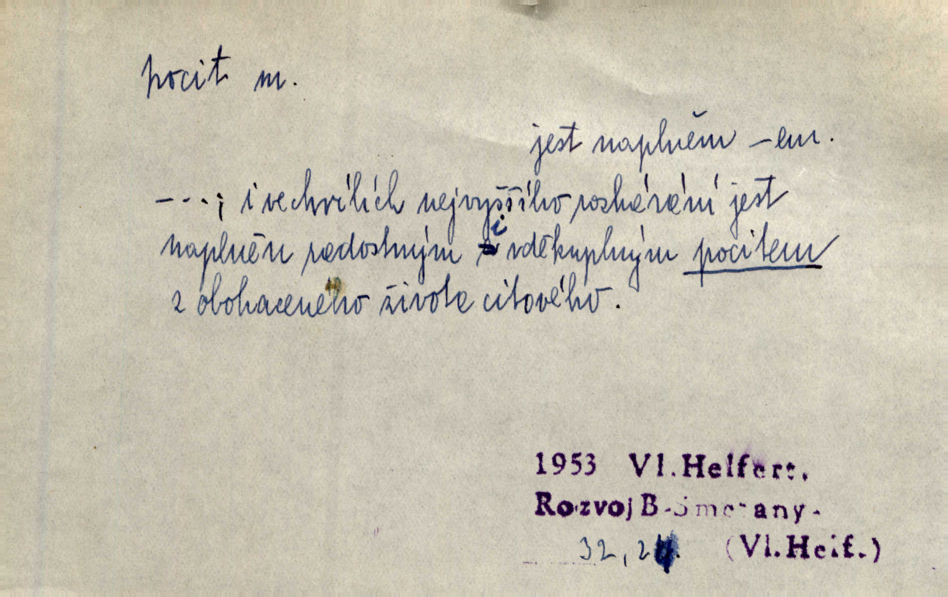 - pocit, -u m. citový zážitek něčeho příjemného n. nepříjemného. Pocit rozkoše projel mu celým tělem. Just. Libý pocit provanul ustrašenou duší její. Šmil. Ramena se zachvěla pocitem ošklivosti, jak se ho kat dotekl. Jir. Pocit nevolnosti, strachu naplňoval ho celého. Baar. Chuťové pocity lze rozdělit do čtyř základních kvalit: kysela, slana, sladka a hořka. Hovory. Měl pocit, jakoby ho dravá šelma držela v špinavé tlamě. Baar. D vědomí, uvědomění, ujasnění něčeho. Vymřel v nás pocit zodpovědnosti docela? Mach. Bylo mu úzko v tom pocitu vystřízlivění. Zey. V dnešní normální duši národní pocit převažuje nad pocitem přináležitosti k rodné vsi. Naše d. D cit. Nejvznešenější všech pocitů jest láska mateřská. Hál. Zápasily ve mně dva pocity: zvědavost a jistý odstín povinnosti. Šim. Pocit vzdoru zakmitl jí duší. Vach.