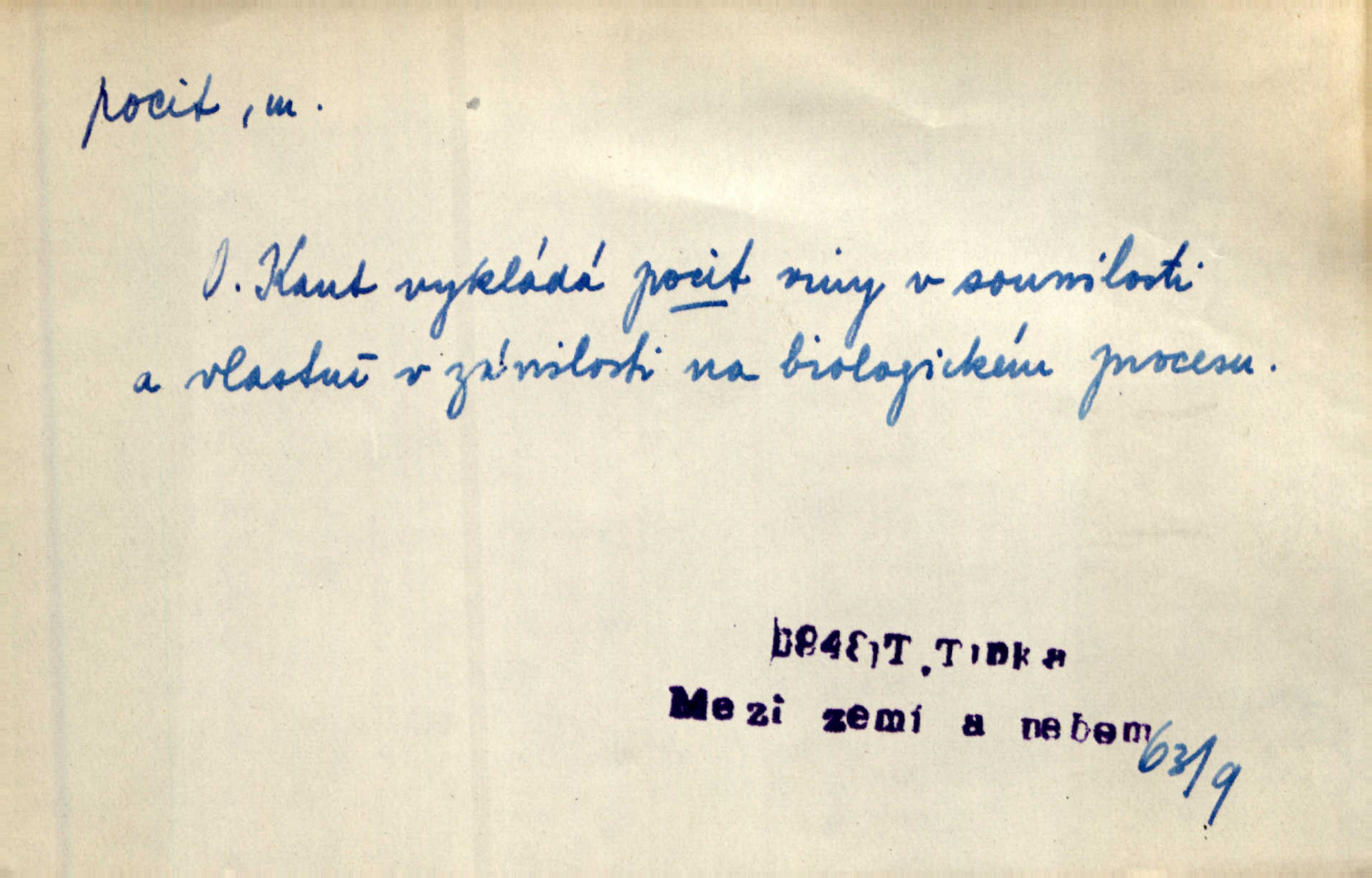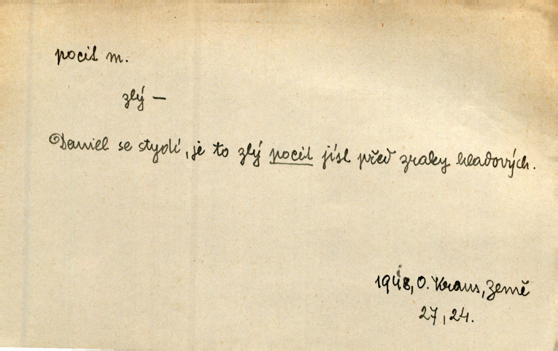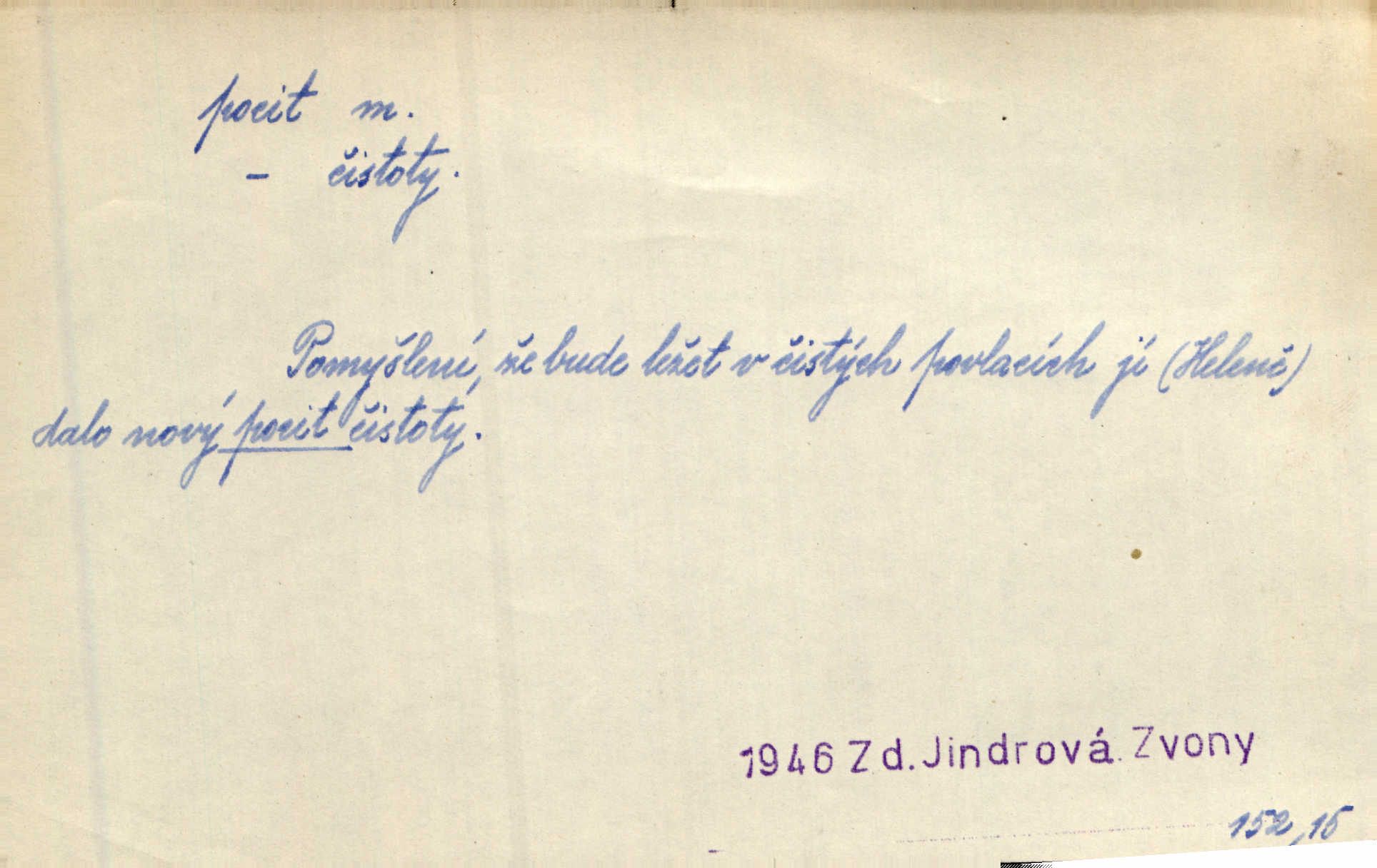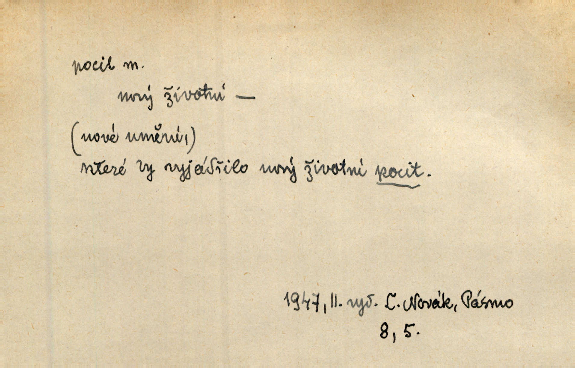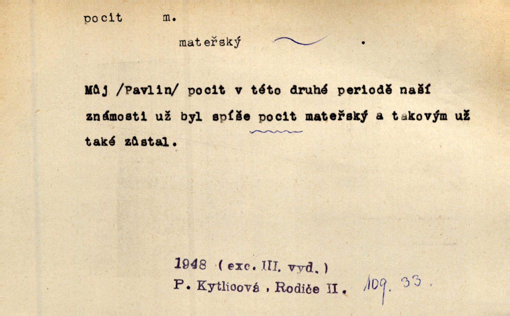 - pocit, -u m. citový zážitek něčeho příjemného n. nepříjemného. Pocit rozkoše projel mu celým tělem. Just. Libý pocit provanul ustrašenou duší její. Šmil. Ramena se zachvěla pocitem ošklivosti, jak se ho kat dotekl. Jir. Pocit nevolnosti, strachu naplňoval ho celého. Baar. Chuťové pocity lze rozdělit do čtyř základních kvalit: kysela, slana, sladka a hořka. Hovory. Měl pocit, jakoby ho dravá šelma držela v špinavé tlamě. Baar. D vědomí, uvědomění, ujasnění něčeho. Vymřel v nás pocit zodpovědnosti docela? Mach. Bylo mu úzko v tom pocitu vystřízlivění. Zey. V dnešní normální duši národní pocit převažuje nad pocitem přináležitosti k rodné vsi. Naše d. D cit. Nejvznešenější všech pocitů jest láska mateřská. Hál. Zápasily ve mně dva pocity: zvědavost a jistý odstín povinnosti. Šim. Pocit vzdoru zakmitl jí duší. Vach.