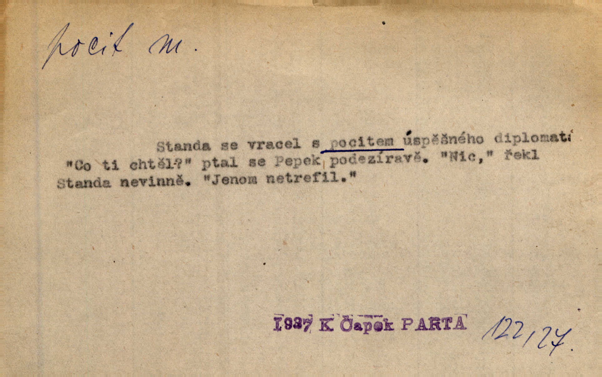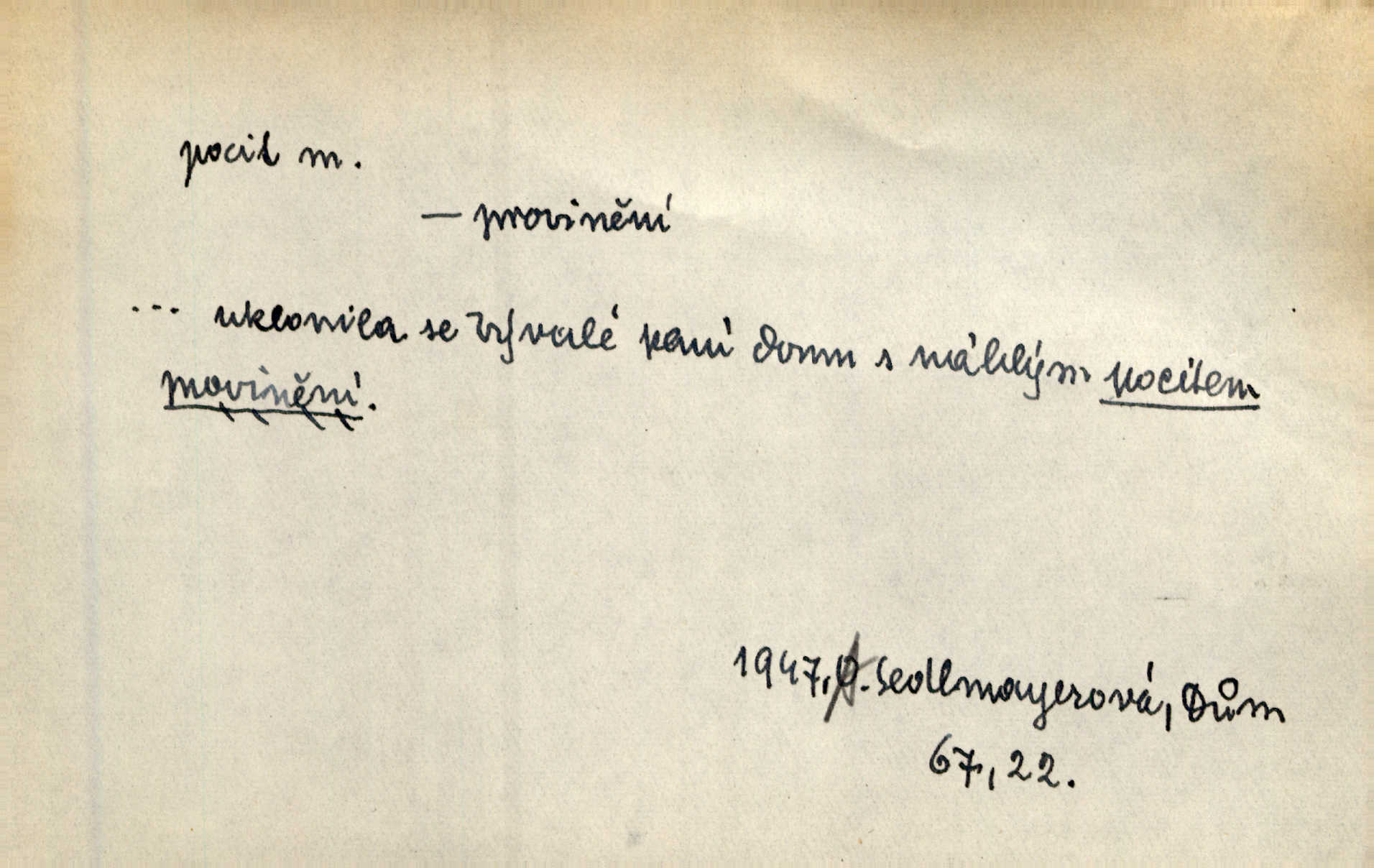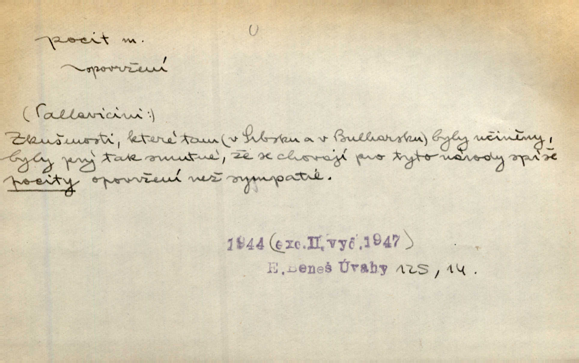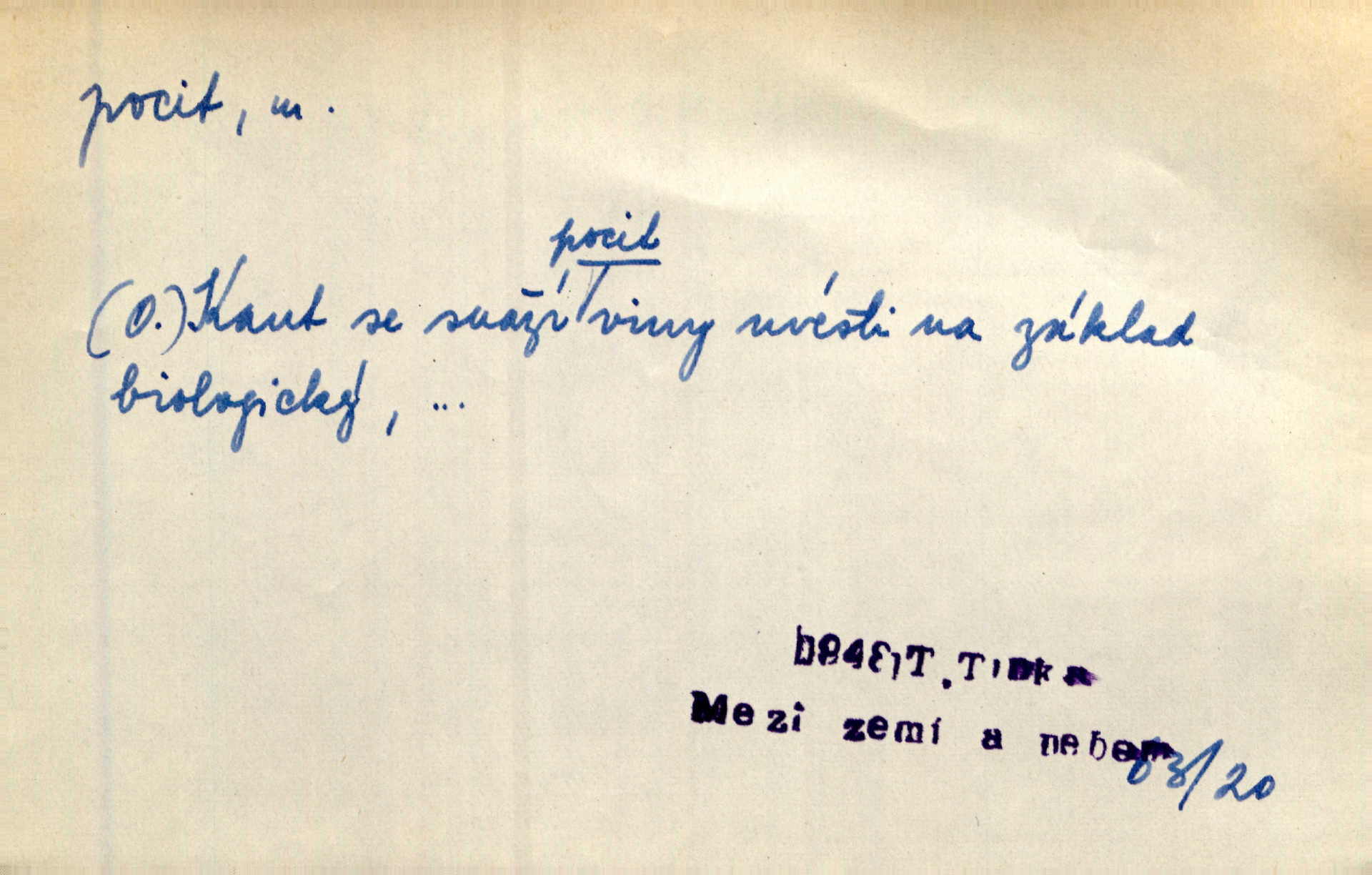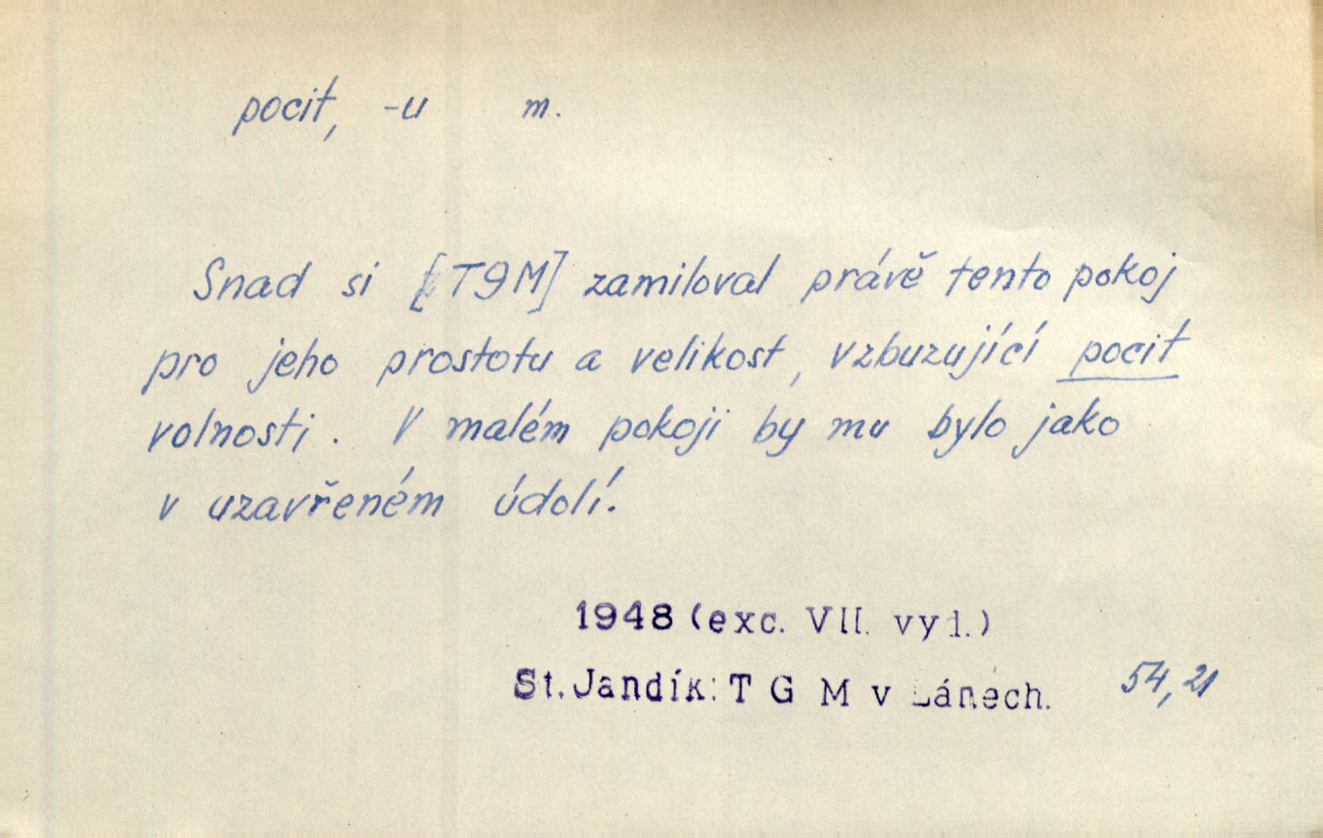 - pocit, -u m. citový zážitek něčeho příjemného n. nepříjemného. Pocit rozkoše projel mu celým tělem. Just. Libý pocit provanul ustrašenou duší její. Šmil. Ramena se zachvěla pocitem ošklivosti, jak se ho kat dotekl. Jir. Pocit nevolnosti, strachu naplňoval ho celého. Baar. Chuťové pocity lze rozdělit do čtyř základních kvalit: kysela, slana, sladka a hořka. Hovory. Měl pocit, jakoby ho dravá šelma držela v špinavé tlamě. Baar. D vědomí, uvědomění, ujasnění něčeho. Vymřel v nás pocit zodpovědnosti docela? Mach. Bylo mu úzko v tom pocitu vystřízlivění. Zey. V dnešní normální duši národní pocit převažuje nad pocitem přináležitosti k rodné vsi. Naše d. D cit. Nejvznešenější všech pocitů jest láska mateřská. Hál. Zápasily ve mně dva pocity: zvědavost a jistý odstín povinnosti. Šim. Pocit vzdoru zakmitl jí duší. Vach.