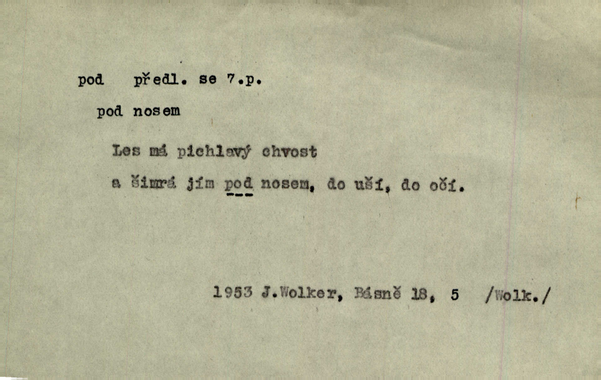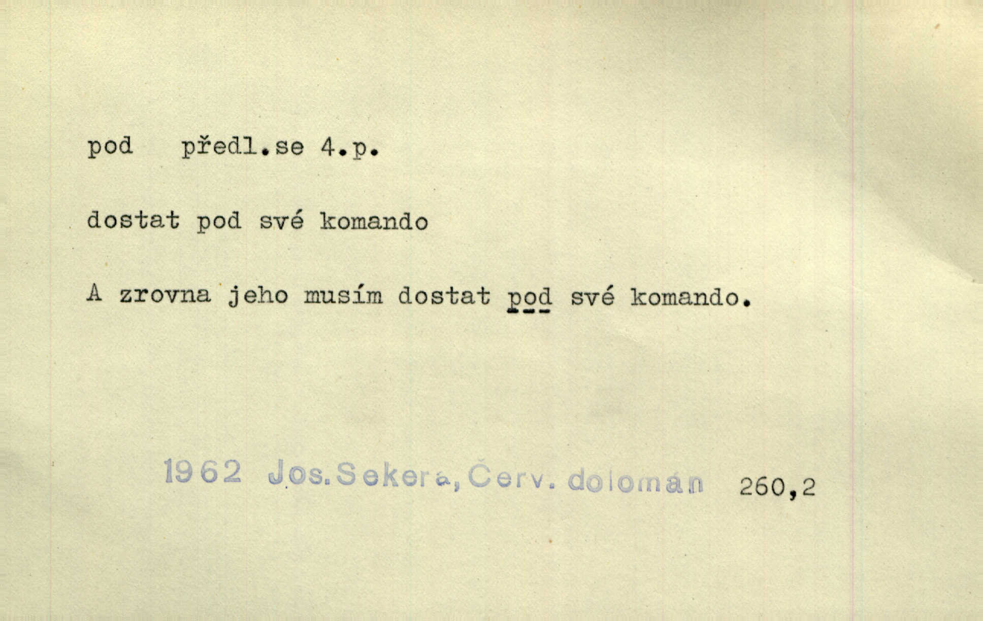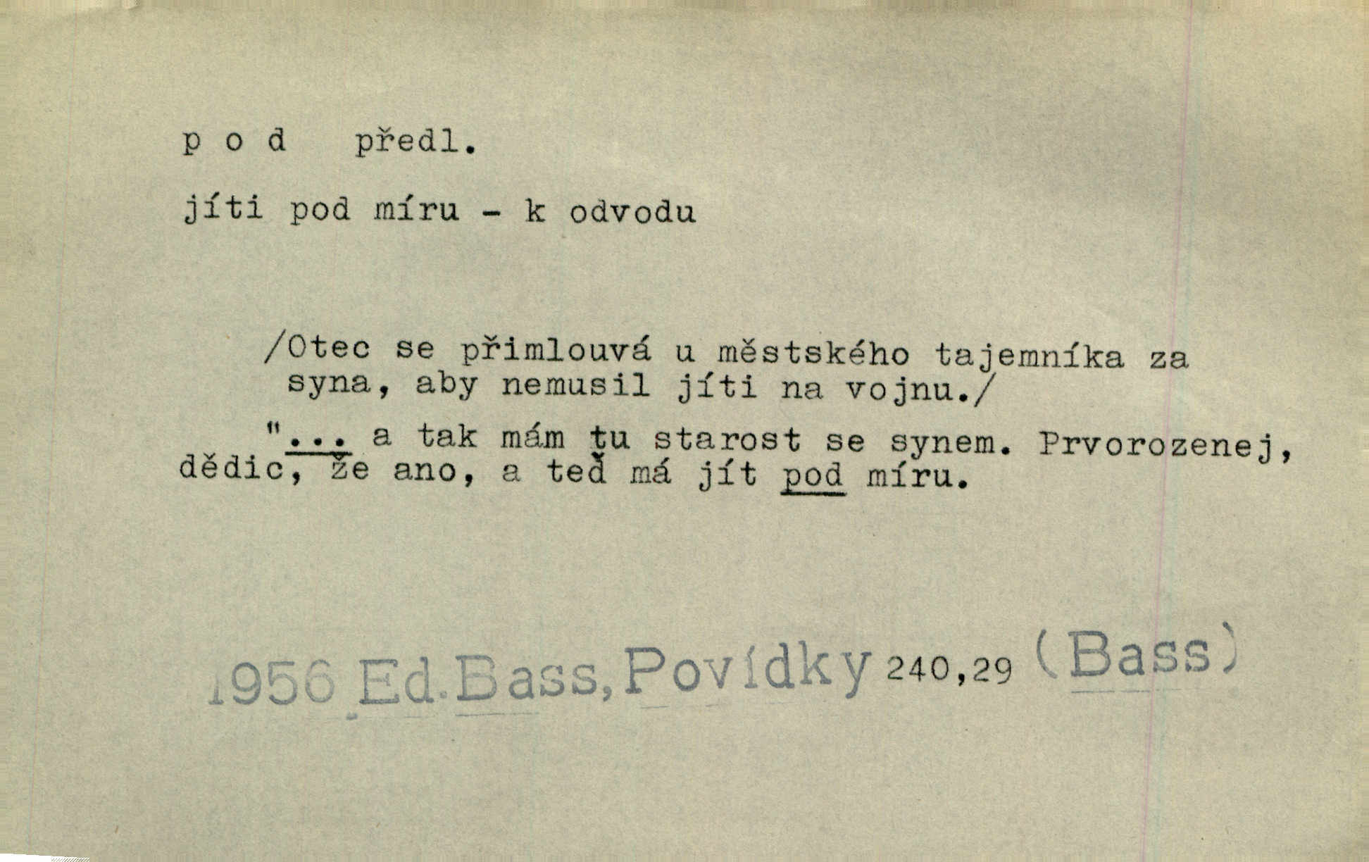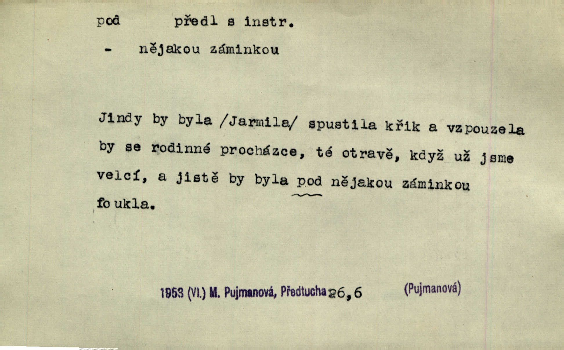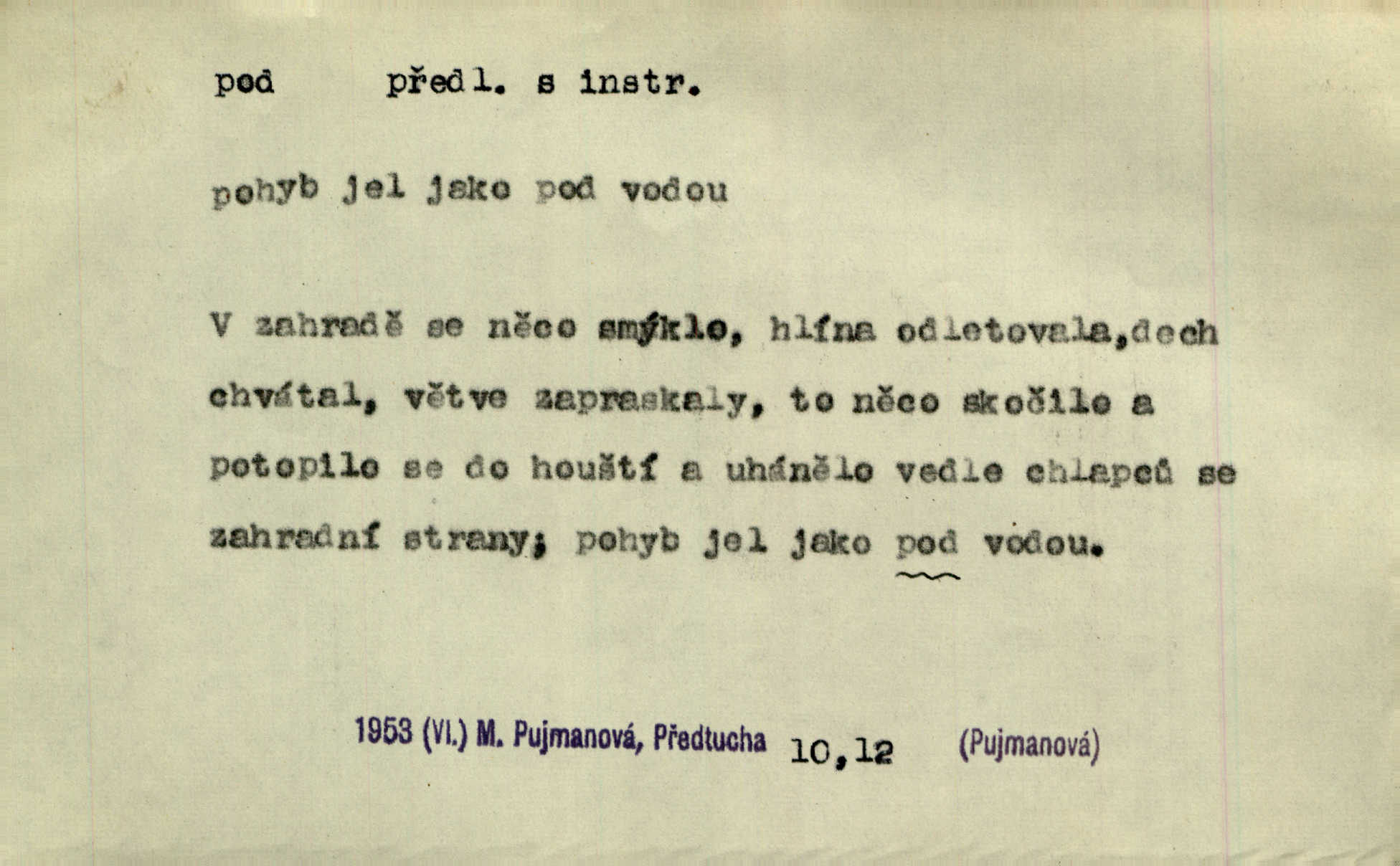- pod předl. s akus. vyjadřuje směr v prostoru dospodu něčeho n. někoho anebo doleji, níže, než je něco. Rád vcházím pod rodinnou střechu. Čech. Sáhla Žofka pod polštář. Čap. Ch. Rozestíral slámu pod panské koně. Jir. Vůz zatlačil pod kůlnu. Rais. Plukovník hleděl pod sebe. Šmil. Usedl si pod lípu. Šmil. [Vodník] pod vodu tě stáhne. Něm. Nevíš, v co mlátíš, co ti klesne pod nohy. Vrch. [Klíče] věšely se do sednice ke dveřím pod kropenku. Svět. Kdo se sám chce chválit, ať se také pod to podpíše! Havl. Pozdě v noci vrátil se pod tajemný Turov. Jir. A od té doby chodívám vždy pod okénko tvoje. Kraj. Jakmile vydáno jest heslo proti nepříteli, dostavuje se každý pod prapor sám. Hol. Ještě chasníka musím postavit pod míru podrobit odvodu. Herb. Z deště jsem utekl a dostal se pod okap. Něm. Císař Josef vydal leccos, co samo sebou muselo padnouti pod stůl býti opuštěno. Šmil. To jsem já taky huboval, když mně nebožka předložila něco, co mně nejelo pod vous nechutnalo. Her. Mámy někdy mívají podivné brouky. Nejde jim každý pod nos. Herrm. V novinách červeně podtrhávali zprávy o kněžích a pod nos mi je kladli. Baar. Děvče aby zázraky konalo, chce-li se pod čepeček dostati vdáti se. Kosm. D vyjadřuje směr v prostoru od povrchu dovnitř. Pod zimník jsou [kalhoty] dávno dobry. Šim. Aféra mi šla již pod kůži nepříjemně se mne dotýkala. Čap. Ch. Slabost svou pod vědy masku skryjem. Vrch. Já a dobývati se ze zvědavosti pod zámek otvírati paklíčem a pod! Kosm. D vyjadřuje směr k podřízení, k podrobení účinnosti něčeho. Buď z nemoci ihned vyléčiti, buď hlavu úpornou pod meč položiti. Čel. Co jim pod ruku přijde, to snědí. Něm. Peníze uložila do truhly pod sedm zámků. Herb. Prý to buřič, který patří na hrad pod zámek. Jir. Pod obecní pečeť ihned všecko vzali. Čech. Ti všichni vzati jsou od sboru pod přísahu, že v poselství svém věrně chovati se budou. Pal. Sloužíme pod deputát. Baar. Nedám brambory sázet pod motyku, na krátké řádky, ale za hakem. Jir. Pečlivě chystali políčka pod setbu. Baar. Z pěti korců pozemku korec měl pod les. Hol. Míval zde kousek lesa pod dvě míry. Vrba. Co si jiný uloží pod úrok, vaši na vás obětují. Baar. D zvl. vyjadřuje směr k podrobení nějaké moci, síle, vlivu, péči a pod. Rádi by dostali se pod pána jiného. Pal. Chtěli ho dáti pod hodně přísného pána, aby ho napravil. Prav. Statek přišel pod sekvestrací. Havl. [Vláda] dala ostrov pod vojenské právo. Havl. I kázal car mládce pod stráž vzíti. Čel. Odevzdal ženu svoji pod ochranu hospodského. Něm. Prchl do Louvru pod ochranu královny Markéty. Zl. Praha. D vyjadřuje hodnotu nižší, nedosahující jisté meze. Žádné z bab nebylo pod padesát let. Herb. Základní jmění klesá pod úroveň, na níž má býti udržováno dle stanov. Herrm. Pod deset tisíc neprodám. Havl. Tabáku nekoupil nikdo pod několik liber. Ner. Byl idiot, tvor pod obraz boží. A. Mrš. Přišel domů notně pod obraz boží opilý. Rais. U protější zdi se válel junák, zpitý pod obraz. Vrba. D vyjadřuje hranice, mez, pod niž něco sahá. Narovnávala mezi chalupu a tyče smrčí od země až pod střechu. Svět. Zarazím mu pod jílec svůj lesklý bodec do chřtánu. Vrch. Červánky ho polily až pod uši. Prav. Tenkrát jsme ještě neměli chudobinec pod patro. Čap. Ch. Škola pod jedno patro. Svob. D vyjadřuje časovou blízkost. Včera pod samý večer byl mi odevzdán list od bratra. Čel. Přišli bychom tam pod sám večer. Hol. D Dial. vyjadřuje dobu vyplněnou dějem. Postojíte si tu pod chvílu chvíli. Herb. D předl. s instr. vyjadřuje polohu, postavení v prostoru vespod něčeho n. někoho anebo doleji, níže, než je něco. Pod nízkou střechou přebývala spokojenost a láska. Něm. Pod dubem sličná děva sedí. Mácha. Spatřil jsem ji krůčkem drobným pod klenbou stromů pospíchat. Mach. [Teplota] deset pod nulou. Herrm. Kráčel [král] pod korunou v bílém fraku. Jir. Dějí se věci pod sluncem, které ani bůh ani papež odpustiti nemůže. Zey. Jeví se tu, jeví ženě chodba pod zemí. Erb. V okamžení bylo celé údolí pod vodou. Erb. Pálila ho tam země pod nohama. Herb. Pod rukou držel nějaké brošurky. Havl. Není dovoleno chytnouti protivníka pod pasem. Jir. Měl drsné vousy, bradu však pode rtem nezarostlou. Jir. Konečně bylo rachot kočáru pod oknem slyšet. Zey. Venku pod schody stál Šimon. Jir. Stará, roubená stavení pod šindelem. Jir. Voda padala pod městem do Labe. Jan. Hluboký hvozd pod Kazínem. Vrch. Pohněvala vás kterás povídka pod čarou. Herrm. Pod vtipy žádných podpisů nestojí. Hum. kal. Ta dobrá známá svěřila to pod pokličkou své známé tajně. Něm. Pověděla svému hochu, že nosí pod srdcem je těhotná. Vrba. V milém tovaryšstvu zmokl pod sklenkou opil se. Jir. D vyjadřuje polohu, postavení v prostoru vzdálenější od povrchu. Zlatý skví se na prsou háv, ale pod ním bije srdce zrádné. Kamen. Okno bylo ukryto pod úbělem záclon. V. Mrš. Nevidět slunéčka pod mrakem. Čel. Když je nebe pod mrakem, nedařívá se posměch. Ner. Den byl pod mrakem. Rais. Bylo pod mrakem. Jir. Nebyl [vévoda] než hnusným faunem pod maskou nadšeného mecenáše. Zey. Pod pláštíkem ctnosti mnoho se kryje nepravosti. Čel. Dni pod svou zdánlivou jednotvárností skrývaly více nehod a žalostí. Šmil. Mlatci se pod kůží smáli v duchu, tajně. Herb. D vyjadřuje podrobení, podřízení účinnosti, působení něčeho. Jan Kozina pod rukou kata kles. Vrch. Lesy pod toporem padnou. Jg. Bylo jí nevolno pod pohledem těch očí. Rais. Paní měla vše pod klíčem zamčeno. Něm. Tu věc musíme míti na papíře a pod kolkem. Herb. Jeden kostelník pod přísahou chtěl potvrditi, že Hanka rukopi
