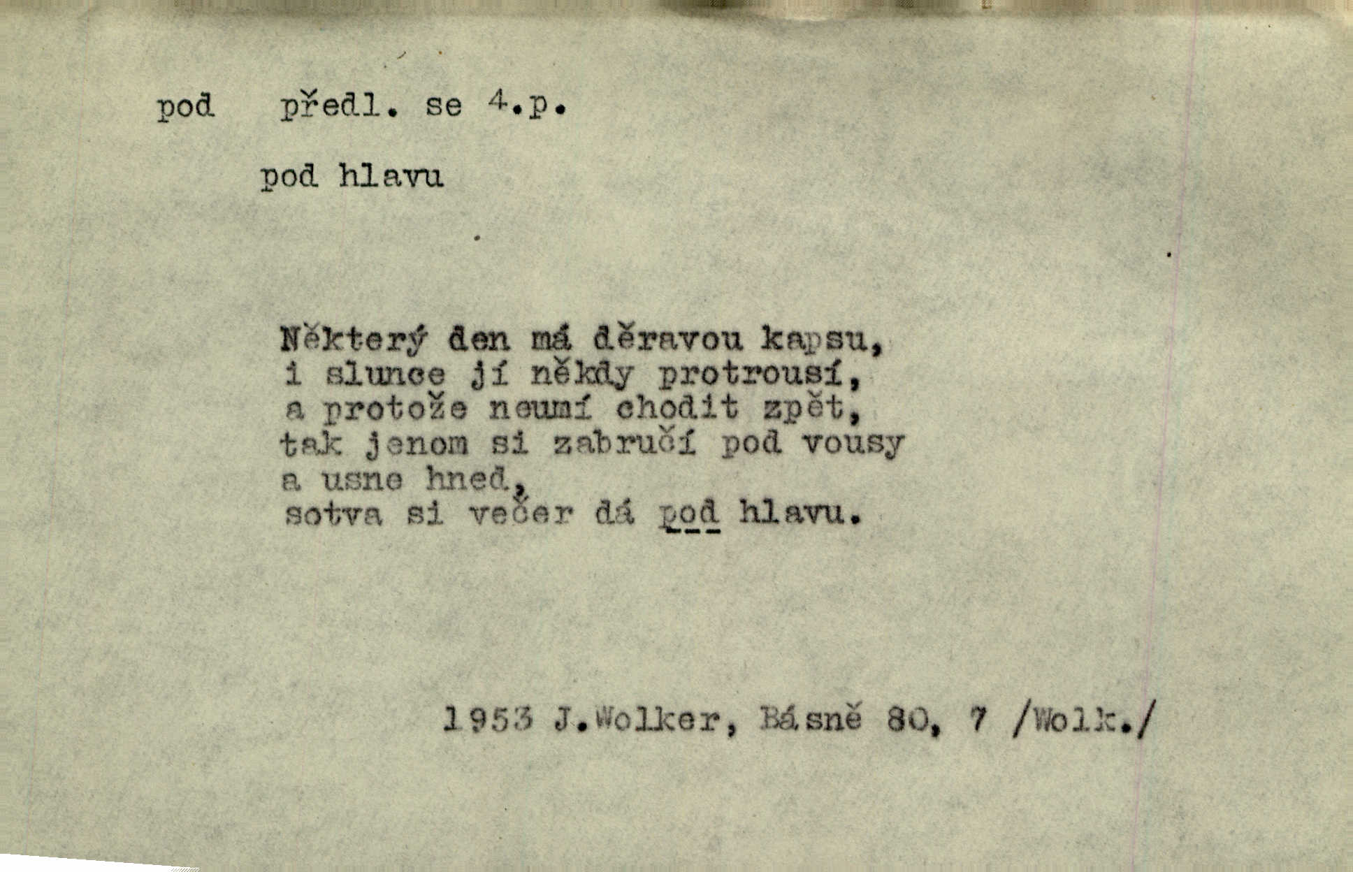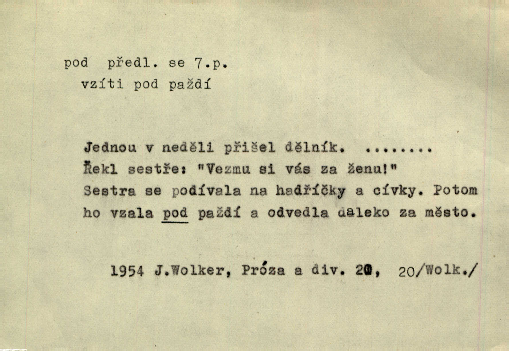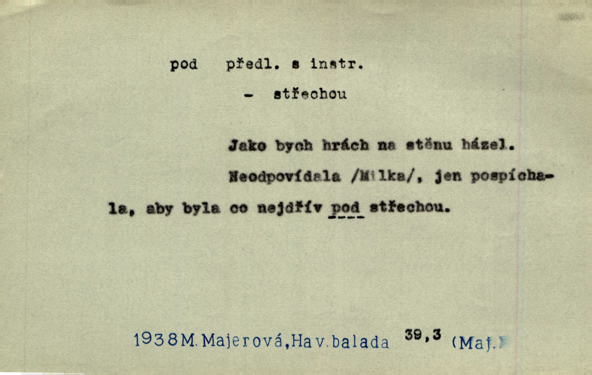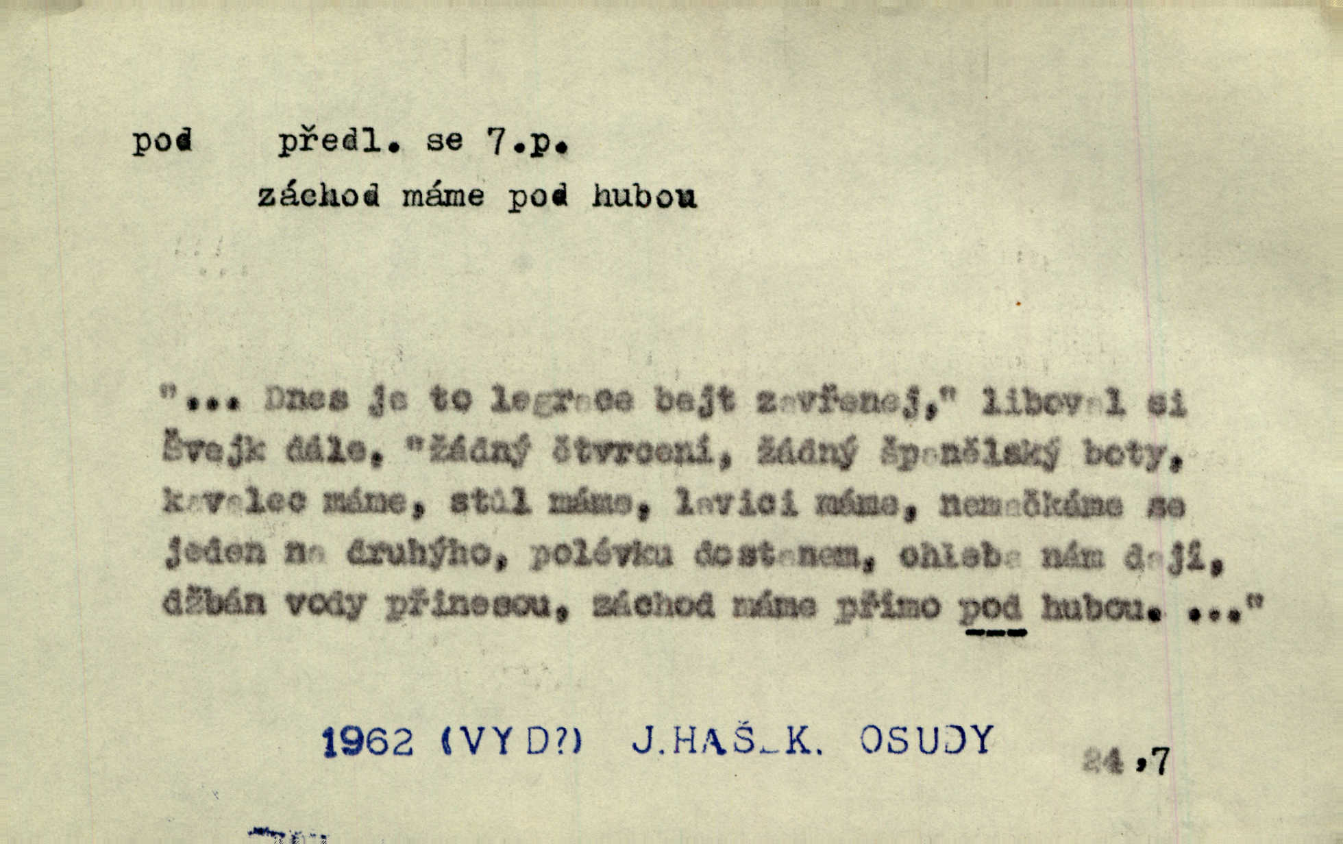 - pod předl. s akus. vyjadřuje směr v prostoru dospodu něčeho n. někoho anebo doleji, níže, než je něco. Rád vcházím pod rodinnou střechu. Čech. Sáhla Žofka pod polštář. Čap. Ch. Rozestíral slámu pod panské koně. Jir. Vůz zatlačil pod kůlnu. Rais. Plukovník hleděl pod sebe. Šmil. Usedl si pod lípu. Šmil. [Vodník] pod vodu tě stáhne. Něm. Nevíš, v co mlátíš, co ti klesne pod nohy. Vrch. [Klíče] věšely se do sednice ke dveřím pod kropenku. Svět. Kdo se sám chce chválit, ať se také pod to podpíše! Havl. Pozdě v noci vrátil se pod tajemný Turov. Jir. A od té doby chodívám vždy pod okénko tvoje. Kraj. Jakmile vydáno jest heslo proti nepříteli, dostavuje se každý pod prapor sám. Hol. Ještě chasníka musím postavit pod míru podrobit odvodu. Herb. Z deště jsem utekl a dostal se pod okap. Něm. Císař Josef vydal leccos, co samo sebou muselo padnouti pod stůl býti opuštěno. Šmil. To jsem já taky huboval, když mně nebožka předložila něco, co mně nejelo pod vous nechutnalo. Her. Mámy někdy mívají podivné brouky. Nejde jim každý pod nos. Herrm. V novinách červeně podtrhávali zprávy o kněžích a pod nos mi je kladli. Baar. Děvče aby zázraky konalo, chce-li se pod čepeček dostati vdáti se. Kosm. D vyjadřuje směr v prostoru od povrchu dovnitř. Pod zimník jsou [kalhoty] dávno dobry. Šim. Aféra mi šla již pod kůži nepříjemně se mne dotýkala. Čap. Ch. Slabost svou pod vědy masku skryjem. Vrch. Já a dobývati se ze zvědavosti pod zámek otvírati paklíčem a pod! Kosm. D vyjadřuje směr k podřízení, k podrobení účinnosti něčeho. Buď z nemoci ihned vyléčiti, buď hlavu úpornou pod meč položiti. Čel. Co jim pod ruku přijde, to snědí. Něm. Peníze uložila do truhly pod sedm zámků. Herb. Prý to buřič, který patří na hrad pod zámek. Jir. Pod obecní pečeť ihned všecko vzali. Čech. Ti všichni vzati jsou od sboru pod přísahu, že v poselství svém věrně chovati se budou. Pal. Sloužíme pod deputát. Baar. Nedám brambory sázet pod motyku, na krátké řádky, ale za hakem. Jir. Pečlivě chystali políčka pod setbu. Baar. Z pěti korců pozemku korec měl pod les. Hol. Míval zde kousek lesa pod dvě míry. Vrba. Co si jiný uloží pod úrok, vaši na vás obětují. Baar. D zvl. vyjadřuje směr k podrobení nějaké moci, síle, vlivu, péči a pod. Rádi by dostali se pod pána jiného. Pal. Chtěli ho dáti pod hodně přísného pána, aby ho napravil. Prav. Statek přišel pod sekvestrací. Havl. [Vláda] dala ostrov pod vojenské právo. Havl. I kázal car mládce pod stráž vzíti. Čel. Odevzdal ženu svoji pod ochranu hospodského. Něm. Prchl do Louvru pod ochranu královny Markéty. Zl. Praha. D vyjadřuje hodnotu nižší, nedosahující jisté meze. Žádné z bab nebylo pod padesát let. Herb. Základní jmění klesá pod úroveň, na níž má býti udržováno dle stanov. Herrm. Pod deset tisíc neprodám. Havl. Tabáku nekoupil nikdo pod několik liber. Ner. Byl idiot, tvor pod obraz boží. A. Mrš. Přišel domů notně pod obraz boží opilý. Rais. U protější zdi se válel junák, zpitý pod obraz. Vrba. D vyjadřuje hranice, mez, pod niž něco sahá. Narovnávala mezi chalupu a tyče smrčí od země až pod střechu. Svět. Zarazím mu pod jílec svůj lesklý bodec do chřtánu. Vrch. Červánky ho polily až pod uši. Prav. Tenkrát jsme ještě neměli chudobinec pod patro. Čap. Ch. Škola pod jedno patro. Svob. D vyjadřuje časovou blízkost. Včera pod samý večer byl mi odevzdán list od bratra. Čel. Přišli bychom tam pod sám večer. Hol. D Dial. vyjadřuje dobu vyplněnou dějem. Postojíte si tu pod chvílu chvíli. Herb. D předl. s instr. vyjadřuje polohu, postavení v prostoru vespod něčeho n. někoho anebo doleji, níže, než je něco. Pod nízkou střechou přebývala spokojenost a láska. Něm. Pod dubem sličná děva sedí. Mácha. Spatřil jsem ji krůčkem drobným pod klenbou stromů pospíchat. Mach. [Teplota] deset pod nulou. Herrm. Kráčel [král] pod korunou v bílém fraku. Jir. Dějí se věci pod sluncem, které ani bůh ani papež odpustiti nemůže. Zey. Jeví se tu, jeví ženě chodba pod zemí. Erb. V okamžení bylo celé údolí pod vodou. Erb. Pálila ho tam země pod nohama. Herb. Pod rukou držel nějaké brošurky. Havl. Není dovoleno chytnouti protivníka pod pasem. Jir. Měl drsné vousy, bradu však pode rtem nezarostlou. Jir. Konečně bylo rachot kočáru pod oknem slyšet. Zey. Venku pod schody stál Šimon. Jir. Stará, roubená stavení pod šindelem. Jir. Voda padala pod městem do Labe. Jan. Hluboký hvozd pod Kazínem. Vrch. Pohněvala vás kterás povídka pod čarou. Herrm. Pod vtipy žádných podpisů nestojí. Hum. kal. Ta dobrá známá svěřila to pod pokličkou své známé tajně. Něm. Pověděla svému hochu, že nosí pod srdcem je těhotná. Vrba. V milém tovaryšstvu zmokl pod sklenkou opil se. Jir. D vyjadřuje polohu, postavení v prostoru vzdálenější od povrchu. Zlatý skví se na prsou háv, ale pod ním bije srdce zrádné. Kamen. Okno bylo ukryto pod úbělem záclon. V. Mrš. Nevidět slunéčka pod mrakem. Čel. Když je nebe pod mrakem, nedařívá se posměch. Ner. Den byl pod mrakem. Rais. Bylo pod mrakem. Jir. Nebyl [vévoda] než hnusným faunem pod maskou nadšeného mecenáše. Zey. Pod pláštíkem ctnosti mnoho se kryje nepravosti. Čel. Dni pod svou zdánlivou jednotvárností skrývaly více nehod a žalostí. Šmil. Mlatci se pod kůží smáli v duchu, tajně. Herb. D vyjadřuje podrobení, podřízení účinnosti, působení něčeho. Jan Kozina pod rukou kata kles. Vrch. Lesy pod toporem padnou. Jg. Bylo jí nevolno pod pohledem těch očí. Rais. Paní měla vše pod klíčem zamčeno. Něm. Tu věc musíme míti na papíře a pod kolkem. Herb. Jeden kostelník pod přísahou chtěl potvrditi, že Hanka rukopi