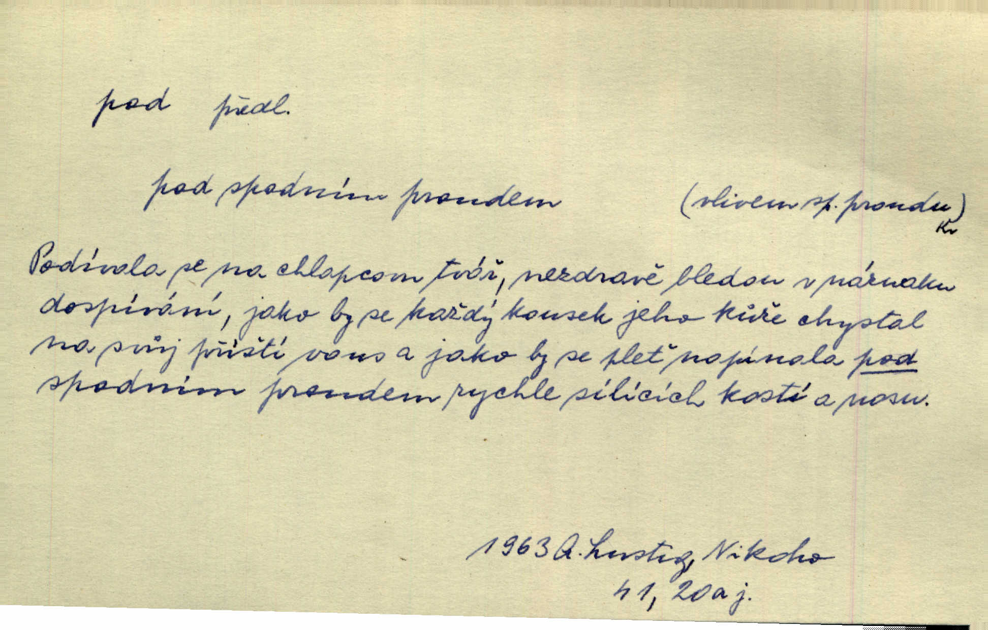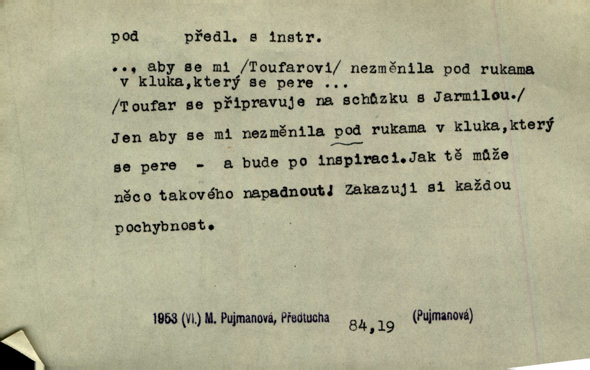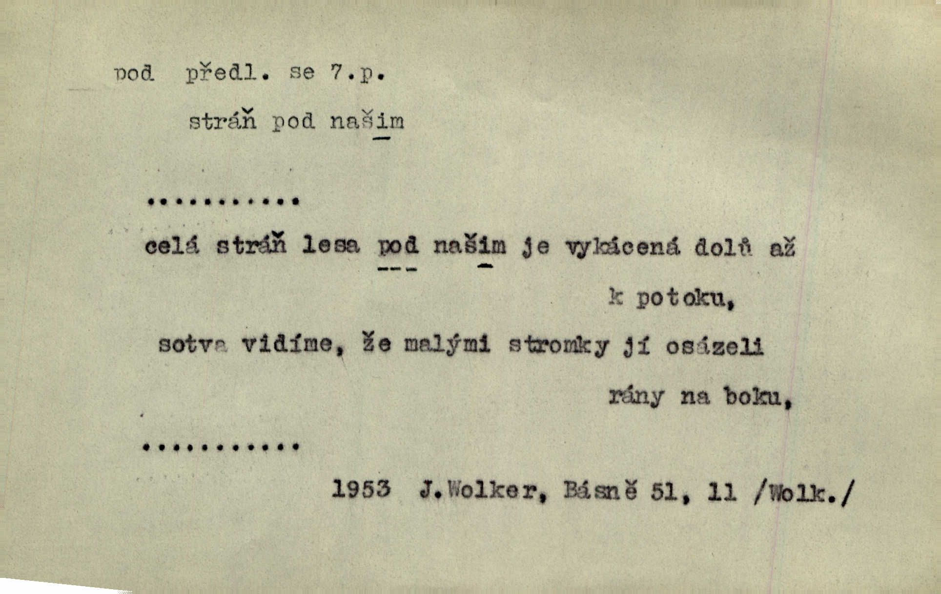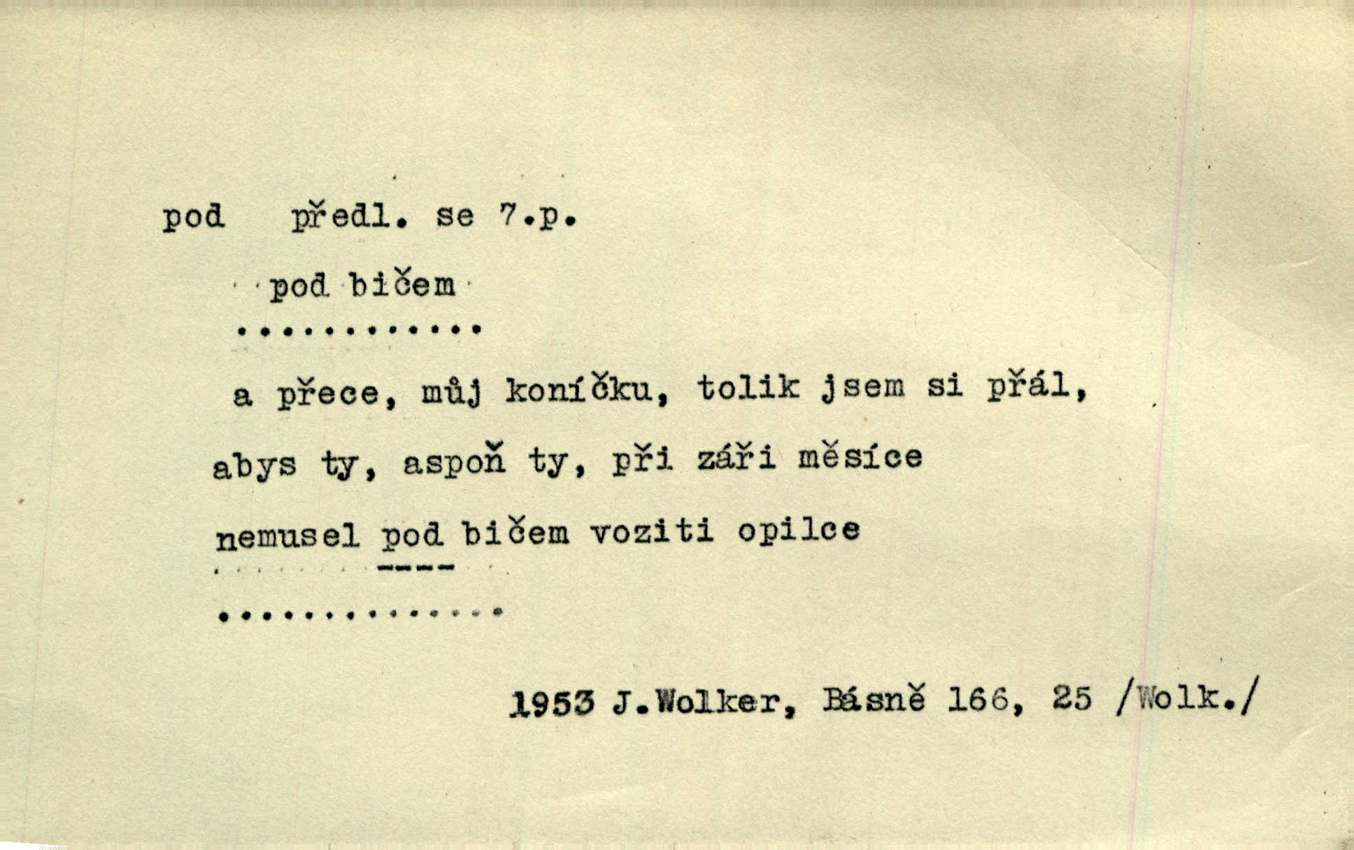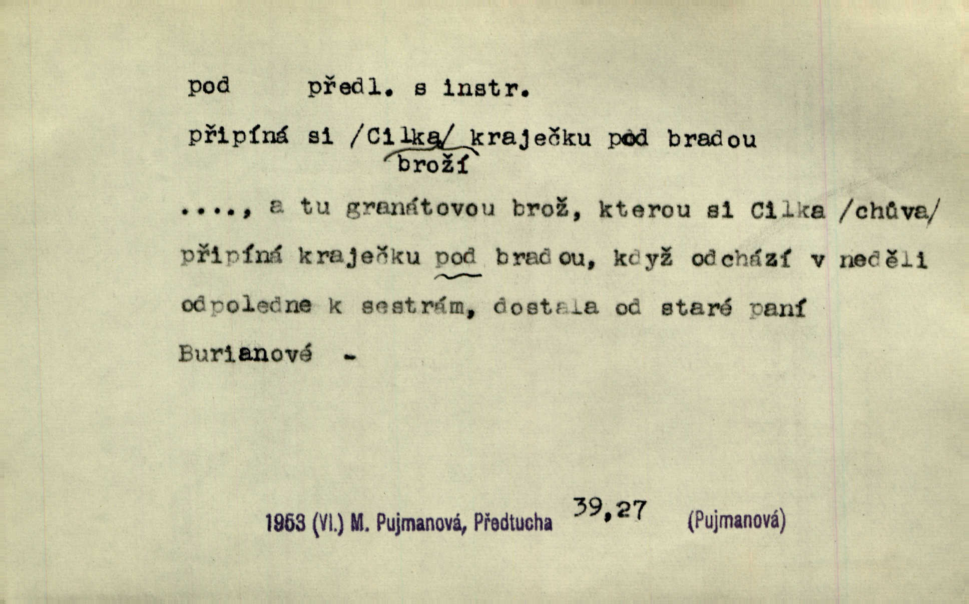 - pod předl. s akus. vyjadřuje směr v prostoru dospodu něčeho n. někoho anebo doleji, níže, než je něco. Rád vcházím pod rodinnou střechu. Čech. Sáhla Žofka pod polštář. Čap. Ch. Rozestíral slámu pod panské koně. Jir. Vůz zatlačil pod kůlnu. Rais. Plukovník hleděl pod sebe. Šmil. Usedl si pod lípu. Šmil. [Vodník] pod vodu tě stáhne. Něm. Nevíš, v co mlátíš, co ti klesne pod nohy. Vrch. [Klíče] věšely se do sednice ke dveřím pod kropenku. Svět. Kdo se sám chce chválit, ať se také pod to podpíše! Havl. Pozdě v noci vrátil se pod tajemný Turov. Jir. A od té doby chodívám vždy pod okénko tvoje. Kraj. Jakmile vydáno jest heslo proti nepříteli, dostavuje se každý pod prapor sám. Hol. Ještě chasníka musím postavit pod míru podrobit odvodu. Herb. Z deště jsem utekl a dostal se pod okap. Něm. Císař Josef vydal leccos, co samo sebou muselo padnouti pod stůl býti opuštěno. Šmil. To jsem já taky huboval, když mně nebožka předložila něco, co mně nejelo pod vous nechutnalo. Her. Mámy někdy mívají podivné brouky. Nejde jim každý pod nos. Herrm. V novinách červeně podtrhávali zprávy o kněžích a pod nos mi je kladli. Baar. Děvče aby zázraky konalo, chce-li se pod čepeček dostati vdáti se. Kosm. D vyjadřuje směr v prostoru od povrchu dovnitř. Pod zimník jsou [kalhoty] dávno dobry. Šim. Aféra mi šla již pod kůži nepříjemně se mne dotýkala. Čap. Ch. Slabost svou pod vědy masku skryjem. Vrch. Já a dobývati se ze zvědavosti pod zámek otvírati paklíčem a pod! Kosm. D vyjadřuje směr k podřízení, k podrobení účinnosti něčeho. Buď z nemoci ihned vyléčiti, buď hlavu úpornou pod meč položiti. Čel. Co jim pod ruku přijde, to snědí. Něm. Peníze uložila do truhly pod sedm zámků. Herb. Prý to buřič, který patří na hrad pod zámek. Jir. Pod obecní pečeť ihned všecko vzali. Čech. Ti všichni vzati jsou od sboru pod přísahu, že v poselství svém věrně chovati se budou. Pal. Sloužíme pod deputát. Baar. Nedám brambory sázet pod motyku, na krátké řádky, ale za hakem. Jir. Pečlivě chystali políčka pod setbu. Baar. Z pěti korců pozemku korec měl pod les. Hol. Míval zde kousek lesa pod dvě míry. Vrba. Co si jiný uloží pod úrok, vaši na vás obětují. Baar. D zvl. vyjadřuje směr k podrobení nějaké moci, síle, vlivu, péči a pod. Rádi by dostali se pod pána jiného. Pal. Chtěli ho dáti pod hodně přísného pána, aby ho napravil. Prav. Statek přišel pod sekvestrací. Havl. [Vláda] dala ostrov pod vojenské právo. Havl. I kázal car mládce pod stráž vzíti. Čel. Odevzdal ženu svoji pod ochranu hospodského. Něm. Prchl do Louvru pod ochranu královny Markéty. Zl. Praha. D vyjadřuje hodnotu nižší, nedosahující jisté meze. Žádné z bab nebylo pod padesát let. Herb. Základní jmění klesá pod úroveň, na níž má býti udržováno dle stanov. Herrm. Pod deset tisíc neprodám. Havl. Tabáku nekoupil nikdo pod několik liber. Ner. Byl idiot, tvor pod obraz boží. A. Mrš. Přišel domů notně pod obraz boží opilý. Rais. U protější zdi se válel junák, zpitý pod obraz. Vrba. D vyjadřuje hranice, mez, pod niž něco sahá. Narovnávala mezi chalupu a tyče smrčí od země až pod střechu. Svět. Zarazím mu pod jílec svůj lesklý bodec do chřtánu. Vrch. Červánky ho polily až pod uši. Prav. Tenkrát jsme ještě neměli chudobinec pod patro. Čap. Ch. Škola pod jedno patro. Svob. D vyjadřuje časovou blízkost. Včera pod samý večer byl mi odevzdán list od bratra. Čel. Přišli bychom tam pod sám večer. Hol. D Dial. vyjadřuje dobu vyplněnou dějem. Postojíte si tu pod chvílu chvíli. Herb. D předl. s instr. vyjadřuje polohu, postavení v prostoru vespod něčeho n. někoho anebo doleji, níže, než je něco. Pod nízkou střechou přebývala spokojenost a láska. Něm. Pod dubem sličná děva sedí. Mácha. Spatřil jsem ji krůčkem drobným pod klenbou stromů pospíchat. Mach. [Teplota] deset pod nulou. Herrm. Kráčel [král] pod korunou v bílém fraku. Jir. Dějí se věci pod sluncem, které ani bůh ani papež odpustiti nemůže. Zey. Jeví se tu, jeví ženě chodba pod zemí. Erb. V okamžení bylo celé údolí pod vodou. Erb. Pálila ho tam země pod nohama. Herb. Pod rukou držel nějaké brošurky. Havl. Není dovoleno chytnouti protivníka pod pasem. Jir. Měl drsné vousy, bradu však pode rtem nezarostlou. Jir. Konečně bylo rachot kočáru pod oknem slyšet. Zey. Venku pod schody stál Šimon. Jir. Stará, roubená stavení pod šindelem. Jir. Voda padala pod městem do Labe. Jan. Hluboký hvozd pod Kazínem. Vrch. Pohněvala vás kterás povídka pod čarou. Herrm. Pod vtipy žádných podpisů nestojí. Hum. kal. Ta dobrá známá svěřila to pod pokličkou své známé tajně. Něm. Pověděla svému hochu, že nosí pod srdcem je těhotná. Vrba. V milém tovaryšstvu zmokl pod sklenkou opil se. Jir. D vyjadřuje polohu, postavení v prostoru vzdálenější od povrchu. Zlatý skví se na prsou háv, ale pod ním bije srdce zrádné. Kamen. Okno bylo ukryto pod úbělem záclon. V. Mrš. Nevidět slunéčka pod mrakem. Čel. Když je nebe pod mrakem, nedařívá se posměch. Ner. Den byl pod mrakem. Rais. Bylo pod mrakem. Jir. Nebyl [vévoda] než hnusným faunem pod maskou nadšeného mecenáše. Zey. Pod pláštíkem ctnosti mnoho se kryje nepravosti. Čel. Dni pod svou zdánlivou jednotvárností skrývaly více nehod a žalostí. Šmil. Mlatci se pod kůží smáli v duchu, tajně. Herb. D vyjadřuje podrobení, podřízení účinnosti, působení něčeho. Jan Kozina pod rukou kata kles. Vrch. Lesy pod toporem padnou. Jg. Bylo jí nevolno pod pohledem těch očí. Rais. Paní měla vše pod klíčem zamčeno. Něm. Tu věc musíme míti na papíře a pod kolkem. Herb. Jeden kostelník pod přísahou chtěl potvrditi, že Hanka rukopi