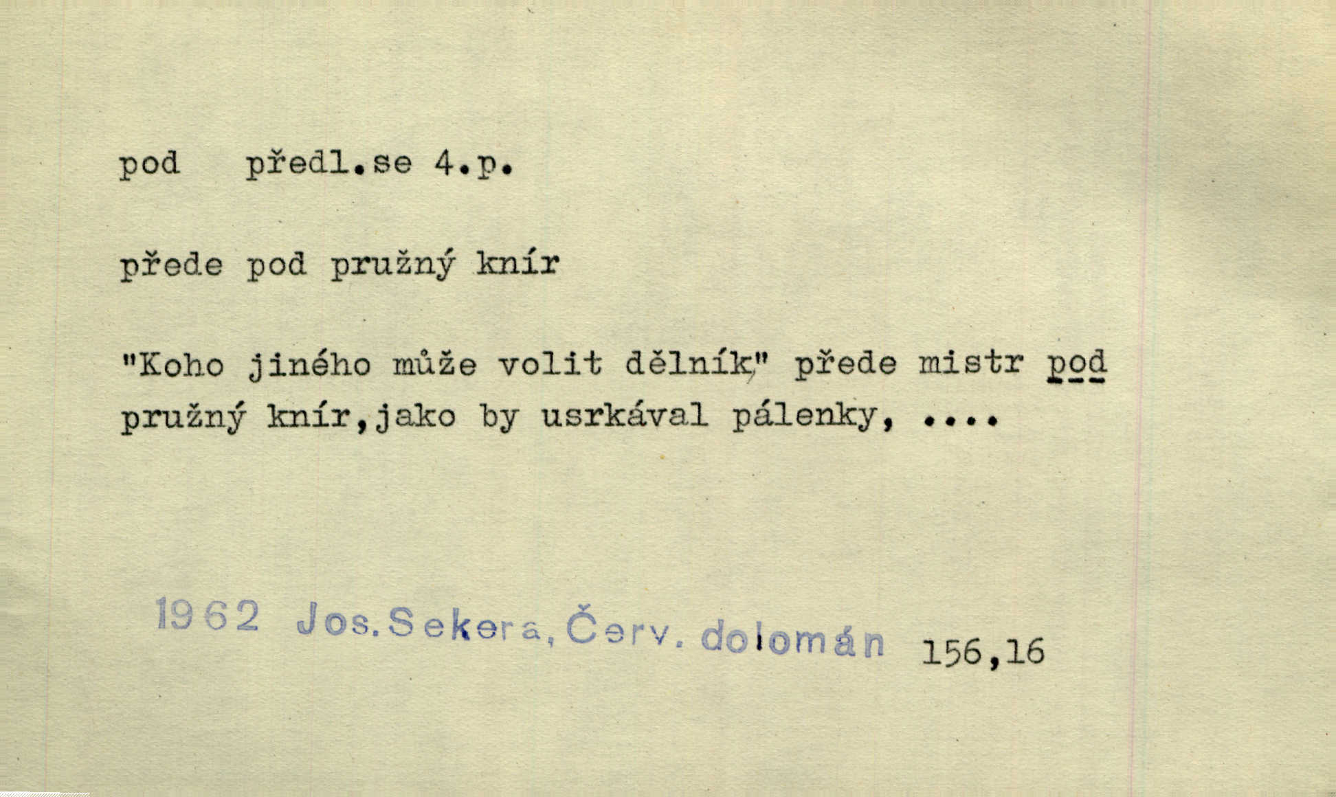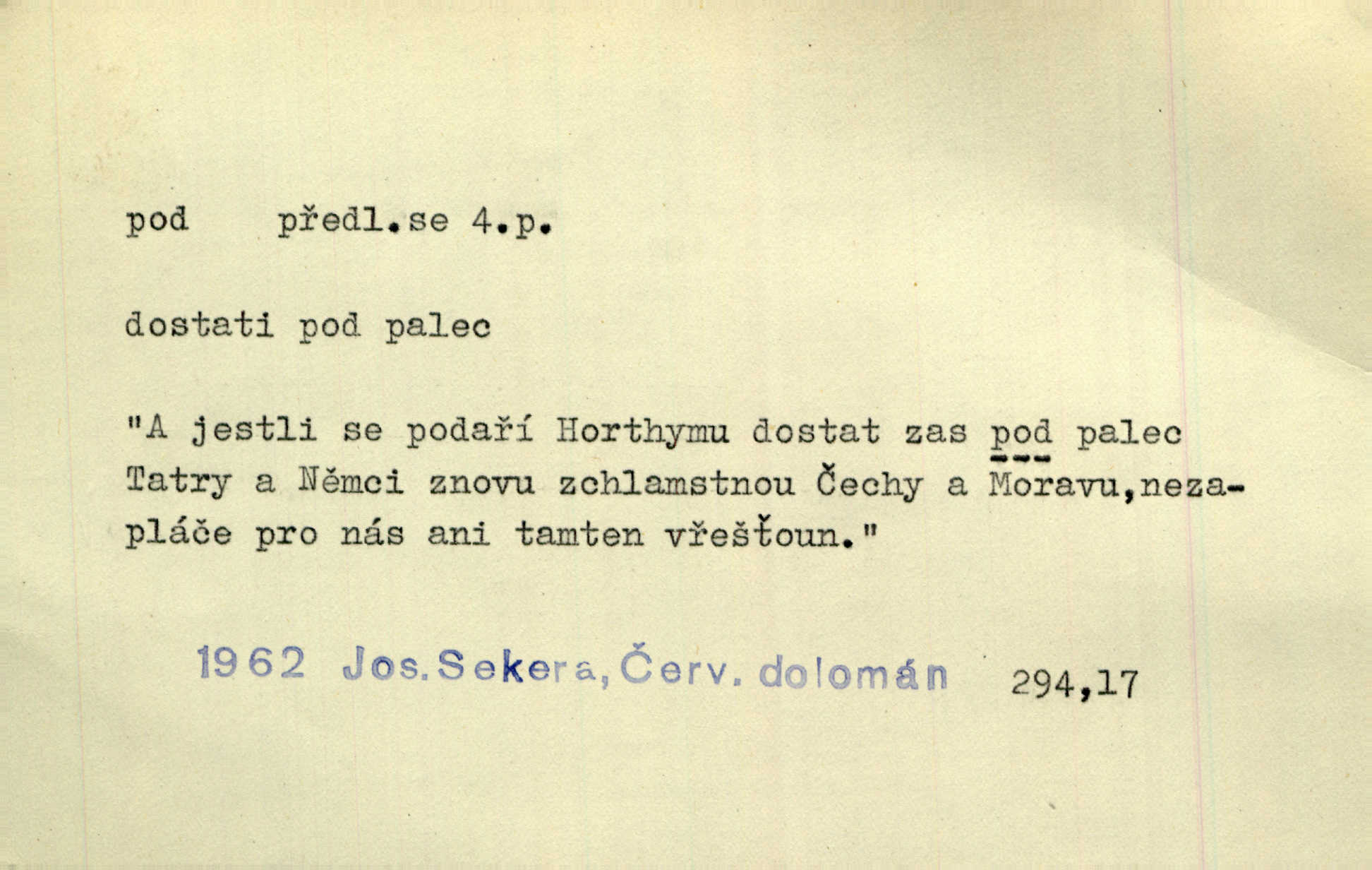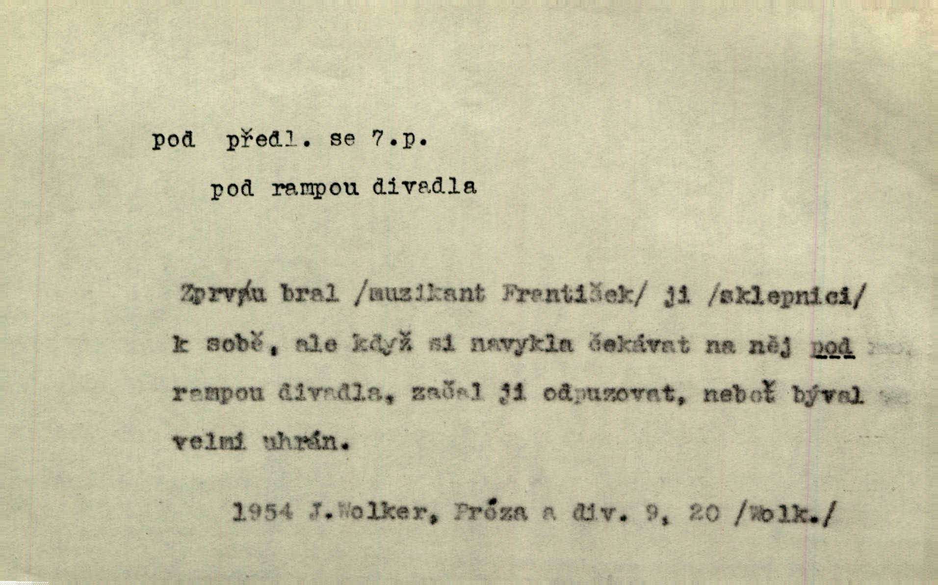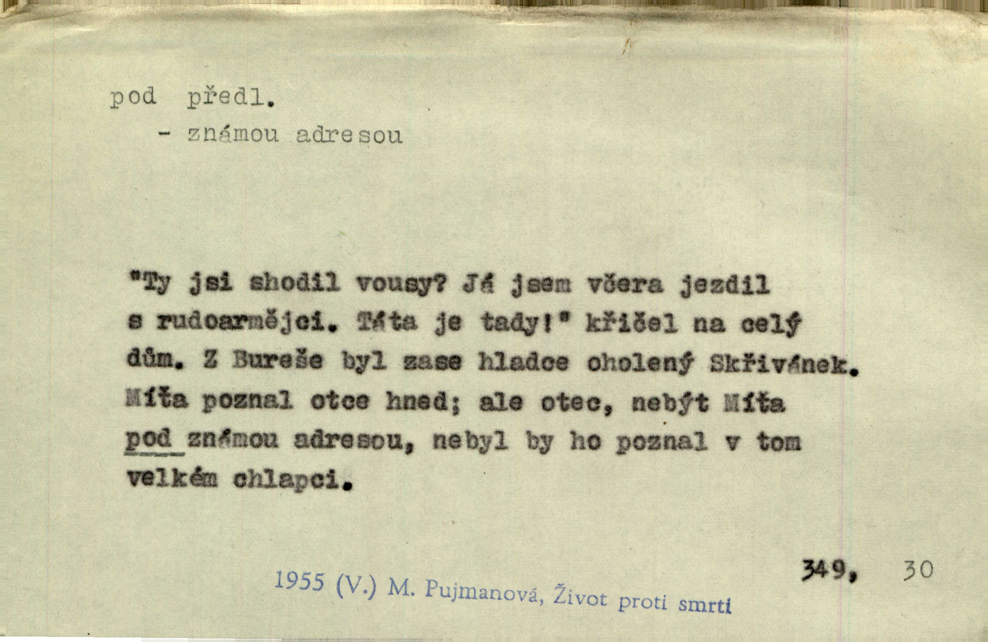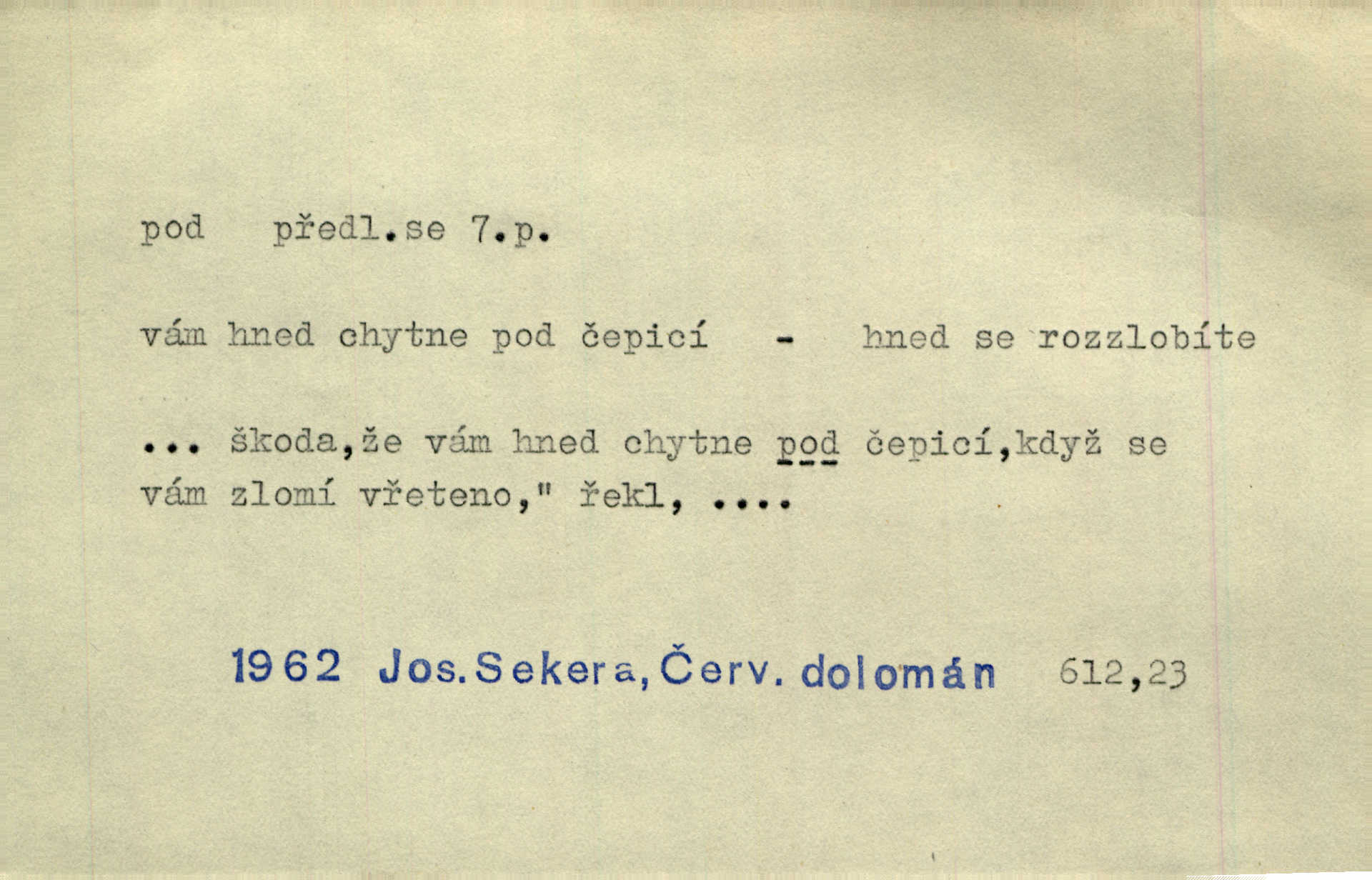 - pod předl. s akus. vyjadřuje směr v prostoru dospodu něčeho n. někoho anebo doleji, níže, než je něco. Rád vcházím pod rodinnou střechu. Čech. Sáhla Žofka pod polštář. Čap. Ch. Rozestíral slámu pod panské koně. Jir. Vůz zatlačil pod kůlnu. Rais. Plukovník hleděl pod sebe. Šmil. Usedl si pod lípu. Šmil. [Vodník] pod vodu tě stáhne. Něm. Nevíš, v co mlátíš, co ti klesne pod nohy. Vrch. [Klíče] věšely se do sednice ke dveřím pod kropenku. Svět. Kdo se sám chce chválit, ať se také pod to podpíše! Havl. Pozdě v noci vrátil se pod tajemný Turov. Jir. A od té doby chodívám vždy pod okénko tvoje. Kraj. Jakmile vydáno jest heslo proti nepříteli, dostavuje se každý pod prapor sám. Hol. Ještě chasníka musím postavit pod míru podrobit odvodu. Herb. Z deště jsem utekl a dostal se pod okap. Něm. Císař Josef vydal leccos, co samo sebou muselo padnouti pod stůl býti opuštěno. Šmil. To jsem já taky huboval, když mně nebožka předložila něco, co mně nejelo pod vous nechutnalo. Her. Mámy někdy mívají podivné brouky. Nejde jim každý pod nos. Herrm. V novinách červeně podtrhávali zprávy o kněžích a pod nos mi je kladli. Baar. Děvče aby zázraky konalo, chce-li se pod čepeček dostati vdáti se. Kosm. D vyjadřuje směr v prostoru od povrchu dovnitř. Pod zimník jsou [kalhoty] dávno dobry. Šim. Aféra mi šla již pod kůži nepříjemně se mne dotýkala. Čap. Ch. Slabost svou pod vědy masku skryjem. Vrch. Já a dobývati se ze zvědavosti pod zámek otvírati paklíčem a pod! Kosm. D vyjadřuje směr k podřízení, k podrobení účinnosti něčeho. Buď z nemoci ihned vyléčiti, buď hlavu úpornou pod meč položiti. Čel. Co jim pod ruku přijde, to snědí. Něm. Peníze uložila do truhly pod sedm zámků. Herb. Prý to buřič, který patří na hrad pod zámek. Jir. Pod obecní pečeť ihned všecko vzali. Čech. Ti všichni vzati jsou od sboru pod přísahu, že v poselství svém věrně chovati se budou. Pal. Sloužíme pod deputát. Baar. Nedám brambory sázet pod motyku, na krátké řádky, ale za hakem. Jir. Pečlivě chystali políčka pod setbu. Baar. Z pěti korců pozemku korec měl pod les. Hol. Míval zde kousek lesa pod dvě míry. Vrba. Co si jiný uloží pod úrok, vaši na vás obětují. Baar. D zvl. vyjadřuje směr k podrobení nějaké moci, síle, vlivu, péči a pod. Rádi by dostali se pod pána jiného. Pal. Chtěli ho dáti pod hodně přísného pána, aby ho napravil. Prav. Statek přišel pod sekvestrací. Havl. [Vláda] dala ostrov pod vojenské právo. Havl. I kázal car mládce pod stráž vzíti. Čel. Odevzdal ženu svoji pod ochranu hospodského. Něm. Prchl do Louvru pod ochranu královny Markéty. Zl. Praha. D vyjadřuje hodnotu nižší, nedosahující jisté meze. Žádné z bab nebylo pod padesát let. Herb. Základní jmění klesá pod úroveň, na níž má býti udržováno dle stanov. Herrm. Pod deset tisíc neprodám. Havl. Tabáku nekoupil nikdo pod několik liber. Ner. Byl idiot, tvor pod obraz boží. A. Mrš. Přišel domů notně pod obraz boží opilý. Rais. U protější zdi se válel junák, zpitý pod obraz. Vrba. D vyjadřuje hranice, mez, pod niž něco sahá. Narovnávala mezi chalupu a tyče smrčí od země až pod střechu. Svět. Zarazím mu pod jílec svůj lesklý bodec do chřtánu. Vrch. Červánky ho polily až pod uši. Prav. Tenkrát jsme ještě neměli chudobinec pod patro. Čap. Ch. Škola pod jedno patro. Svob. D vyjadřuje časovou blízkost. Včera pod samý večer byl mi odevzdán list od bratra. Čel. Přišli bychom tam pod sám večer. Hol. D Dial. vyjadřuje dobu vyplněnou dějem. Postojíte si tu pod chvílu chvíli. Herb. D předl. s instr. vyjadřuje polohu, postavení v prostoru vespod něčeho n. někoho anebo doleji, níže, než je něco. Pod nízkou střechou přebývala spokojenost a láska. Něm. Pod dubem sličná děva sedí. Mácha. Spatřil jsem ji krůčkem drobným pod klenbou stromů pospíchat. Mach. [Teplota] deset pod nulou. Herrm. Kráčel [král] pod korunou v bílém fraku. Jir. Dějí se věci pod sluncem, které ani bůh ani papež odpustiti nemůže. Zey. Jeví se tu, jeví ženě chodba pod zemí. Erb. V okamžení bylo celé údolí pod vodou. Erb. Pálila ho tam země pod nohama. Herb. Pod rukou držel nějaké brošurky. Havl. Není dovoleno chytnouti protivníka pod pasem. Jir. Měl drsné vousy, bradu však pode rtem nezarostlou. Jir. Konečně bylo rachot kočáru pod oknem slyšet. Zey. Venku pod schody stál Šimon. Jir. Stará, roubená stavení pod šindelem. Jir. Voda padala pod městem do Labe. Jan. Hluboký hvozd pod Kazínem. Vrch. Pohněvala vás kterás povídka pod čarou. Herrm. Pod vtipy žádných podpisů nestojí. Hum. kal. Ta dobrá známá svěřila to pod pokličkou své známé tajně. Něm. Pověděla svému hochu, že nosí pod srdcem je těhotná. Vrba. V milém tovaryšstvu zmokl pod sklenkou opil se. Jir. D vyjadřuje polohu, postavení v prostoru vzdálenější od povrchu. Zlatý skví se na prsou háv, ale pod ním bije srdce zrádné. Kamen. Okno bylo ukryto pod úbělem záclon. V. Mrš. Nevidět slunéčka pod mrakem. Čel. Když je nebe pod mrakem, nedařívá se posměch. Ner. Den byl pod mrakem. Rais. Bylo pod mrakem. Jir. Nebyl [vévoda] než hnusným faunem pod maskou nadšeného mecenáše. Zey. Pod pláštíkem ctnosti mnoho se kryje nepravosti. Čel. Dni pod svou zdánlivou jednotvárností skrývaly více nehod a žalostí. Šmil. Mlatci se pod kůží smáli v duchu, tajně. Herb. D vyjadřuje podrobení, podřízení účinnosti, působení něčeho. Jan Kozina pod rukou kata kles. Vrch. Lesy pod toporem padnou. Jg. Bylo jí nevolno pod pohledem těch očí. Rais. Paní měla vše pod klíčem zamčeno. Něm. Tu věc musíme míti na papíře a pod kolkem. Herb. Jeden kostelník pod přísahou chtěl potvrditi, že Hanka rukopi