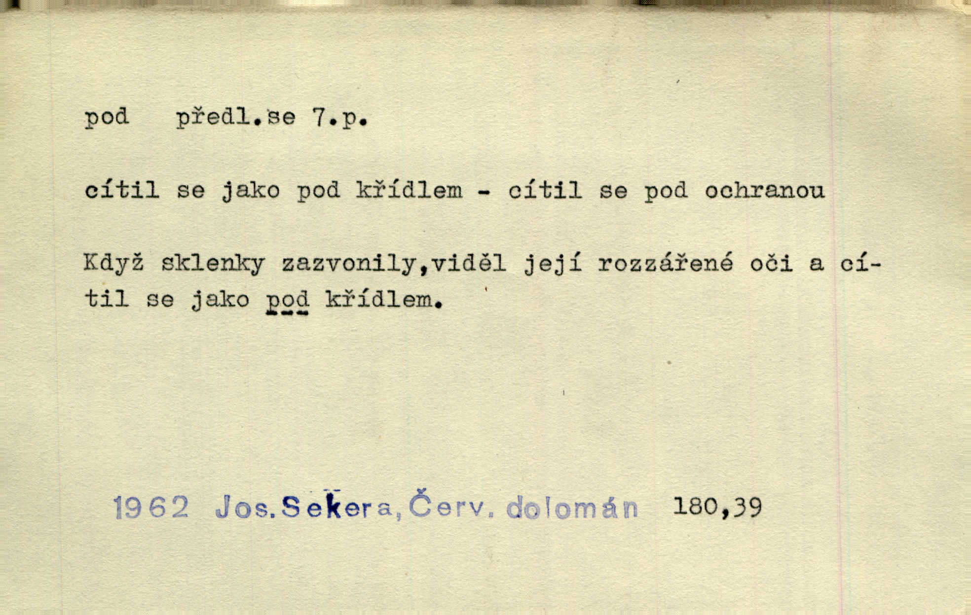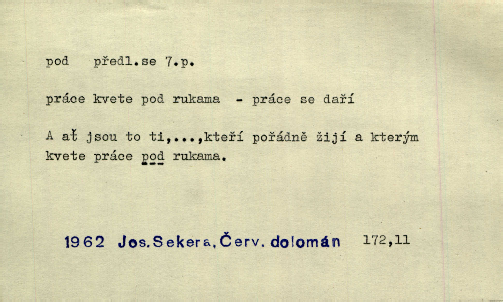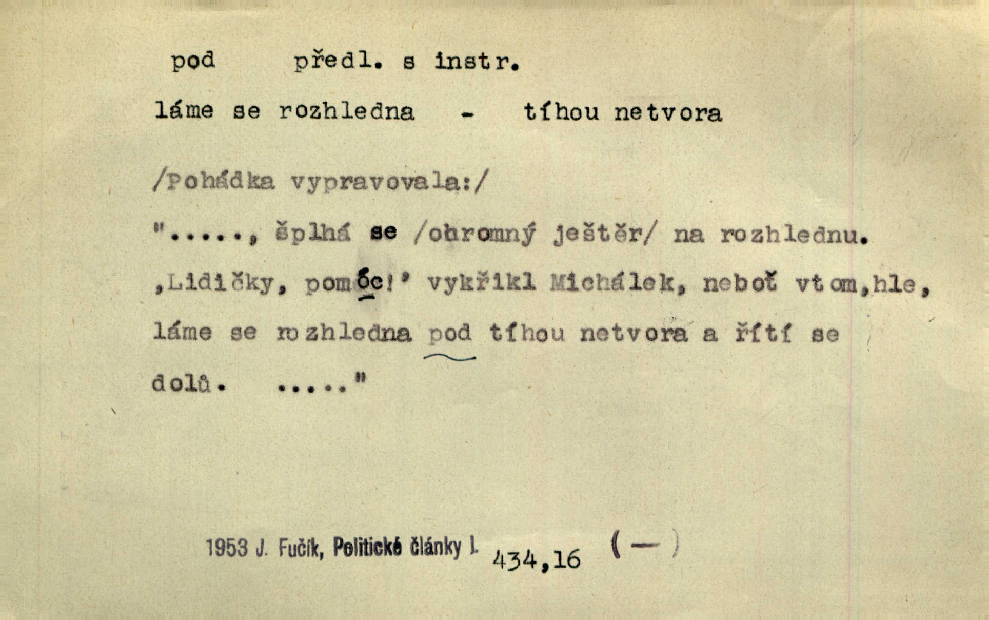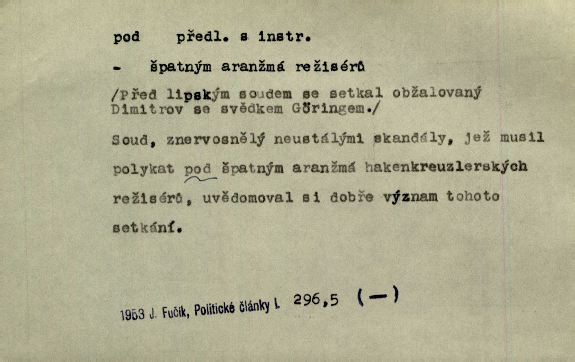 - pod předl. s akus. vyjadřuje směr v prostoru dospodu něčeho n. někoho anebo doleji, níže, než je něco. Rád vcházím pod rodinnou střechu. Čech. Sáhla Žofka pod polštář. Čap. Ch. Rozestíral slámu pod panské koně. Jir. Vůz zatlačil pod kůlnu. Rais. Plukovník hleděl pod sebe. Šmil. Usedl si pod lípu. Šmil. [Vodník] pod vodu tě stáhne. Něm. Nevíš, v co mlátíš, co ti klesne pod nohy. Vrch. [Klíče] věšely se do sednice ke dveřím pod kropenku. Svět. Kdo se sám chce chválit, ať se také pod to podpíše! Havl. Pozdě v noci vrátil se pod tajemný Turov. Jir. A od té doby chodívám vždy pod okénko tvoje. Kraj. Jakmile vydáno jest heslo proti nepříteli, dostavuje se každý pod prapor sám. Hol. Ještě chasníka musím postavit pod míru podrobit odvodu. Herb. Z deště jsem utekl a dostal se pod okap. Něm. Císař Josef vydal leccos, co samo sebou muselo padnouti pod stůl býti opuštěno. Šmil. To jsem já taky huboval, když mně nebožka předložila něco, co mně nejelo pod vous nechutnalo. Her. Mámy někdy mívají podivné brouky. Nejde jim každý pod nos. Herrm. V novinách červeně podtrhávali zprávy o kněžích a pod nos mi je kladli. Baar. Děvče aby zázraky konalo, chce-li se pod čepeček dostati vdáti se. Kosm. D vyjadřuje směr v prostoru od povrchu dovnitř. Pod zimník jsou [kalhoty] dávno dobry. Šim. Aféra mi šla již pod kůži nepříjemně se mne dotýkala. Čap. Ch. Slabost svou pod vědy masku skryjem. Vrch. Já a dobývati se ze zvědavosti pod zámek otvírati paklíčem a pod! Kosm. D vyjadřuje směr k podřízení, k podrobení účinnosti něčeho. Buď z nemoci ihned vyléčiti, buď hlavu úpornou pod meč položiti. Čel. Co jim pod ruku přijde, to snědí. Něm. Peníze uložila do truhly pod sedm zámků. Herb. Prý to buřič, který patří na hrad pod zámek. Jir. Pod obecní pečeť ihned všecko vzali. Čech. Ti všichni vzati jsou od sboru pod přísahu, že v poselství svém věrně chovati se budou. Pal. Sloužíme pod deputát. Baar. Nedám brambory sázet pod motyku, na krátké řádky, ale za hakem. Jir. Pečlivě chystali políčka pod setbu. Baar. Z pěti korců pozemku korec měl pod les. Hol. Míval zde kousek lesa pod dvě míry. Vrba. Co si jiný uloží pod úrok, vaši na vás obětují. Baar. D zvl. vyjadřuje směr k podrobení nějaké moci, síle, vlivu, péči a pod. Rádi by dostali se pod pána jiného. Pal. Chtěli ho dáti pod hodně přísného pána, aby ho napravil. Prav. Statek přišel pod sekvestrací. Havl. [Vláda] dala ostrov pod vojenské právo. Havl. I kázal car mládce pod stráž vzíti. Čel. Odevzdal ženu svoji pod ochranu hospodského. Něm. Prchl do Louvru pod ochranu královny Markéty. Zl. Praha. D vyjadřuje hodnotu nižší, nedosahující jisté meze. Žádné z bab nebylo pod padesát let. Herb. Základní jmění klesá pod úroveň, na níž má býti udržováno dle stanov. Herrm. Pod deset tisíc neprodám. Havl. Tabáku nekoupil nikdo pod několik liber. Ner. Byl idiot, tvor pod obraz boží. A. Mrš. Přišel domů notně pod obraz boží opilý. Rais. U protější zdi se válel junák, zpitý pod obraz. Vrba. D vyjadřuje hranice, mez, pod niž něco sahá. Narovnávala mezi chalupu a tyče smrčí od země až pod střechu. Svět. Zarazím mu pod jílec svůj lesklý bodec do chřtánu. Vrch. Červánky ho polily až pod uši. Prav. Tenkrát jsme ještě neměli chudobinec pod patro. Čap. Ch. Škola pod jedno patro. Svob. D vyjadřuje časovou blízkost. Včera pod samý večer byl mi odevzdán list od bratra. Čel. Přišli bychom tam pod sám večer. Hol. D Dial. vyjadřuje dobu vyplněnou dějem. Postojíte si tu pod chvílu chvíli. Herb. D předl. s instr. vyjadřuje polohu, postavení v prostoru vespod něčeho n. někoho anebo doleji, níže, než je něco. Pod nízkou střechou přebývala spokojenost a láska. Něm. Pod dubem sličná děva sedí. Mácha. Spatřil jsem ji krůčkem drobným pod klenbou stromů pospíchat. Mach. [Teplota] deset pod nulou. Herrm. Kráčel [král] pod korunou v bílém fraku. Jir. Dějí se věci pod sluncem, které ani bůh ani papež odpustiti nemůže. Zey. Jeví se tu, jeví ženě chodba pod zemí. Erb. V okamžení bylo celé údolí pod vodou. Erb. Pálila ho tam země pod nohama. Herb. Pod rukou držel nějaké brošurky. Havl. Není dovoleno chytnouti protivníka pod pasem. Jir. Měl drsné vousy, bradu však pode rtem nezarostlou. Jir. Konečně bylo rachot kočáru pod oknem slyšet. Zey. Venku pod schody stál Šimon. Jir. Stará, roubená stavení pod šindelem. Jir. Voda padala pod městem do Labe. Jan. Hluboký hvozd pod Kazínem. Vrch. Pohněvala vás kterás povídka pod čarou. Herrm. Pod vtipy žádných podpisů nestojí. Hum. kal. Ta dobrá známá svěřila to pod pokličkou své známé tajně. Něm. Pověděla svému hochu, že nosí pod srdcem je těhotná. Vrba. V milém tovaryšstvu zmokl pod sklenkou opil se. Jir. D vyjadřuje polohu, postavení v prostoru vzdálenější od povrchu. Zlatý skví se na prsou háv, ale pod ním bije srdce zrádné. Kamen. Okno bylo ukryto pod úbělem záclon. V. Mrš. Nevidět slunéčka pod mrakem. Čel. Když je nebe pod mrakem, nedařívá se posměch. Ner. Den byl pod mrakem. Rais. Bylo pod mrakem. Jir. Nebyl [vévoda] než hnusným faunem pod maskou nadšeného mecenáše. Zey. Pod pláštíkem ctnosti mnoho se kryje nepravosti. Čel. Dni pod svou zdánlivou jednotvárností skrývaly více nehod a žalostí. Šmil. Mlatci se pod kůží smáli v duchu, tajně. Herb. D vyjadřuje podrobení, podřízení účinnosti, působení něčeho. Jan Kozina pod rukou kata kles. Vrch. Lesy pod toporem padnou. Jg. Bylo jí nevolno pod pohledem těch očí. Rais. Paní měla vše pod klíčem zamčeno. Něm. Tu věc musíme míti na papíře a pod kolkem. Herb. Jeden kostelník pod přísahou chtěl potvrditi, že Hanka rukopi