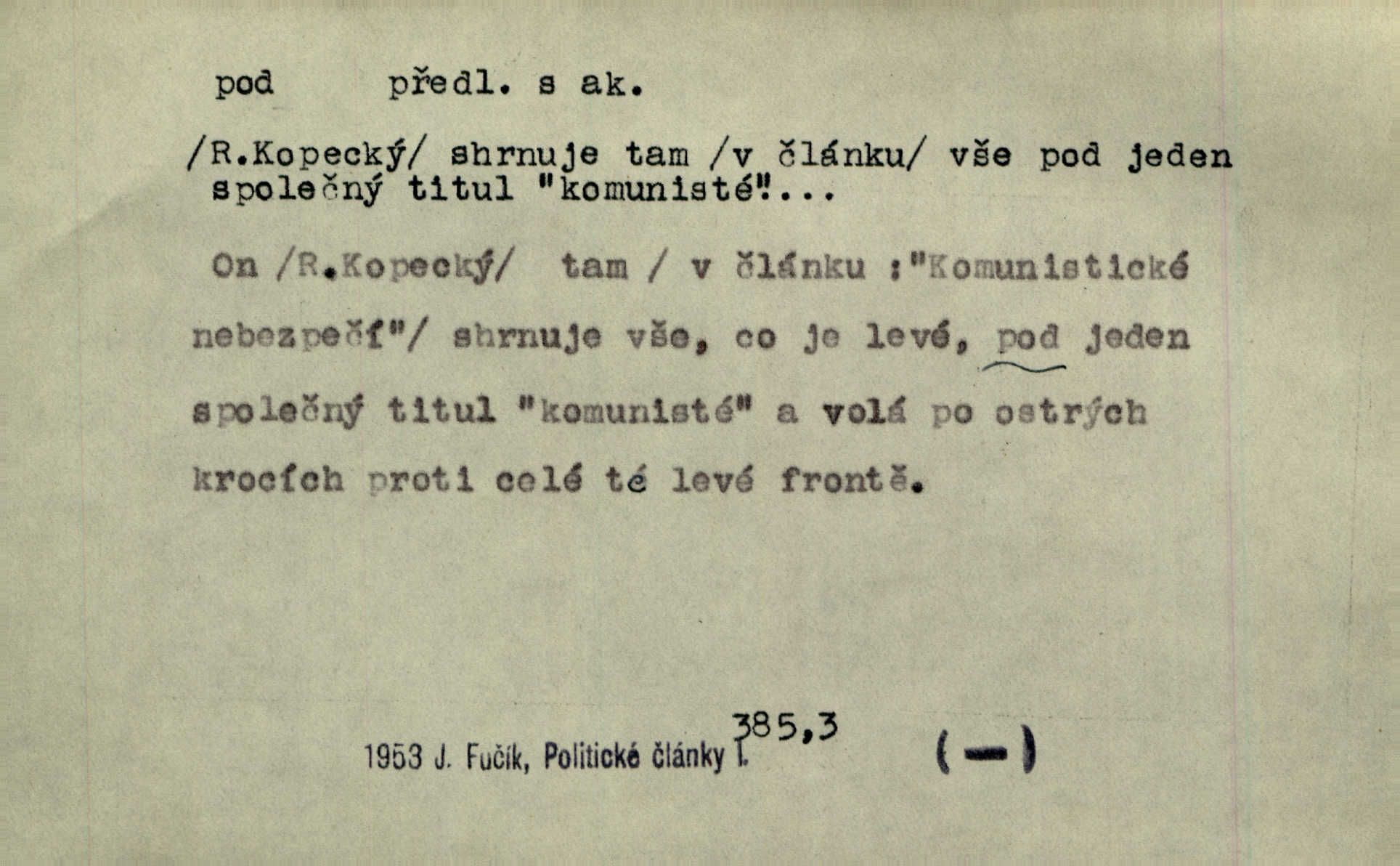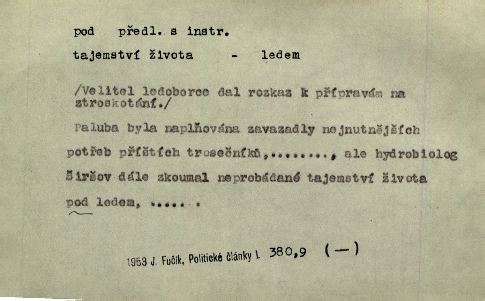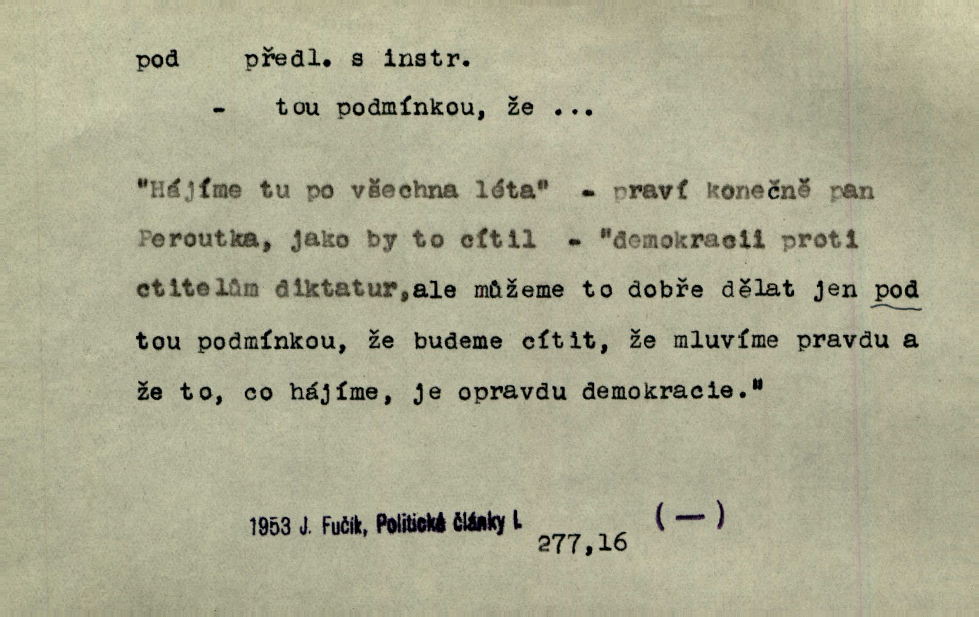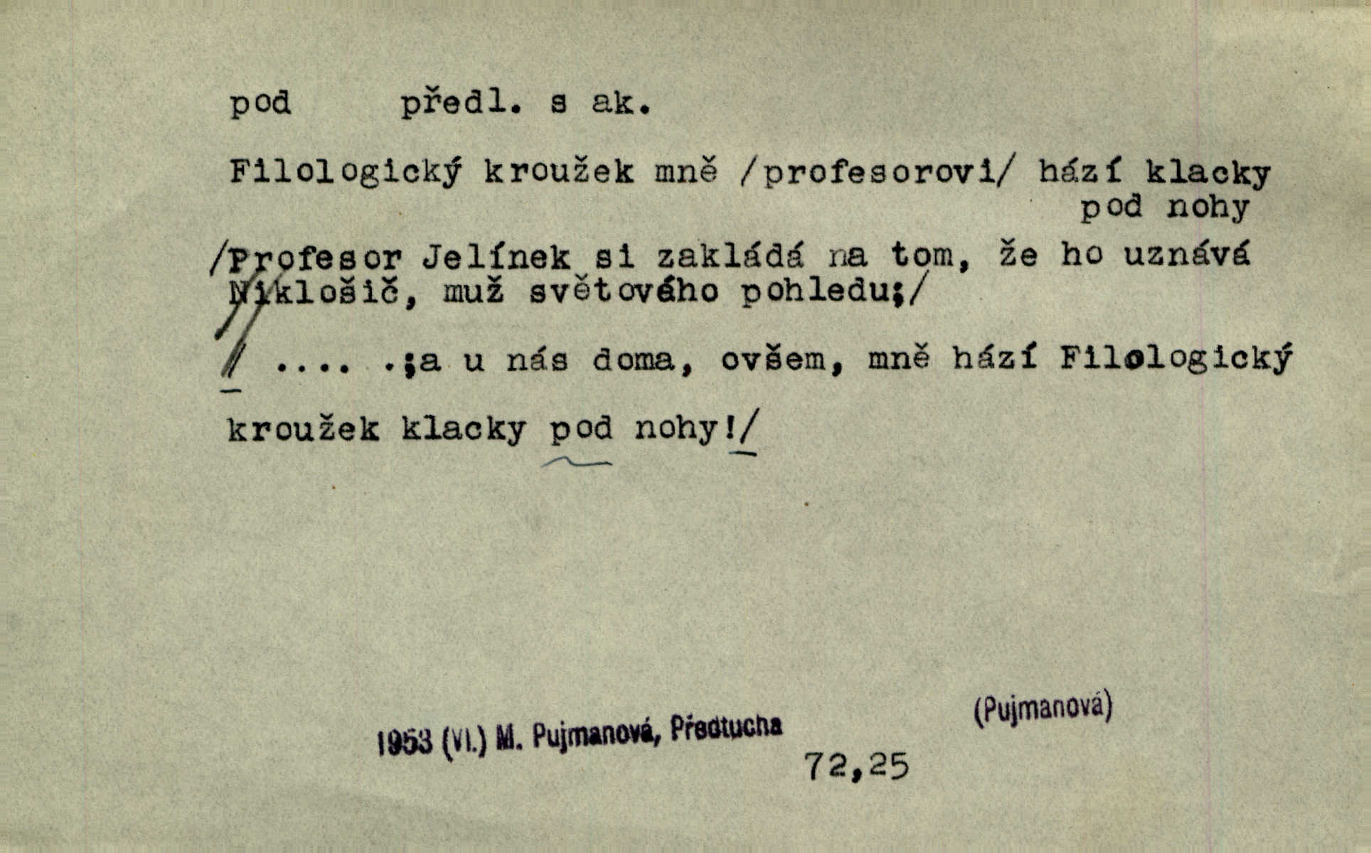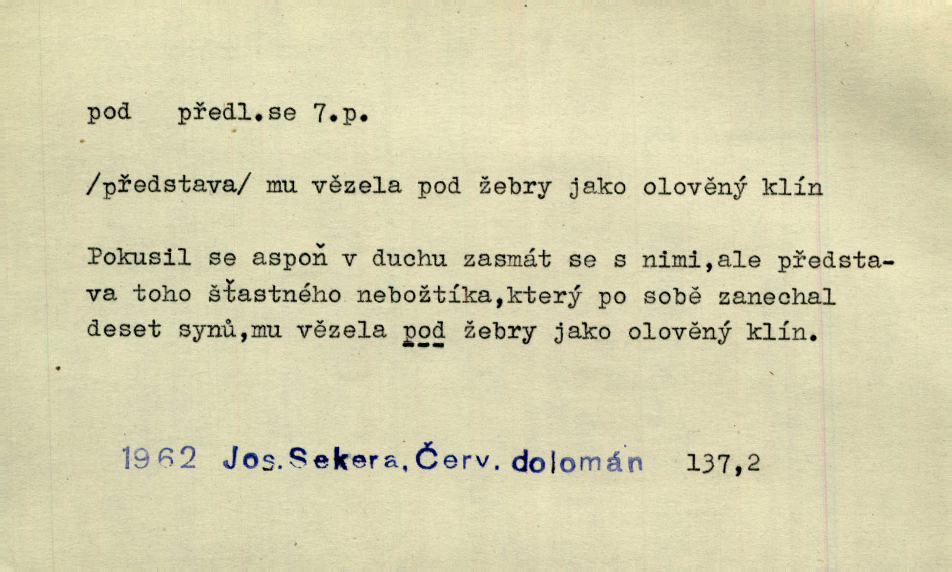 - pod předl. s akus. vyjadřuje směr v prostoru dospodu něčeho n. někoho anebo doleji, níže, než je něco. Rád vcházím pod rodinnou střechu. Čech. Sáhla Žofka pod polštář. Čap. Ch. Rozestíral slámu pod panské koně. Jir. Vůz zatlačil pod kůlnu. Rais. Plukovník hleděl pod sebe. Šmil. Usedl si pod lípu. Šmil. [Vodník] pod vodu tě stáhne. Něm. Nevíš, v co mlátíš, co ti klesne pod nohy. Vrch. [Klíče] věšely se do sednice ke dveřím pod kropenku. Svět. Kdo se sám chce chválit, ať se také pod to podpíše! Havl. Pozdě v noci vrátil se pod tajemný Turov. Jir. A od té doby chodívám vždy pod okénko tvoje. Kraj. Jakmile vydáno jest heslo proti nepříteli, dostavuje se každý pod prapor sám. Hol. Ještě chasníka musím postavit pod míru podrobit odvodu. Herb. Z deště jsem utekl a dostal se pod okap. Něm. Císař Josef vydal leccos, co samo sebou muselo padnouti pod stůl býti opuštěno. Šmil. To jsem já taky huboval, když mně nebožka předložila něco, co mně nejelo pod vous nechutnalo. Her. Mámy někdy mívají podivné brouky. Nejde jim každý pod nos. Herrm. V novinách červeně podtrhávali zprávy o kněžích a pod nos mi je kladli. Baar. Děvče aby zázraky konalo, chce-li se pod čepeček dostati vdáti se. Kosm. D vyjadřuje směr v prostoru od povrchu dovnitř. Pod zimník jsou [kalhoty] dávno dobry. Šim. Aféra mi šla již pod kůži nepříjemně se mne dotýkala. Čap. Ch. Slabost svou pod vědy masku skryjem. Vrch. Já a dobývati se ze zvědavosti pod zámek otvírati paklíčem a pod! Kosm. D vyjadřuje směr k podřízení, k podrobení účinnosti něčeho. Buď z nemoci ihned vyléčiti, buď hlavu úpornou pod meč položiti. Čel. Co jim pod ruku přijde, to snědí. Něm. Peníze uložila do truhly pod sedm zámků. Herb. Prý to buřič, který patří na hrad pod zámek. Jir. Pod obecní pečeť ihned všecko vzali. Čech. Ti všichni vzati jsou od sboru pod přísahu, že v poselství svém věrně chovati se budou. Pal. Sloužíme pod deputát. Baar. Nedám brambory sázet pod motyku, na krátké řádky, ale za hakem. Jir. Pečlivě chystali políčka pod setbu. Baar. Z pěti korců pozemku korec měl pod les. Hol. Míval zde kousek lesa pod dvě míry. Vrba. Co si jiný uloží pod úrok, vaši na vás obětují. Baar. D zvl. vyjadřuje směr k podrobení nějaké moci, síle, vlivu, péči a pod. Rádi by dostali se pod pána jiného. Pal. Chtěli ho dáti pod hodně přísného pána, aby ho napravil. Prav. Statek přišel pod sekvestrací. Havl. [Vláda] dala ostrov pod vojenské právo. Havl. I kázal car mládce pod stráž vzíti. Čel. Odevzdal ženu svoji pod ochranu hospodského. Něm. Prchl do Louvru pod ochranu královny Markéty. Zl. Praha. D vyjadřuje hodnotu nižší, nedosahující jisté meze. Žádné z bab nebylo pod padesát let. Herb. Základní jmění klesá pod úroveň, na níž má býti udržováno dle stanov. Herrm. Pod deset tisíc neprodám. Havl. Tabáku nekoupil nikdo pod několik liber. Ner. Byl idiot, tvor pod obraz boží. A. Mrš. Přišel domů notně pod obraz boží opilý. Rais. U protější zdi se válel junák, zpitý pod obraz. Vrba. D vyjadřuje hranice, mez, pod niž něco sahá. Narovnávala mezi chalupu a tyče smrčí od země až pod střechu. Svět. Zarazím mu pod jílec svůj lesklý bodec do chřtánu. Vrch. Červánky ho polily až pod uši. Prav. Tenkrát jsme ještě neměli chudobinec pod patro. Čap. Ch. Škola pod jedno patro. Svob. D vyjadřuje časovou blízkost. Včera pod samý večer byl mi odevzdán list od bratra. Čel. Přišli bychom tam pod sám večer. Hol. D Dial. vyjadřuje dobu vyplněnou dějem. Postojíte si tu pod chvílu chvíli. Herb. D předl. s instr. vyjadřuje polohu, postavení v prostoru vespod něčeho n. někoho anebo doleji, níže, než je něco. Pod nízkou střechou přebývala spokojenost a láska. Něm. Pod dubem sličná děva sedí. Mácha. Spatřil jsem ji krůčkem drobným pod klenbou stromů pospíchat. Mach. [Teplota] deset pod nulou. Herrm. Kráčel [král] pod korunou v bílém fraku. Jir. Dějí se věci pod sluncem, které ani bůh ani papež odpustiti nemůže. Zey. Jeví se tu, jeví ženě chodba pod zemí. Erb. V okamžení bylo celé údolí pod vodou. Erb. Pálila ho tam země pod nohama. Herb. Pod rukou držel nějaké brošurky. Havl. Není dovoleno chytnouti protivníka pod pasem. Jir. Měl drsné vousy, bradu však pode rtem nezarostlou. Jir. Konečně bylo rachot kočáru pod oknem slyšet. Zey. Venku pod schody stál Šimon. Jir. Stará, roubená stavení pod šindelem. Jir. Voda padala pod městem do Labe. Jan. Hluboký hvozd pod Kazínem. Vrch. Pohněvala vás kterás povídka pod čarou. Herrm. Pod vtipy žádných podpisů nestojí. Hum. kal. Ta dobrá známá svěřila to pod pokličkou své známé tajně. Něm. Pověděla svému hochu, že nosí pod srdcem je těhotná. Vrba. V milém tovaryšstvu zmokl pod sklenkou opil se. Jir. D vyjadřuje polohu, postavení v prostoru vzdálenější od povrchu. Zlatý skví se na prsou háv, ale pod ním bije srdce zrádné. Kamen. Okno bylo ukryto pod úbělem záclon. V. Mrš. Nevidět slunéčka pod mrakem. Čel. Když je nebe pod mrakem, nedařívá se posměch. Ner. Den byl pod mrakem. Rais. Bylo pod mrakem. Jir. Nebyl [vévoda] než hnusným faunem pod maskou nadšeného mecenáše. Zey. Pod pláštíkem ctnosti mnoho se kryje nepravosti. Čel. Dni pod svou zdánlivou jednotvárností skrývaly více nehod a žalostí. Šmil. Mlatci se pod kůží smáli v duchu, tajně. Herb. D vyjadřuje podrobení, podřízení účinnosti, působení něčeho. Jan Kozina pod rukou kata kles. Vrch. Lesy pod toporem padnou. Jg. Bylo jí nevolno pod pohledem těch očí. Rais. Paní měla vše pod klíčem zamčeno. Něm. Tu věc musíme míti na papíře a pod kolkem. Herb. Jeden kostelník pod přísahou chtěl potvrditi, že Hanka rukopi
