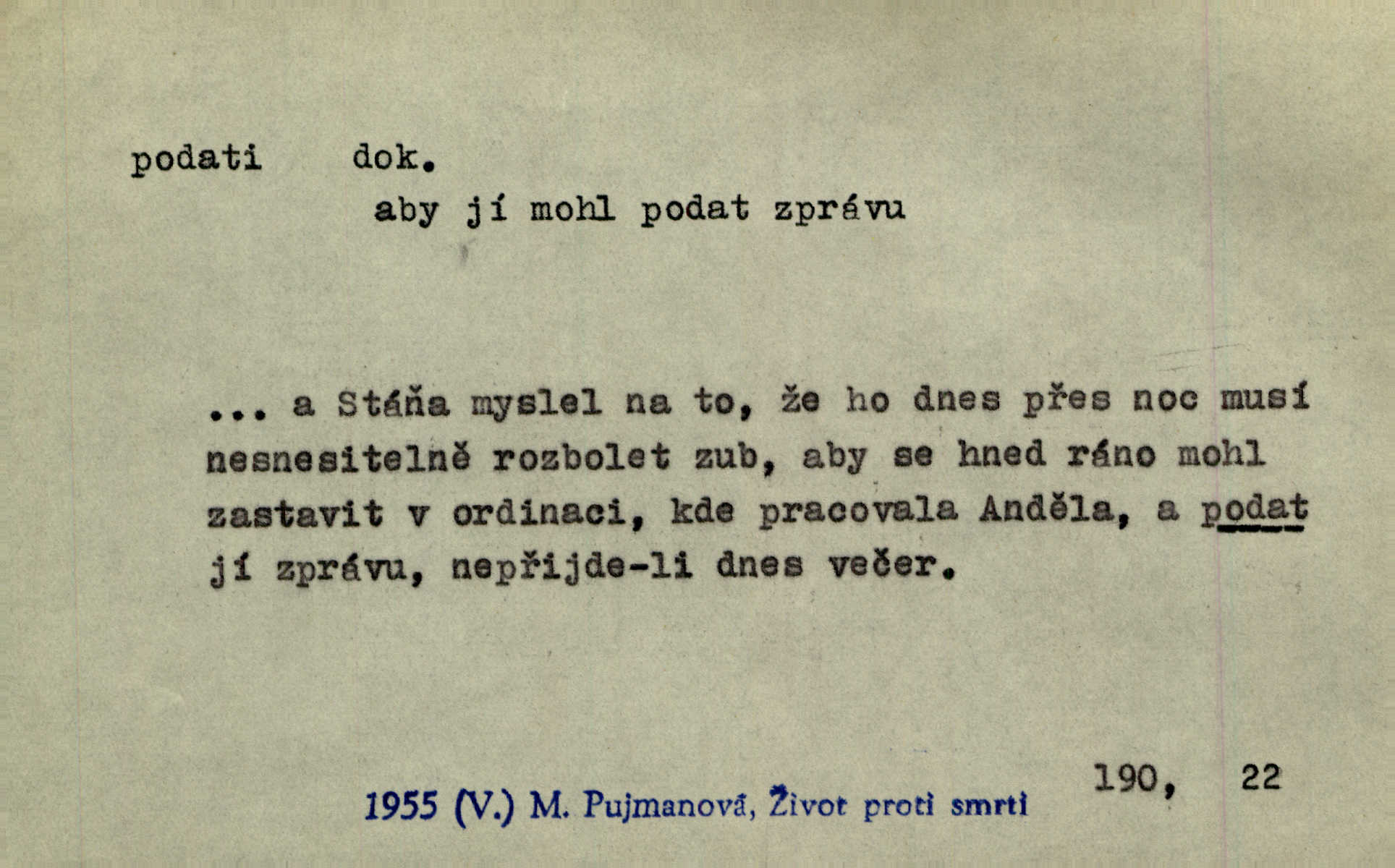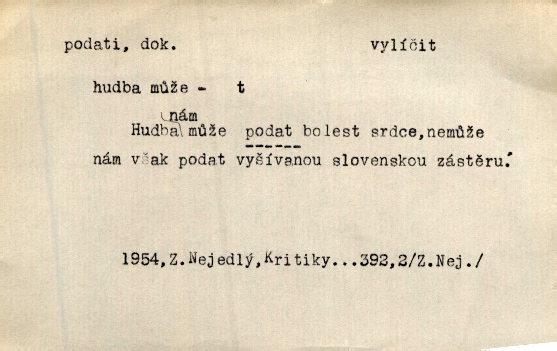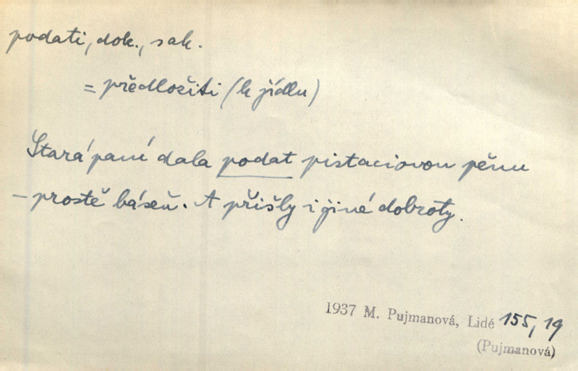 - podati dok. (co, zř. čeho komu) přiblížiti z malé vzdálenosti něco někomu do rukou n. do blízkosti, obyč. rukou n. nástrojem. Čekal, až mu kostelník podá ze stojanu poslední knihu. Jir. Papír a tužka byly brzo po ruce, paní továrnice sama podala jí je z psacího stolu. Svět. Pan Peldřimovský podal list ke čtení panu Gebhardovi. J. J. Kol. [Teta] sňala se zdi fotografii a podala mi ji. Šim. Pan vrchní korektor podél nové redakční korektury udělal dvě červené čáry a podal dál. Čap. Ch. Vstávej, umrlče, hola, hou! A podej mi sem tu živou! Erb. [Studýnka] děkoval za úctu, napil se, zase si podal. A. Mrš. Ustál. sp. U nich si do roka podalo dvéře mnoho příchozích vystřídalo se. Hol. Tomu ona nerozumí, to jí musíte podat po lopatě říci zřetelně, jasně. Štol. Když nechápete, podám vám to po lopatě. Klost. Sport. slang. hoditi neb kopnouti míč někomu. „Podej! Piš!“ ozývalo se z hřiště. Pujmanová. D předložiti, poskytnouti jako pokrm n. nápoj. Ne hned mělo k zpěvu dojíti, teprve až bude dámám podán čaj s keksy a pánům likéry. Čap. Ch. Pomona podala mi chleba a medu a vody. Zey. Císaři podali láhev čerstvého vína. Herb. Matka byla ráda, že mohla svým milým něco lepšího podati. Svět. Cizinec byl kazatel, jenž před třemi lety podal večeři Páně v Mezřiči staré Klancové. Jir. [Arcibiskup] byl u sv. přijímání — sám papež mu podal. Hol. Je to člověk, jemuž nejsi hoden vody podat. Kun. Ustál. sp. Jeho nástupce mu vody nepodal, pokud se týče znalosti věci nemohl se s ním rovnat. Klost. Lucina i se všemi penězi přece ti vody nepodá. Něm. D (o ruce, paži) napřáhnouti, vztáhnouti, na př. k pomoci, k pozdravu stiskem a p. Mohli mu snadno podati ruku nebo provaz a vytáhnouti jej na skálu. Herb. Nebylo nikoho, kdo by podal pomocné ruky pomohl. Staš. Pečuj o moc a zvelebení domu svého v mezích zákona a rád ti podám ke všemu ruky pomocné. Vrch. Podejme si na rozchod po přátelsku ruku. Něm. Podal pravici synu jako na znamení svého svolení. Pfleg. Potom třetí výbor podal jí rámě, aby ji uvedl do sálu. Herrm. Podala jsem ruku muži mně docela neznámému provdala se. J. z Hv. Nemůžeme chtít svoje neštěstí, krk podat noži. Svět. D předložiti úřadu a p. Podáme písemnou žádost, ale musilo by se nás na ni kolik podepsat. Jir. Podal v Jičíně žalobu, a došlo k soudní rozepři. Staš. Podej si, pane, žalobu na soudě zemském! Třeb. Zatím se rozleželo Hoňkovi, že by pro tu ceduli s podpisy mohlo pojít zle, kdyby ji podali. Jir. Parapin musel jít, musel podat demisi. Zaor. Kniha způsobila značný rozruch; autor podal ji za disertaci k dosažení doktorátu na universitě charkovské. Naše d. Byl již loni podán výboru návrh, aby také dámy platily vstupné. Herrm. V jejích dobrých očích četl jsem pravé vysvětlení, proč pan Kříž nepodal větší účet. Šim. D nabídnouti, zvl. při koupi. Pojednou o mé koně nikdo nestál, jako když si řeknou; ani nikdo nic nepodal. Hál. Obecenstvo, tratíc víry k poctivé práci, zdráhá se slušnou cenu podati. Don. Tak velice žádala Kadiža pojistiti si jeho služby, že mu podala dvojí mzdu, aby vedl karavanu, jižto chtěla vyslati do Syrie. Rieg. Ubohý Jarý dlouho se načeká, než bude moci ženě podati toho postavení. Podl. D zobraziti, znázorniti, vytvořiti, představiti a p., zvl. o uměleckém tvoření, zprávě, poučení a p. Průvod všech cechů podal obraz zbývajícího ještě statného mužstva. Ner. Slabé péro mé dovede Ti jen podati prostou skizzu! Jedl. Menennius [p. Kolárem ml-] byl velmi pěkně podán. Zl. Praha. Řada portretů z ulice, z denního života bez veškeré pretense umělecké, a přece vše podáno s dokonalým, vzácným uměním. Vrch. Tynda podá hlasově i pěvecky výkon skvělý. Čap. Ch. Doma si [kaplan] dával ukrutnou práci, ale na kazatelně z toho mnoho nebylo, neuměl to podat. Rais. Pan vrchní inženýr podá stručný odborný výklad o naší turbině! Čap. Ch. Podal pánům bratrům zprávu, jak pochodil na hradě. Jir. Xaver nepodal nikdy vysvětlení o náhodě, kteráž ho zmrzačila. Zey. [Doubenus] podal raport. Jir. D poskytnouti, dáti, věnovati. Majetník každý té zahrady podá desátek ze statku i sadu božstvu v oběť. Zey. Kochal se v rozkoších, jakýchž jen svět podati může. Něm. Tuto vůni ať syn tvůj své ženě darem podá. Zey. Podány [na museum] summy veliké i malé od vlastenců každého stavu. Pal. Bylo mu poslouženo od paní správcové vším, co její kuchyně a špižírna podati dovedly. Podl. Text podal skladateli dosti příležitosti k charakterisování duševních citů. Zl. Praha. Můžete mi podati záruku svého — mého štěstí? Herrm. Jen malý důkaz podal jsem ti lásky. Pfleg. Podám ti nových důkazů! Zey. D (koho kam) arch. dodati, dopraviti. Místodržící podali Hosiána a Rovenského k právu Starého Města Pražského, kde oba držáni byli v arestu. Pekárek. [Šlechtici] utekli s vězněm svým do jižních Čech a podali ho až do Rakous. Pal. Nemohlili [sousedé] zločince samého vypátrati a ku popravě podati, všichni společně uloženou na zločin ten pokutu platiti museli. Pal. D (koho) arch. ustanoviti, jmenovati, navrhnouti, presentovati. Okolo roku 1329 podal Menhart vlastního bratra svého za faráře, kterýž také došel biskupského stvrzení. Tomek. Kněz Šimon Cerasýn jest od administratora a konsistoře arcibiskupství pražského pod obojí způsobou přijímajících podán. Win. D (co, čeho komu) arch. a dial. říci, pronésti. Podal mi ošklivých jmen. Win. Řeči zlé, co si byli podali, cechmistři z práva svého oběma zdvihli. Win. Jen obratně jim podej, že očekávám výplatu věna hned, úplně a v hotovosti. Hol. Najednou jsme byli v sobě. Podal slovo, já jemu dvě. V. Mrš.