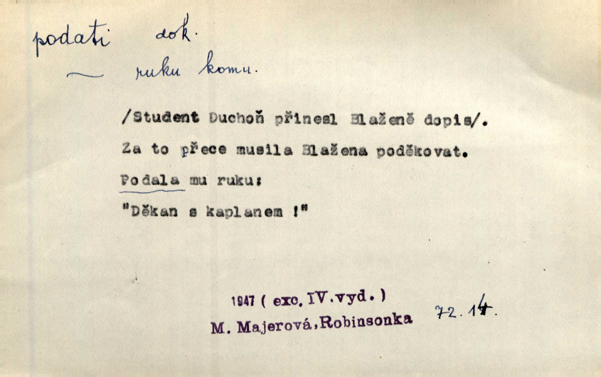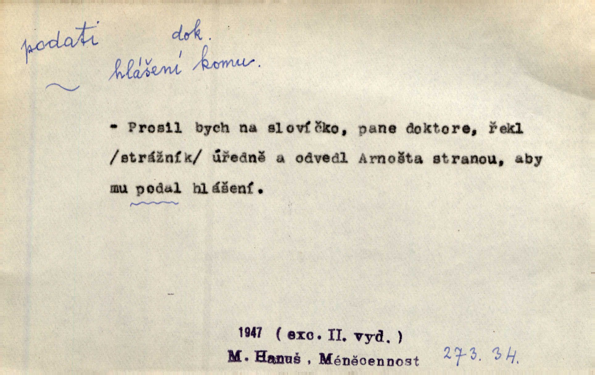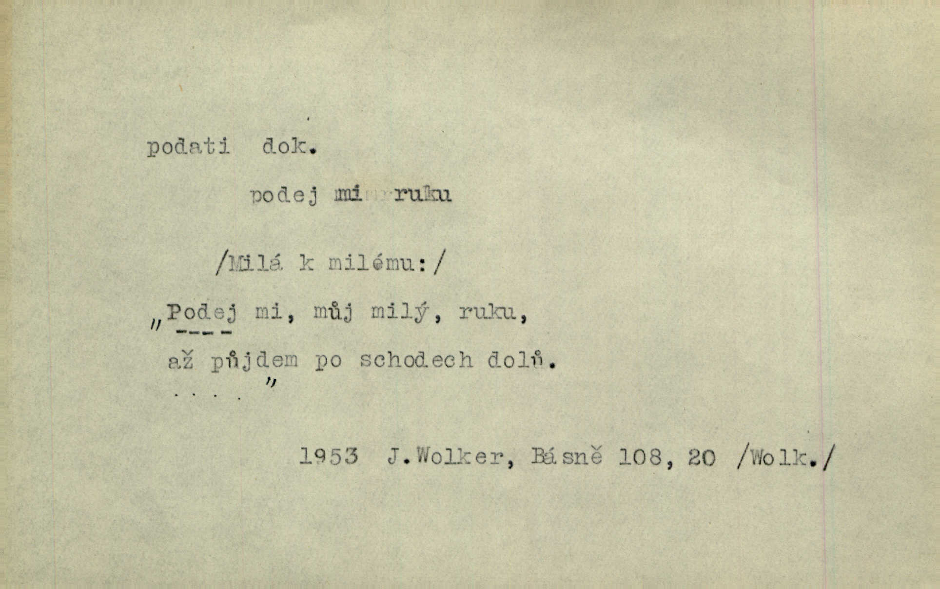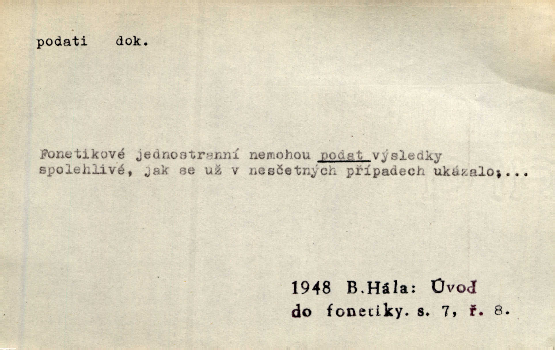 - podati dok. (co, zř. čeho komu) přiblížiti z malé vzdálenosti něco někomu do rukou n. do blízkosti, obyč. rukou n. nástrojem. Čekal, až mu kostelník podá ze stojanu poslední knihu. Jir. Papír a tužka byly brzo po ruce, paní továrnice sama podala jí je z psacího stolu. Svět. Pan Peldřimovský podal list ke čtení panu Gebhardovi. J. J. Kol. [Teta] sňala se zdi fotografii a podala mi ji. Šim. Pan vrchní korektor podél nové redakční korektury udělal dvě červené čáry a podal dál. Čap. Ch. Vstávej, umrlče, hola, hou! A podej mi sem tu živou! Erb. [Studýnka] děkoval za úctu, napil se, zase si podal. A. Mrš. Ustál. sp. U nich si do roka podalo dvéře mnoho příchozích vystřídalo se. Hol. Tomu ona nerozumí, to jí musíte podat po lopatě říci zřetelně, jasně. Štol. Když nechápete, podám vám to po lopatě. Klost. Sport. slang. hoditi neb kopnouti míč někomu. „Podej! Piš!“ ozývalo se z hřiště. Pujmanová. D předložiti, poskytnouti jako pokrm n. nápoj. Ne hned mělo k zpěvu dojíti, teprve až bude dámám podán čaj s keksy a pánům likéry. Čap. Ch. Pomona podala mi chleba a medu a vody. Zey. Císaři podali láhev čerstvého vína. Herb. Matka byla ráda, že mohla svým milým něco lepšího podati. Svět. Cizinec byl kazatel, jenž před třemi lety podal večeři Páně v Mezřiči staré Klancové. Jir. [Arcibiskup] byl u sv. přijímání — sám papež mu podal. Hol. Je to člověk, jemuž nejsi hoden vody podat. Kun. Ustál. sp. Jeho nástupce mu vody nepodal, pokud se týče znalosti věci nemohl se s ním rovnat. Klost. Lucina i se všemi penězi přece ti vody nepodá. Něm. D (o ruce, paži) napřáhnouti, vztáhnouti, na př. k pomoci, k pozdravu stiskem a p. Mohli mu snadno podati ruku nebo provaz a vytáhnouti jej na skálu. Herb. Nebylo nikoho, kdo by podal pomocné ruky pomohl. Staš. Pečuj o moc a zvelebení domu svého v mezích zákona a rád ti podám ke všemu ruky pomocné. Vrch. Podejme si na rozchod po přátelsku ruku. Něm. Podal pravici synu jako na znamení svého svolení. Pfleg. Potom třetí výbor podal jí rámě, aby ji uvedl do sálu. Herrm. Podala jsem ruku muži mně docela neznámému provdala se. J. z Hv. Nemůžeme chtít svoje neštěstí, krk podat noži. Svět. D předložiti úřadu a p. Podáme písemnou žádost, ale musilo by se nás na ni kolik podepsat. Jir. Podal v Jičíně žalobu, a došlo k soudní rozepři. Staš. Podej si, pane, žalobu na soudě zemském! Třeb. Zatím se rozleželo Hoňkovi, že by pro tu ceduli s podpisy mohlo pojít zle, kdyby ji podali. Jir. Parapin musel jít, musel podat demisi. Zaor. Kniha způsobila značný rozruch; autor podal ji za disertaci k dosažení doktorátu na universitě charkovské. Naše d. Byl již loni podán výboru návrh, aby také dámy platily vstupné. Herrm. V jejích dobrých očích četl jsem pravé vysvětlení, proč pan Kříž nepodal větší účet. Šim. D nabídnouti, zvl. při koupi. Pojednou o mé koně nikdo nestál, jako když si řeknou; ani nikdo nic nepodal. Hál. Obecenstvo, tratíc víry k poctivé práci, zdráhá se slušnou cenu podati. Don. Tak velice žádala Kadiža pojistiti si jeho služby, že mu podala dvojí mzdu, aby vedl karavanu, jižto chtěla vyslati do Syrie. Rieg. Ubohý Jarý dlouho se načeká, než bude moci ženě podati toho postavení. Podl. D zobraziti, znázorniti, vytvořiti, představiti a p., zvl. o uměleckém tvoření, zprávě, poučení a p. Průvod všech cechů podal obraz zbývajícího ještě statného mužstva. Ner. Slabé péro mé dovede Ti jen podati prostou skizzu! Jedl. Menennius [p. Kolárem ml-] byl velmi pěkně podán. Zl. Praha. Řada portretů z ulice, z denního života bez veškeré pretense umělecké, a přece vše podáno s dokonalým, vzácným uměním. Vrch. Tynda podá hlasově i pěvecky výkon skvělý. Čap. Ch. Doma si [kaplan] dával ukrutnou práci, ale na kazatelně z toho mnoho nebylo, neuměl to podat. Rais. Pan vrchní inženýr podá stručný odborný výklad o naší turbině! Čap. Ch. Podal pánům bratrům zprávu, jak pochodil na hradě. Jir. Xaver nepodal nikdy vysvětlení o náhodě, kteráž ho zmrzačila. Zey. [Doubenus] podal raport. Jir. D poskytnouti, dáti, věnovati. Majetník každý té zahrady podá desátek ze statku i sadu božstvu v oběť. Zey. Kochal se v rozkoších, jakýchž jen svět podati může. Něm. Tuto vůni ať syn tvůj své ženě darem podá. Zey. Podány [na museum] summy veliké i malé od vlastenců každého stavu. Pal. Bylo mu poslouženo od paní správcové vším, co její kuchyně a špižírna podati dovedly. Podl. Text podal skladateli dosti příležitosti k charakterisování duševních citů. Zl. Praha. Můžete mi podati záruku svého — mého štěstí? Herrm. Jen malý důkaz podal jsem ti lásky. Pfleg. Podám ti nových důkazů! Zey. D (koho kam) arch. dodati, dopraviti. Místodržící podali Hosiána a Rovenského k právu Starého Města Pražského, kde oba držáni byli v arestu. Pekárek. [Šlechtici] utekli s vězněm svým do jižních Čech a podali ho až do Rakous. Pal. Nemohlili [sousedé] zločince samého vypátrati a ku popravě podati, všichni společně uloženou na zločin ten pokutu platiti museli. Pal. D (koho) arch. ustanoviti, jmenovati, navrhnouti, presentovati. Okolo roku 1329 podal Menhart vlastního bratra svého za faráře, kterýž také došel biskupského stvrzení. Tomek. Kněz Šimon Cerasýn jest od administratora a konsistoře arcibiskupství pražského pod obojí způsobou přijímajících podán. Win. D (co, čeho komu) arch. a dial. říci, pronésti. Podal mi ošklivých jmen. Win. Řeči zlé, co si byli podali, cechmistři z práva svého oběma zdvihli. Win. Jen obratně jim podej, že očekávám výplatu věna hned, úplně a v hotovosti. Hol. Najednou jsme byli v sobě. Podal slovo, já jemu dvě. V. Mrš.