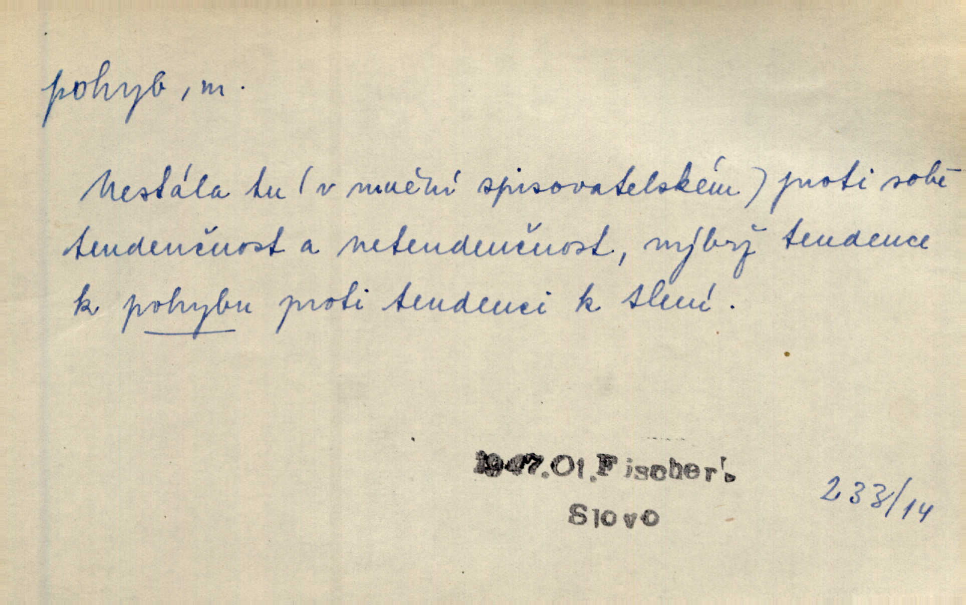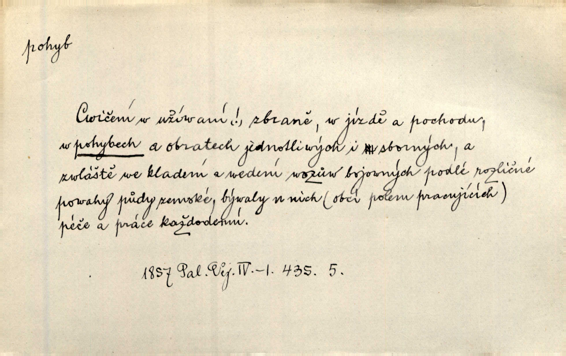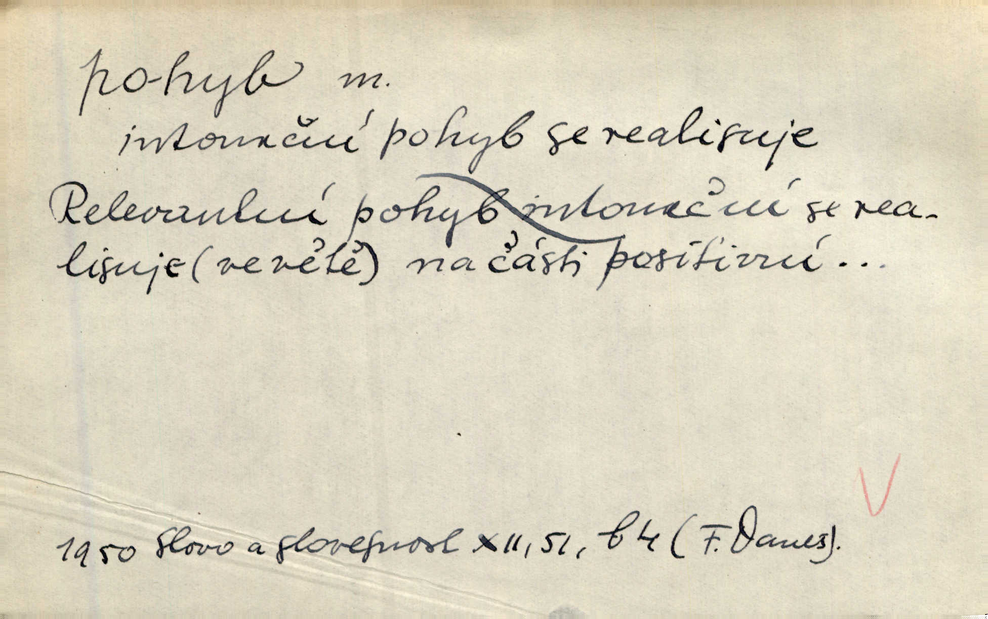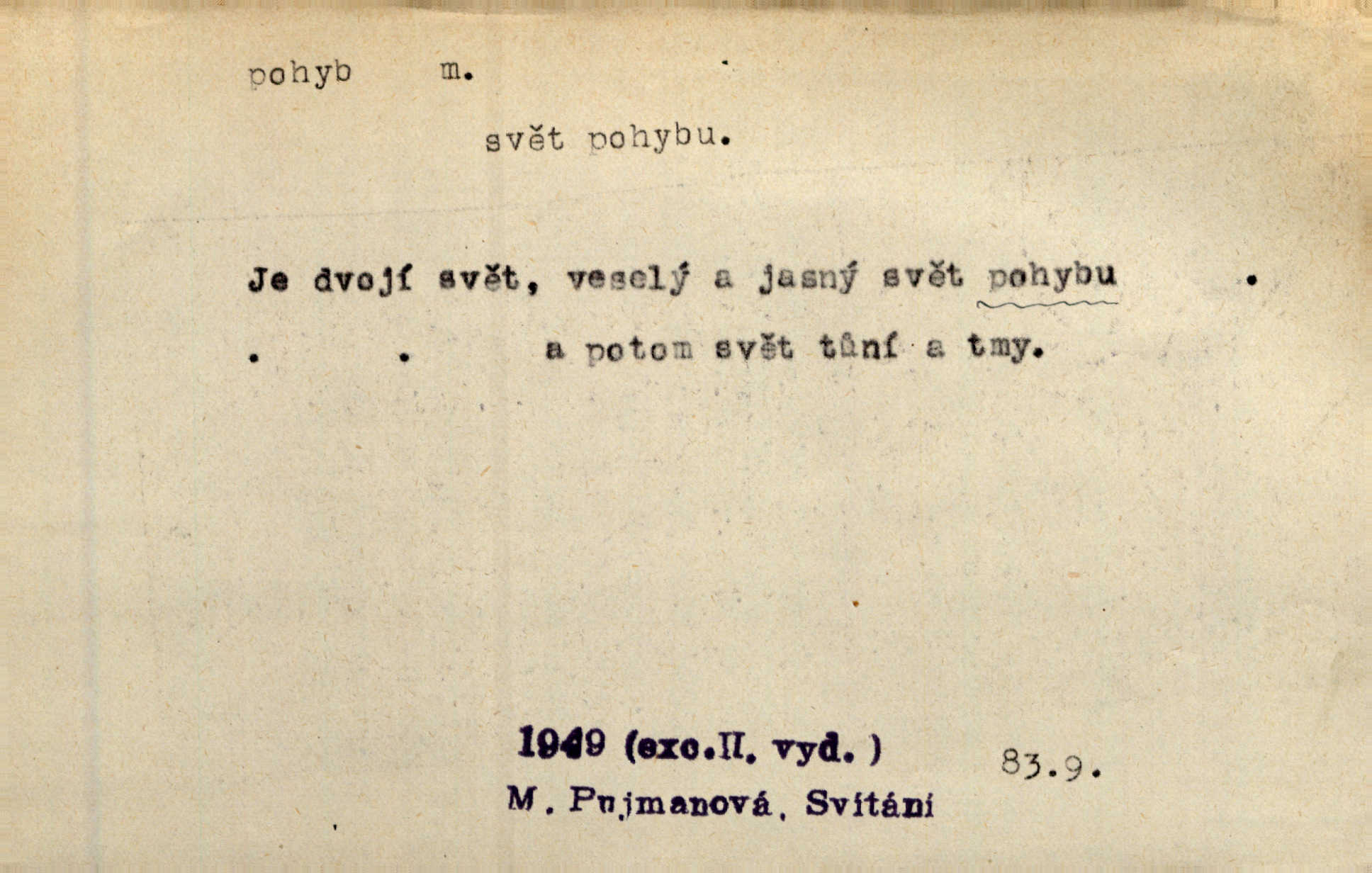 - pohyb, -u m. změna polohy těla n. některé jeho části. Svá slova provázel bezděčnými pohyby. Dyk. Děkan kulatým, vyškoleným pohybem přehodil štolu přes ruce snoubenců. Til. Přivítal ji několikerým pohybem hlavy. Rais. Cikán komediantským pohybem krku, rukou a celého těla dává bolesť na jevo. V. Mrš. Pes u mých nohou bez pohybu sedí. Mach. Každý pohyb Vácslavův byl mladě svěží. Ner. Pozoroval splašené, nezřízené pohyby svého Floka. V. Mrš. Každý jeho pohyb byl vždy odměřený. Svět. Fysiol. pohyb pudový, reflexní, vědomý. D změna polohy tělesa v prostoru. Přívozník s pomocníkem přivedli prám do pohybu. Kun. Selka uváděla hejčedlo v houpavý pohyb. Jir. Co tam větvemi se míhá? Kníže juž běh svého vrance staví a každý pohyb větví čile stíhá. Pfleg. Fys. pohyb přímočarý, křivočarý, postupný, otáčivý, kmitavý a j. Geol. pohyb epirogenetický (horotvorný), tektonický a j. Voj. pohyby vojska posuny, přesuny. D stále se opakující n. souvislé pohybování, kolování, činnost něčeho, oběh, cirkulace. Pohyb nebeských těles je vlastně jen tancem. Ner. Můj život jest mnohem jednotvárnější než pohyb hvězd. Vrch. Rozmanití cizinci, vířivá hudba a celý majestátní pohyb lidstva [v Benátkách] — je to obraz nade všechen popis krásný! Ner. Kolik prostředků technických i peněžních bylo tu [na světové výstavě] uváděno v pohyb, aby bylo lze zmocniti se diváka. Přít. Astron. pohyb denní, roční, sekulární a j. Hud. postup hlasů: pohyb rovný, smíšený a j.; rychlost hry, tempo: pohyb klidný, pomalý, rychlý a j. D stálá změna, stálé nabývání jiného vzhledu, rázu, podoby. [Básníci] vidí před sebou svět v pohybu a proměně. Götz. Po pět a půl roku není přesnějších měřítek pro posouzení pohybu životní úrovně. Právo l. Půda není zboží a její prodej znamená více než pohyb statku od výrobce ke spotřebiteli. Čteme. Jsou v politice jen dvě věci těžky, jedna: pohyb rozpoutat, druhá: pohyb v pravý čas zarazit. Ner. Březina je básník dramatický, plný vnitřního pohybu a vlnění. Šal. Sociol. pohyb obyvatelstva změna v jeho počtu. Obch. pohyb cen měnění cen (snížení n. zvýšení); pohyb zboží souhrn změn ve stavu zboží (nákup a prodej).