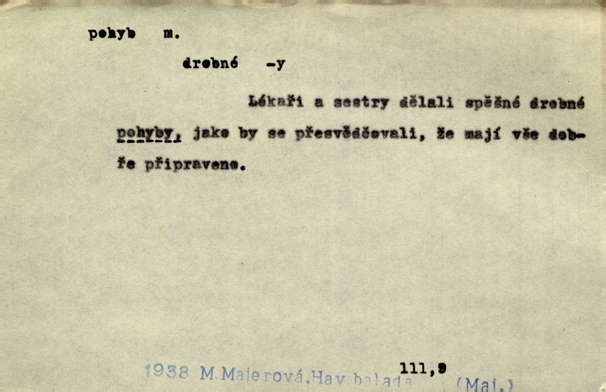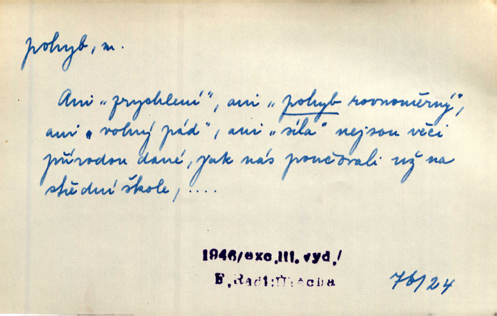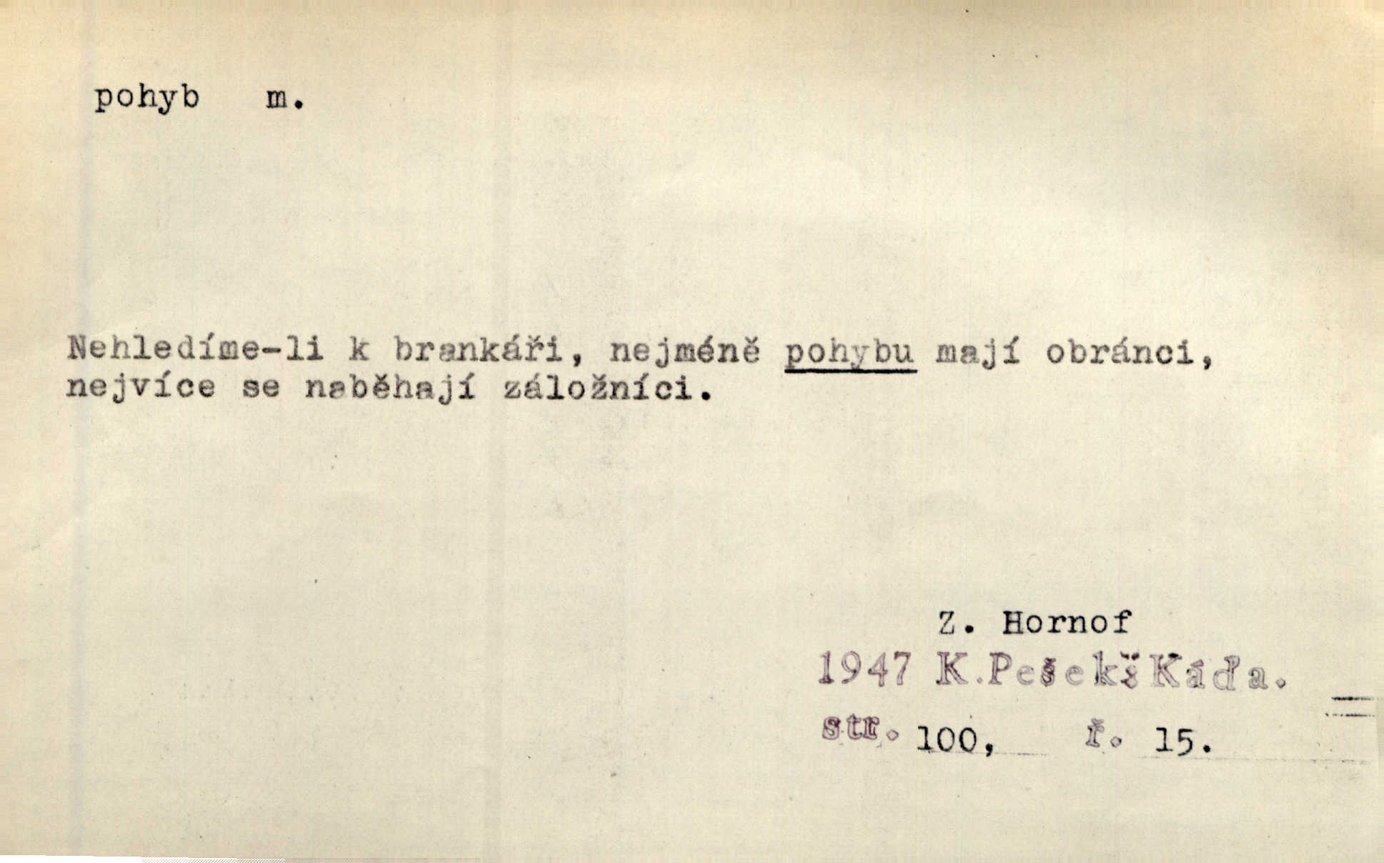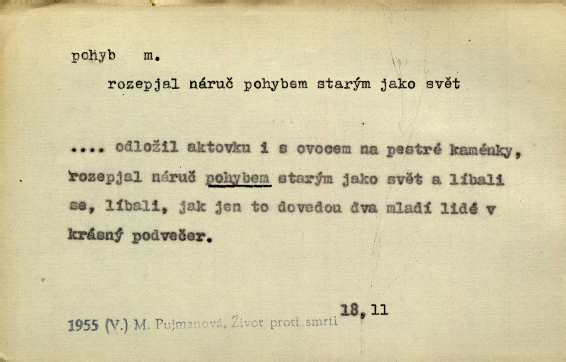 - pohyb, -u m. změna polohy těla n. některé jeho části. Svá slova provázel bezděčnými pohyby. Dyk. Děkan kulatým, vyškoleným pohybem přehodil štolu přes ruce snoubenců. Til. Přivítal ji několikerým pohybem hlavy. Rais. Cikán komediantským pohybem krku, rukou a celého těla dává bolesť na jevo. V. Mrš. Pes u mých nohou bez pohybu sedí. Mach. Každý pohyb Vácslavův byl mladě svěží. Ner. Pozoroval splašené, nezřízené pohyby svého Floka. V. Mrš. Každý jeho pohyb byl vždy odměřený. Svět. Fysiol. pohyb pudový, reflexní, vědomý. D změna polohy tělesa v prostoru. Přívozník s pomocníkem přivedli prám do pohybu. Kun. Selka uváděla hejčedlo v houpavý pohyb. Jir. Co tam větvemi se míhá? Kníže juž běh svého vrance staví a každý pohyb větví čile stíhá. Pfleg. Fys. pohyb přímočarý, křivočarý, postupný, otáčivý, kmitavý a j. Geol. pohyb epirogenetický (horotvorný), tektonický a j. Voj. pohyby vojska posuny, přesuny. D stále se opakující n. souvislé pohybování, kolování, činnost něčeho, oběh, cirkulace. Pohyb nebeských těles je vlastně jen tancem. Ner. Můj život jest mnohem jednotvárnější než pohyb hvězd. Vrch. Rozmanití cizinci, vířivá hudba a celý majestátní pohyb lidstva [v Benátkách] — je to obraz nade všechen popis krásný! Ner. Kolik prostředků technických i peněžních bylo tu [na světové výstavě] uváděno v pohyb, aby bylo lze zmocniti se diváka. Přít. Astron. pohyb denní, roční, sekulární a j. Hud. postup hlasů: pohyb rovný, smíšený a j.; rychlost hry, tempo: pohyb klidný, pomalý, rychlý a j. D stálá změna, stálé nabývání jiného vzhledu, rázu, podoby. [Básníci] vidí před sebou svět v pohybu a proměně. Götz. Po pět a půl roku není přesnějších měřítek pro posouzení pohybu životní úrovně. Právo l. Půda není zboží a její prodej znamená více než pohyb statku od výrobce ke spotřebiteli. Čteme. Jsou v politice jen dvě věci těžky, jedna: pohyb rozpoutat, druhá: pohyb v pravý čas zarazit. Ner. Březina je básník dramatický, plný vnitřního pohybu a vlnění. Šal. Sociol. pohyb obyvatelstva změna v jeho počtu. Obch. pohyb cen měnění cen (snížení n. zvýšení); pohyb zboží souhrn změn ve stavu zboží (nákup a prodej).
