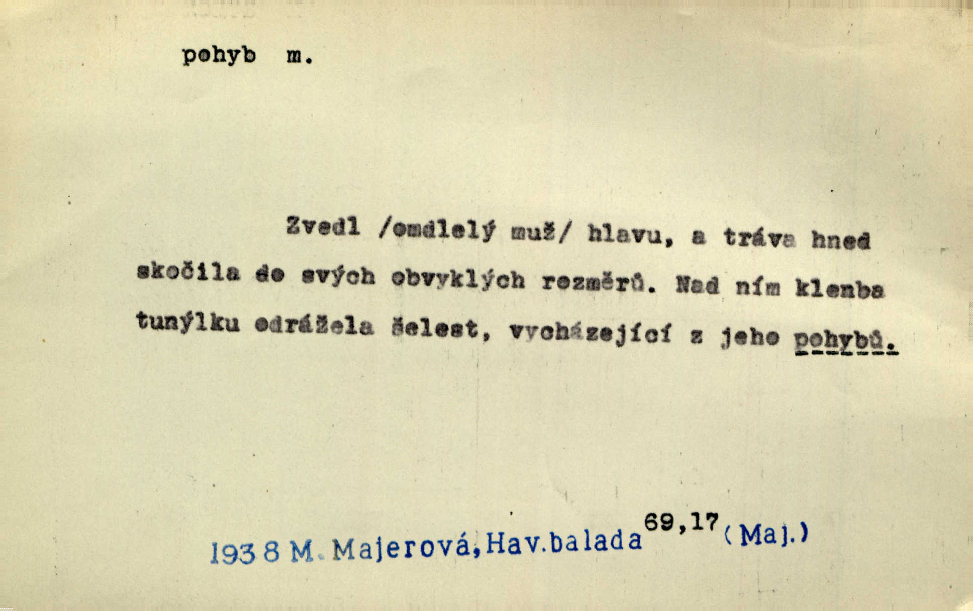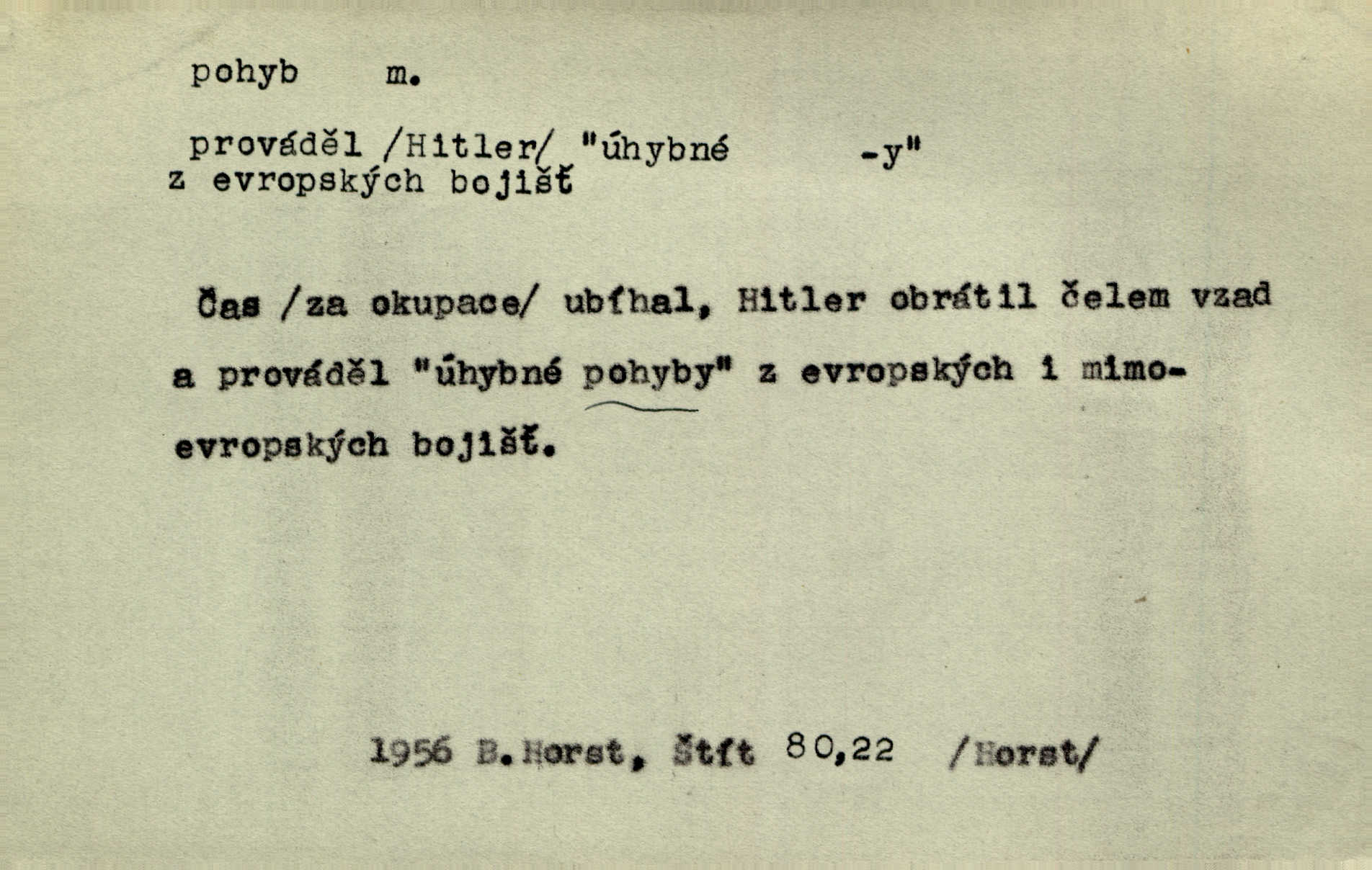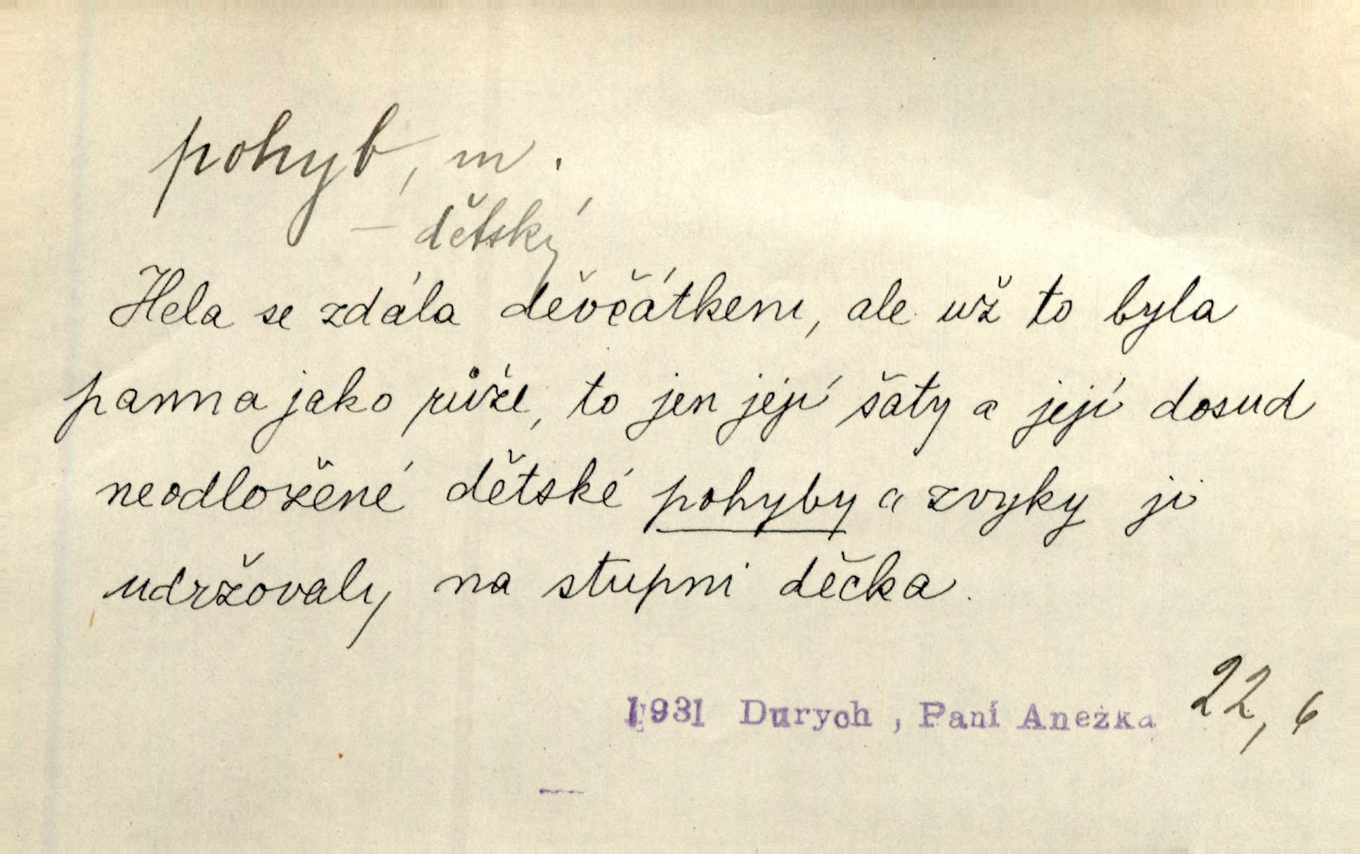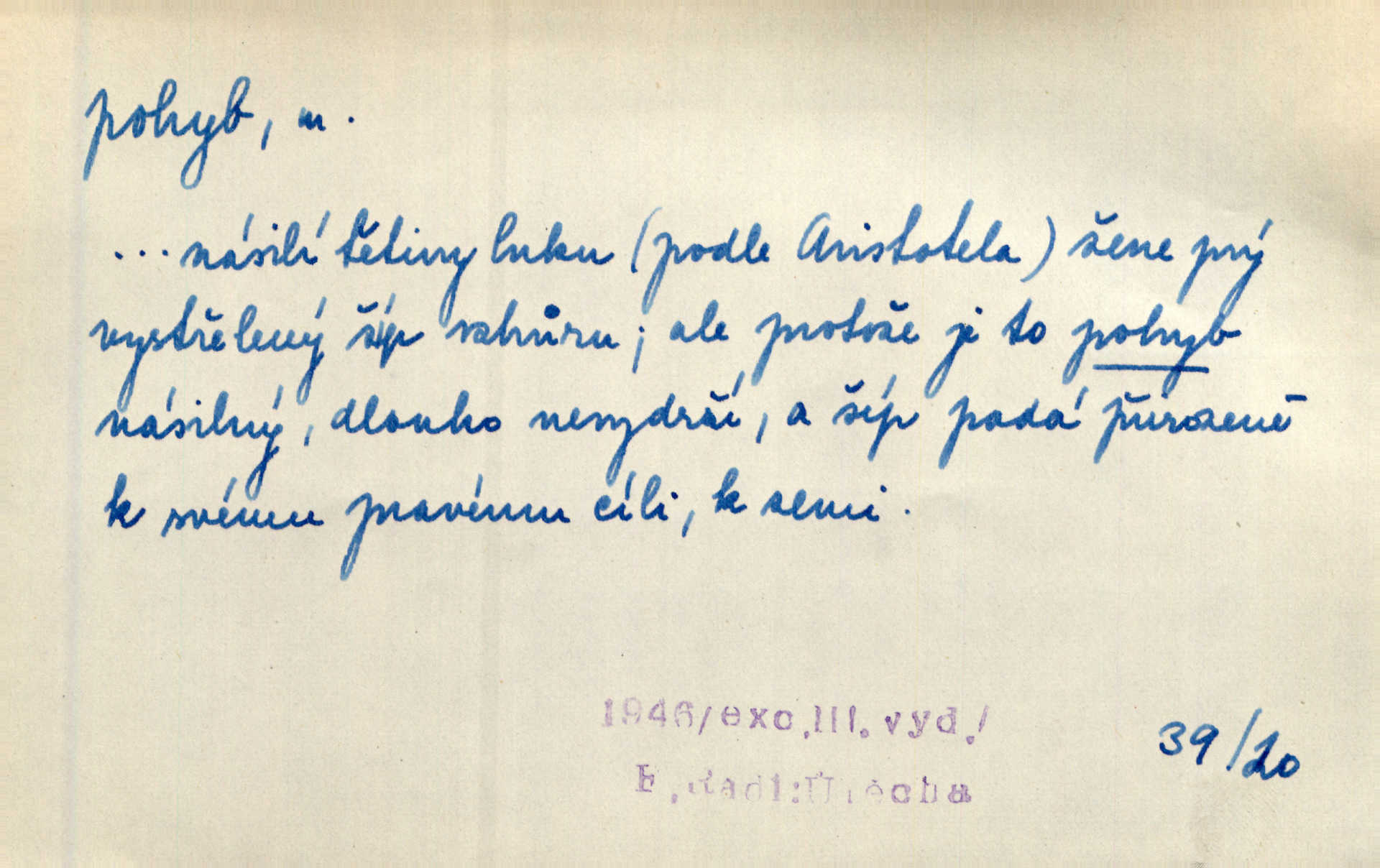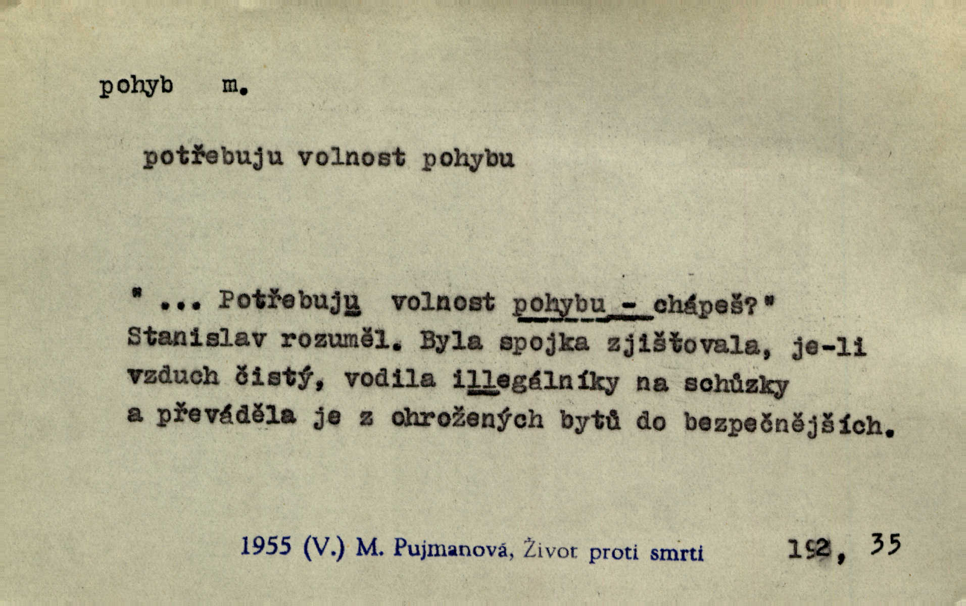 - pohyb, -u m. změna polohy těla n. některé jeho části. Svá slova provázel bezděčnými pohyby. Dyk. Děkan kulatým, vyškoleným pohybem přehodil štolu přes ruce snoubenců. Til. Přivítal ji několikerým pohybem hlavy. Rais. Cikán komediantským pohybem krku, rukou a celého těla dává bolesť na jevo. V. Mrš. Pes u mých nohou bez pohybu sedí. Mach. Každý pohyb Vácslavův byl mladě svěží. Ner. Pozoroval splašené, nezřízené pohyby svého Floka. V. Mrš. Každý jeho pohyb byl vždy odměřený. Svět. Fysiol. pohyb pudový, reflexní, vědomý. D změna polohy tělesa v prostoru. Přívozník s pomocníkem přivedli prám do pohybu. Kun. Selka uváděla hejčedlo v houpavý pohyb. Jir. Co tam větvemi se míhá? Kníže juž běh svého vrance staví a každý pohyb větví čile stíhá. Pfleg. Fys. pohyb přímočarý, křivočarý, postupný, otáčivý, kmitavý a j. Geol. pohyb epirogenetický (horotvorný), tektonický a j. Voj. pohyby vojska posuny, přesuny. D stále se opakující n. souvislé pohybování, kolování, činnost něčeho, oběh, cirkulace. Pohyb nebeských těles je vlastně jen tancem. Ner. Můj život jest mnohem jednotvárnější než pohyb hvězd. Vrch. Rozmanití cizinci, vířivá hudba a celý majestátní pohyb lidstva [v Benátkách] — je to obraz nade všechen popis krásný! Ner. Kolik prostředků technických i peněžních bylo tu [na světové výstavě] uváděno v pohyb, aby bylo lze zmocniti se diváka. Přít. Astron. pohyb denní, roční, sekulární a j. Hud. postup hlasů: pohyb rovný, smíšený a j.; rychlost hry, tempo: pohyb klidný, pomalý, rychlý a j. D stálá změna, stálé nabývání jiného vzhledu, rázu, podoby. [Básníci] vidí před sebou svět v pohybu a proměně. Götz. Po pět a půl roku není přesnějších měřítek pro posouzení pohybu životní úrovně. Právo l. Půda není zboží a její prodej znamená více než pohyb statku od výrobce ke spotřebiteli. Čteme. Jsou v politice jen dvě věci těžky, jedna: pohyb rozpoutat, druhá: pohyb v pravý čas zarazit. Ner. Březina je básník dramatický, plný vnitřního pohybu a vlnění. Šal. Sociol. pohyb obyvatelstva změna v jeho počtu. Obch. pohyb cen měnění cen (snížení n. zvýšení); pohyb zboží souhrn změn ve stavu zboží (nákup a prodej).
