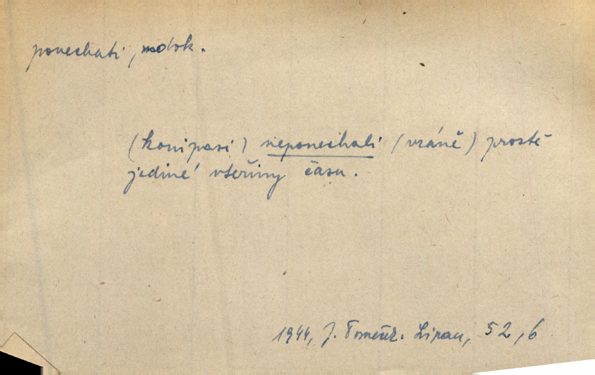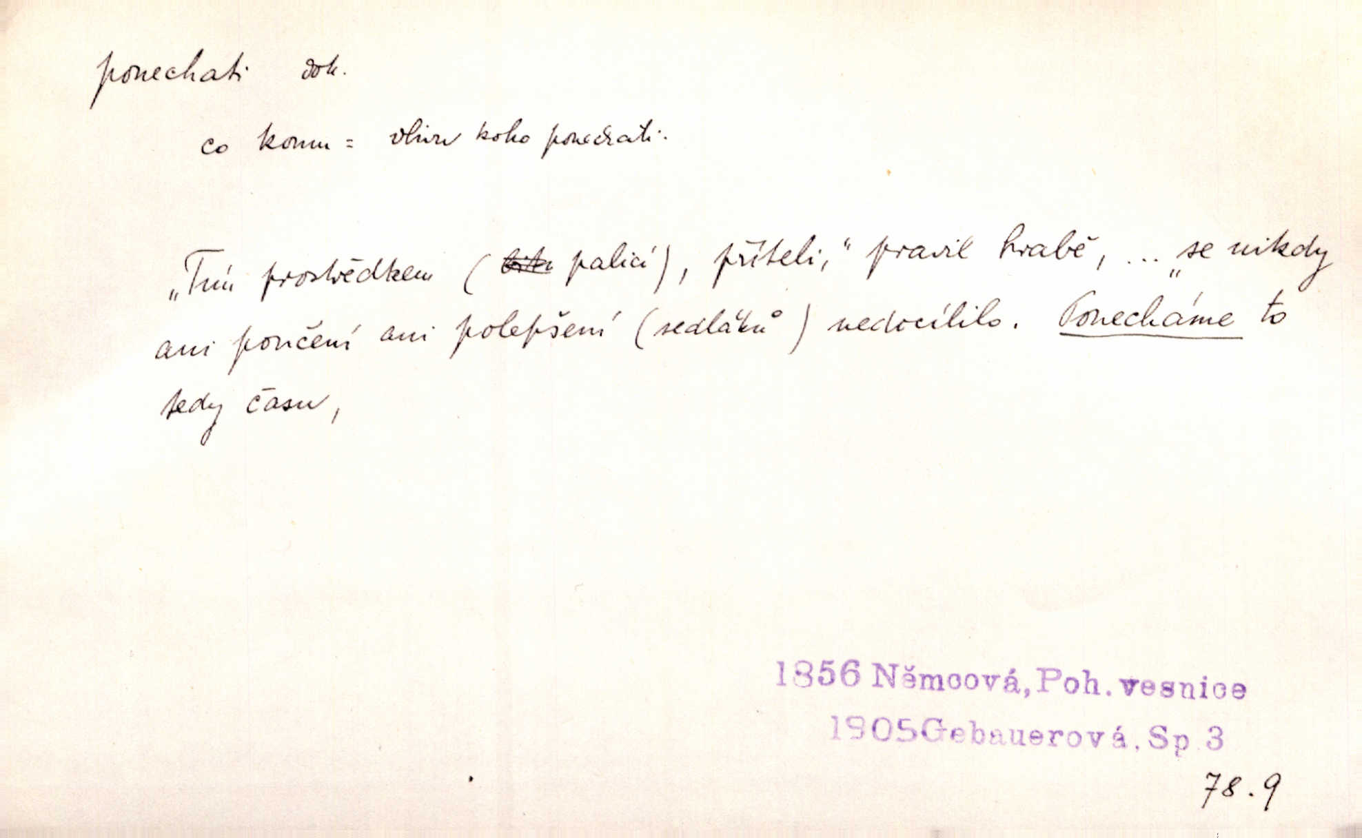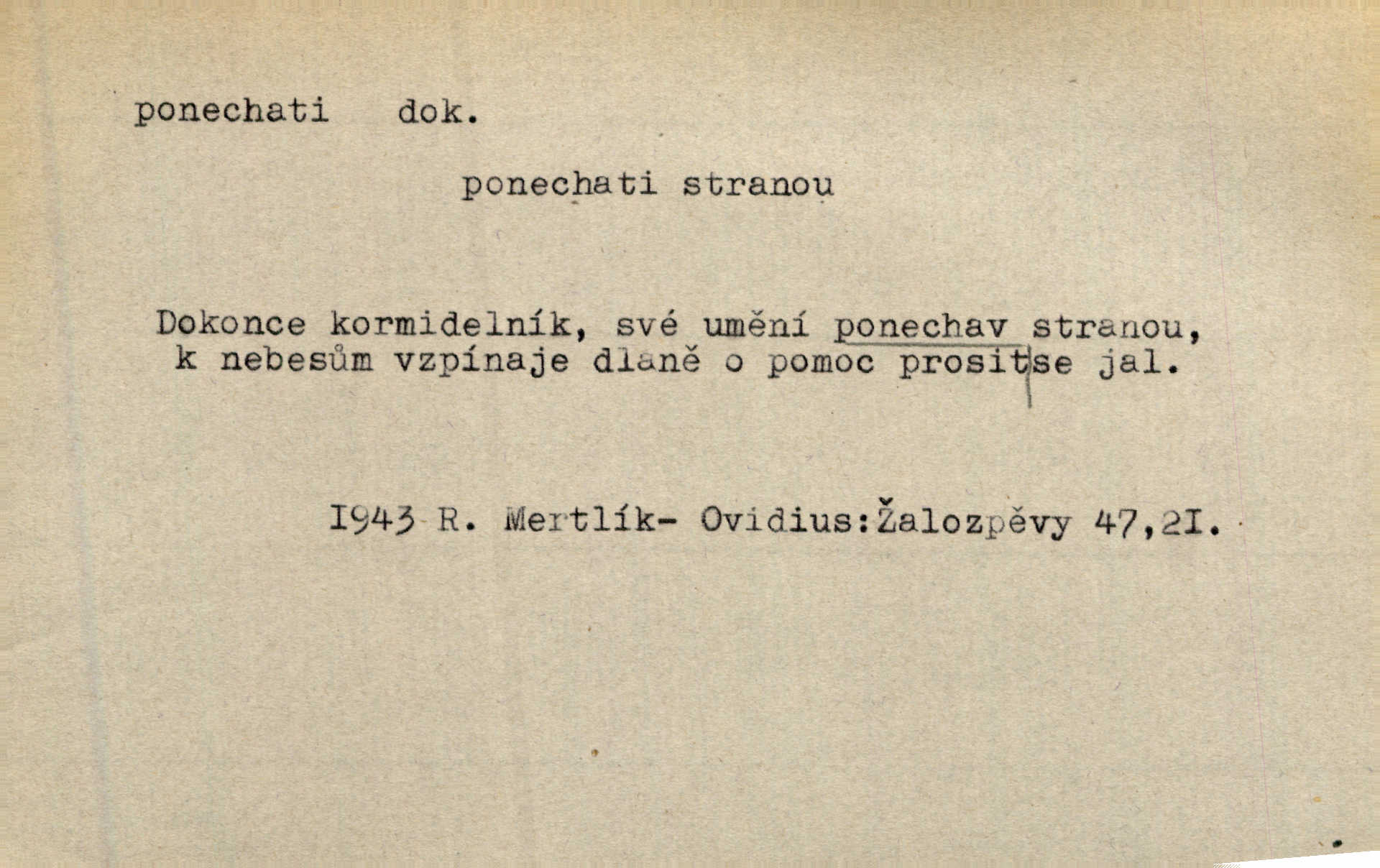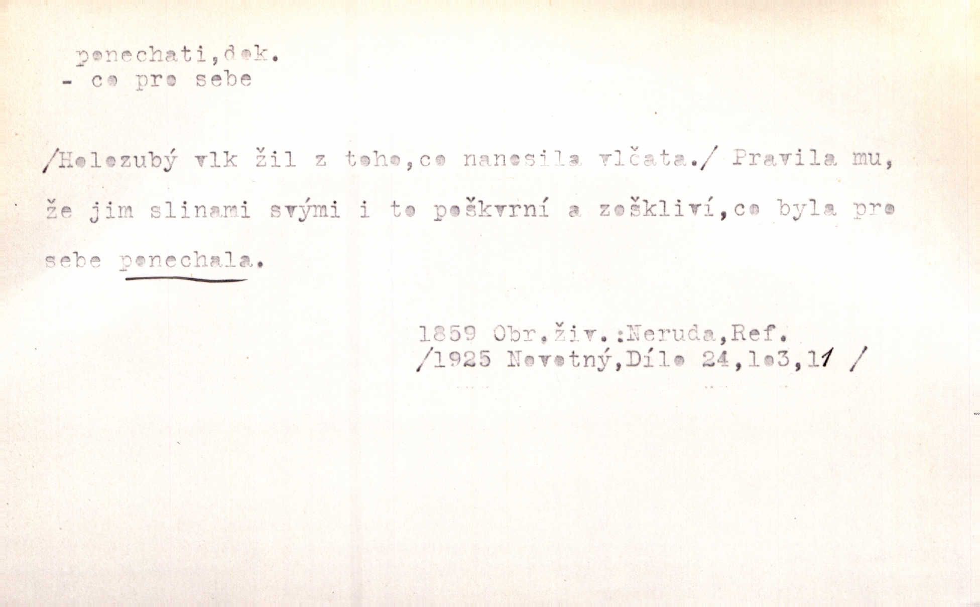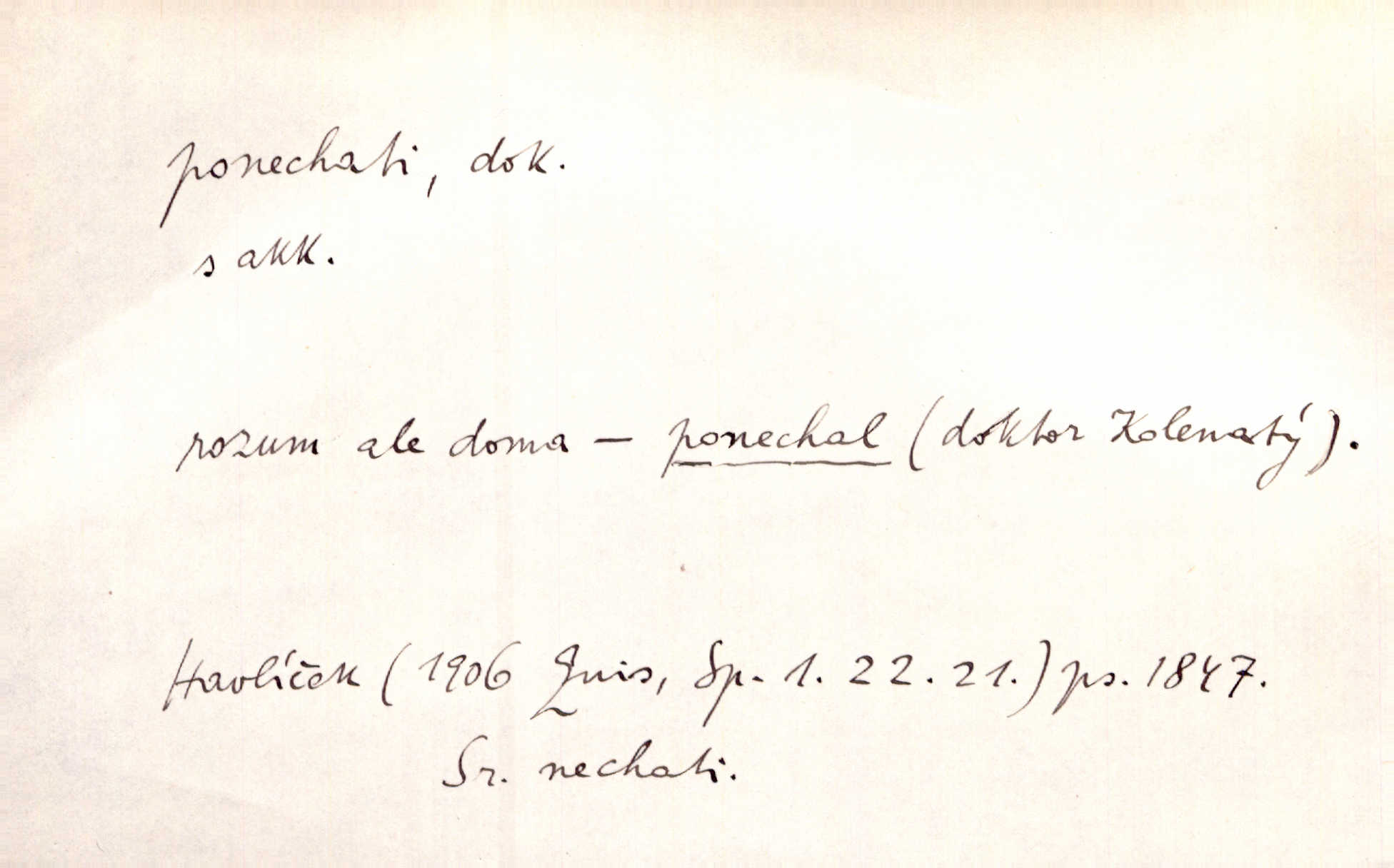 - ponechati dok. zůstaviti, dopustiti, nezabrániti. Zdálo se, že nás [teta] ponechala úplně našemu osudu. Obr. živ. Nejlépe bude, ponechají-li věcem průběh přirozený. Svět. Vyrval se z náruče její, ponechav ubohou žalu. Choch. Dospěv středu řeky, ponechal loďku proudu. Čap. Ch. Bylť nyní svoboden, nevázán, sám sobě ponechán. Pfleg. Dcerušku na chvíli ponechala samé sobě. Prav. Ostatní zatím ponecháni na pokoji. Hál. Ponechal jsem mu na vůli, zastaviti se, kde se mu bude líbiti. Prav. Dnes jen netrpělivě [matka] hlavu od něho odvrátila a ponechala mu slovo poslední. Svět. Když jí řekli, že ji nemohou ponechat na noc, div se nerozplakala. R. Svob. D (koho kde) podržeti někoho v dřívějším stavu, neodstraniti někoho odněkud. Jsem vám velmi povděčen, že jste mne ve službě ponechala. Pfleg. Synové ponecháni zatím ve službě. Jir. Pro zločin veřejného násilí ponechán ve vyšetřování. Herb. Nevíš, jak dlouho tě Pán Bůh zde na světě ponechá. Prav. Pertolta z Valdštejna má [král] také zajmouti, ale na živu jej ponechati. Pekárek. Vždycky užitek my větší máme, když v hlouposti ho [lid] trochu ponecháme. Ner. D (komu co, co kde) neodejmouti někomu něco, nezbaviti někoho něčeho, neodkliditi něco odněkud. Dar ponechám mu, nezruším svůj slib. Zey. Všecko, co jí dal, také jí ponechal. Mrš. Zapraven poplatek za další ponechání hrobu. Herrm. Ve slovech cizích ponechání orthografie cizí čtenáře českého másti mohlo. Pal. Ve svém stolku ponechati může práce ještě nezralé. V. Mrš. V ruce nesla vrbový proutek zcela hladký, pouze na konci s chvostem ponechaného listí. Svob. Velmistru ponechána moc, rozsudek umírniti. Choch. Ponechala se obci samé péče o její vlastní záležitosti. Tomíč. D zůstaviti, zanechati. Minuly žně, hrozné pro něj žně, nebo všecko musil ponechat cizím lidem. Jir. Tu knížku mi tu ponechte, za několik dní si sem přijďte. Pfleg. Petr ponechal své ženě dům i pole, peníze však určil k rozdání chudým. Goll. Pro nedostatek místa musíme úvahu o provedení ponechati pro číslo budoucí. Zl. Praha. Což snad zamýšlíte ponechati pana Josefa doma? Pfleg. Možno i, že je působivým trestem, ponechati někoho v místnosti tmavé. Ner. Svolil ponechati věc do svého návratu do Prahy. Podl. Ponechala podezření své u sebe. Paleč. D přenechati, přepustiti. Nesmí ji [sedlák žeň] na trzích prodati, nýbrž vrchnosti ji ponechati za cenu, kterou si sama určí. Svět. Markrabí zavřel se do pevného Znojma a ponechal otevřený kraj Čechům. Ritt. „Začni tedy a ponech úsudek nám,“ doložil doktor. Svob. To ponecháme učencům, jsou-li „kamna“ původní, naše jméno. Jir. Byla tak vůle bohů… Pomstu ponechte jim. Třeb. D ponechati si (co) podržeti u sebe něco, neodložiti něco, nevzdati se něčeho. Nemoha dohlížeti na hospodářství, ponechal si jen několik mír pole na setí. Herb. Mlynář si honitbu ponechal, ale sám stříleti neuměl. Svob. Dlouho vybírala [šátky] ptajíc se, který si má ponechati. Rais. Není mi třeba věna, ponechte si vše. R. Svob. Ponechal si svůj úsudek o této žádosti pro sebe. Svět. Rozhodnutí si ponechala na příští neděli. Svob. Na konec ponechali si stavové poslední, největší trumf. Rez.